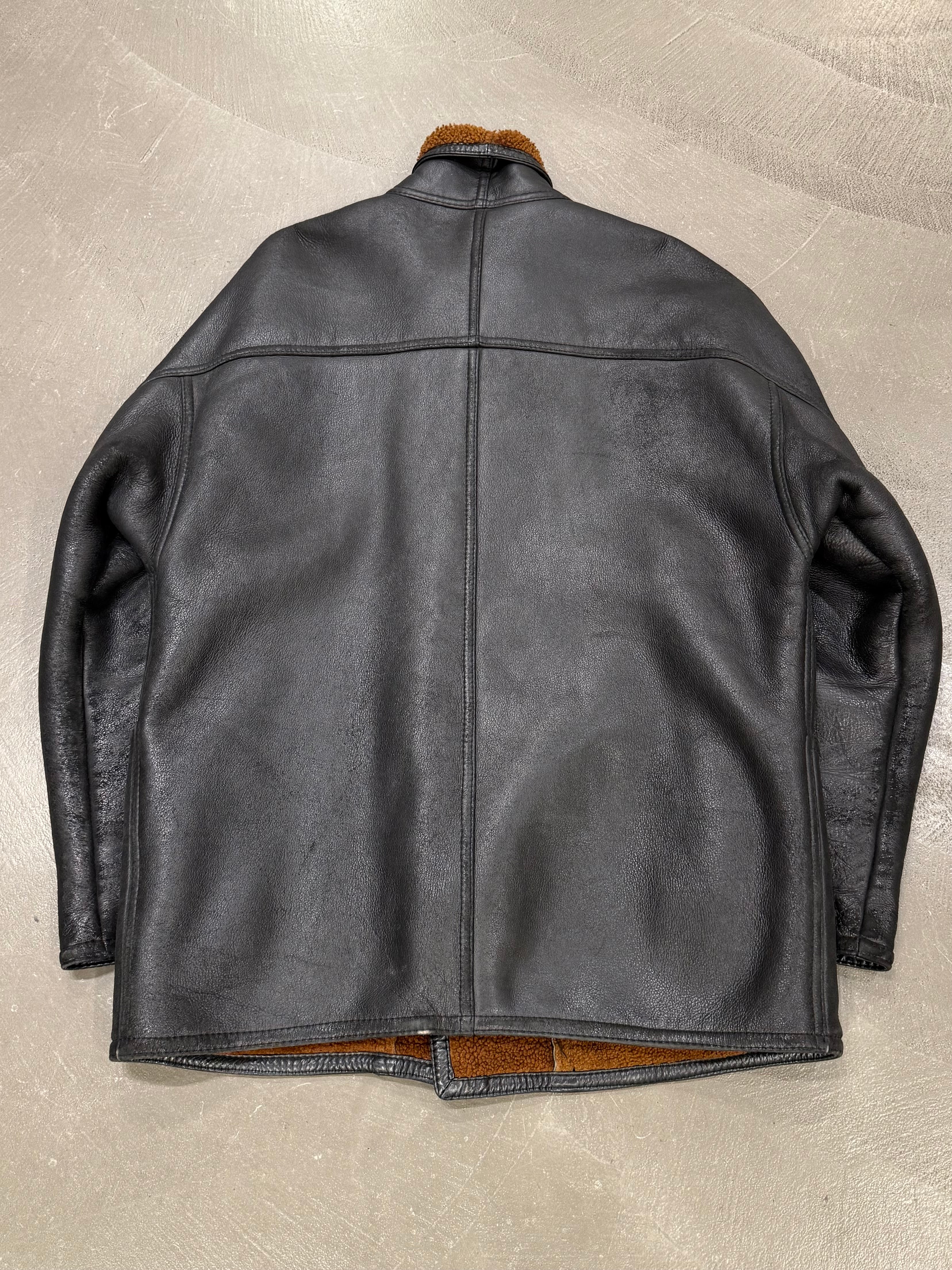 This Marithé François Girbaud coat from the 1980s is crafted from thick black shearling, delivering both warmth and structure. It features distinctive metal hook closures, oversized patch pockets, and zippered chest compartments, embodying the utilitarian and experimental spirit of Girbaud’s designs. The contrasting shearling collar lining adds texture and a rugged edge to this archival outerwear piece.