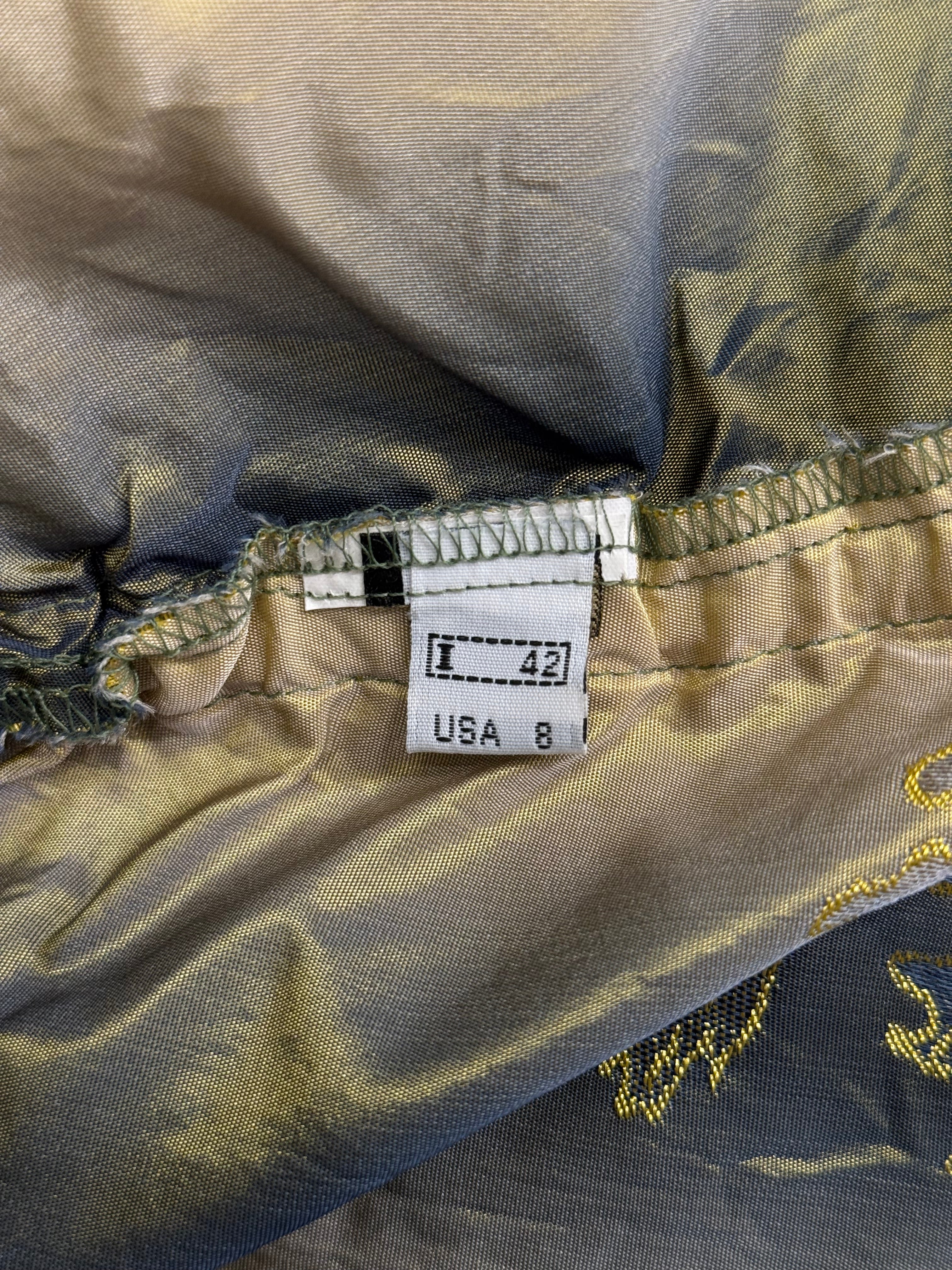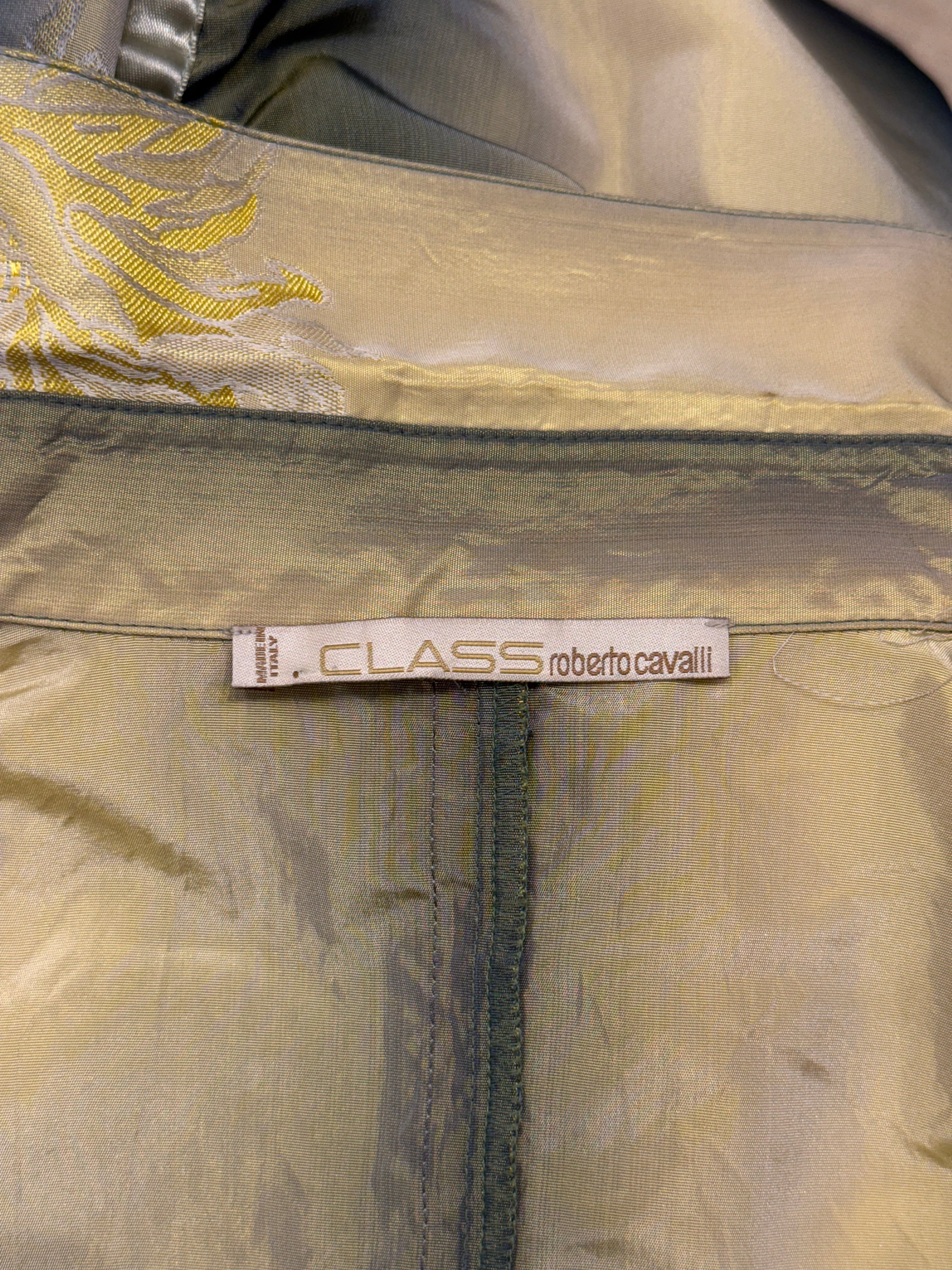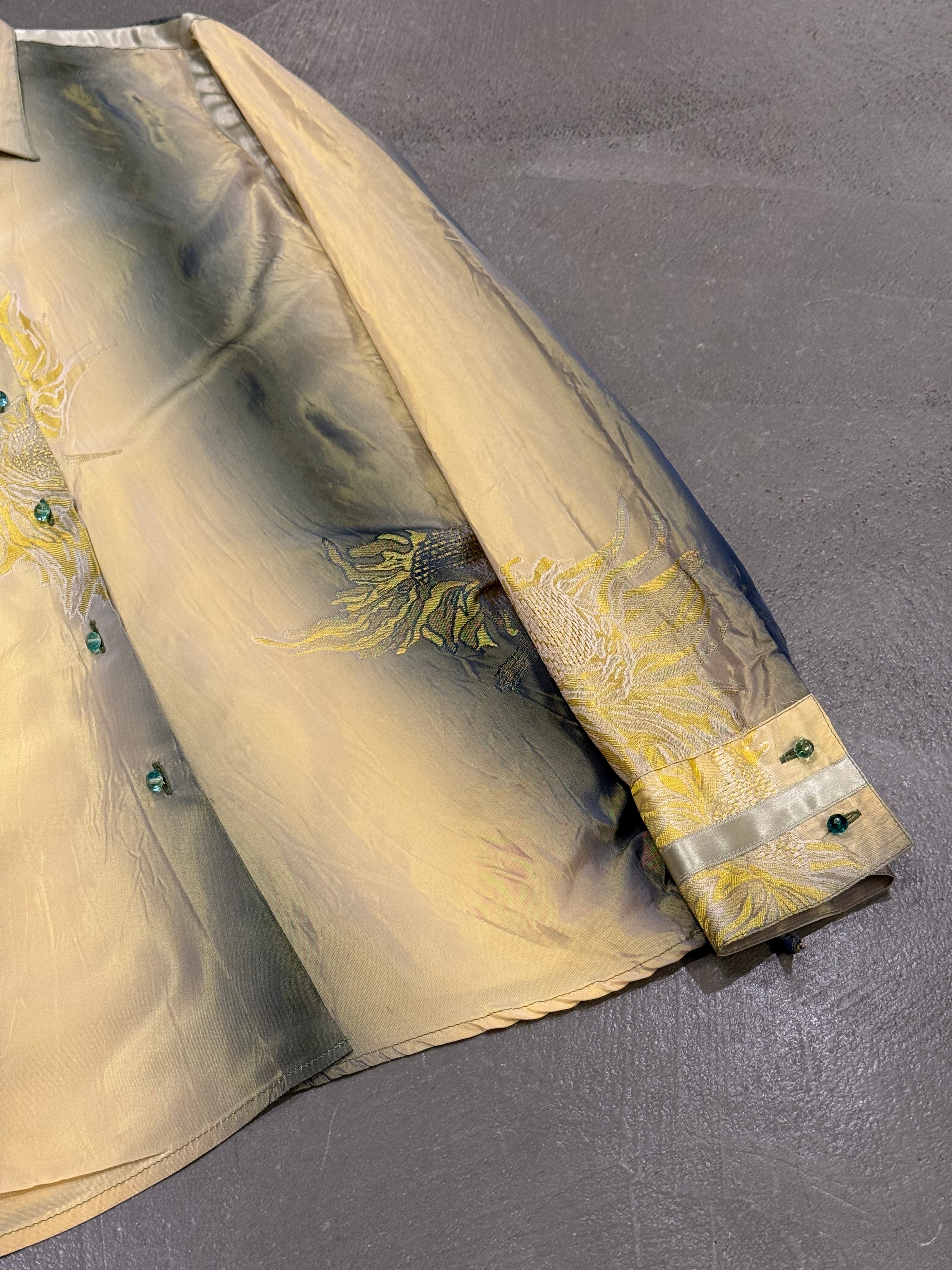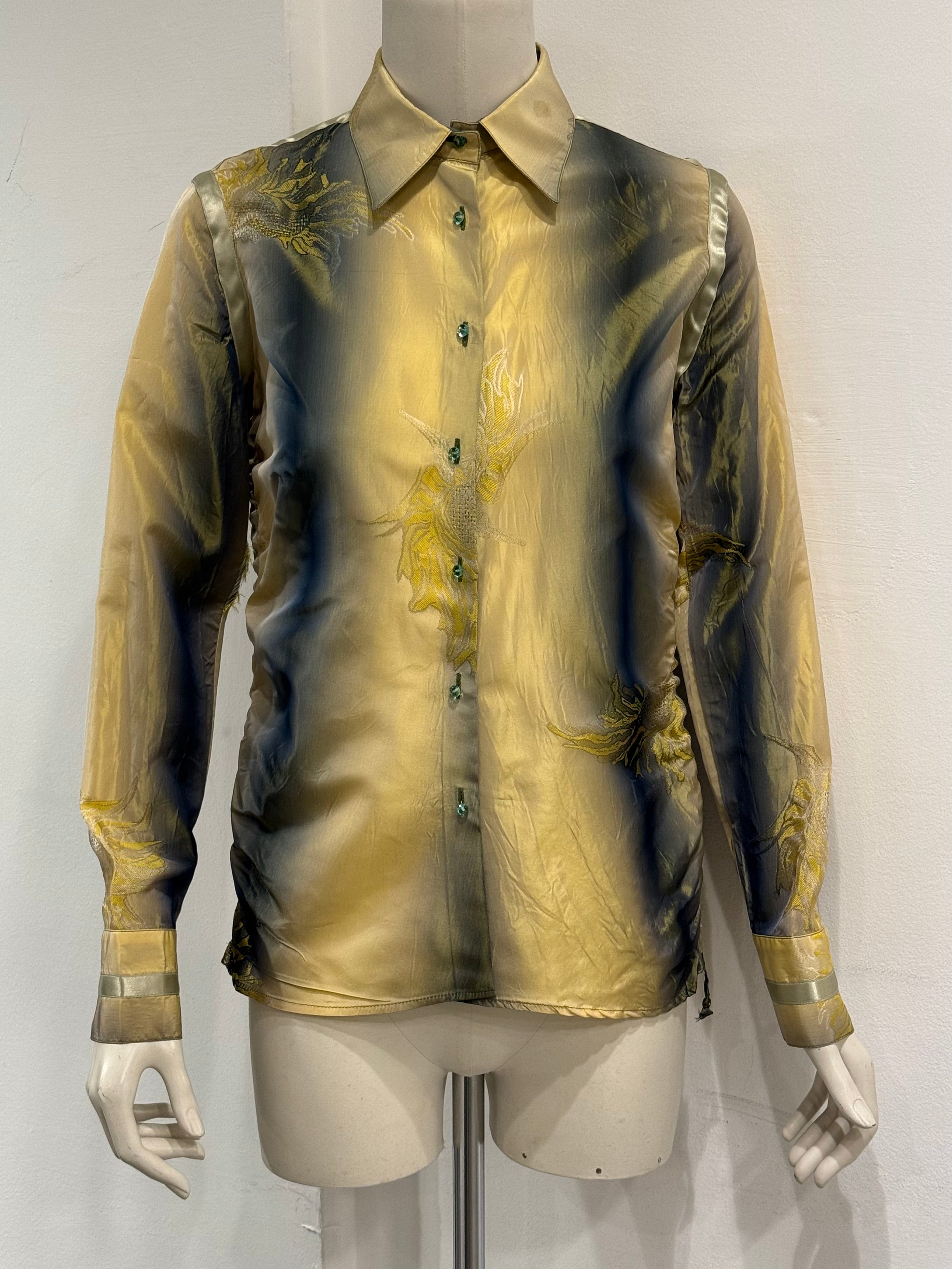 This Cavalli shirt from the 2000s is crafted from a lustrous iridescent fabric that shifts between golden and deep blue tones. Subtle embroidered details enrich the fluid surface, adding texture and refinement. Designed with a classic collar, button closure, and tailored silhouette, it combines Cavalli’s sensual elegance with a bold, eye-catching finish.