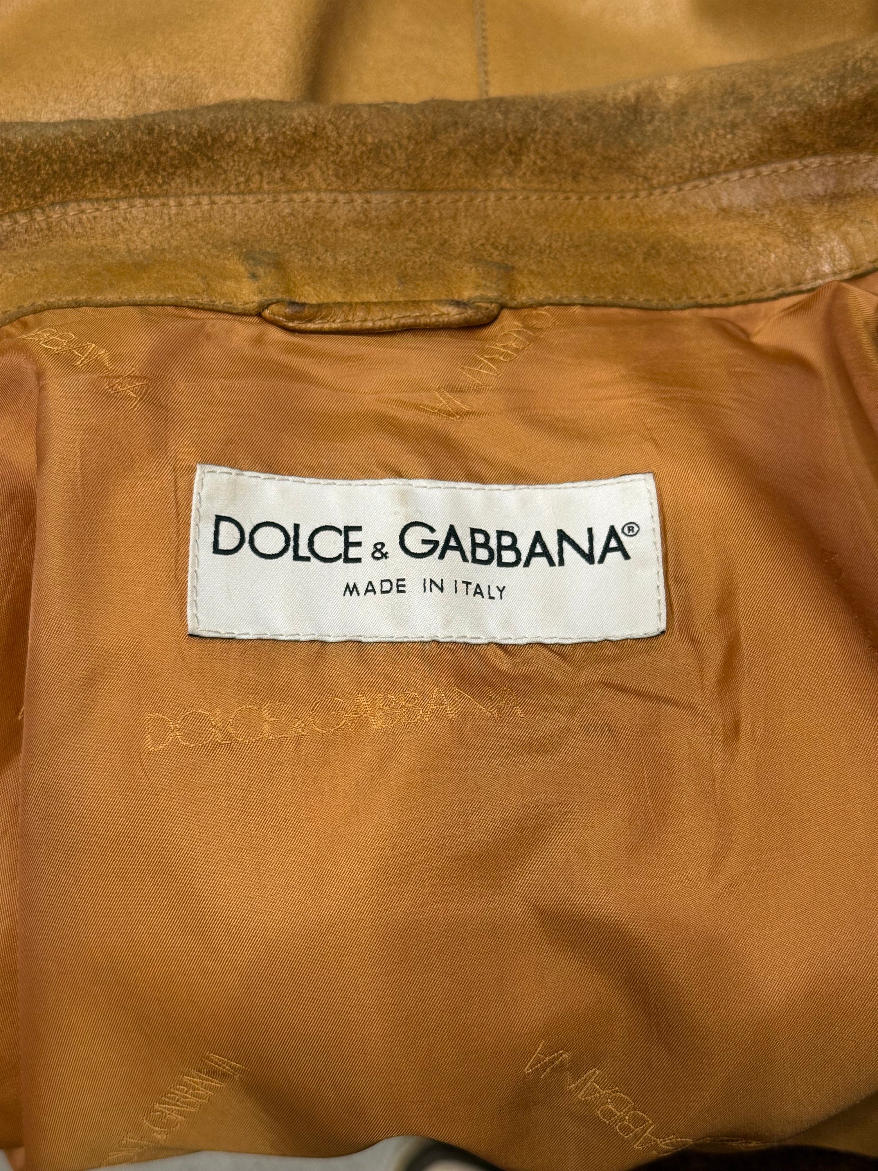 This 1990s Dolce & Gabbana cropped leather jacket embodies the label’s sleek and sensual tailoring. Made from smooth tan leather, it features a minimalist design with sharp proportions and clean lines. A refined archival piece from the brand’s golden era.