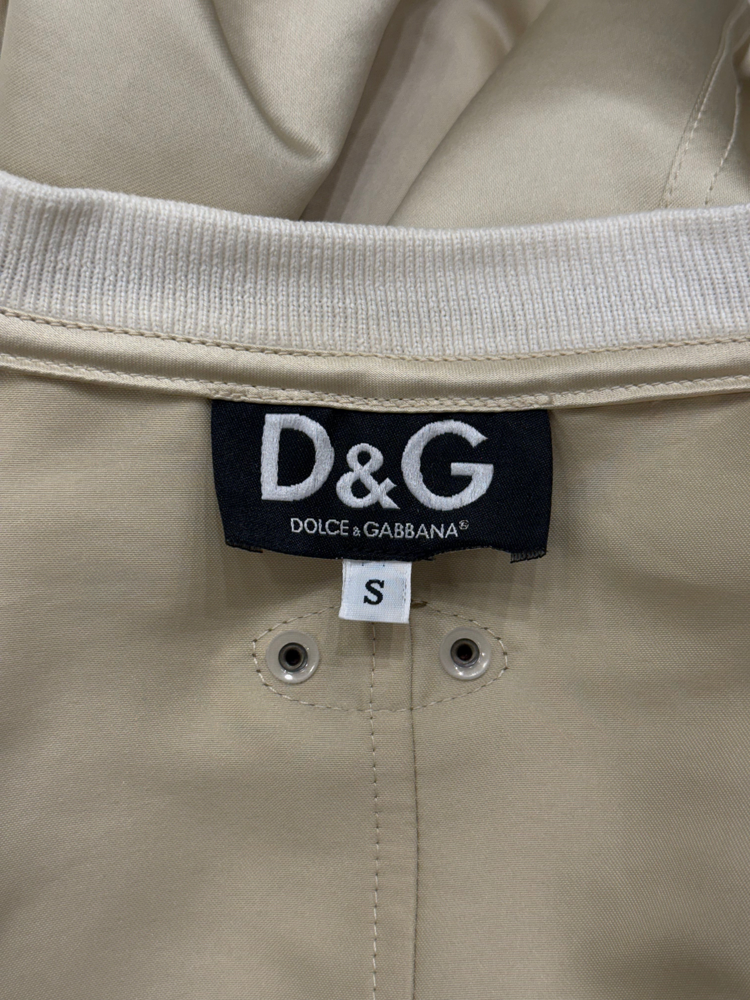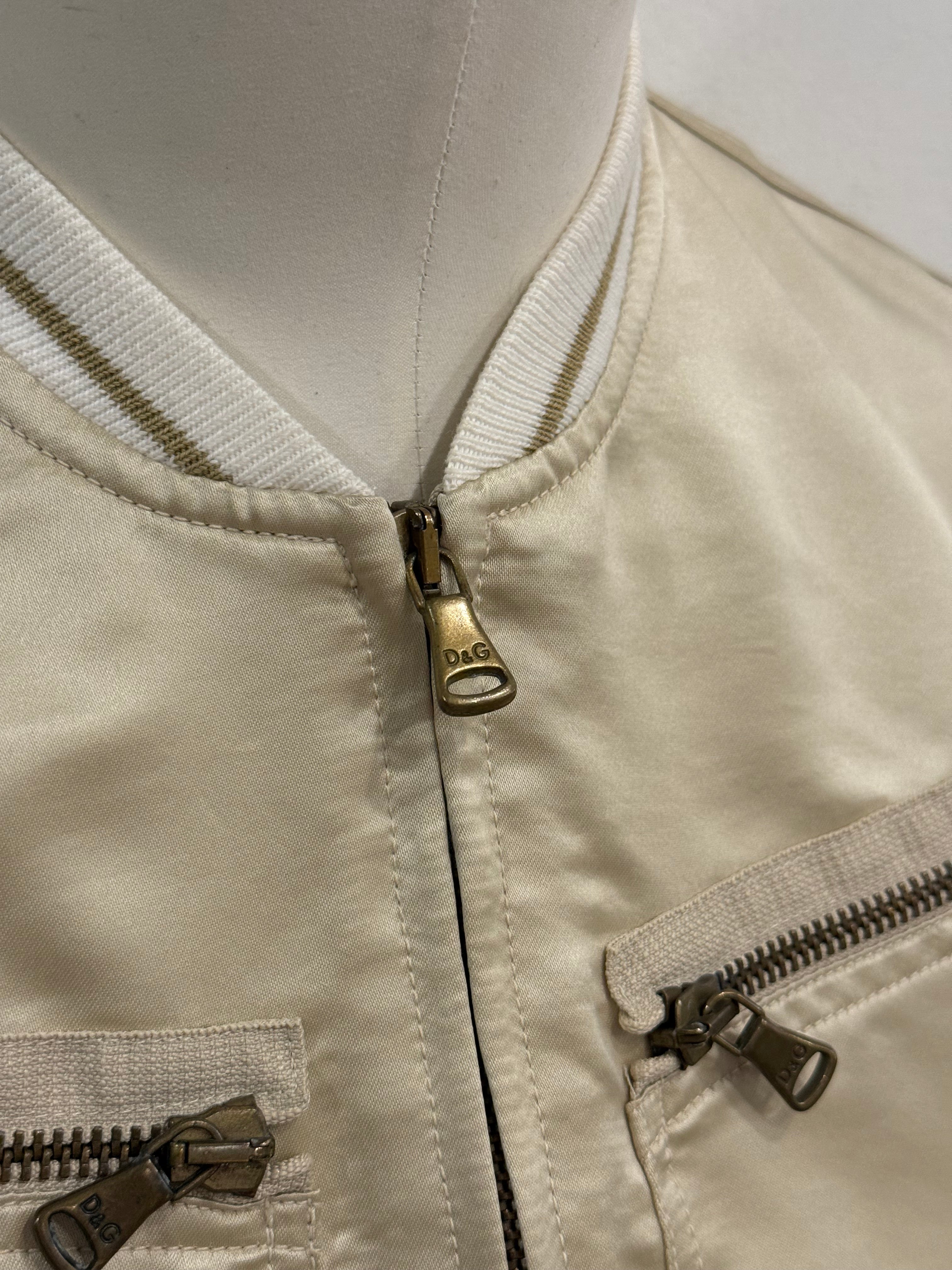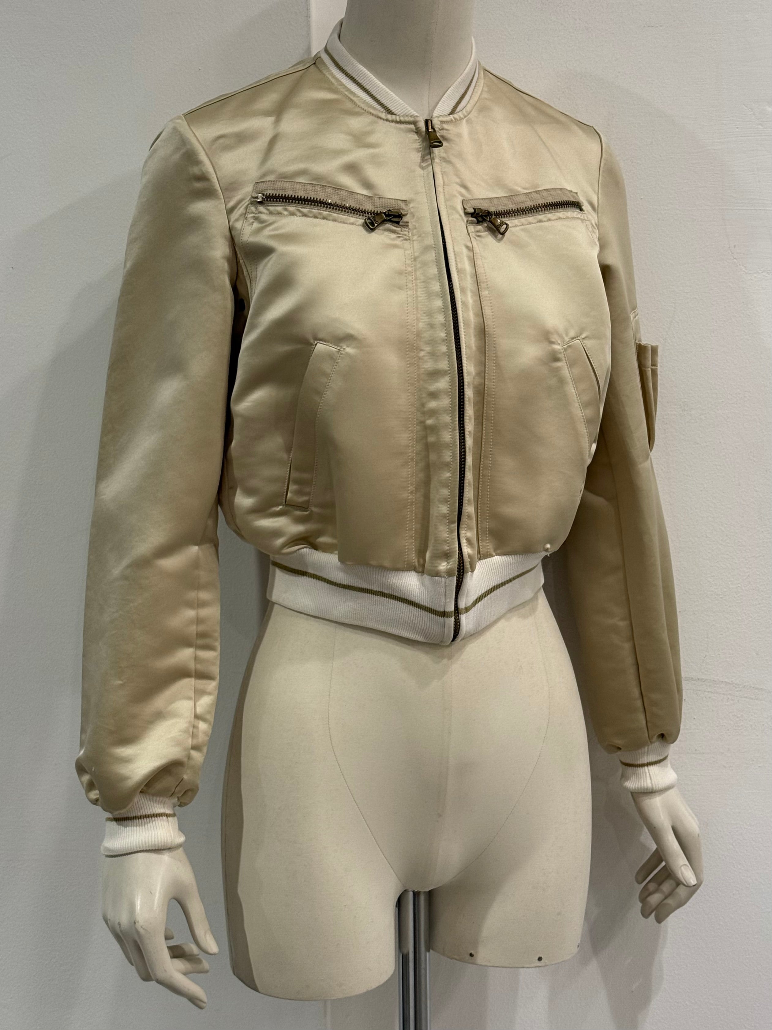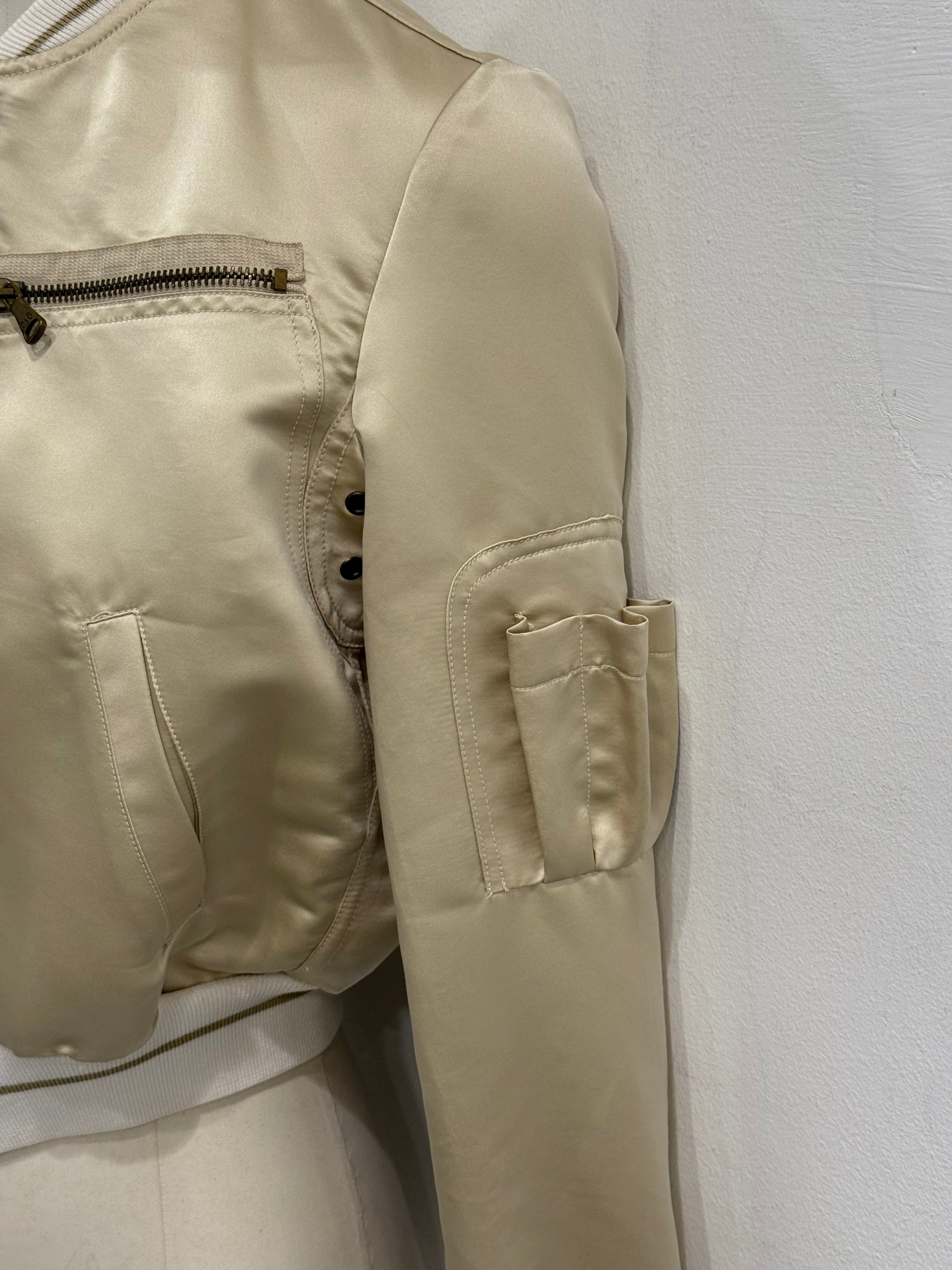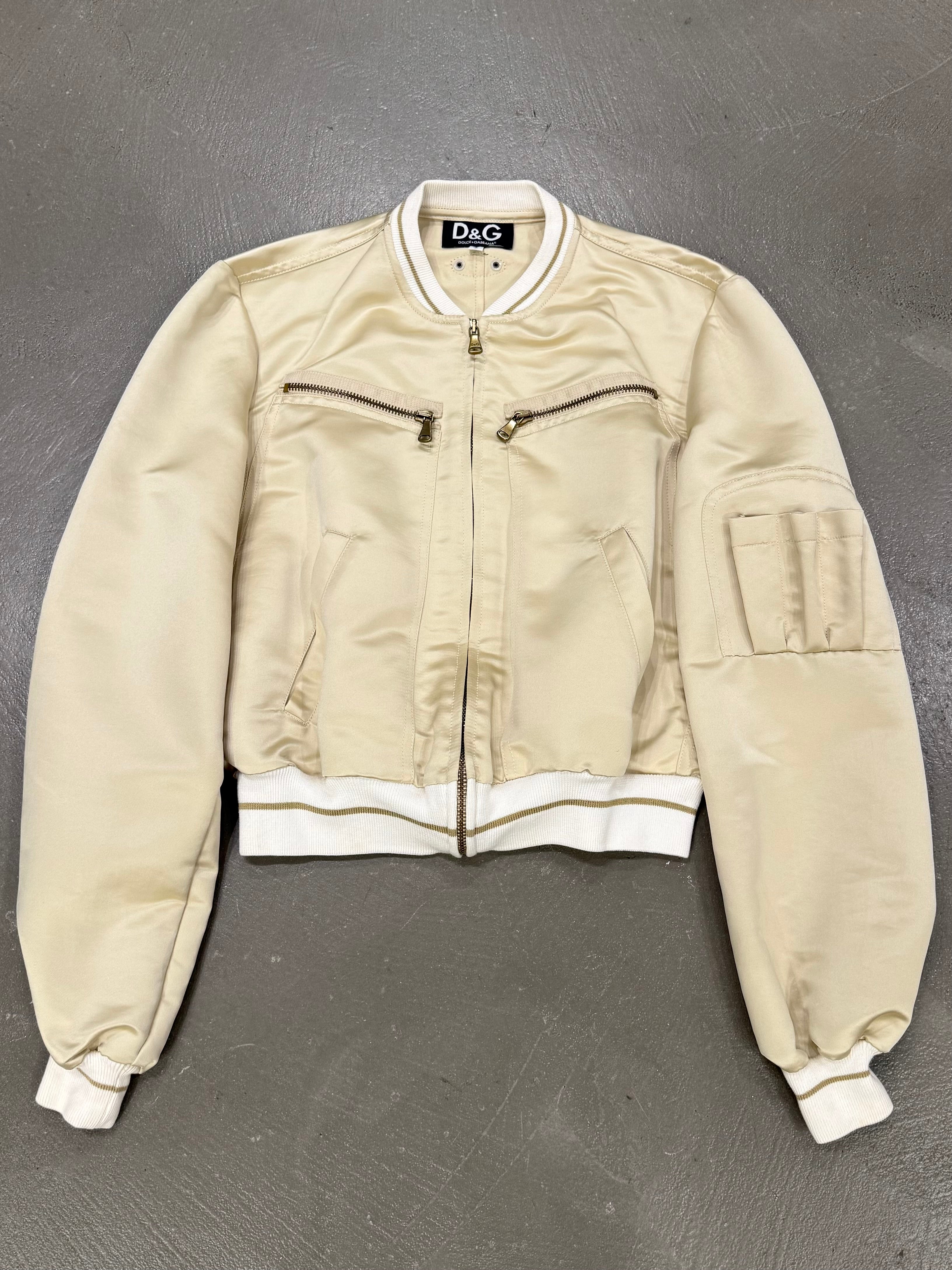 This Dolce & Gabbana bomber jacket from the 2003 collection perfectly captures the Y2K blend of femininity and utilitarian design. Made from soft beige nylon with a subtle sheen, it features a cropped silhouette, ribbed cuffs and hem, and zip pockets on the chest and sleeve. The voluminous sleeves and structured fit give it a modern yet nostalgic edge, true to the brand’s early-2000s aesthetic.