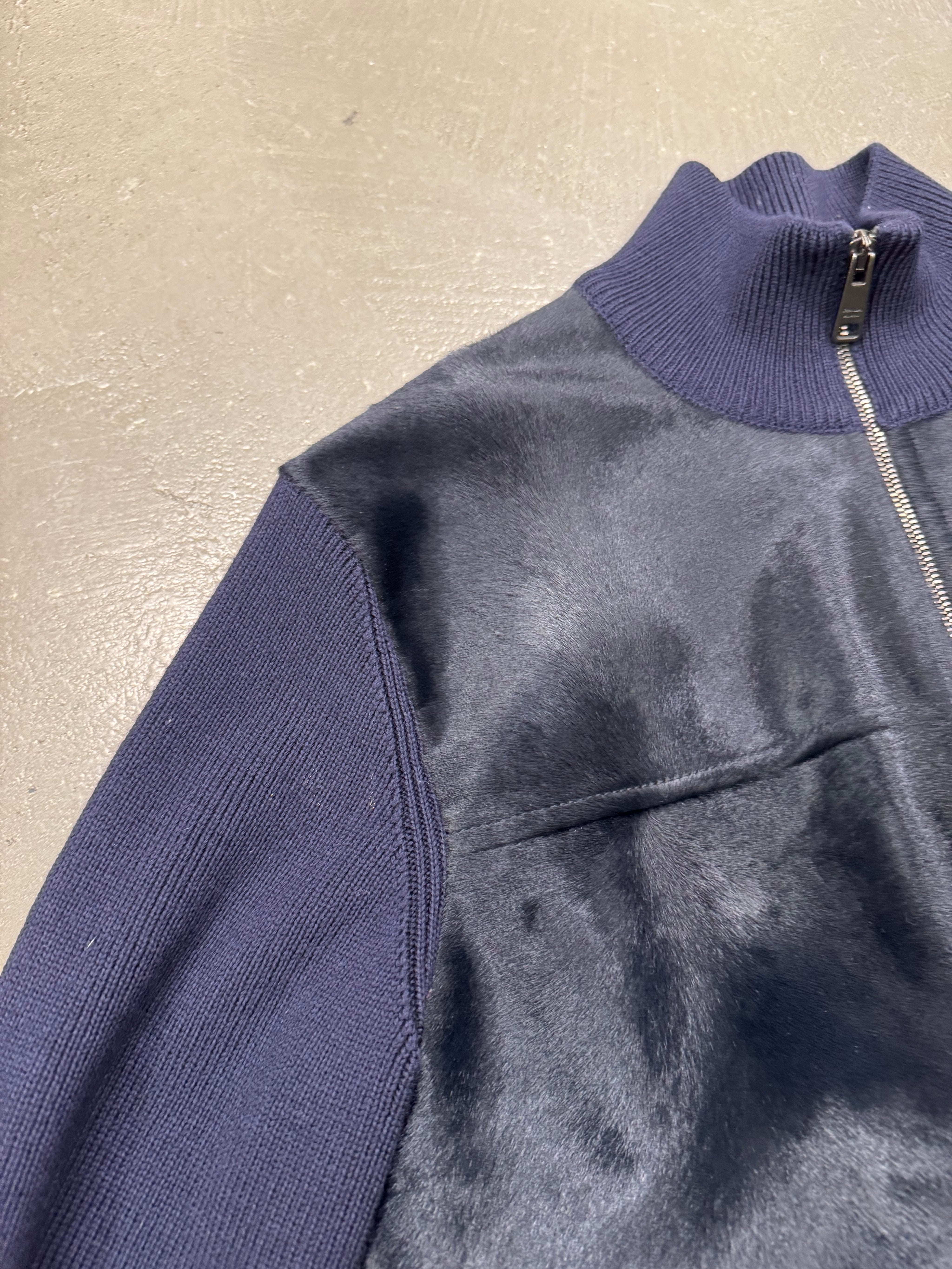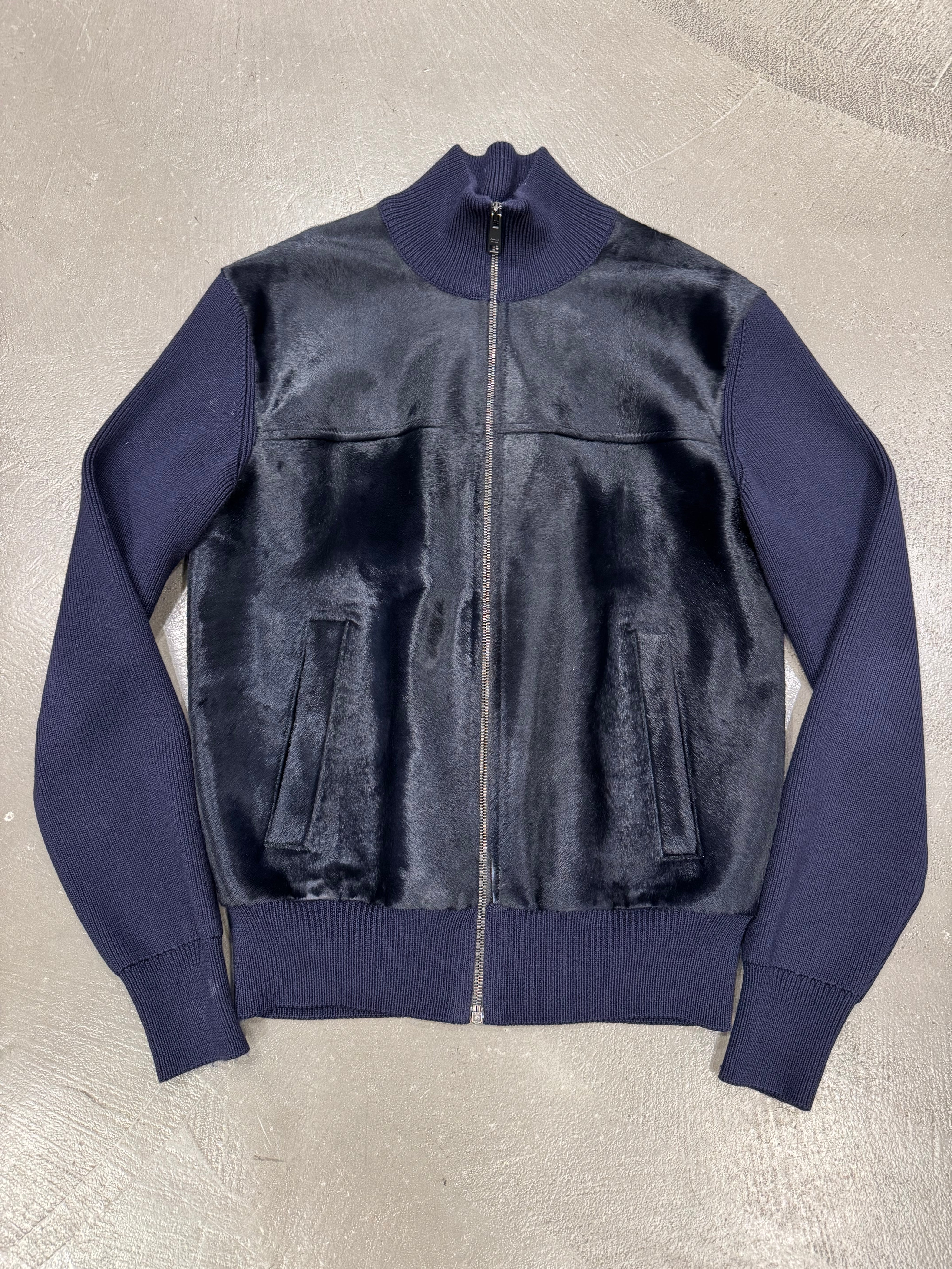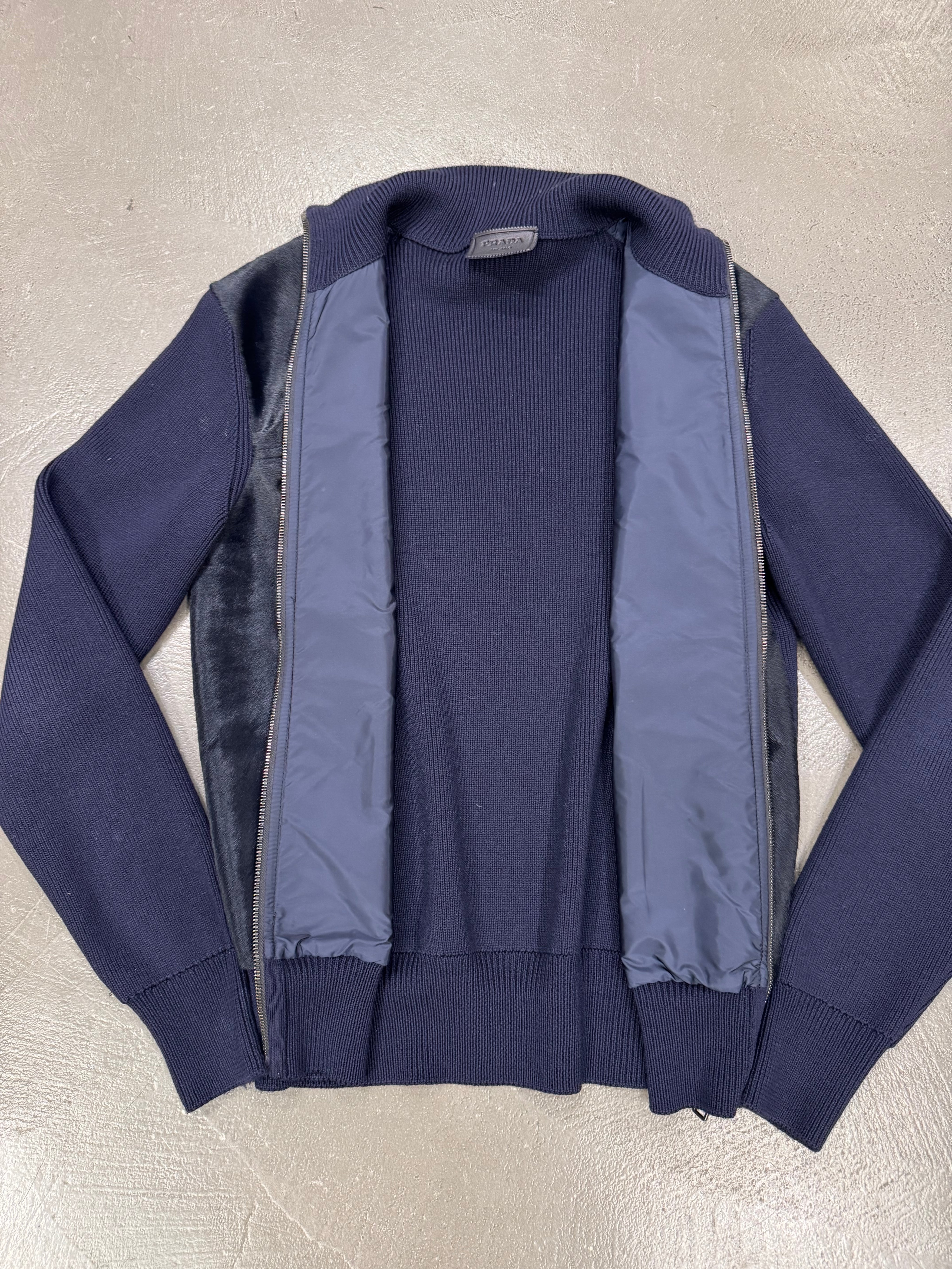 This Prada cardigan from the 2010s exemplifies the brand's mastery of material innovation. The front panel is crafted from luxurious black pony hair, creating a tactile contrast with the ribbed wool sleeves, back, and trim. Featuring a high funnel neck and full zip closure, the piece merges outerwear structure with knitwear comfort—an elevated, modern hybrid perfect for layering.