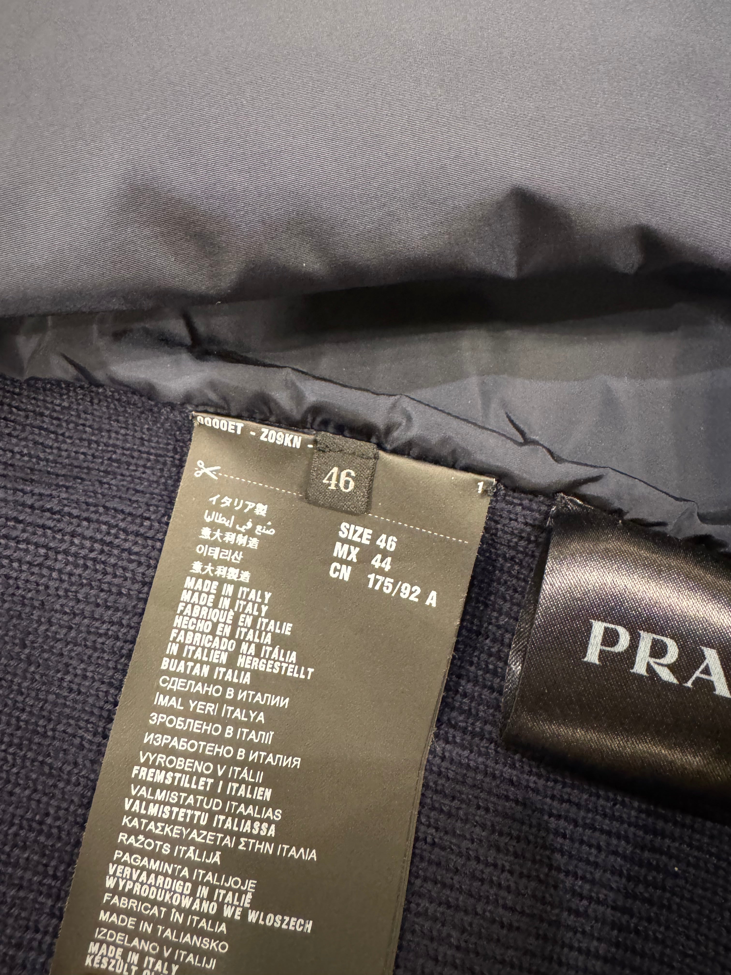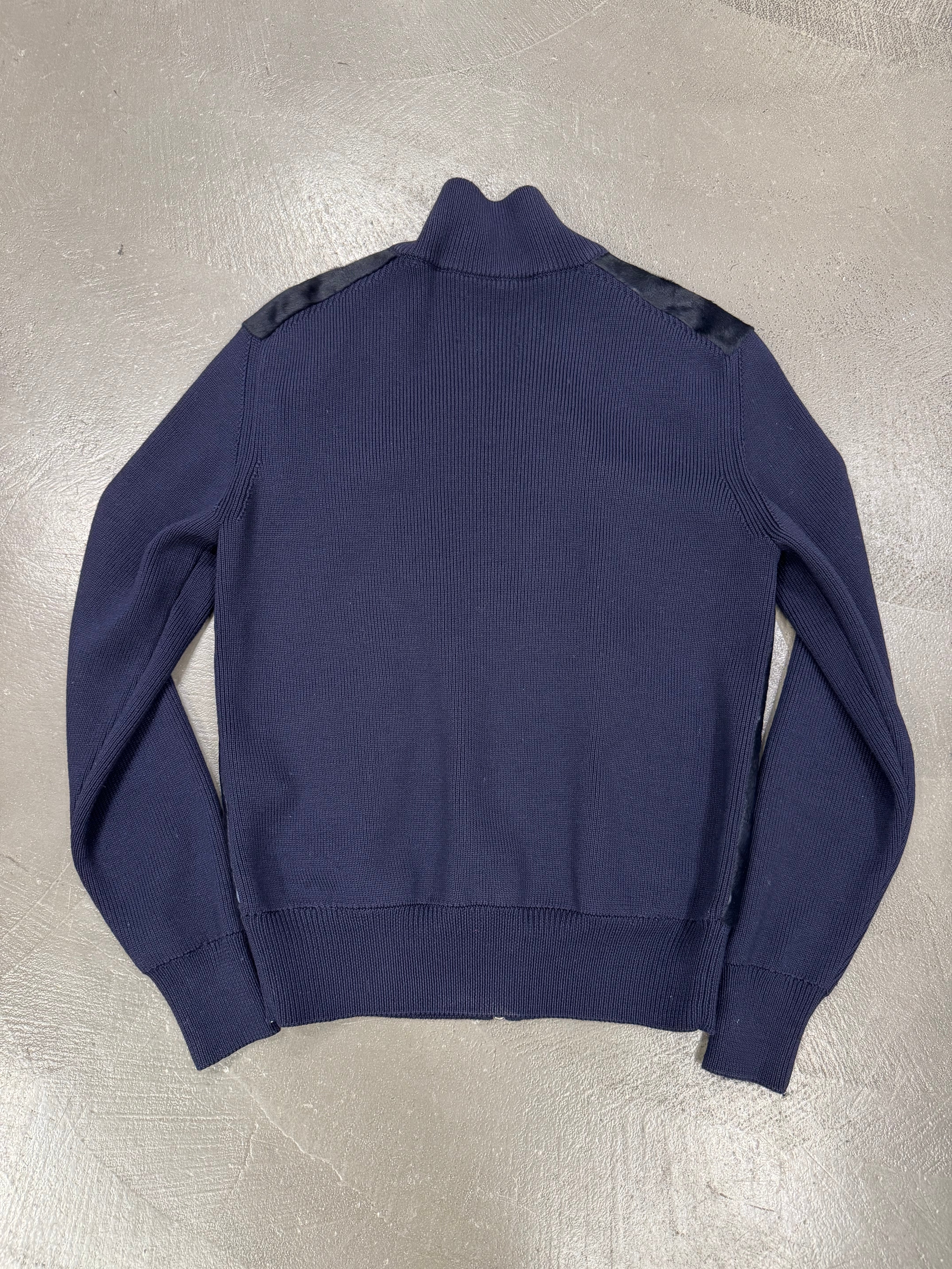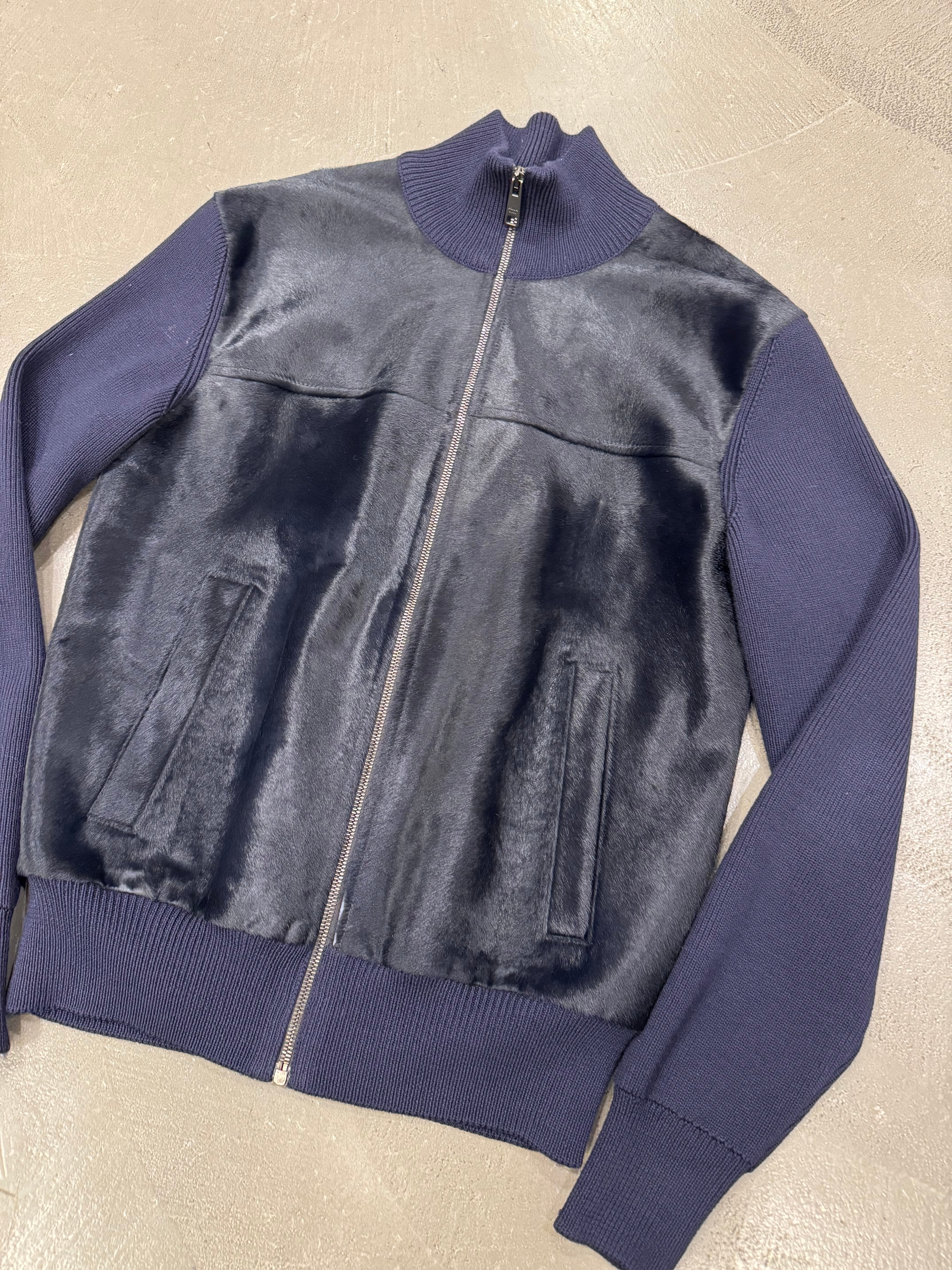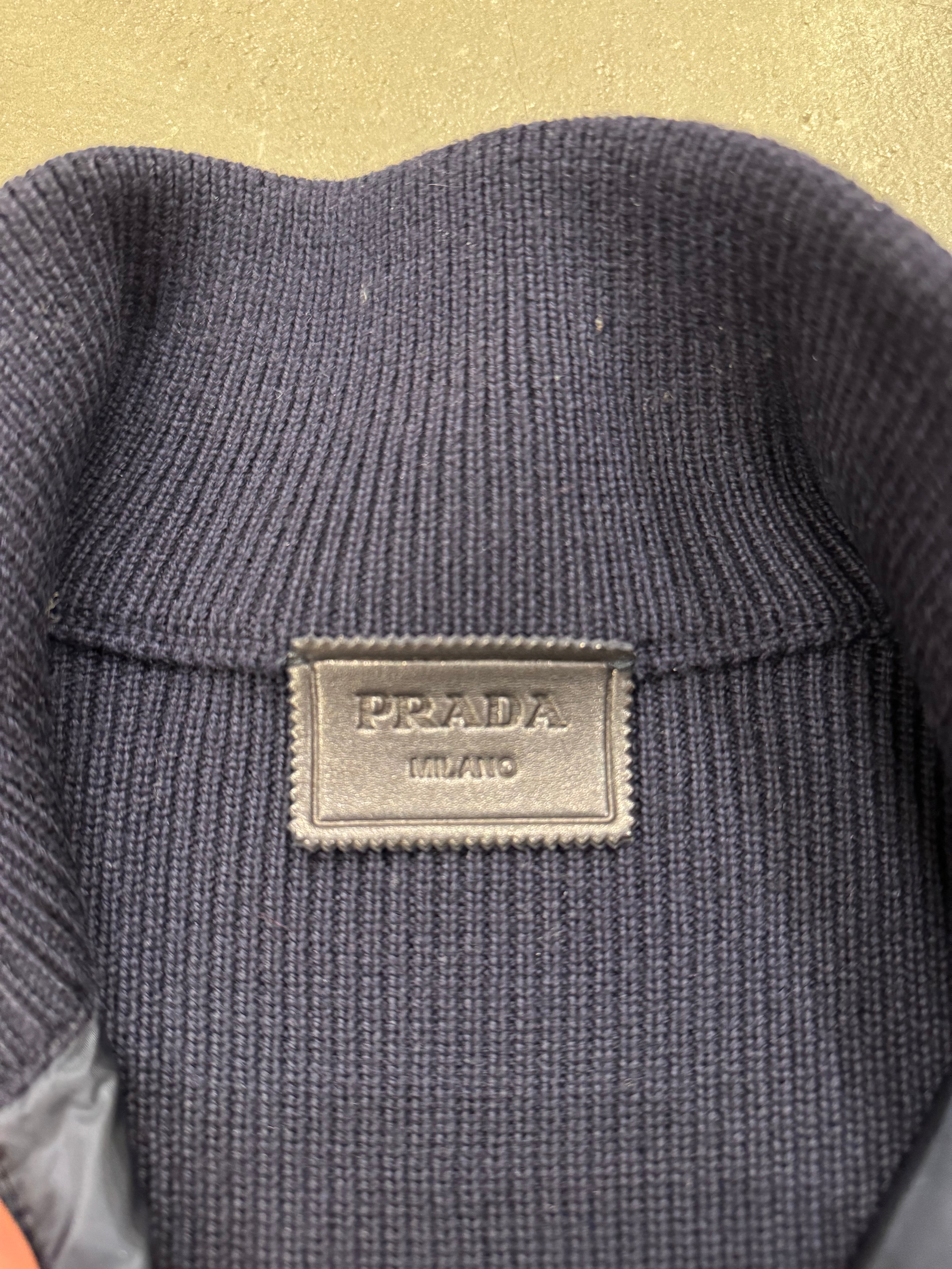 This Prada cardigan from the 2010s exemplifies the brand's mastery of material innovation. The front panel is crafted from luxurious black pony hair, creating a tactile contrast with the ribbed wool sleeves, back, and trim. Featuring a high funnel neck and full zip closure, the piece merges outerwear structure with knitwear comfort—an elevated, modern hybrid perfect for layering.