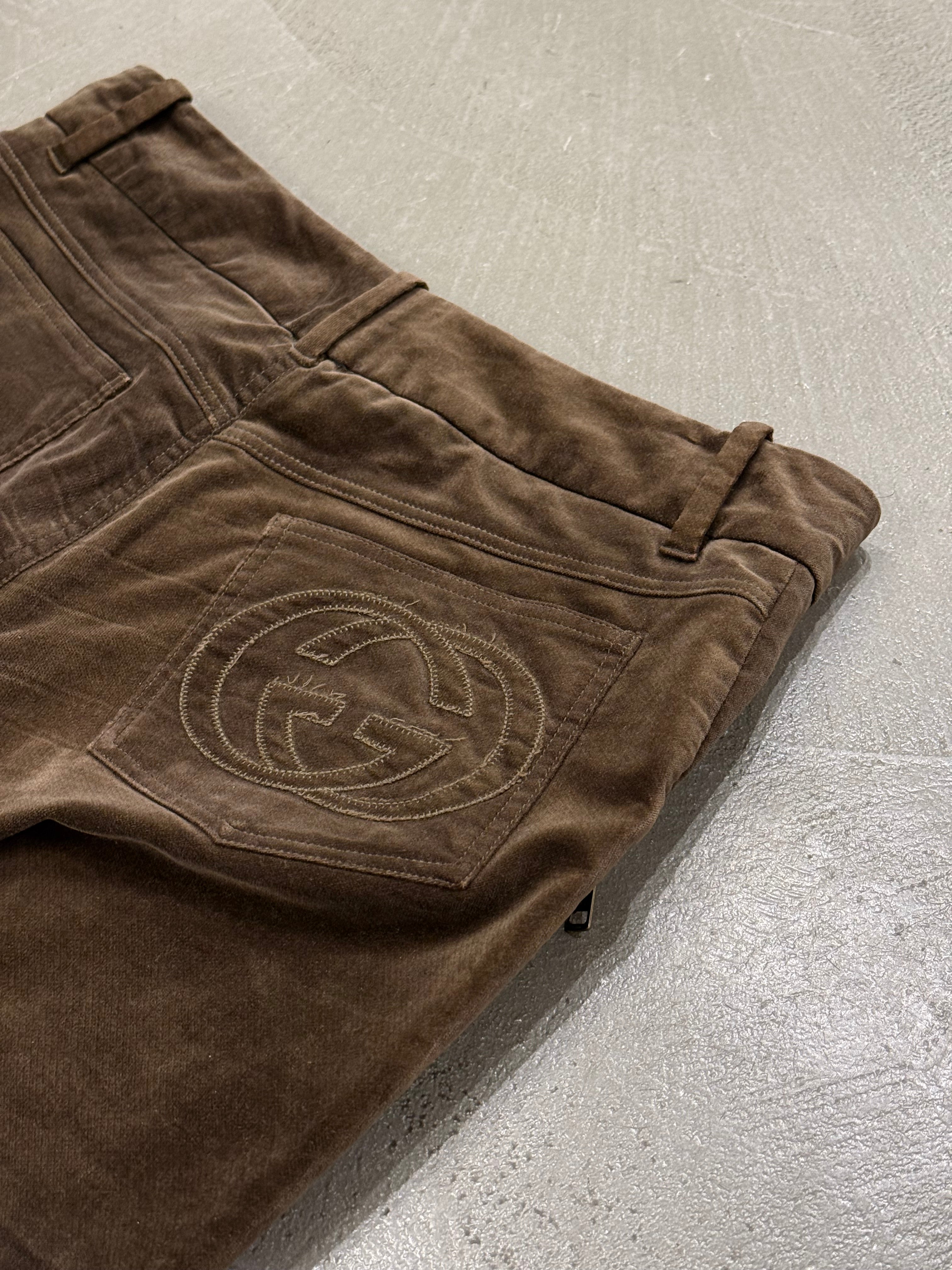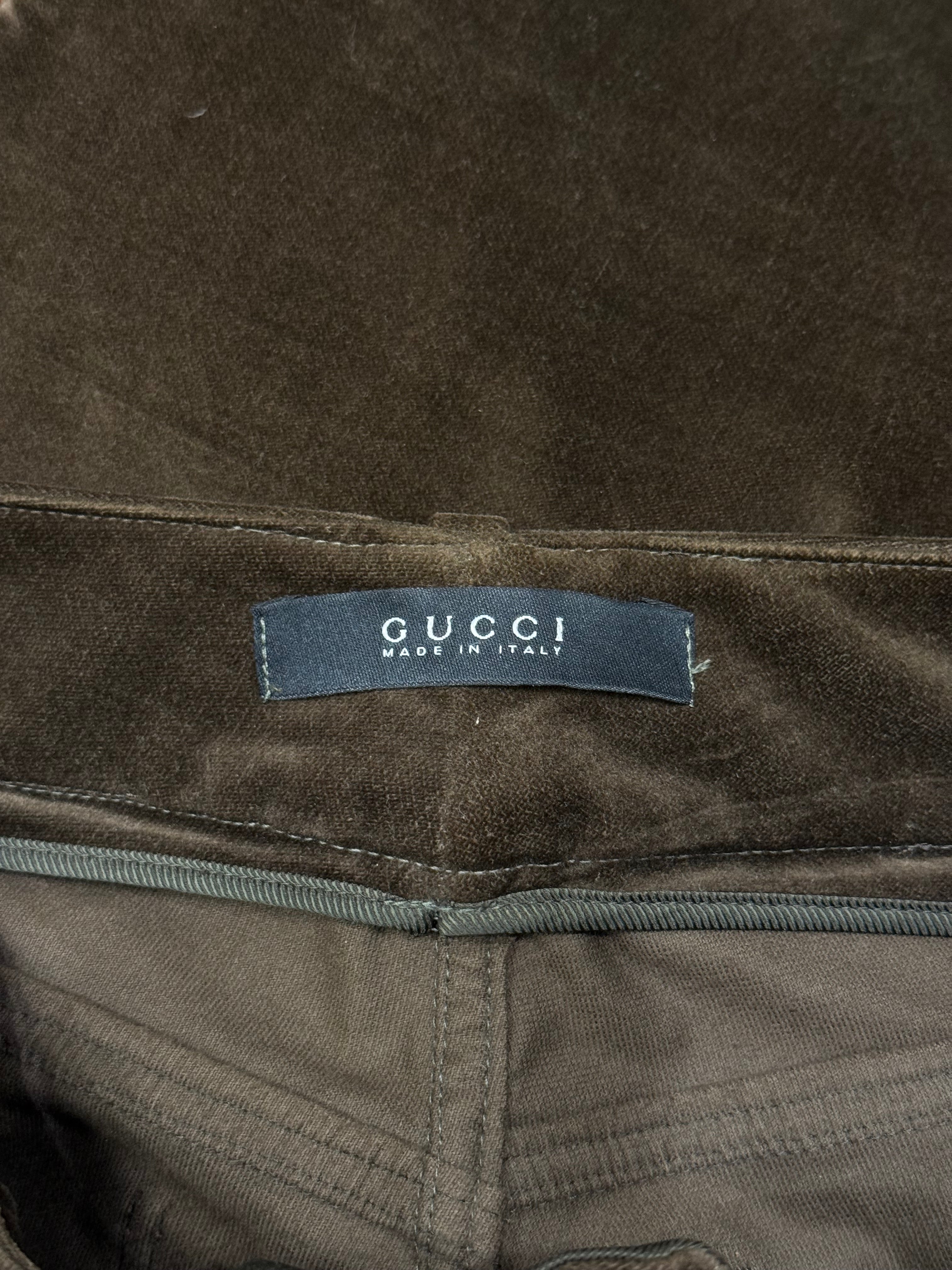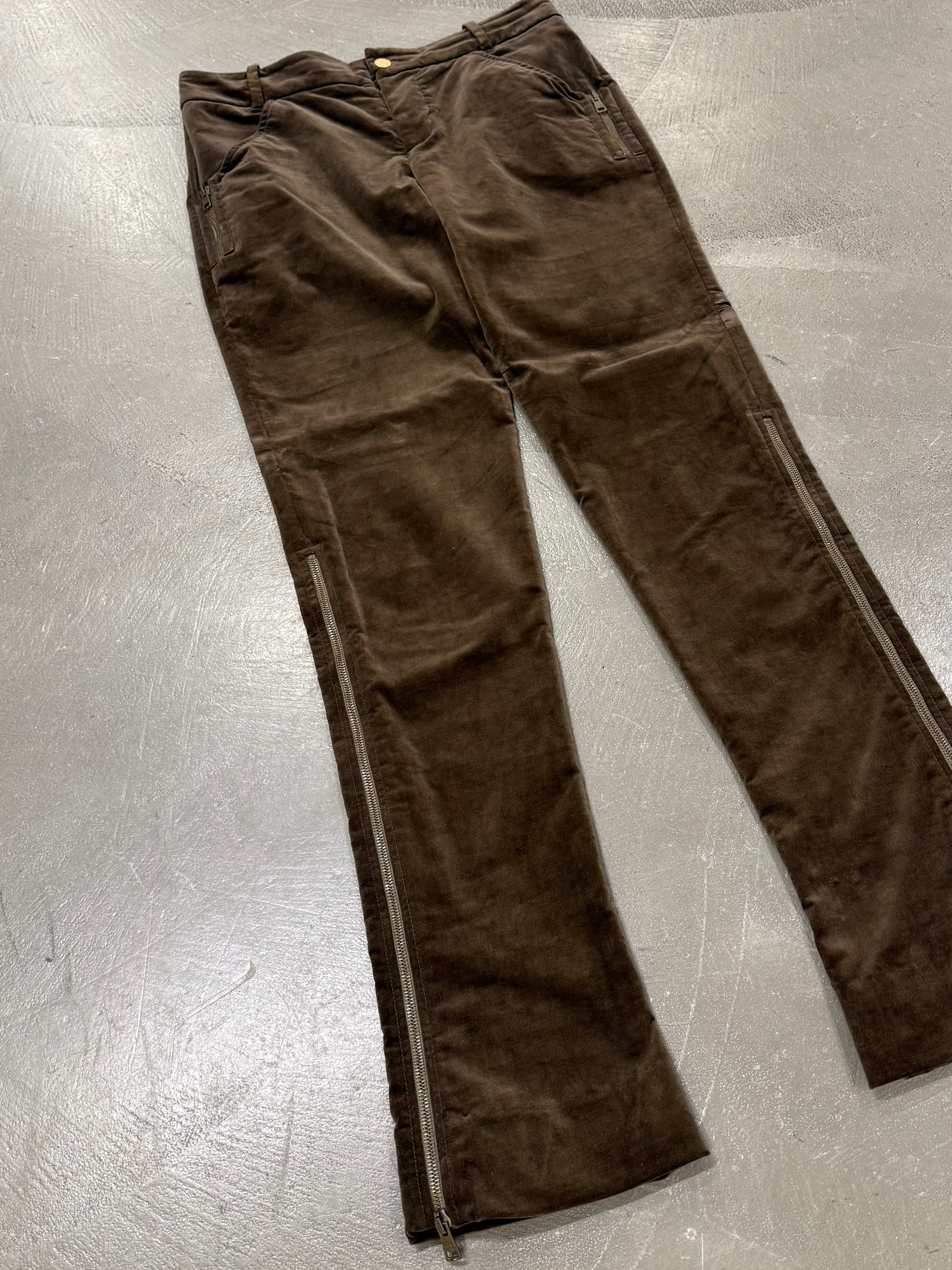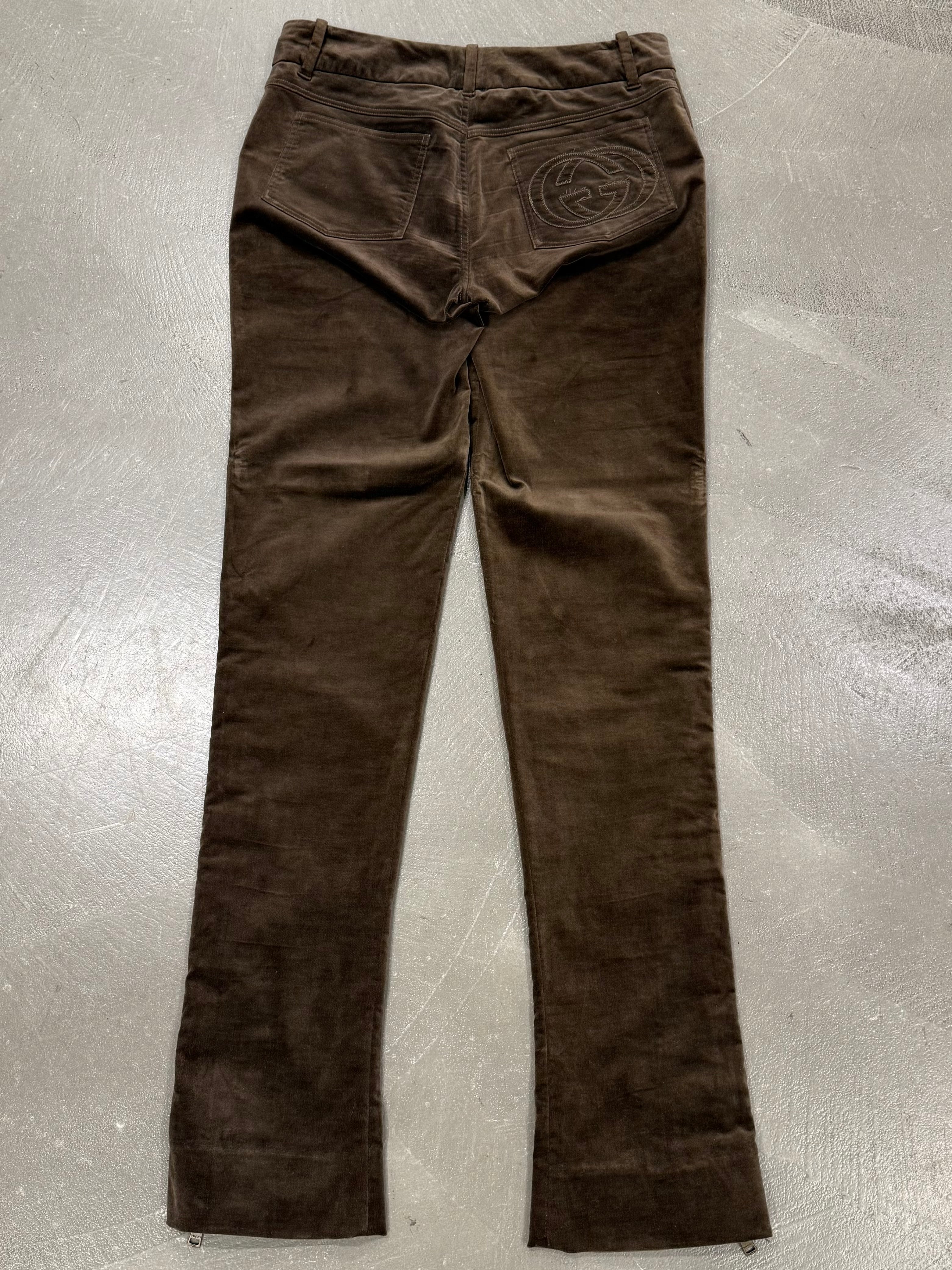 Iconic 2003 Gucci pants from Tom Ford’s tenure, crafted in rich velour with distinctive side zippers running along the flare. Designed to sculpt the leg with a low rise and sensual, elongated silhouette typical of the early-2000s Ford aesthetic.