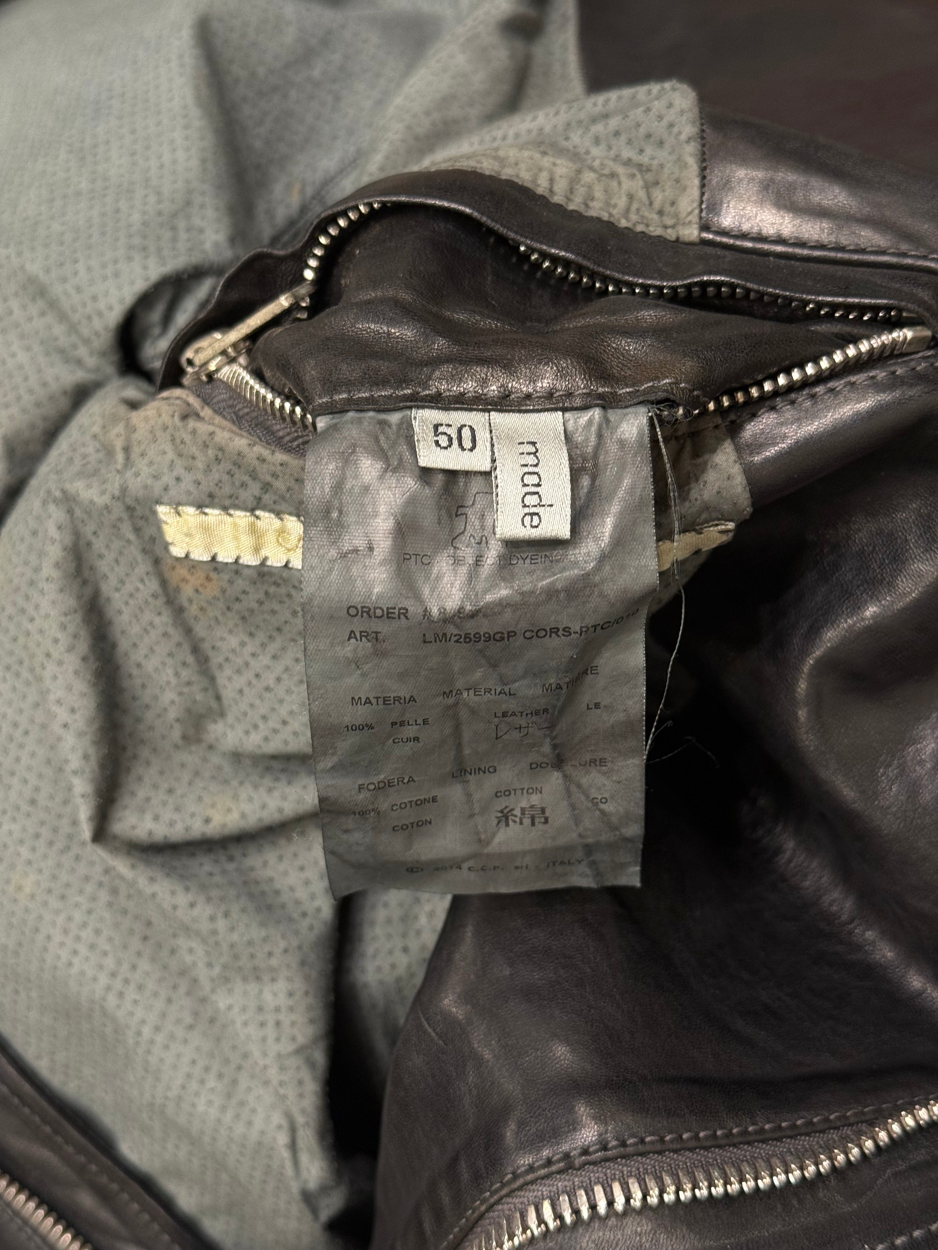 The jacket features a minimalist front zip closure, slim fit proportions and articulated construction that emphasizes movement and body interaction. The leather has softened over time, resulting in a rich patina and a worn-in feel that enhances the uniqueness of the piece.