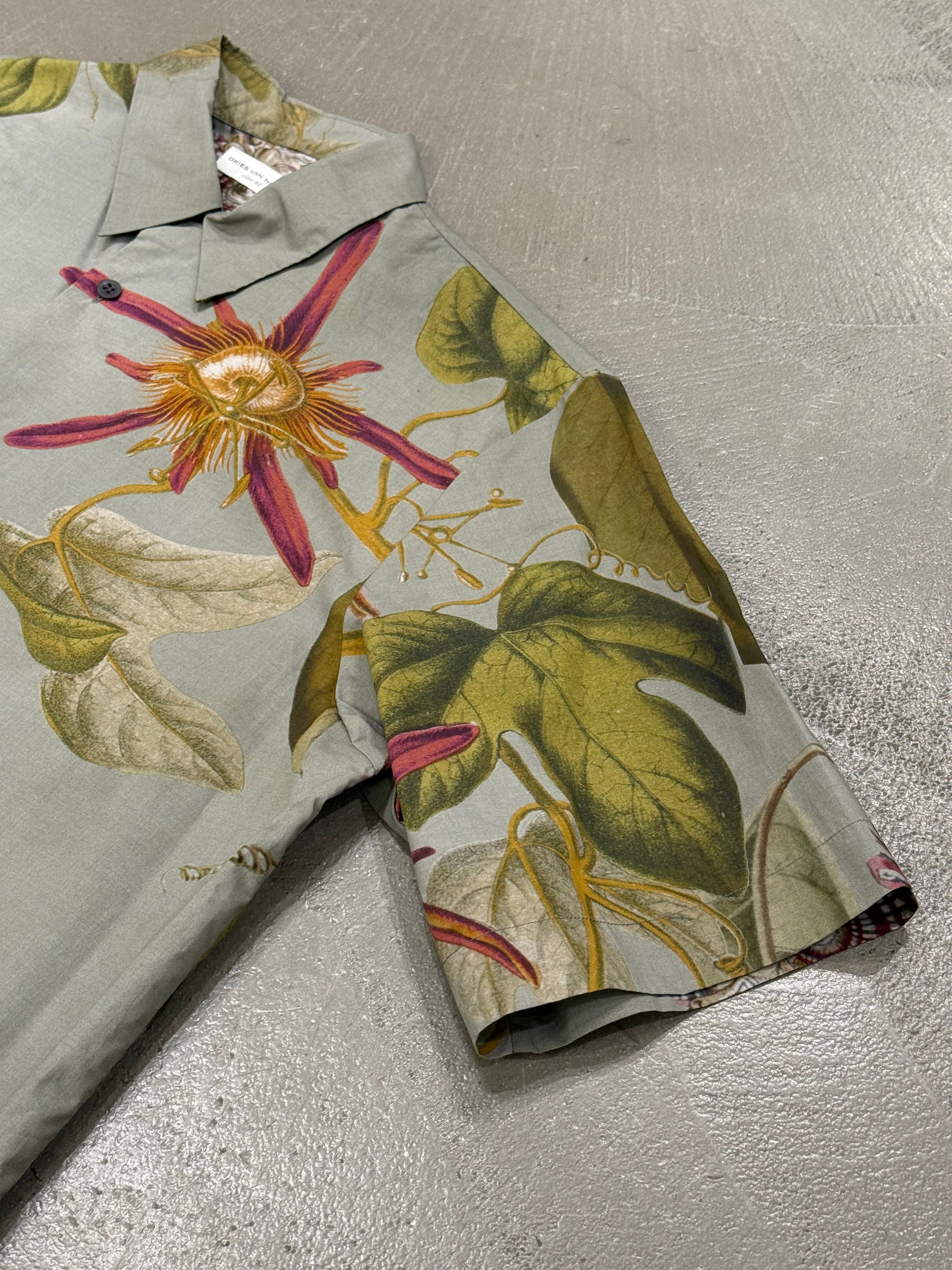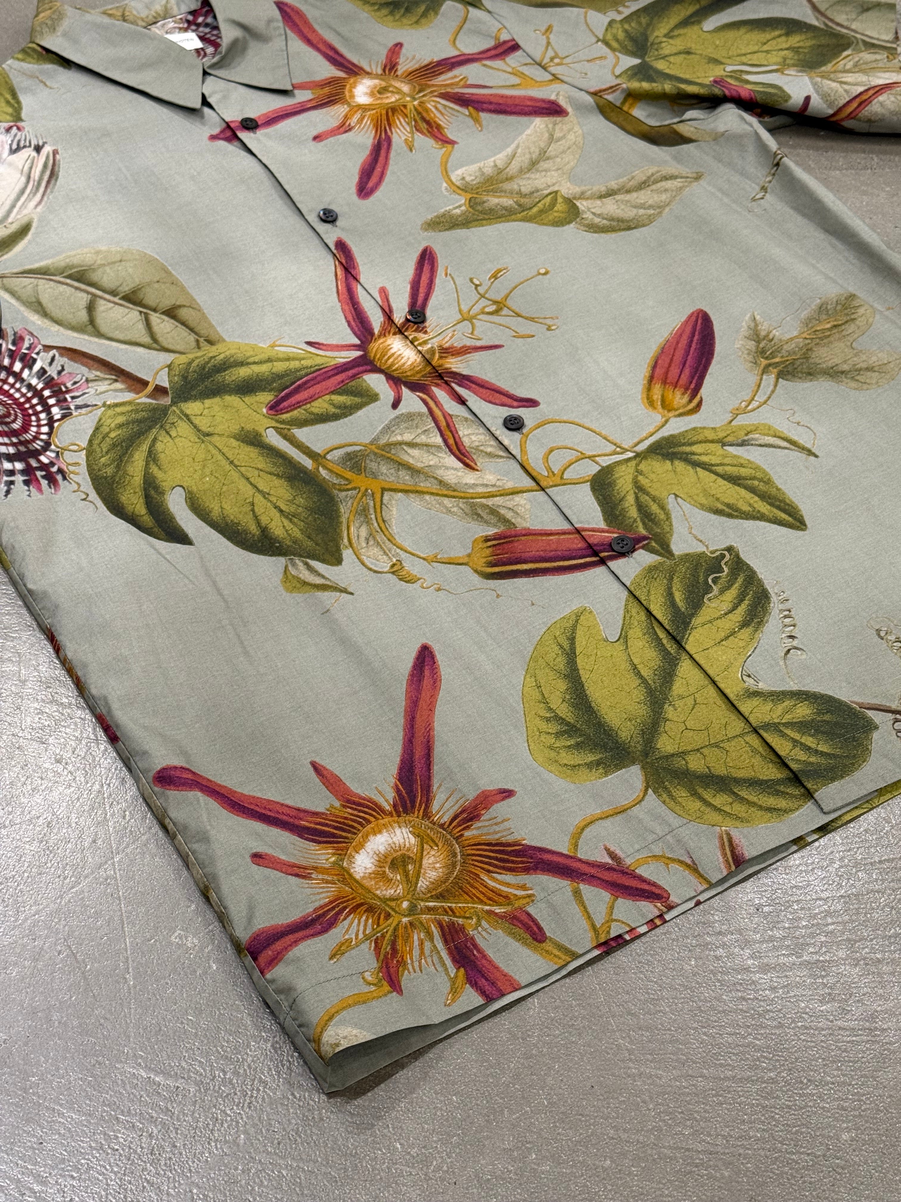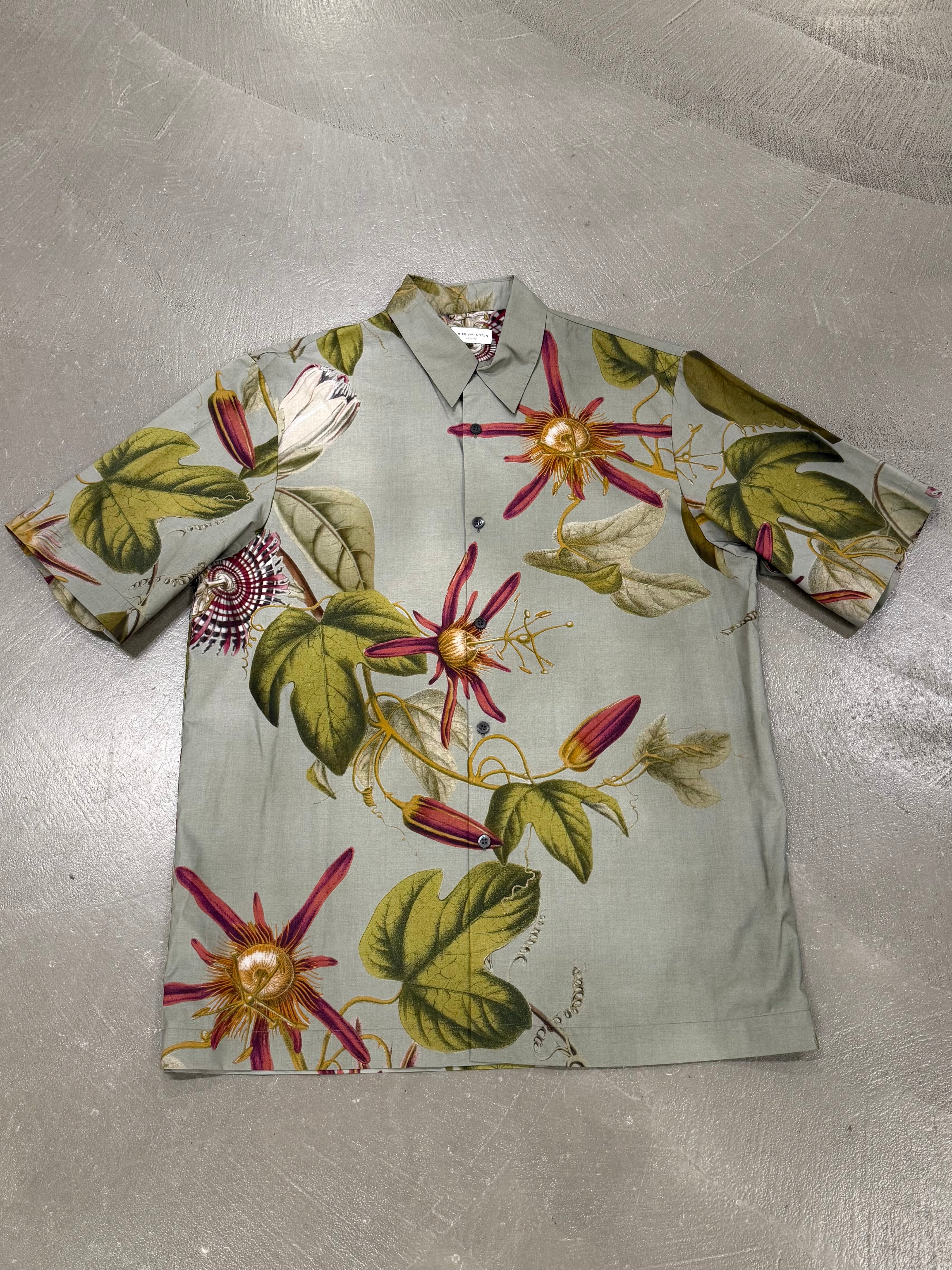 This Dries Van Noten shirt from the 2000s is crafted from lightweight fabric with a striking oversized floral print in earthy tones of green and red over a soft grey base. Featuring a relaxed fit, short sleeves, and a pointed collar, it embodies the designer’s poetic and artistic approach to menswear, balancing boldness with sophistication.