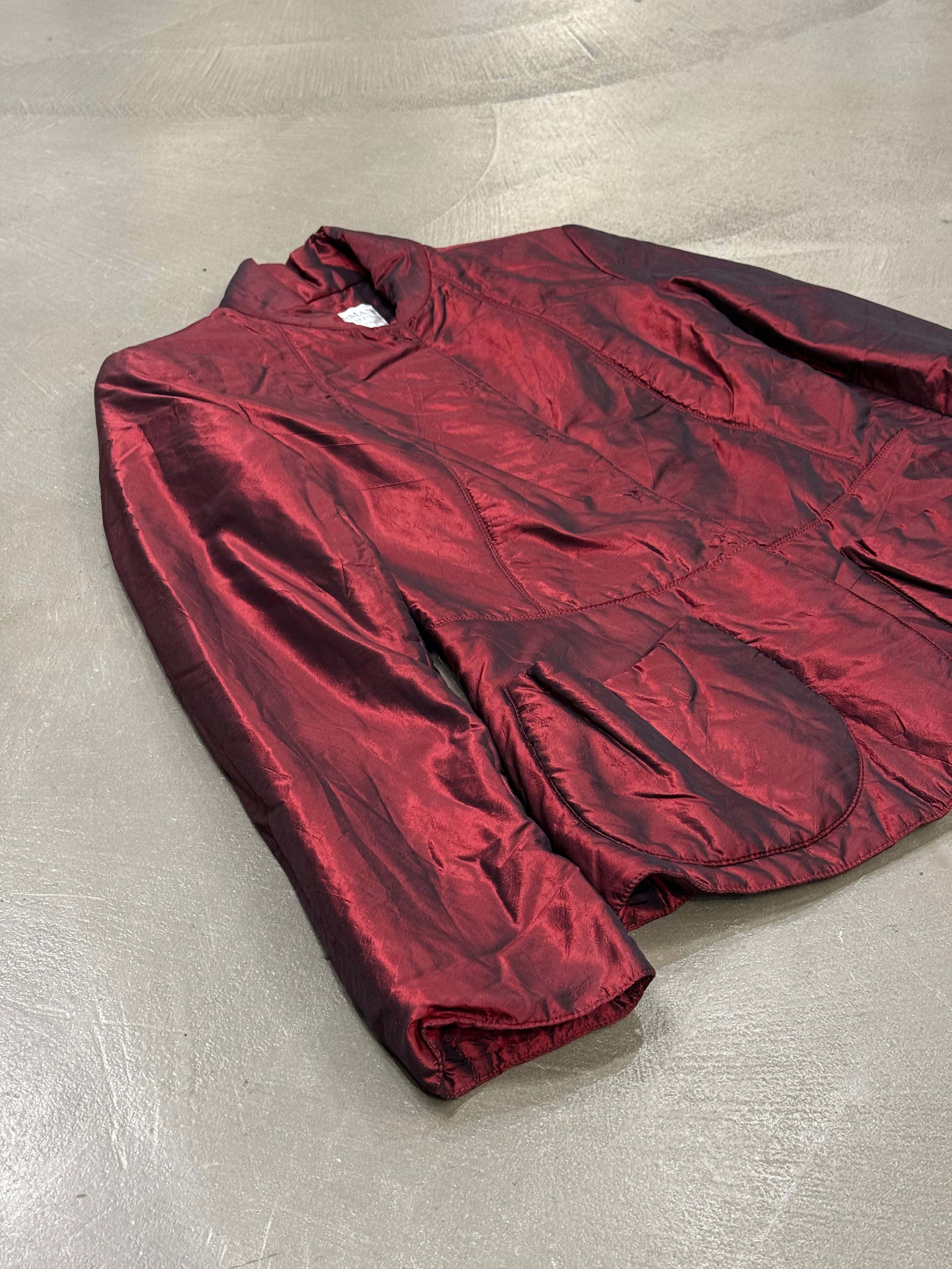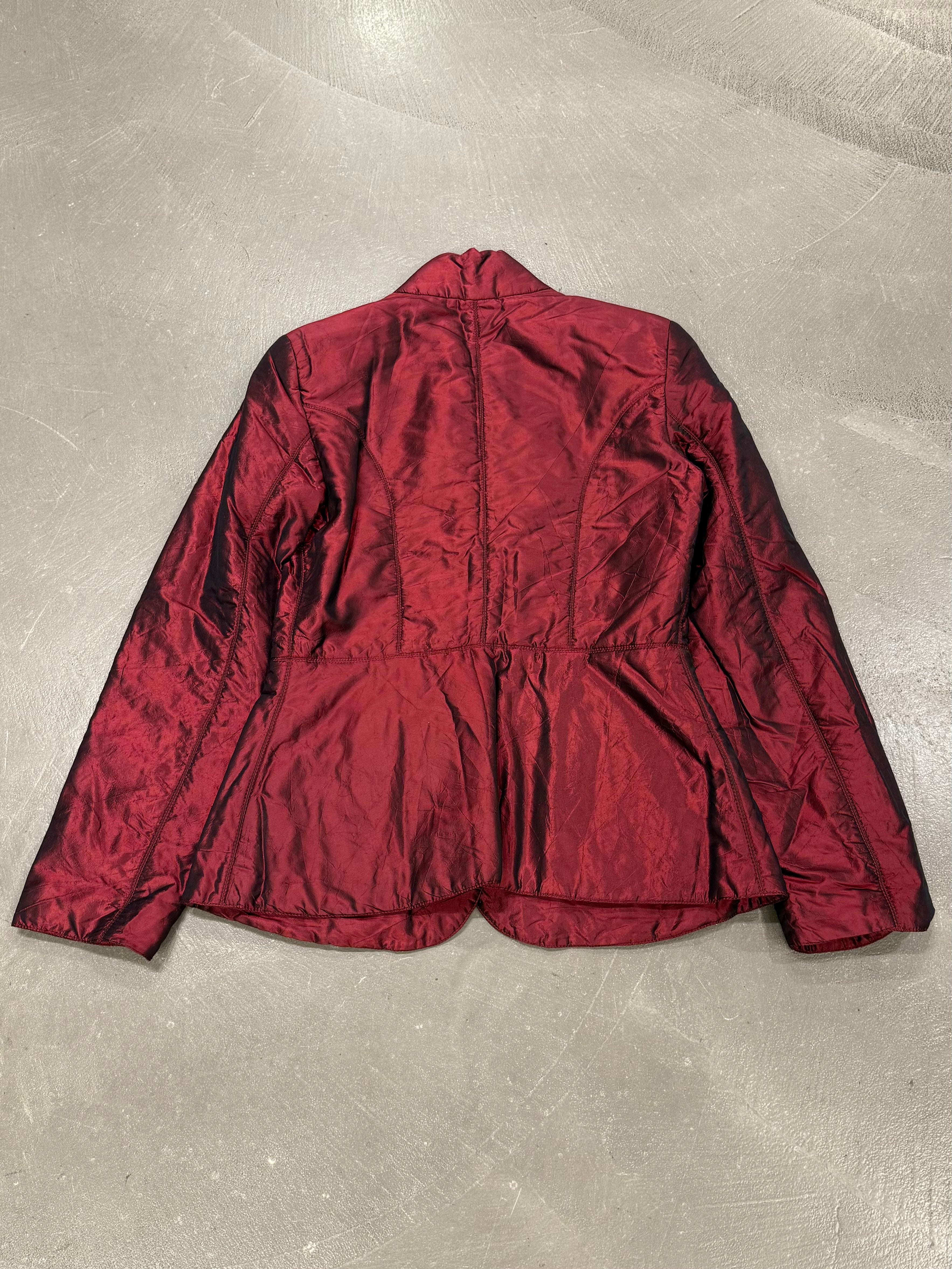 This Armani jacket from the 2000s is crafted from lightweight nylon with a striking iridescent sheen in deep red tones. Featuring a tailored cut with a subtle stand collar, flap pockets, and a slightly curved hem, it balances casual utility with refined elegance. Its shimmering surface gives it a modern, eye-catching appeal, making it versatile for both day and evening wear.