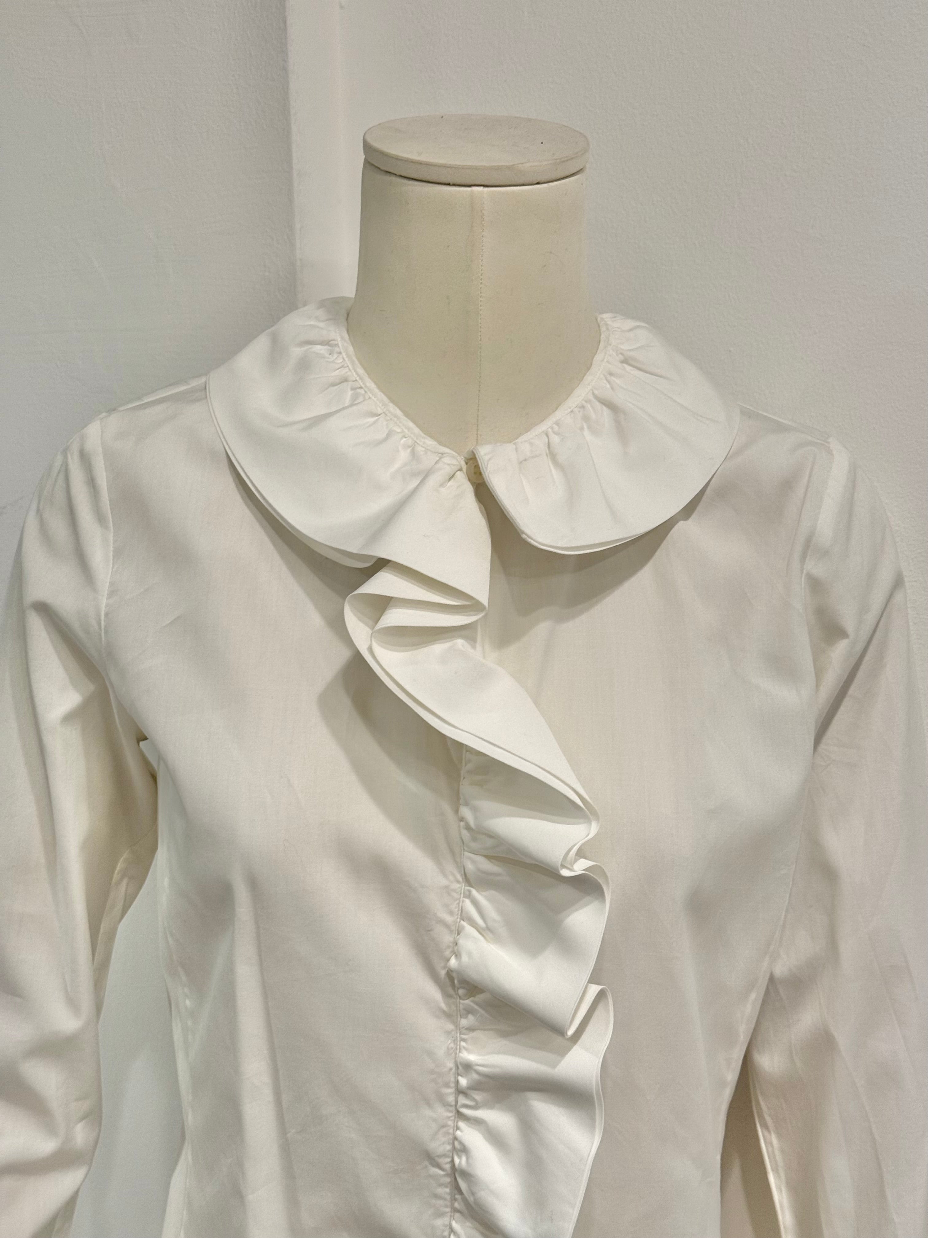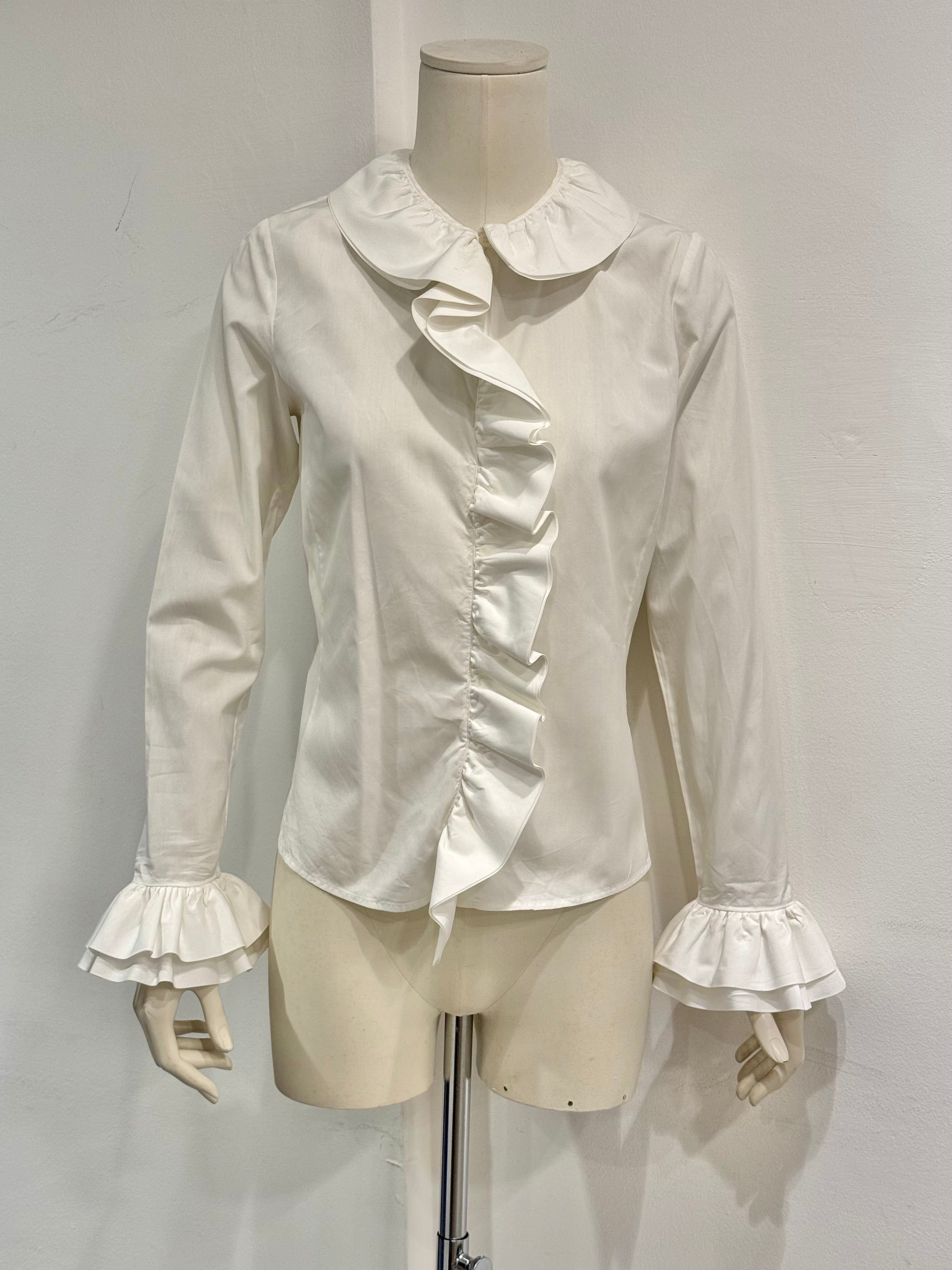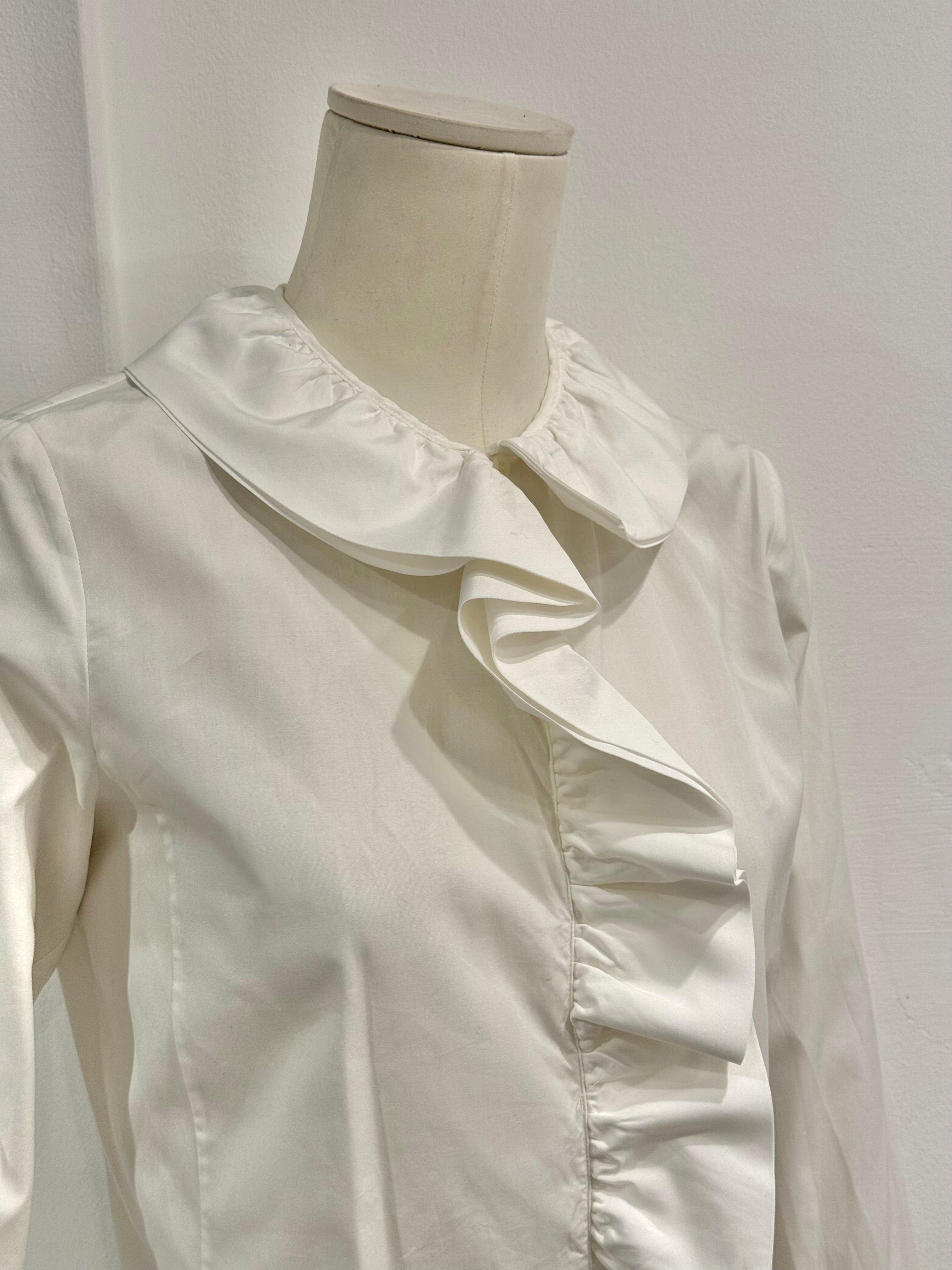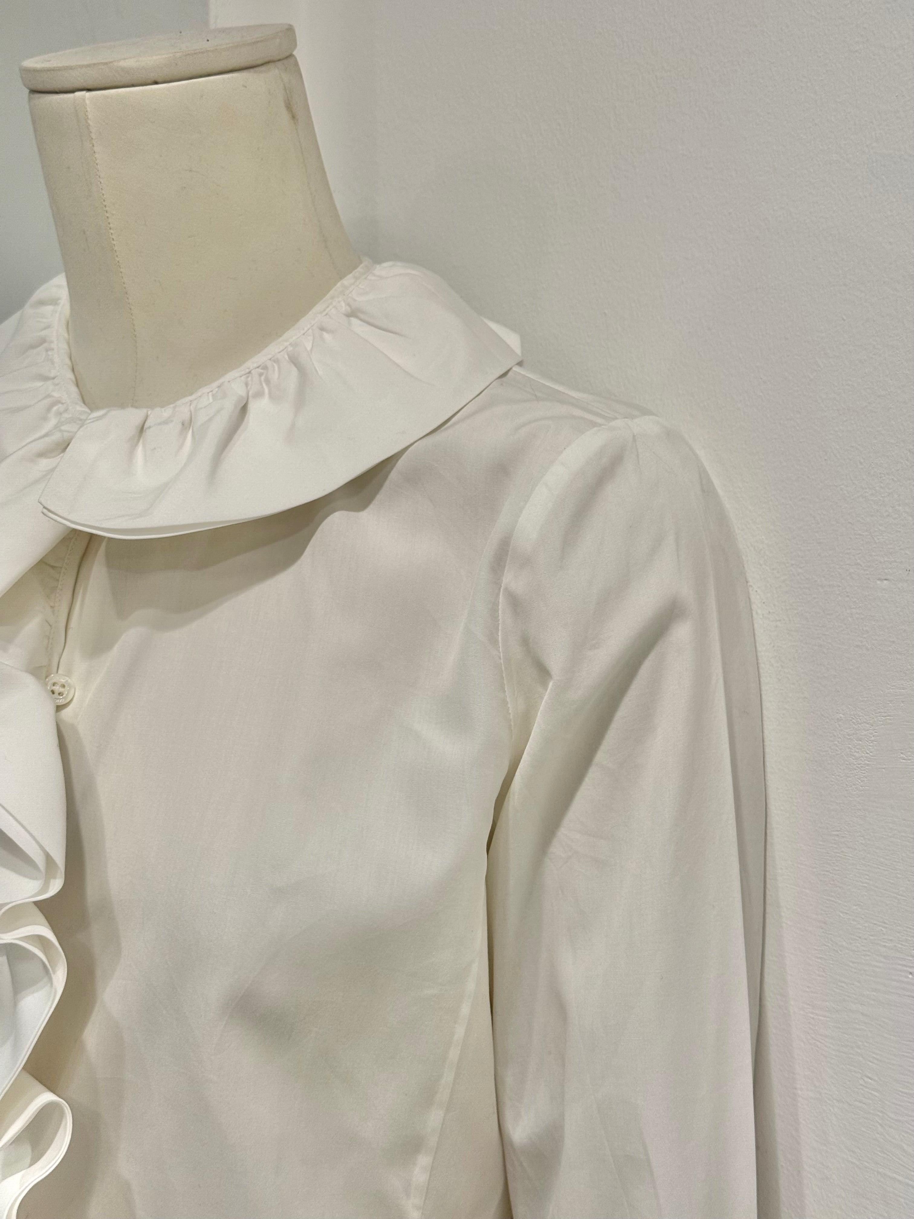 This Gucci shirt from the Tom Ford era, circa 2000, features an elegant and playful design. Crafted in crisp white cotton, it showcases a ruffled asymmetrical front placket, rounded collar, and flared cuffs with gathered detailing. A perfect example of Ford’s ability to merge sensuality with refined tailoring, making a simple shirt into a statement piece.