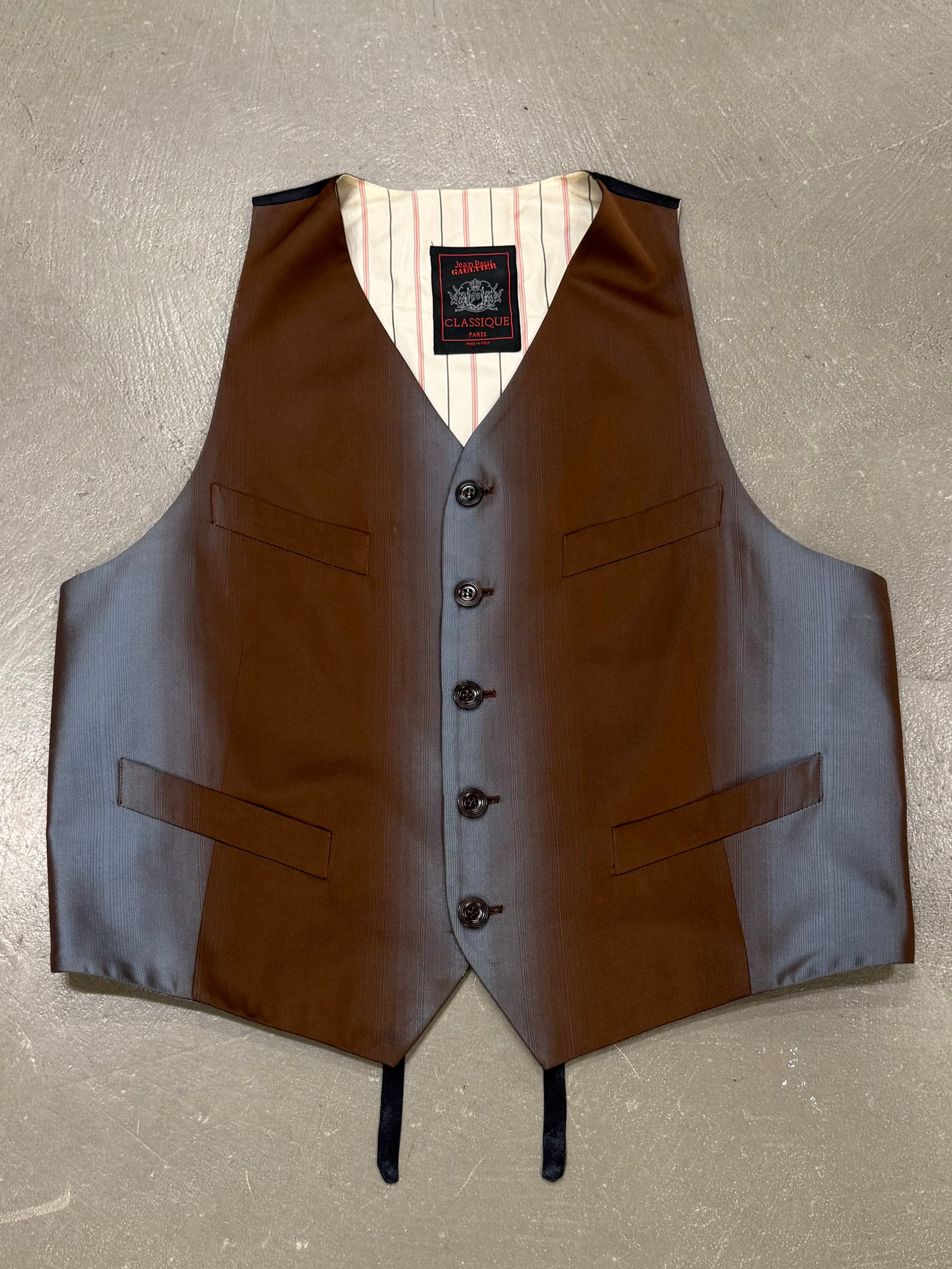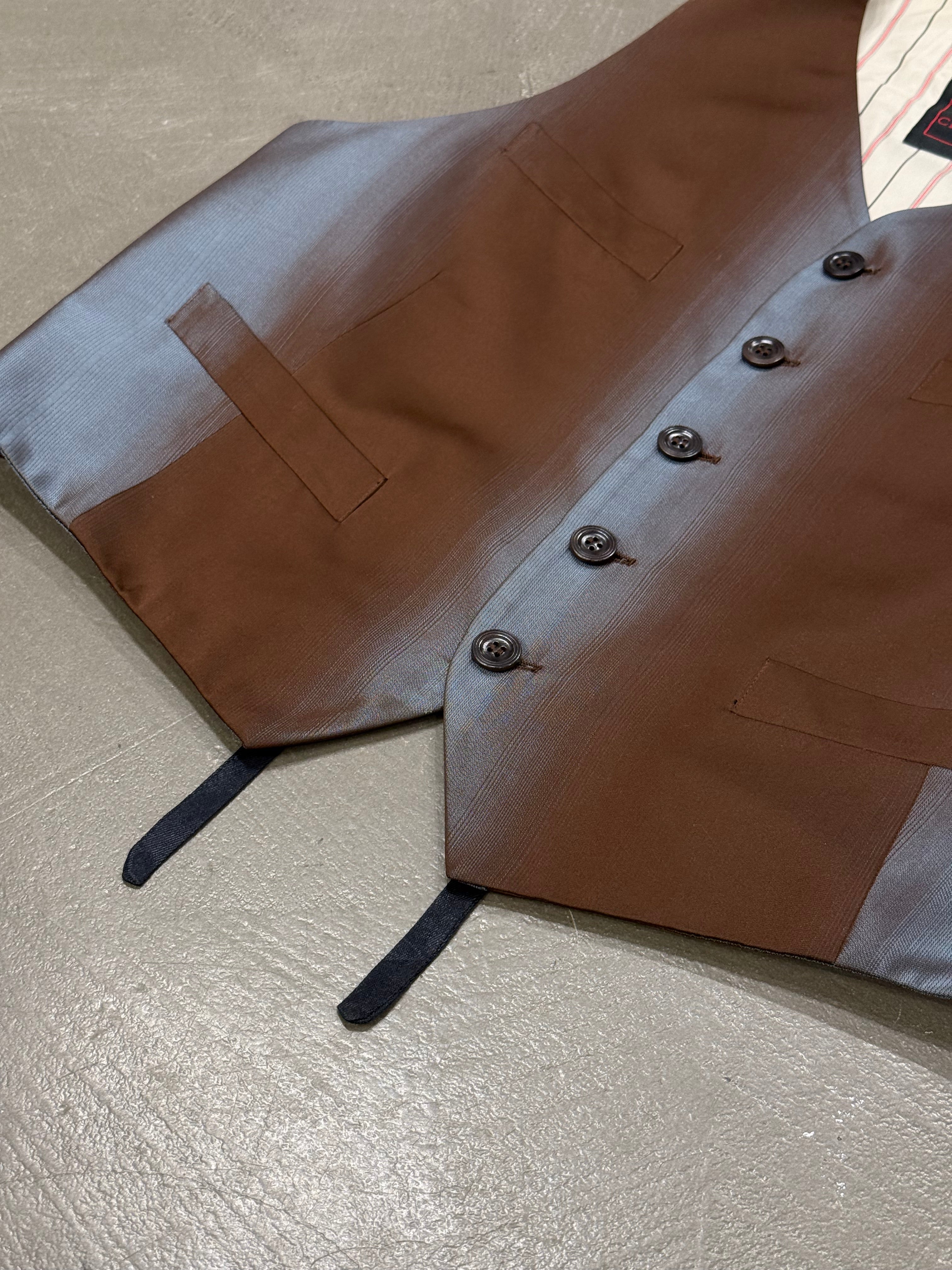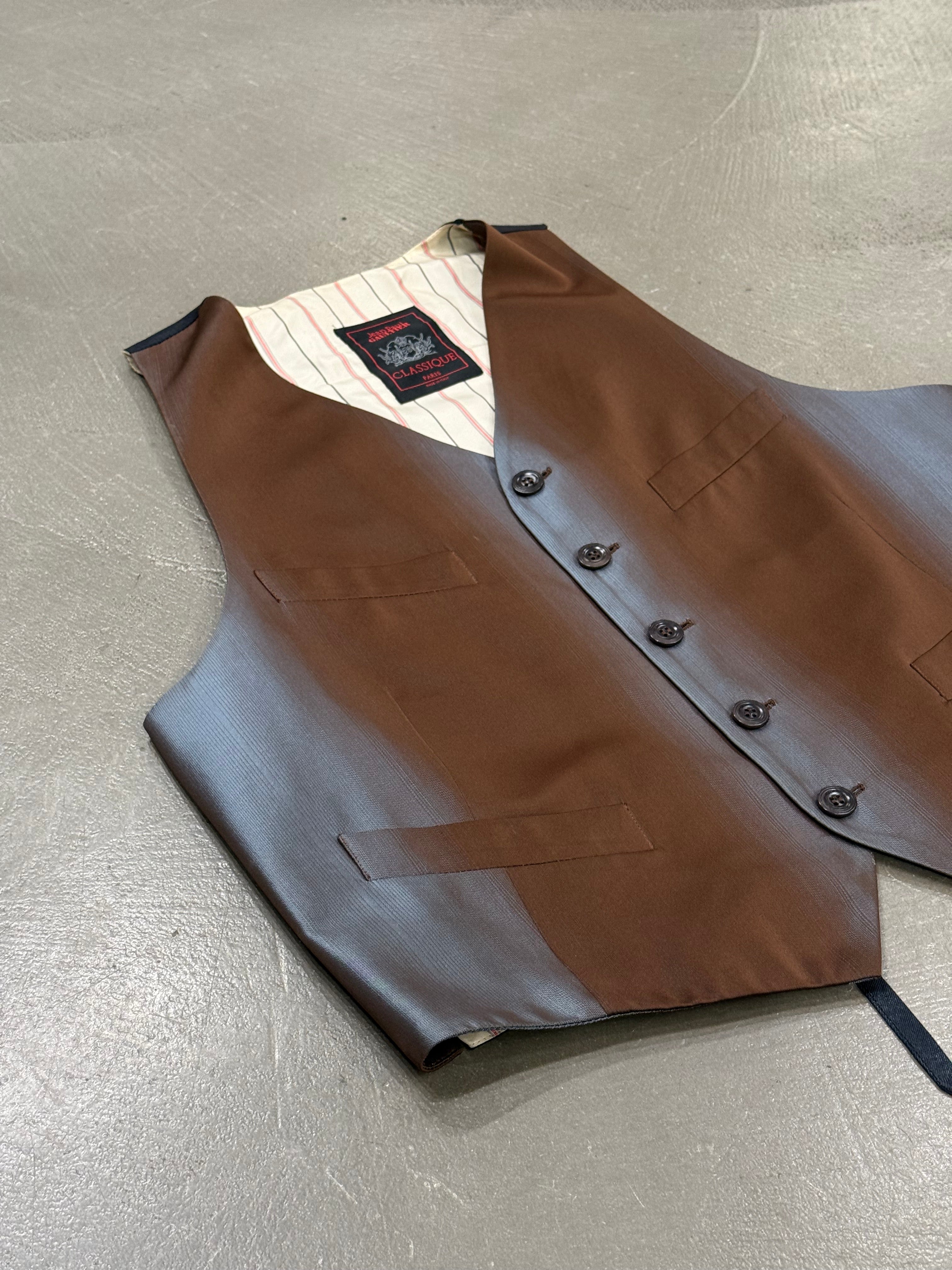 This Jean Paul Gaultier vest from the 1990s is crafted from a lustrous fabric with a unique iridescent gradient effect that shifts between brown and steel tones under the light. Featuring a classic tailored cut with front button closure, multiple welt pockets, and an adjustable back strap, it embodies Gaultier’s play on traditional menswear codes with a subversive twist.