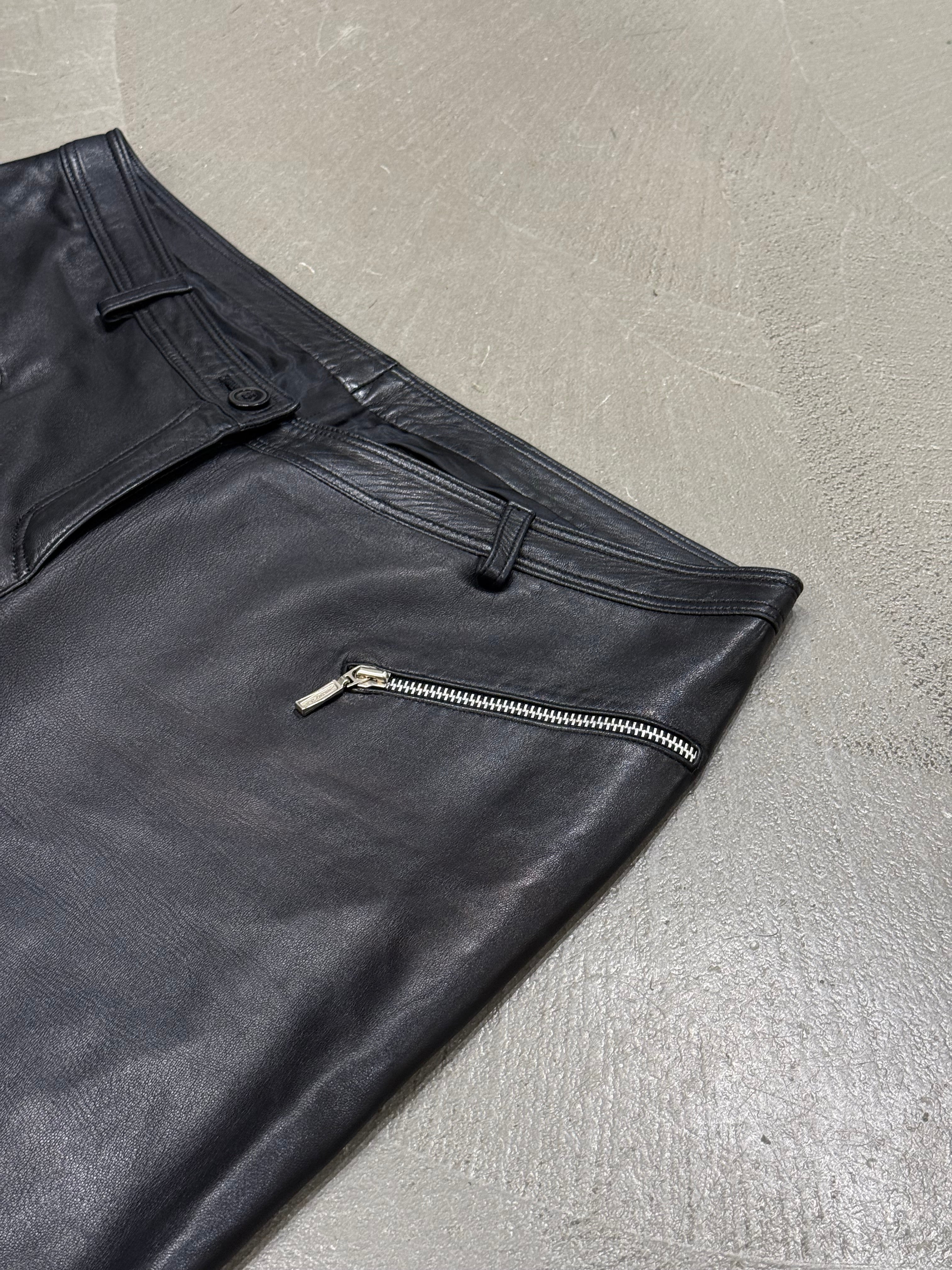 These Gianni Versace pants from the 1990s are crafted from supple black leather, featuring silver-tone zipper details at the pockets that add a bold and utilitarian edge. Designed with a mid-rise waist and straight-leg cut, they capture the house’s signature mix of luxury and daring aesthetics. A timeless archival piece for collectors of Versace’s bold 90s designs.