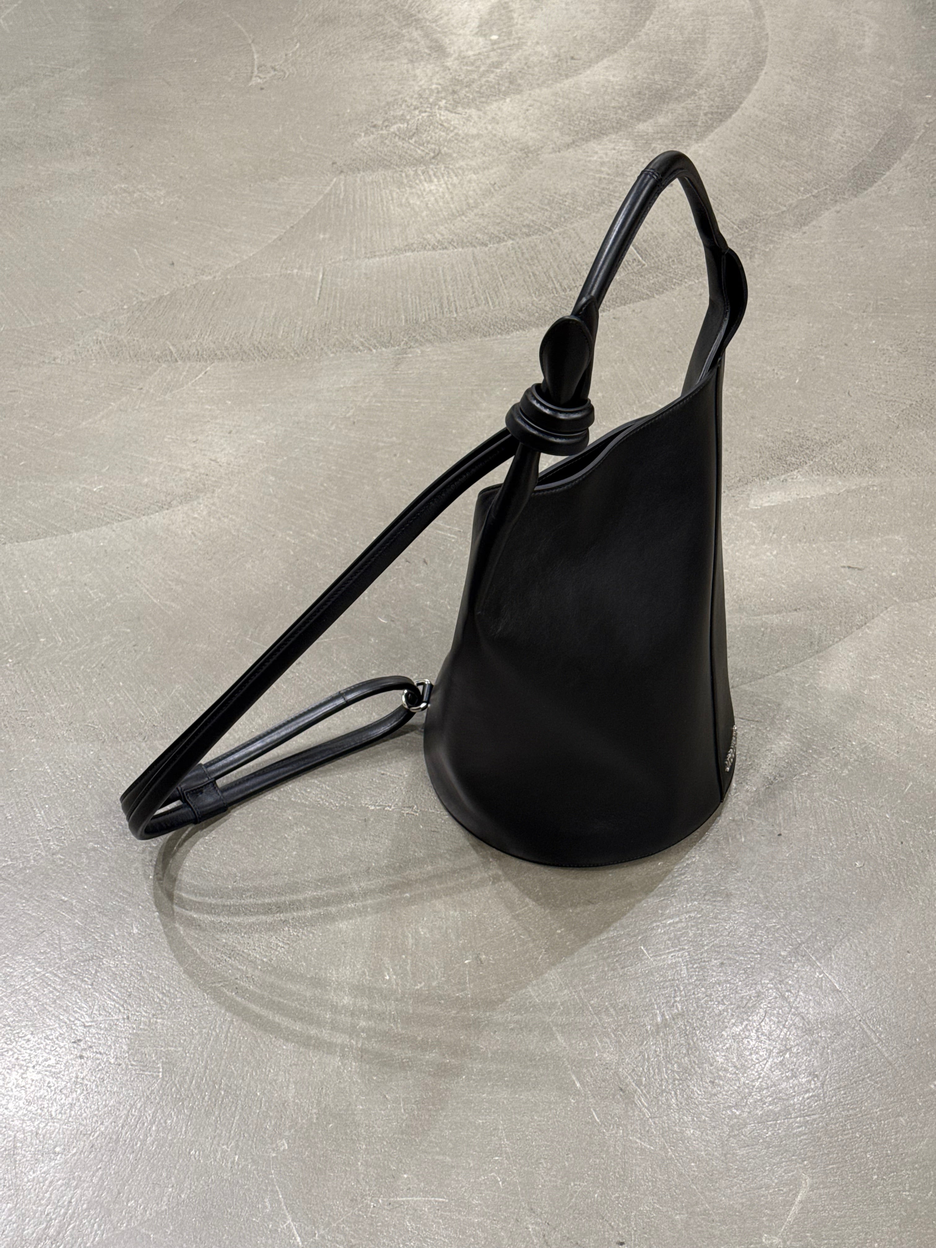 This Jacquemus bucket bag features the brand’s signature minimalist silhouette crafted in smooth black leather. Its structured cylindrical shape and knotted top handle create a refined yet contemporary look, ideal for both everyday use and statement styling. The bag opens to a spacious interior that fits daily essentials with ease.