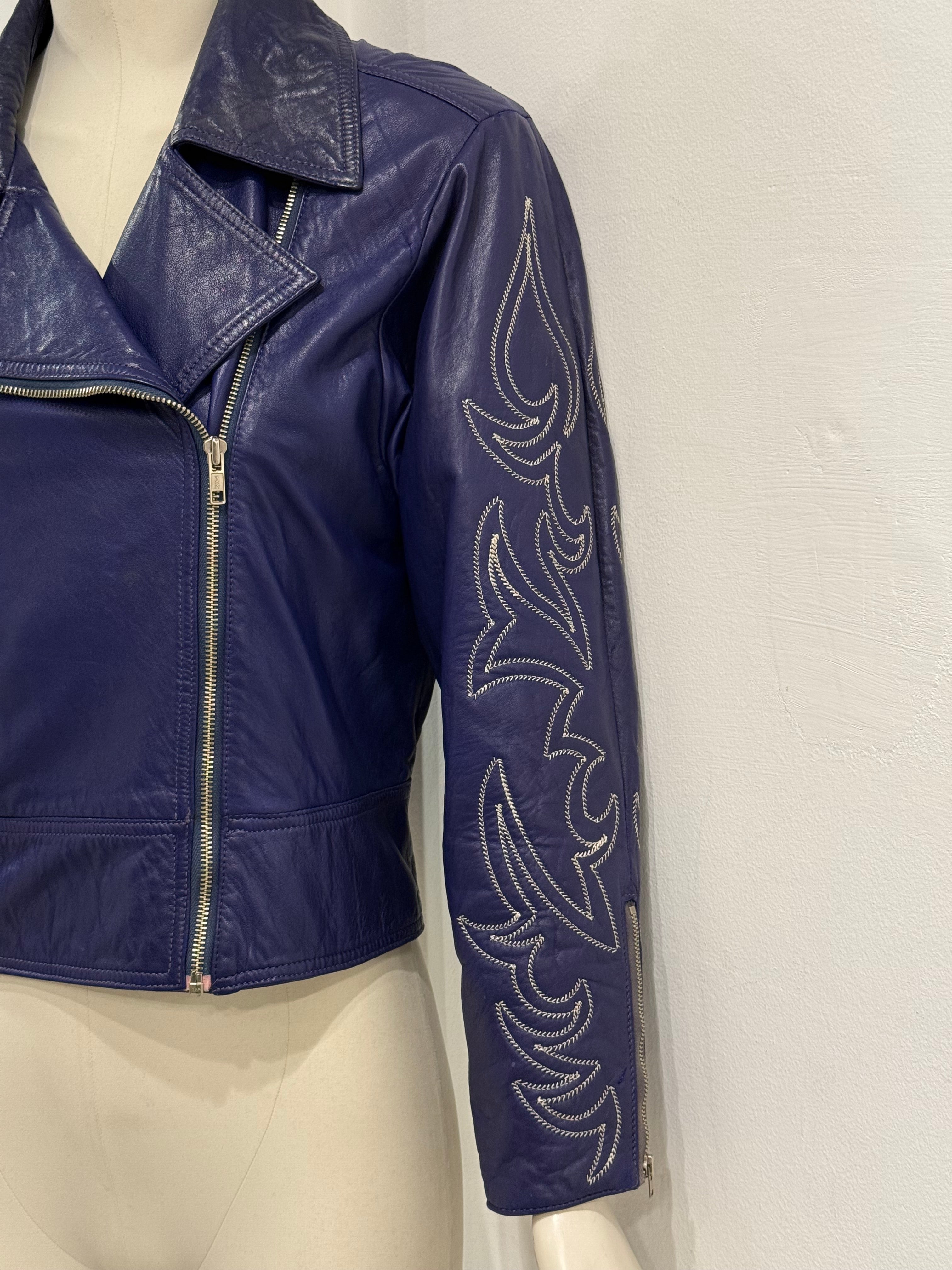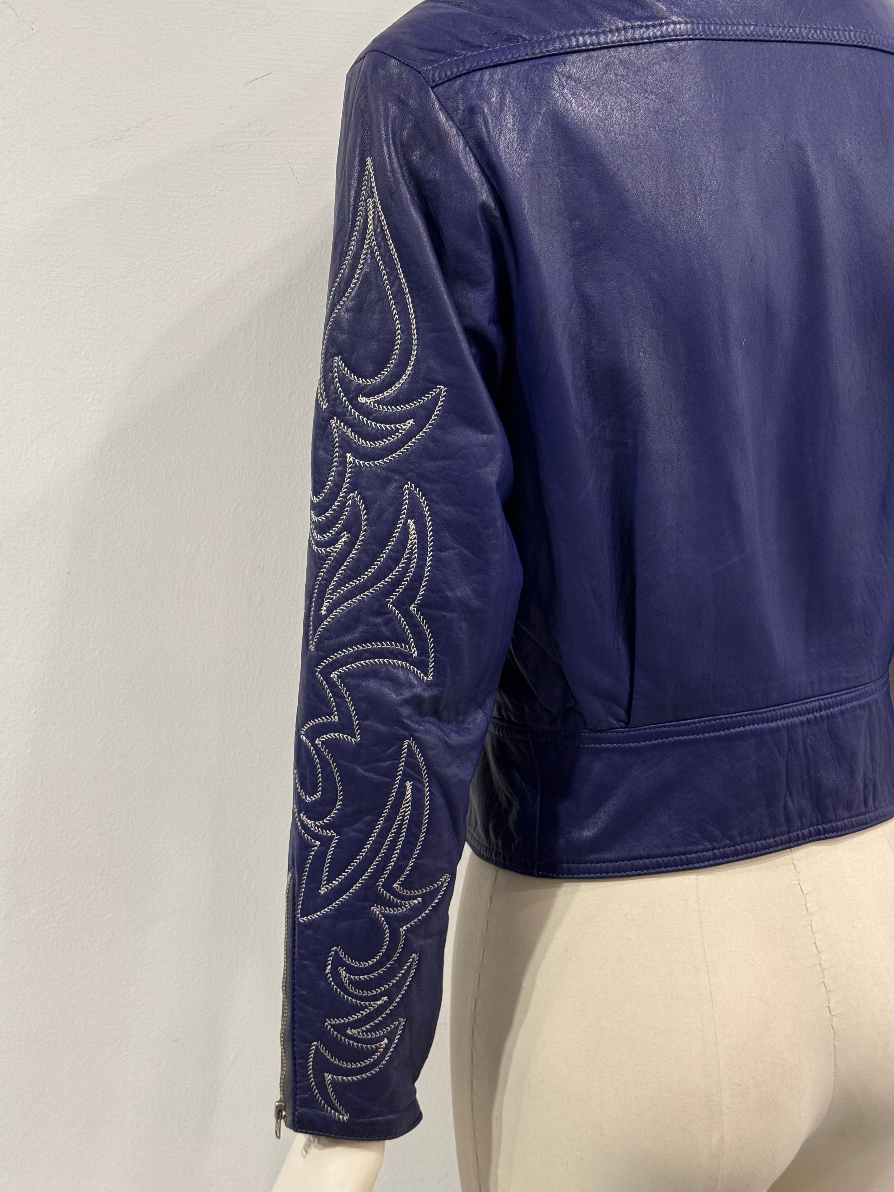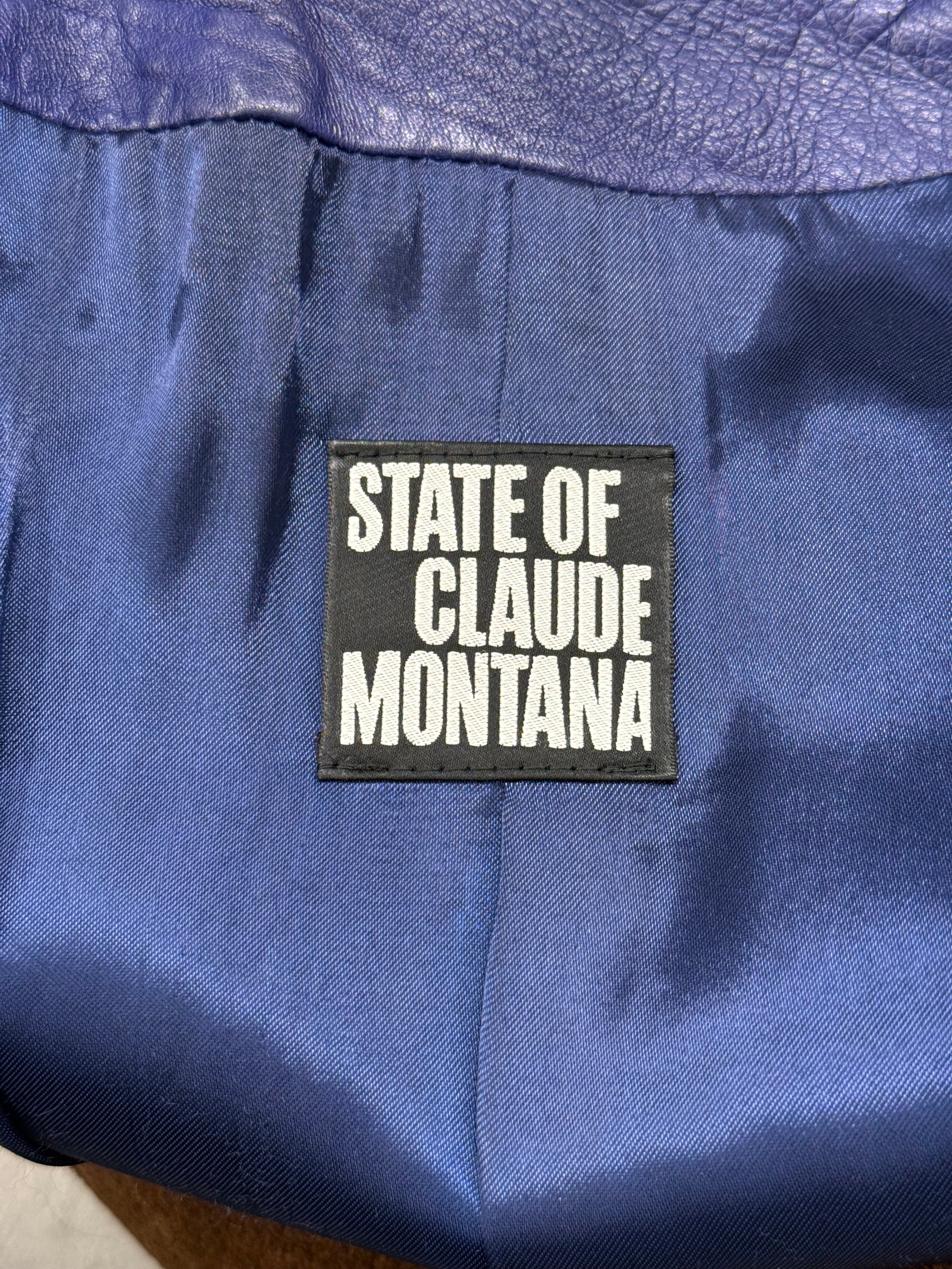 This vintage Claude Montana leather jacket from the 1980s showcases the designer’s signature bold tailoring and sculptural silhouette. Crafted from supple blue leather, it features striking embroidery along the sleeves, an asymmetrical zip closure, and wide lapels that enhance its structured biker-inspired cut. A true statement piece capturing the powerful aesthetic of 1980s high fashion.