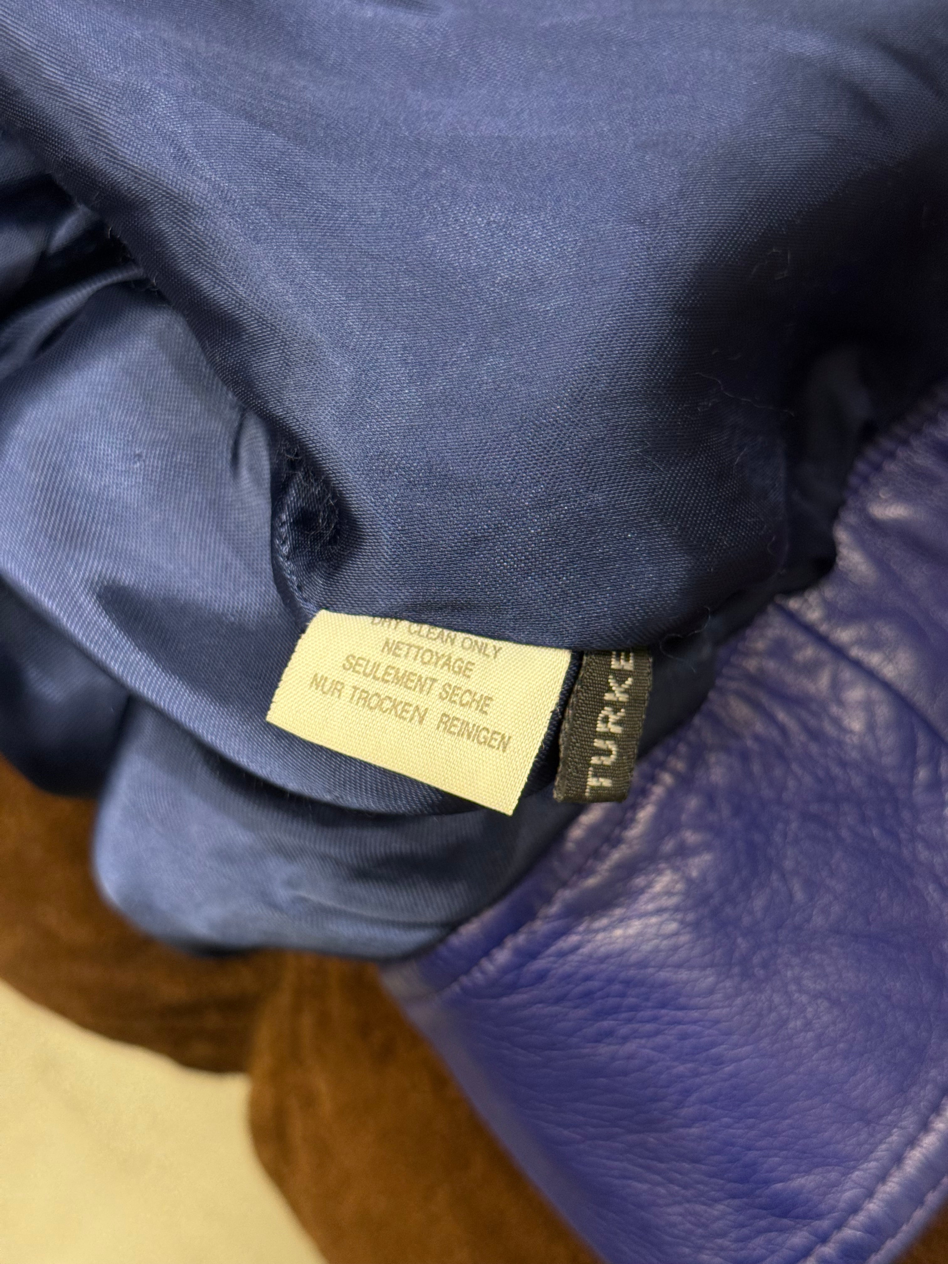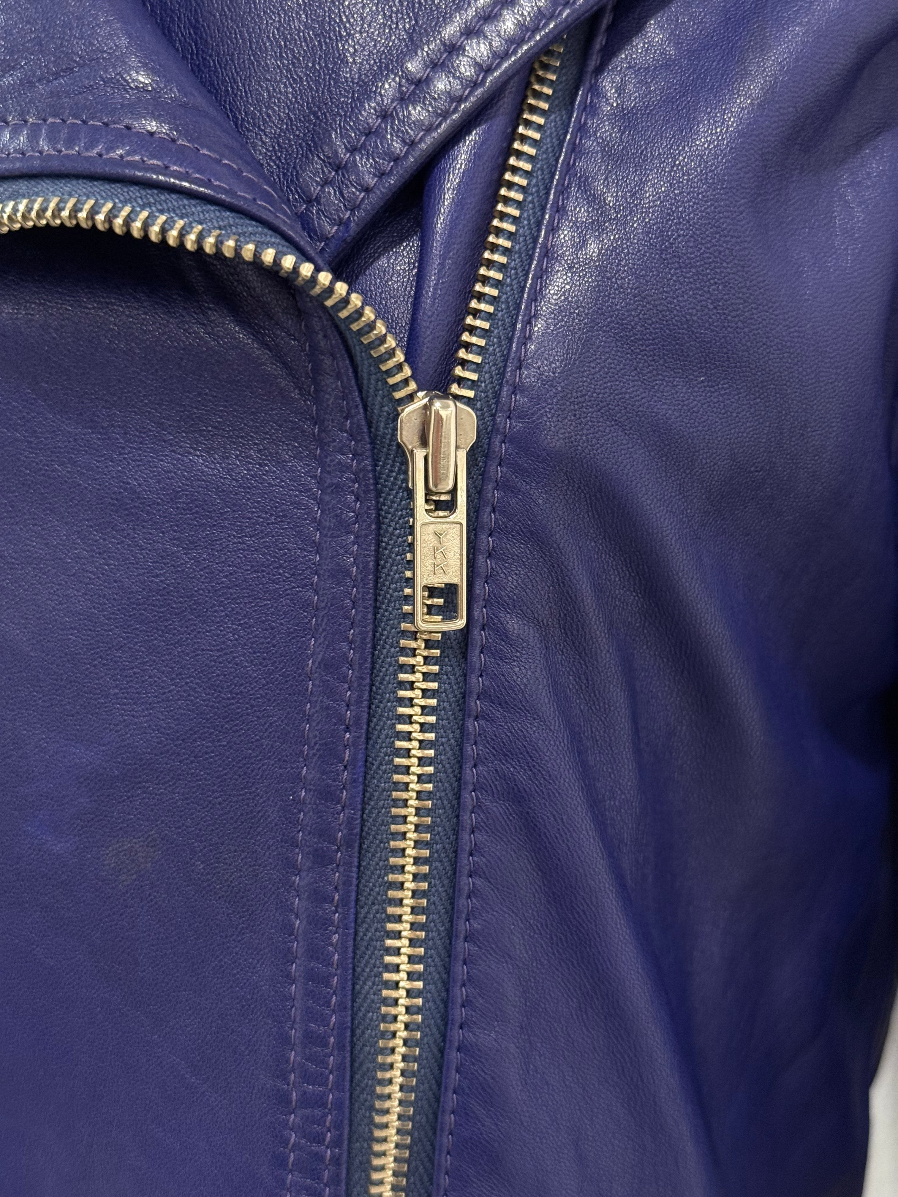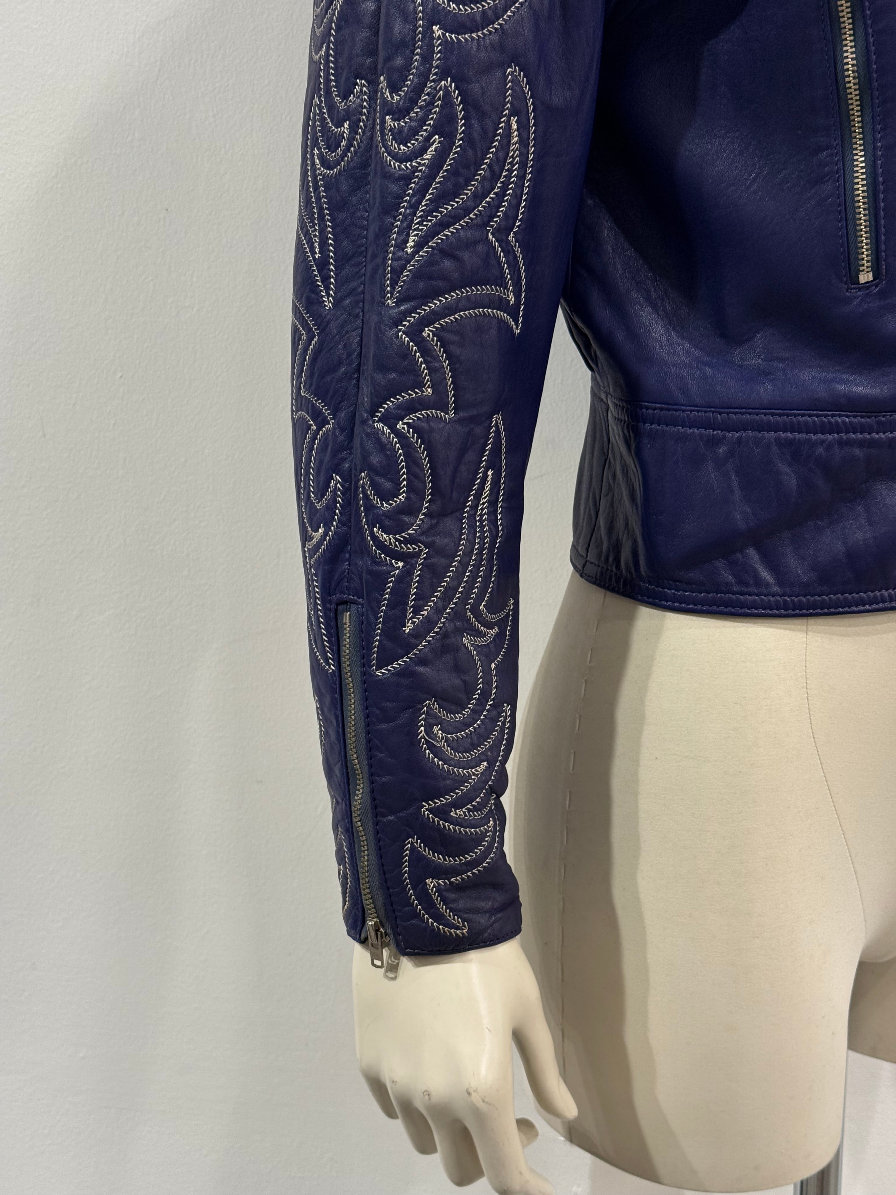 This vintage Claude Montana leather jacket from the 1980s showcases the designer’s signature bold tailoring and sculptural silhouette. Crafted from supple blue leather, it features striking embroidery along the sleeves, an asymmetrical zip closure, and wide lapels that enhance its structured biker-inspired cut. A true statement piece capturing the powerful aesthetic of 1980s high fashion.