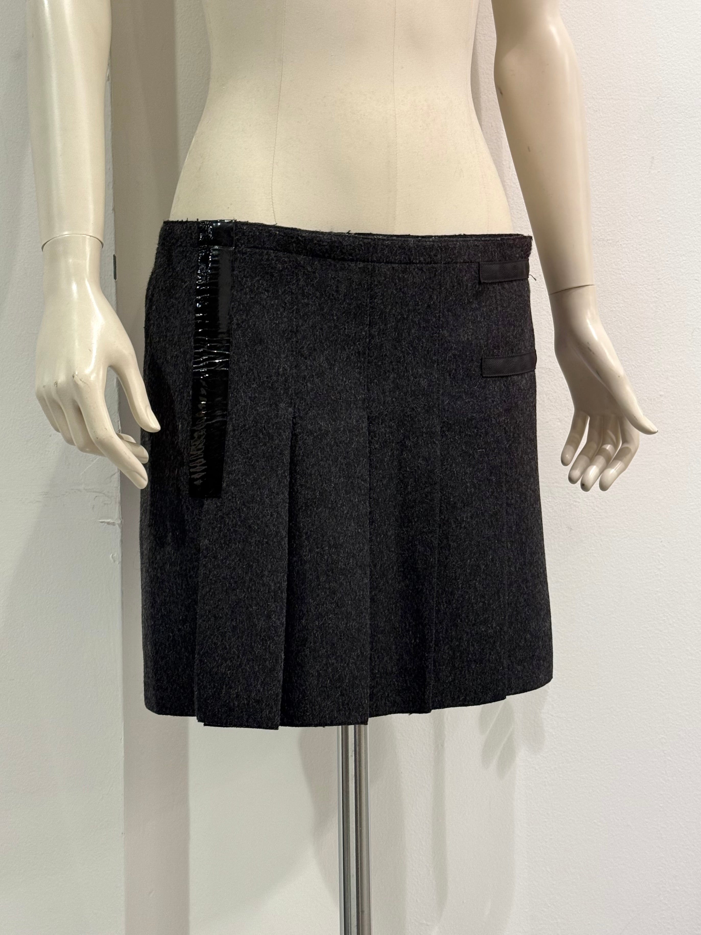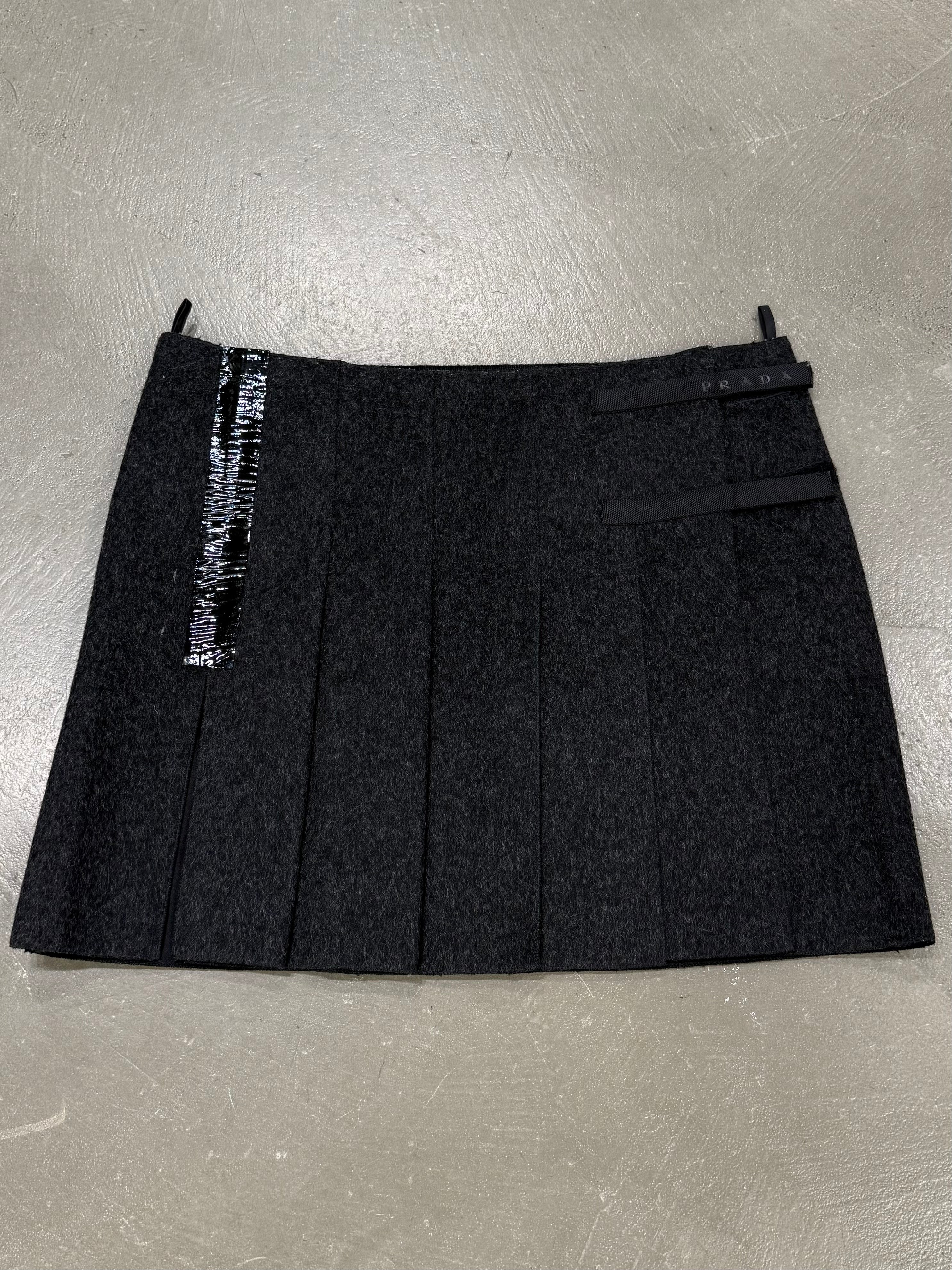 This Prada skirt from the 2007 collection fuses classic tailoring with a subversive edge. Crafted from structured wool, it features a pleated mini silhouette accented by bondage-inspired buckle and strap detailing at the waist. The mix of utilitarian and refined elements captures Prada’s exploration of contrast and femininity in its mid-2000s collections.