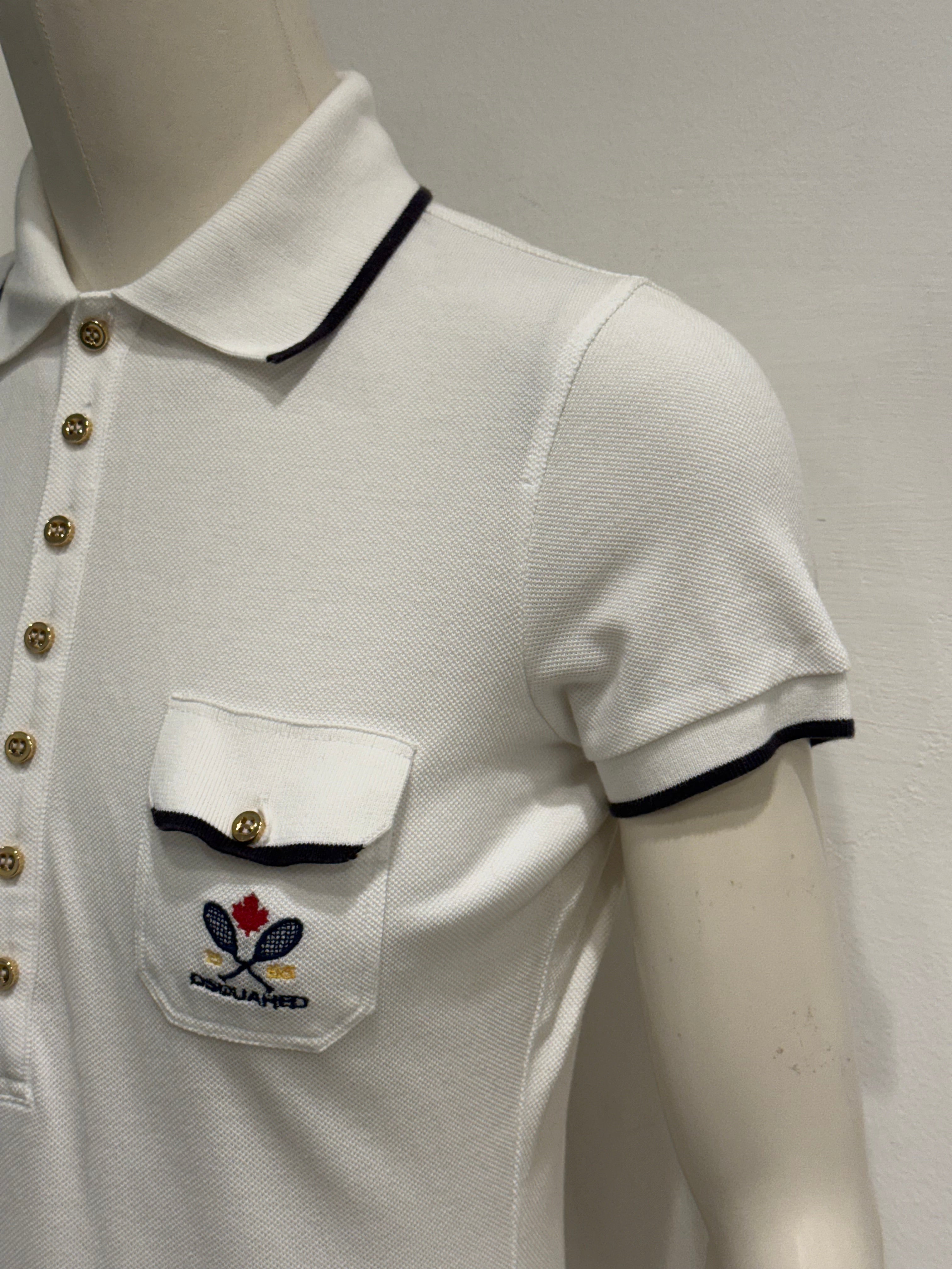 This S/S2009 Dsquared2 mini dress draws inspiration from classic tennis uniforms, reimagined with a playful and refined silhouette. Featuring a structured polo collar, contrast piping and fitted proportions, it embodies the brand’s sporty yet glamorous early-2000s aesthetic.