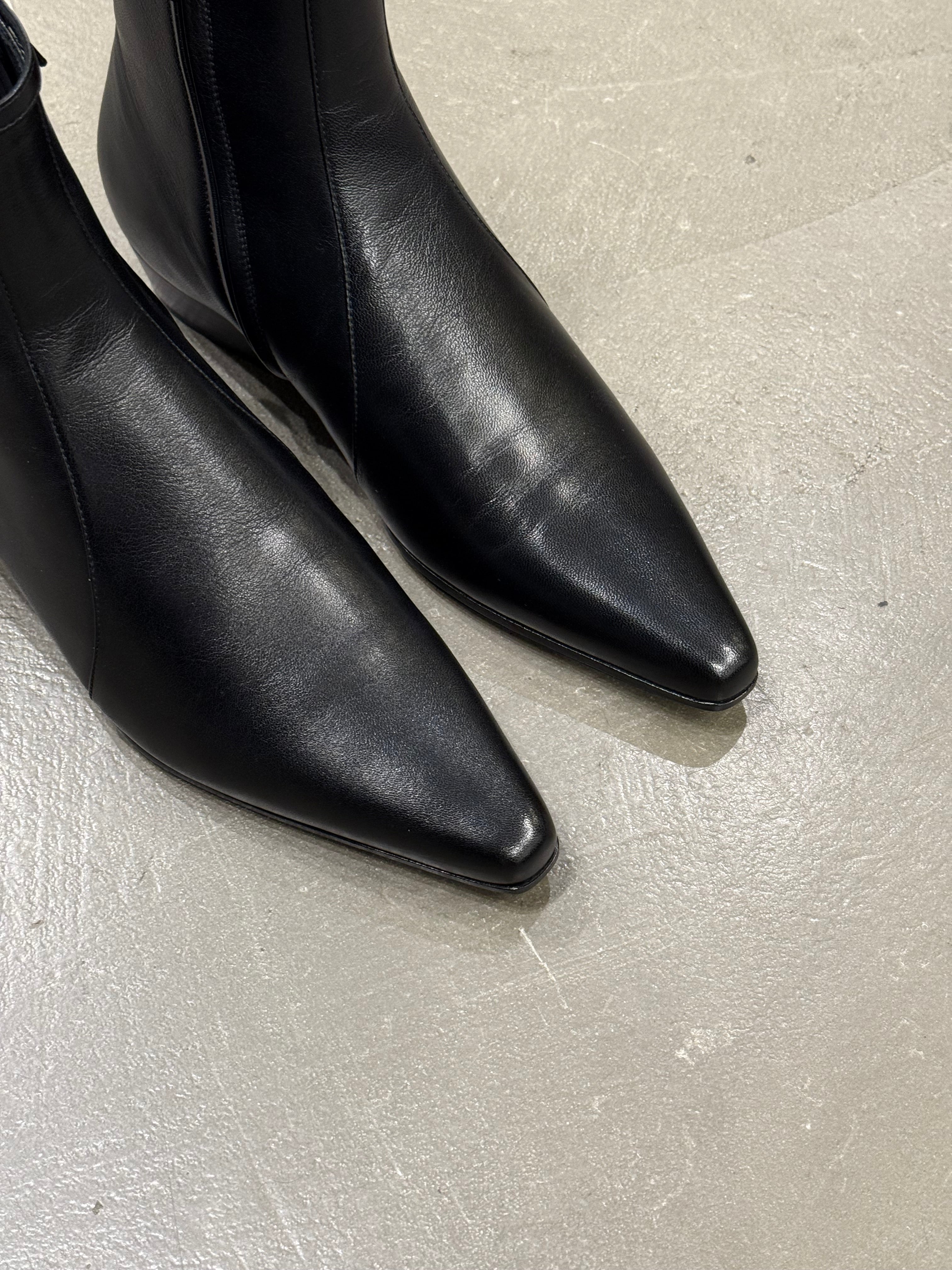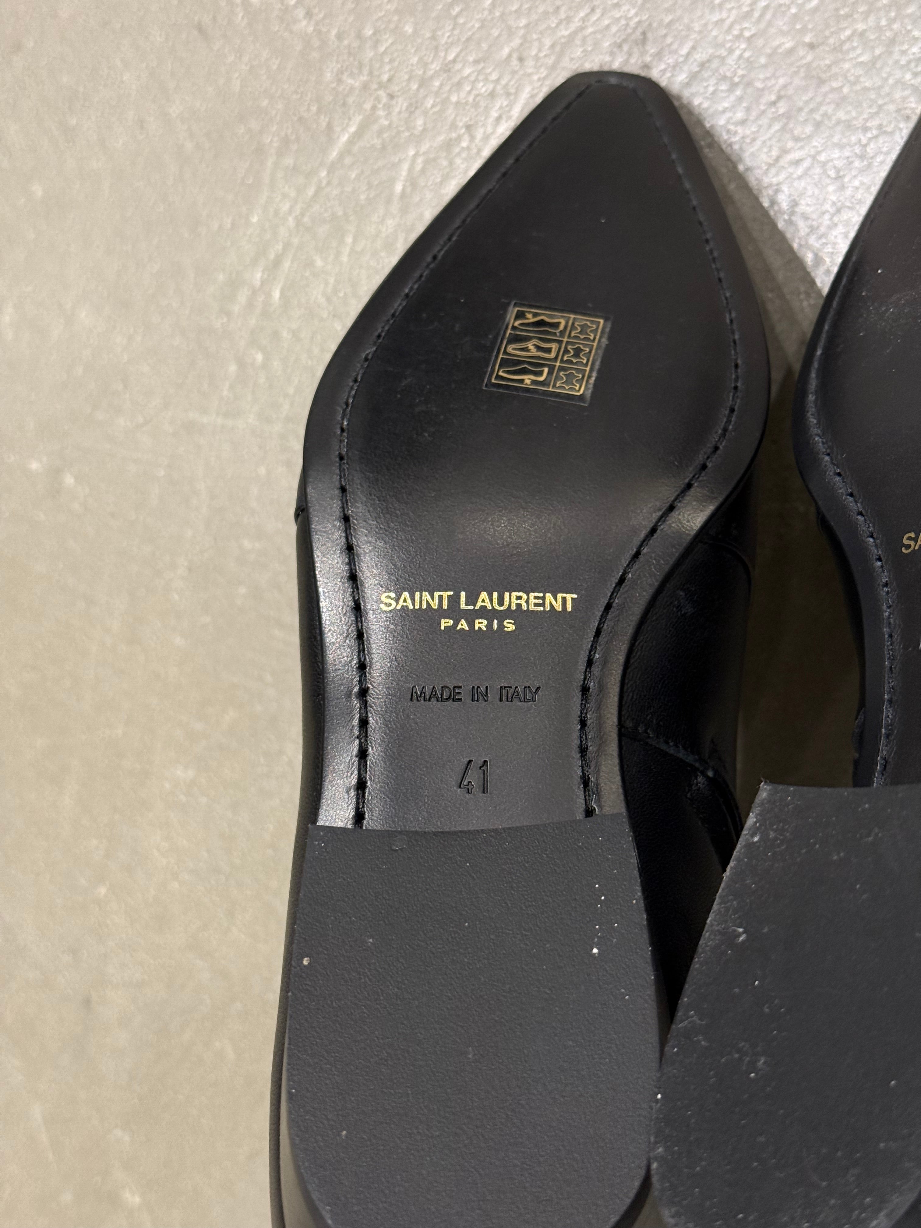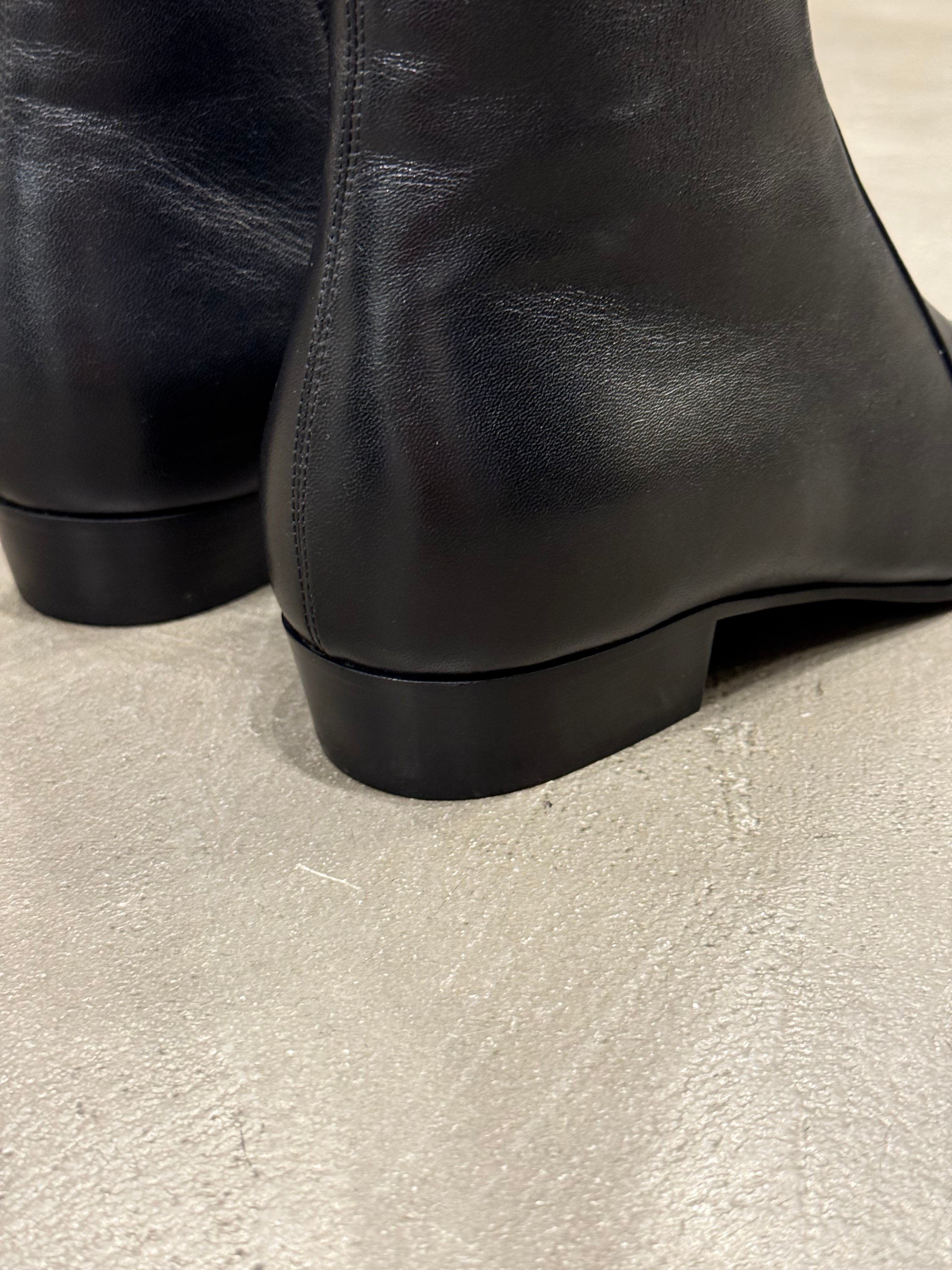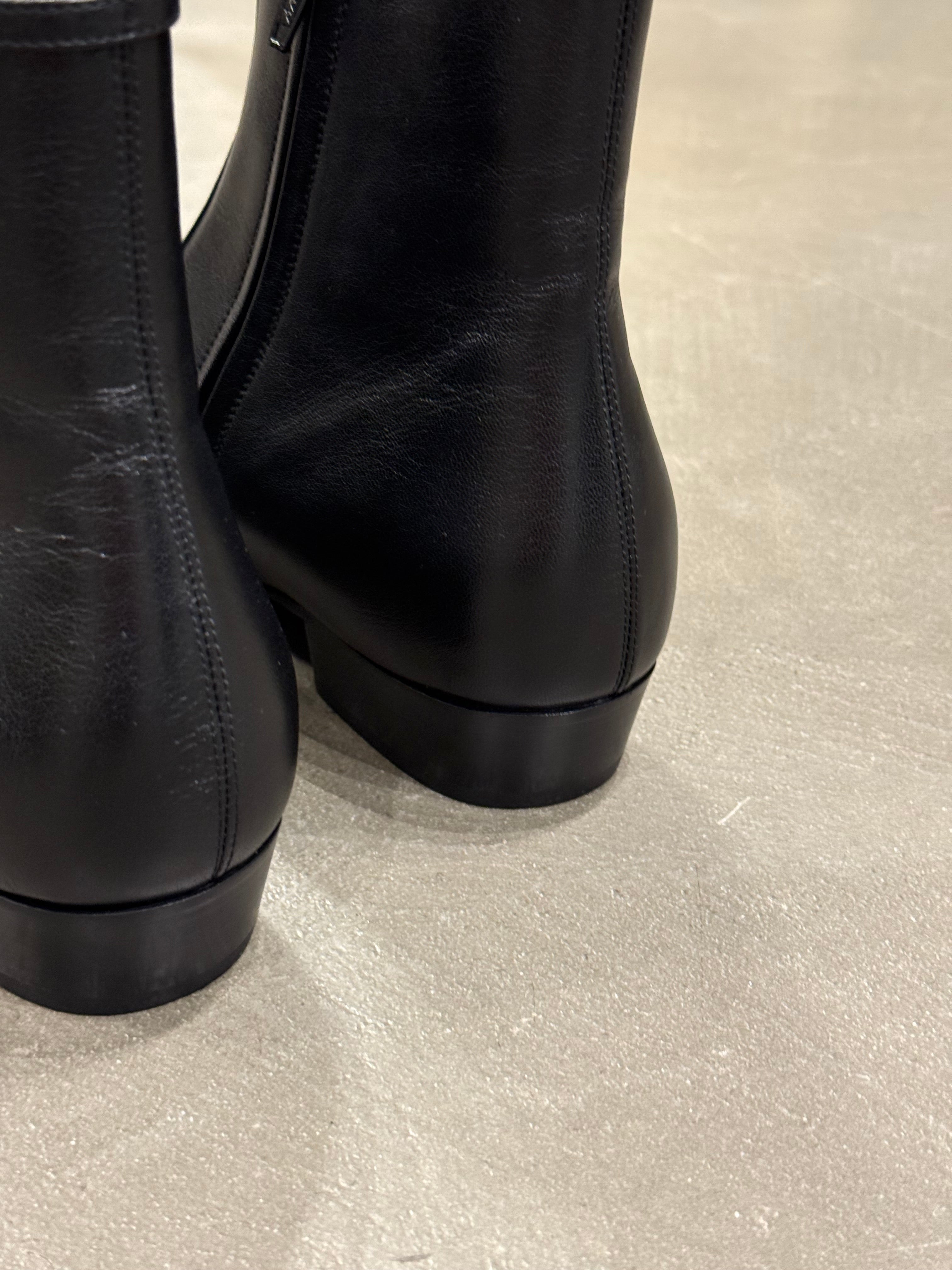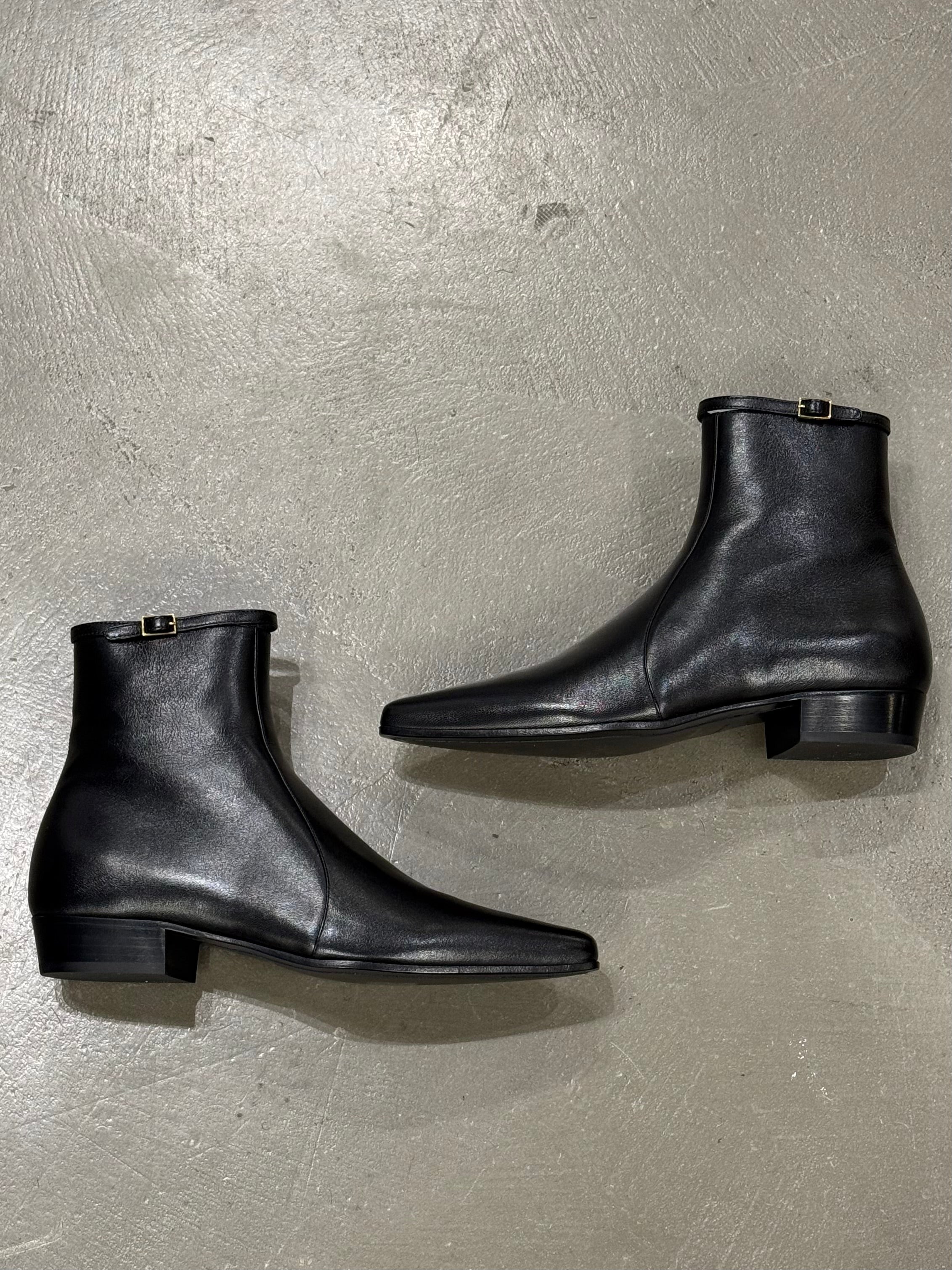 These Saint Laurent leather boots feature a sharp, elongated silhouette crafted in smooth black leather. Sleek and minimal, they reflect the house’s refined rock-inspired aesthetic, making them a versatile staple for both everyday and elevated looks.