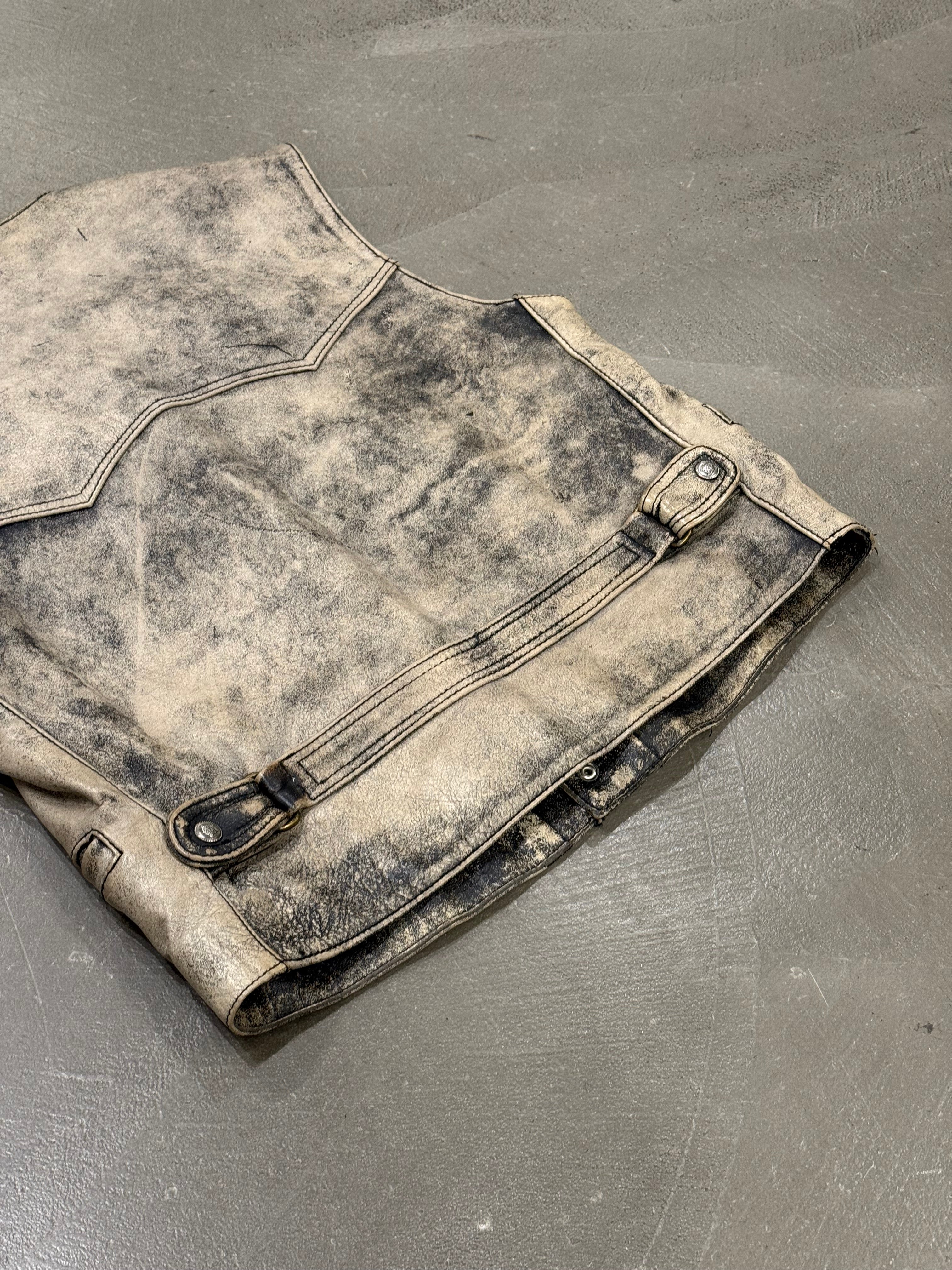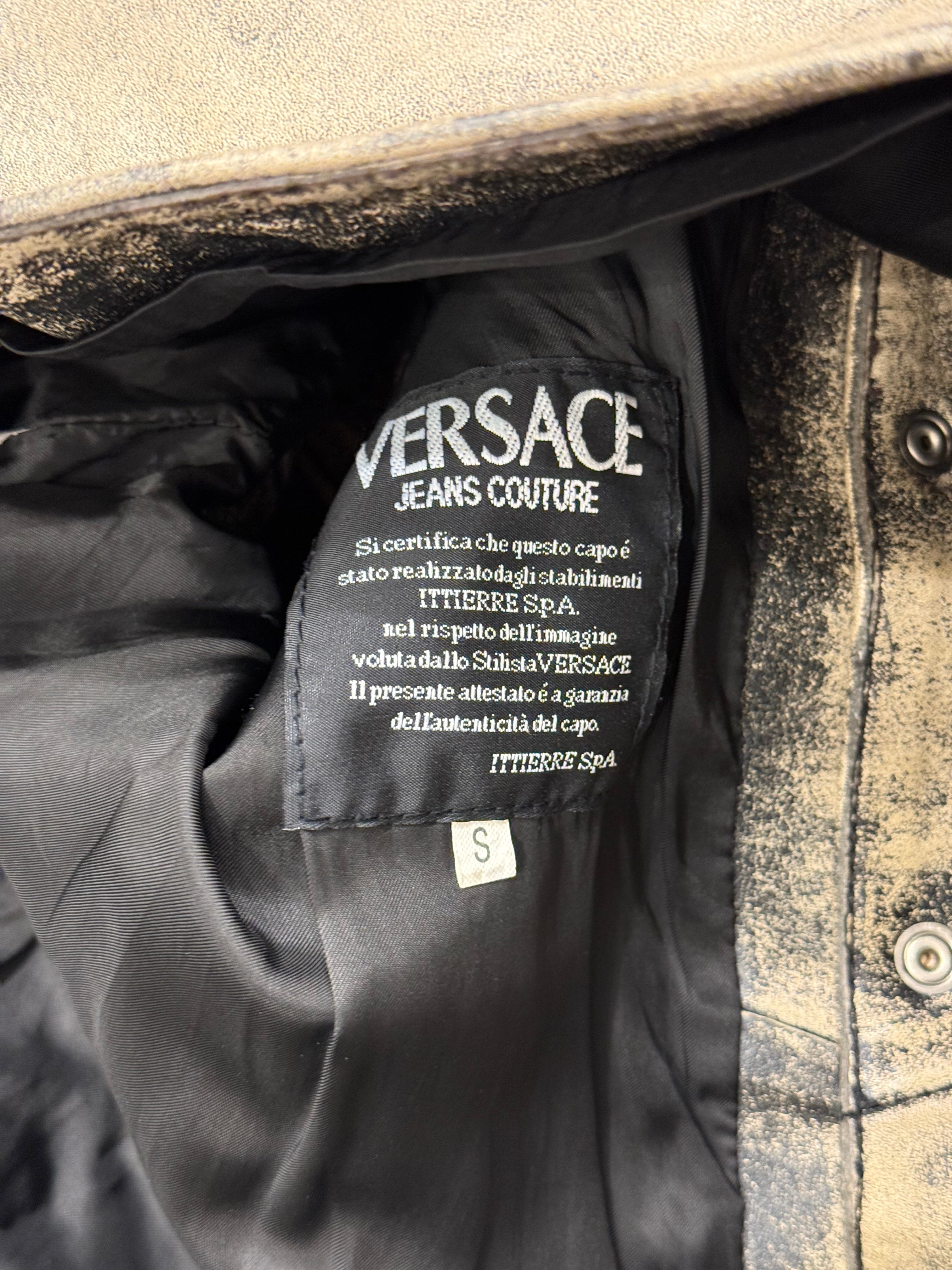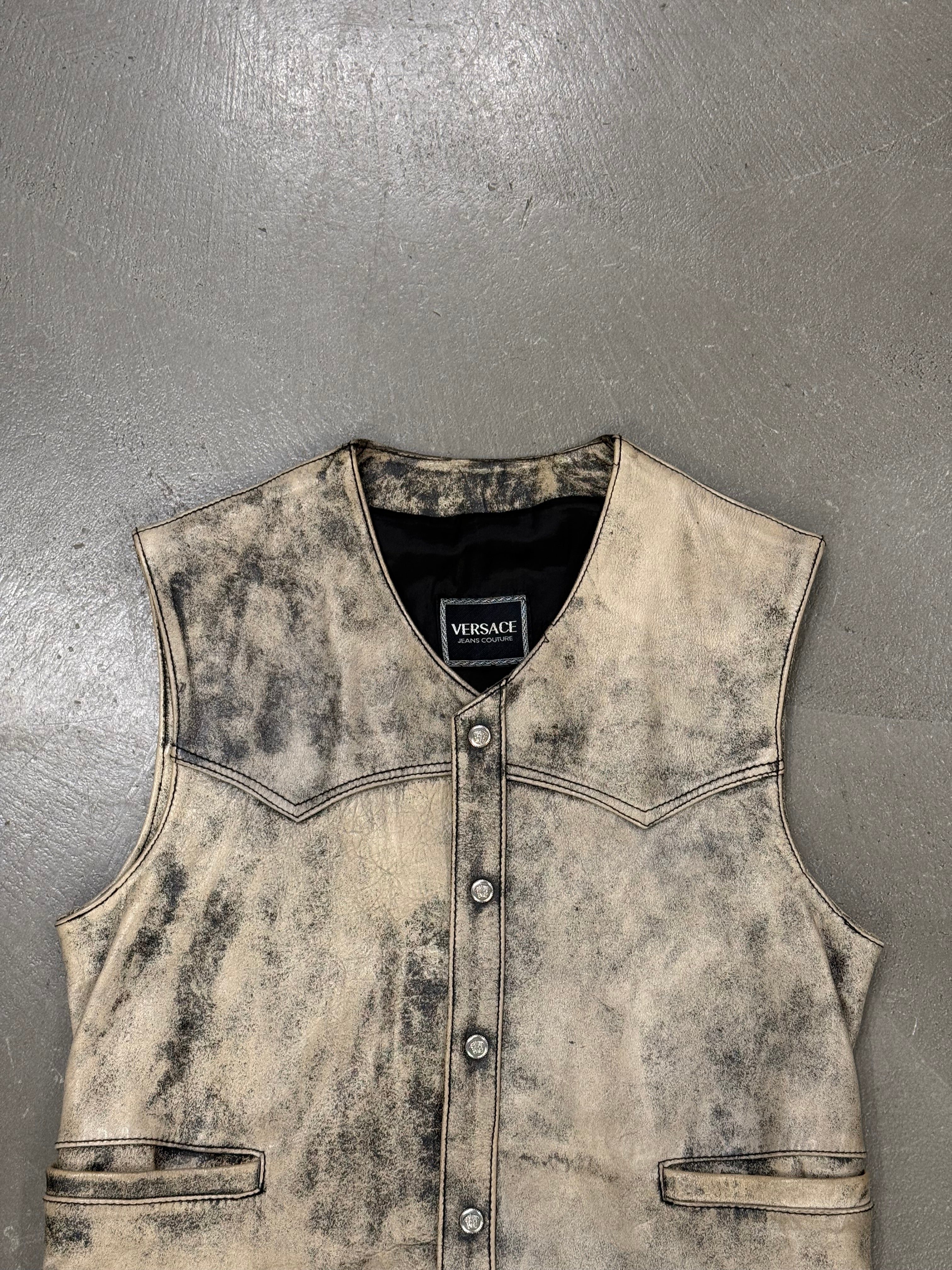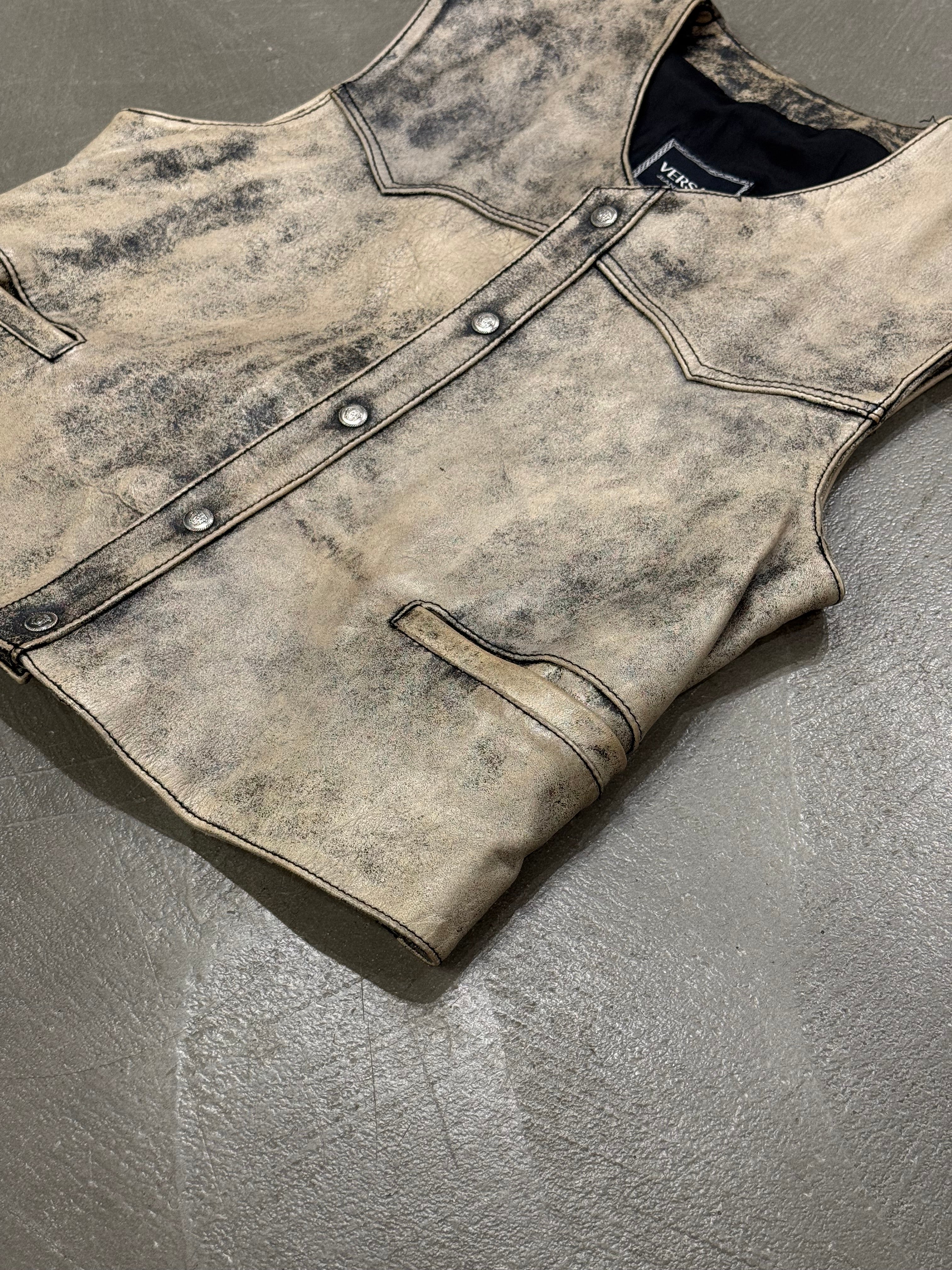 This early-2000s Versace leather vest features a bold distressed finish, giving it a raw, lived-in character. The sharp cut and textural treatment capture the brand’s iconic blend of attitude and craftsmanship.