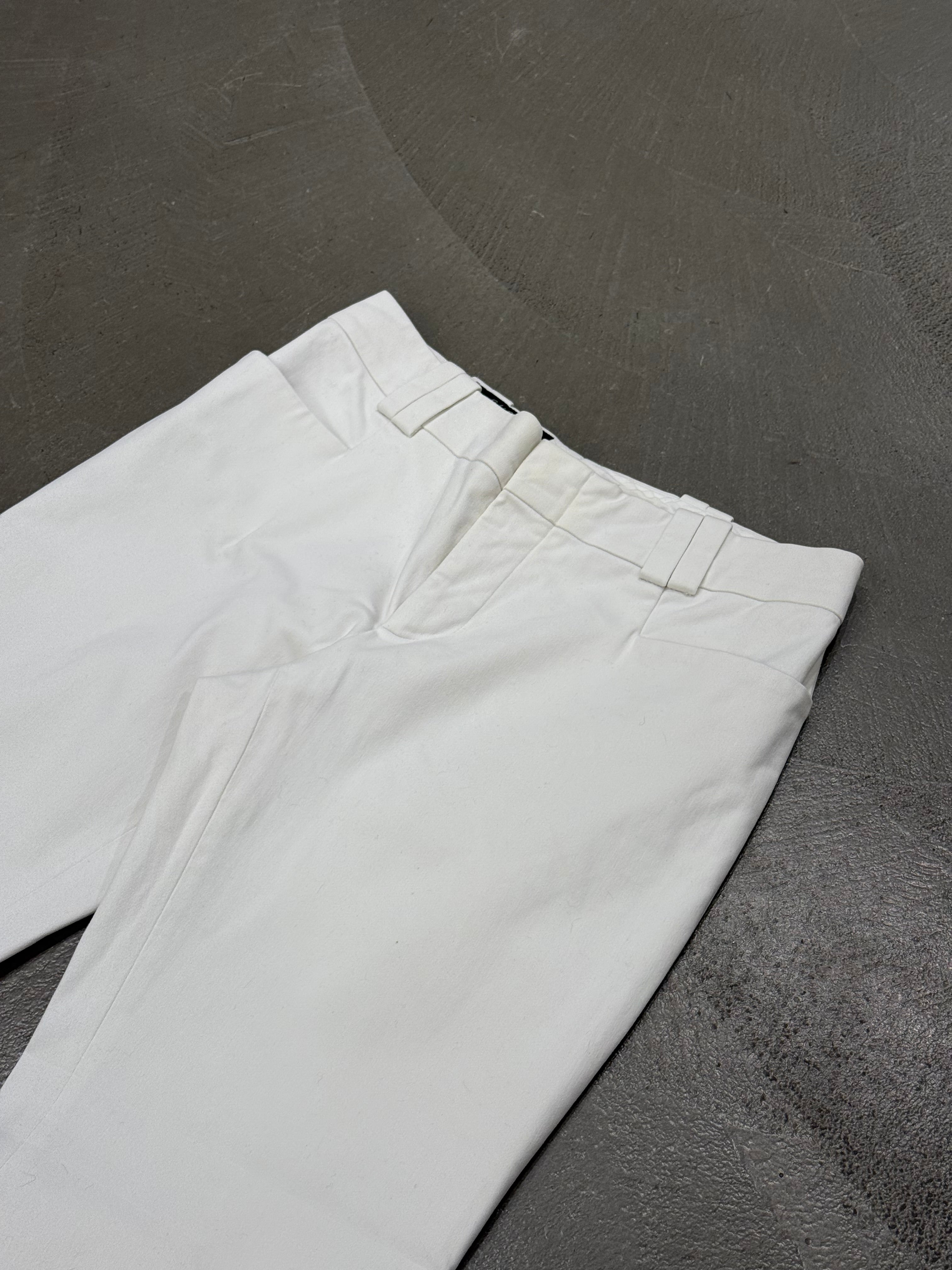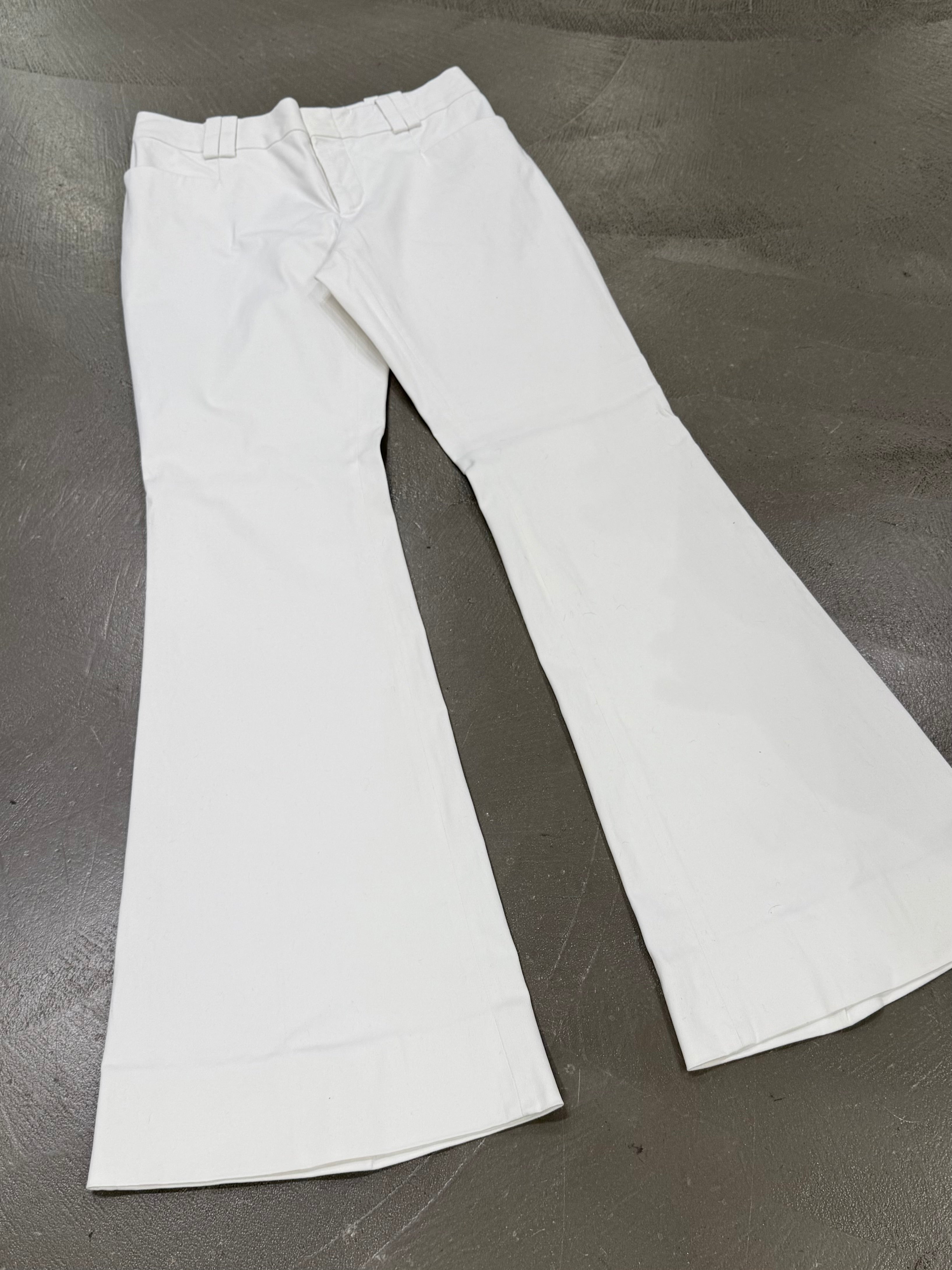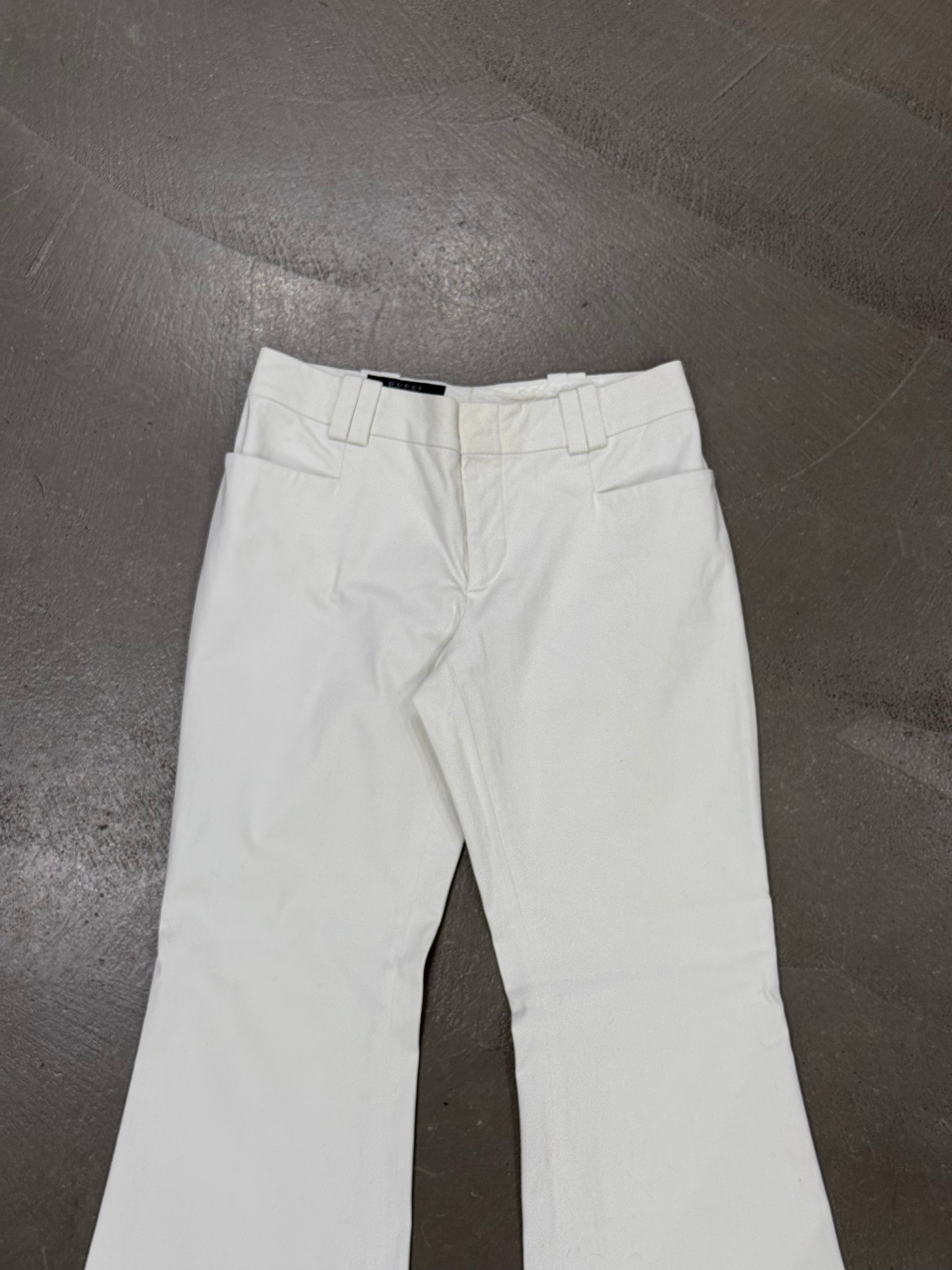 These 2003 Gucci pants from Tom Ford’s era perfectly capture his sensual yet sharp aesthetic. Crafted from white stretch cotton, they feature a mid-rise waist and a dramatic bootcut leg that enhances the silhouette. A refined example of early-2000s Gucci tailoring with a subtle rock-chic edge.