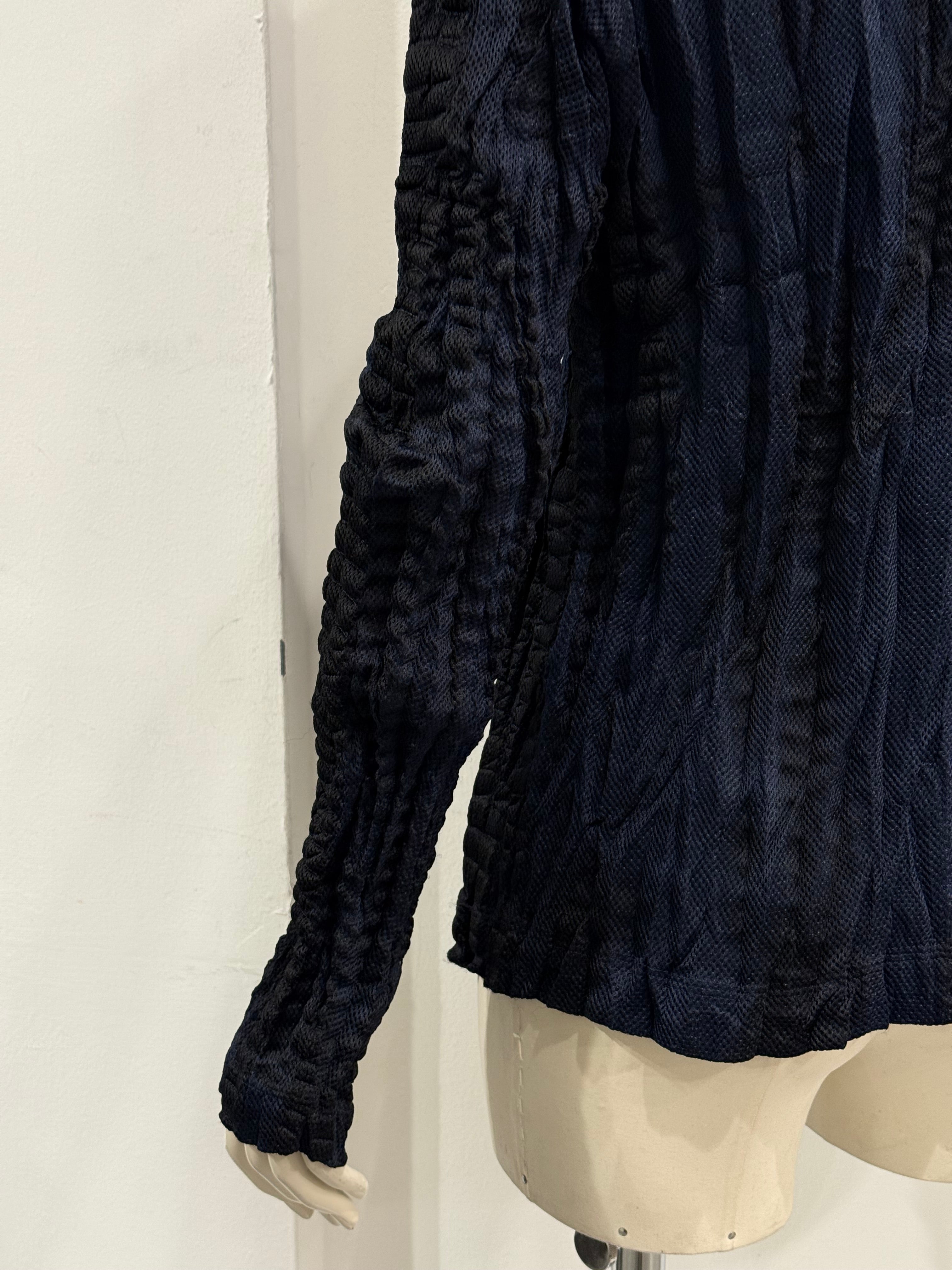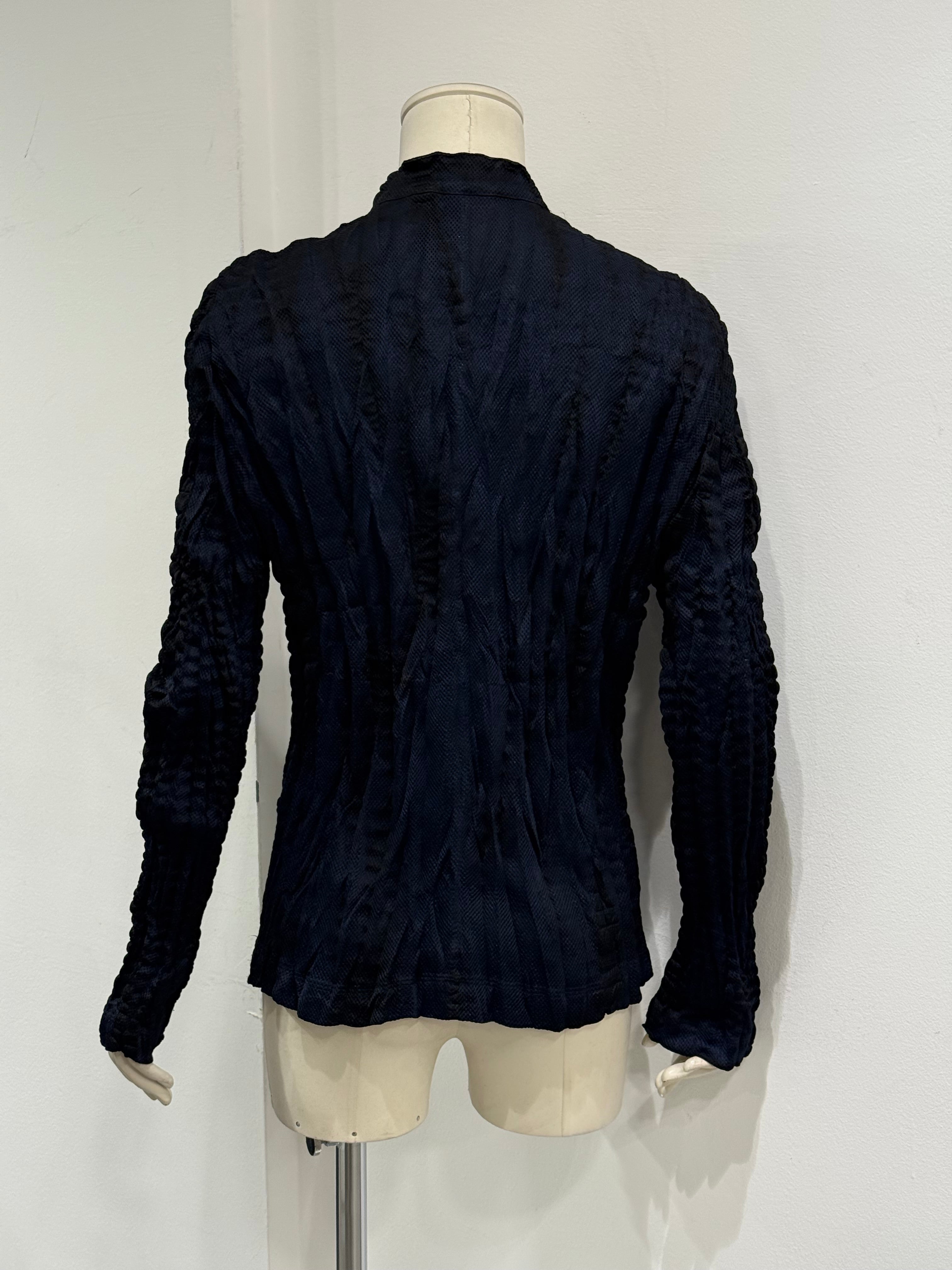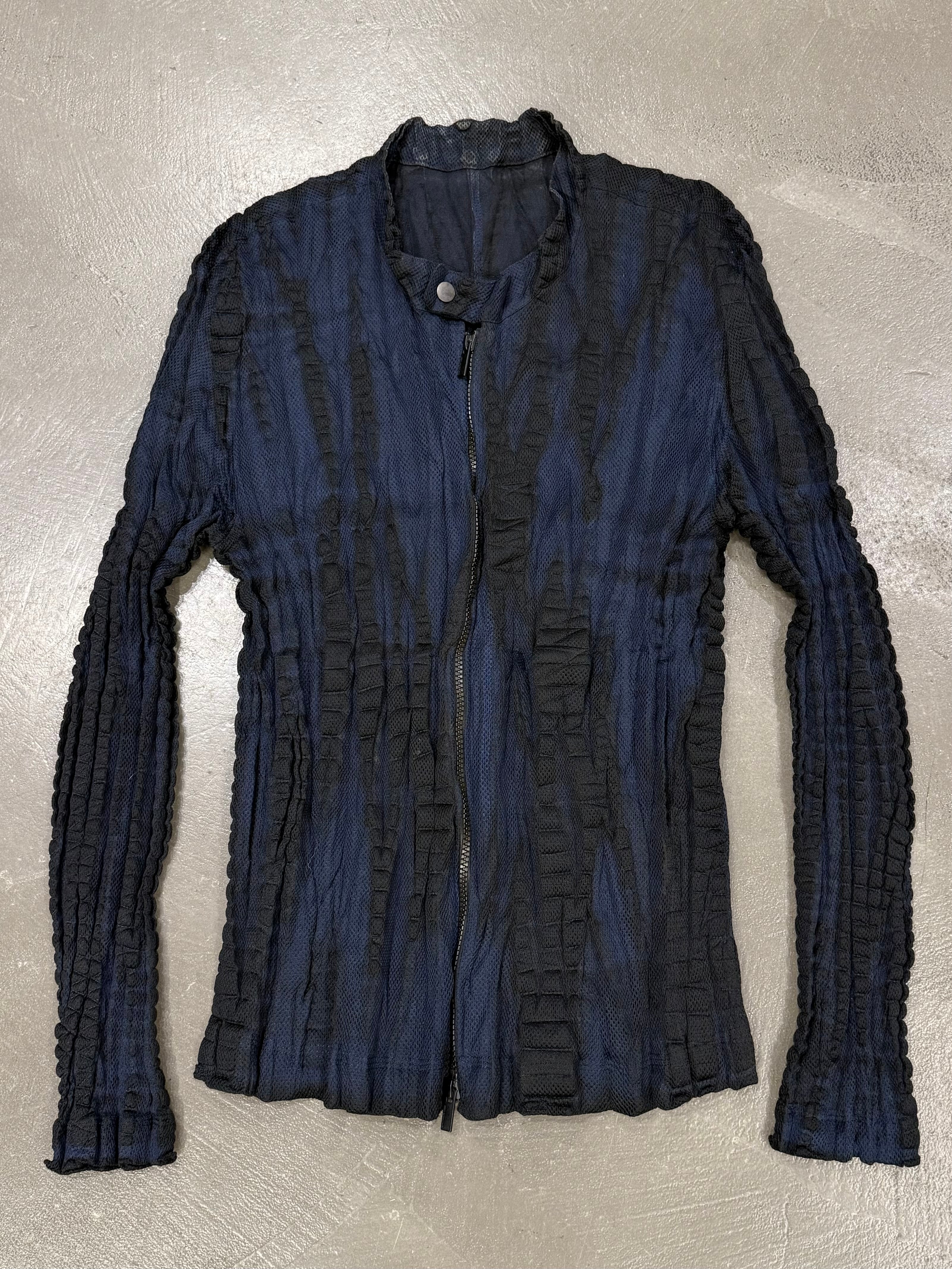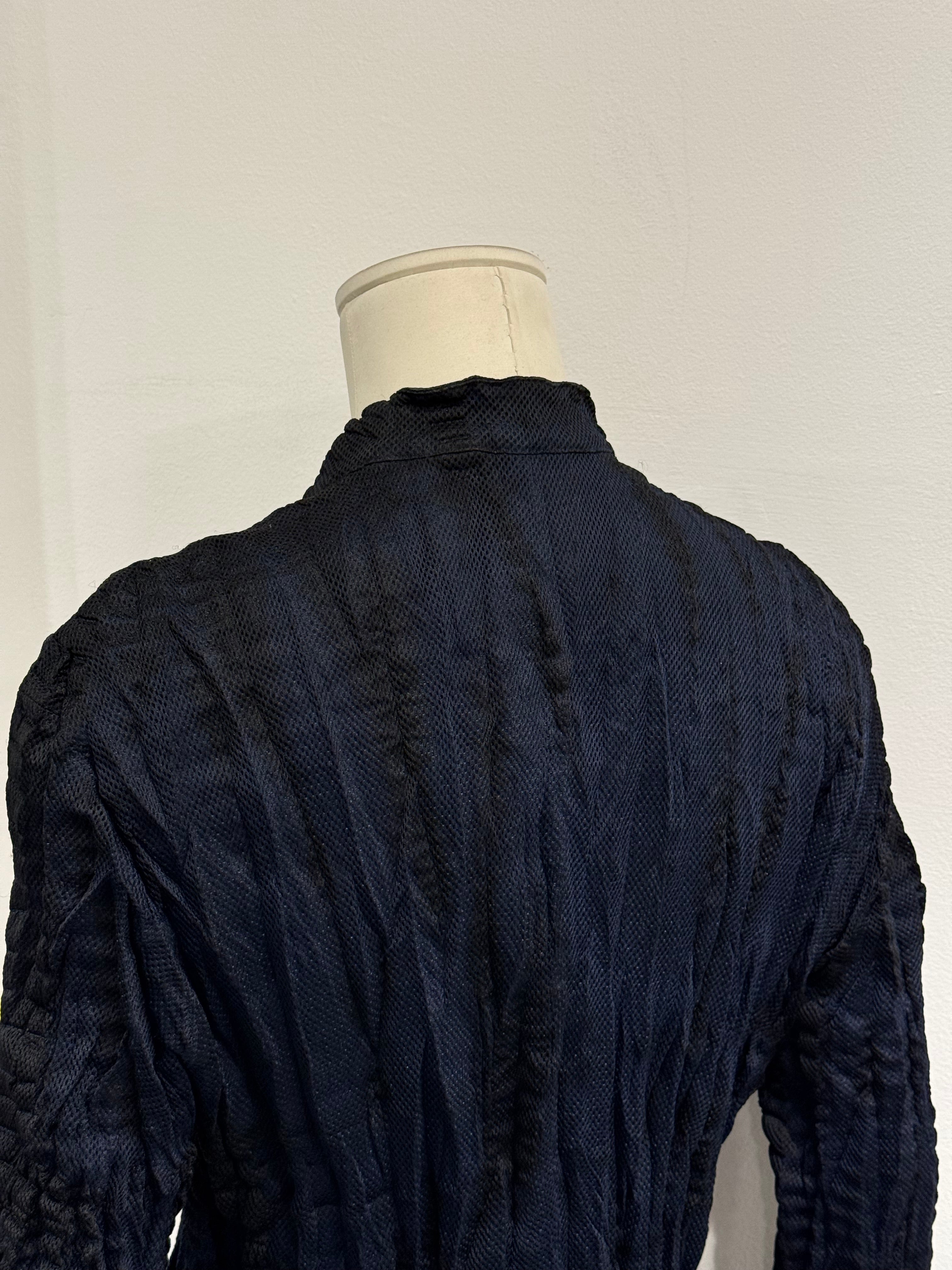 This Issey Miyake jacket showcases pleated construction and a deconstructed approach, designed in an elastic material that adapts to the body. A sculptural piece that embodies Miyake’s innovative textile research.