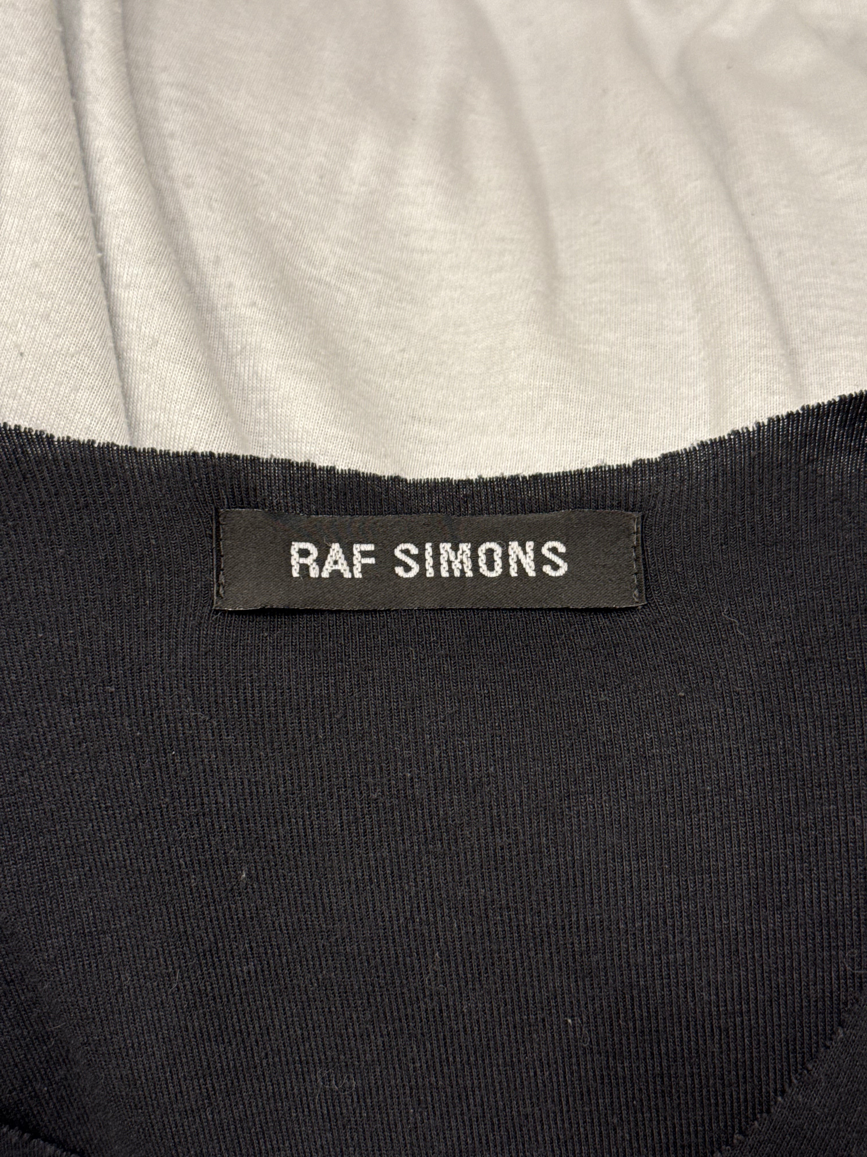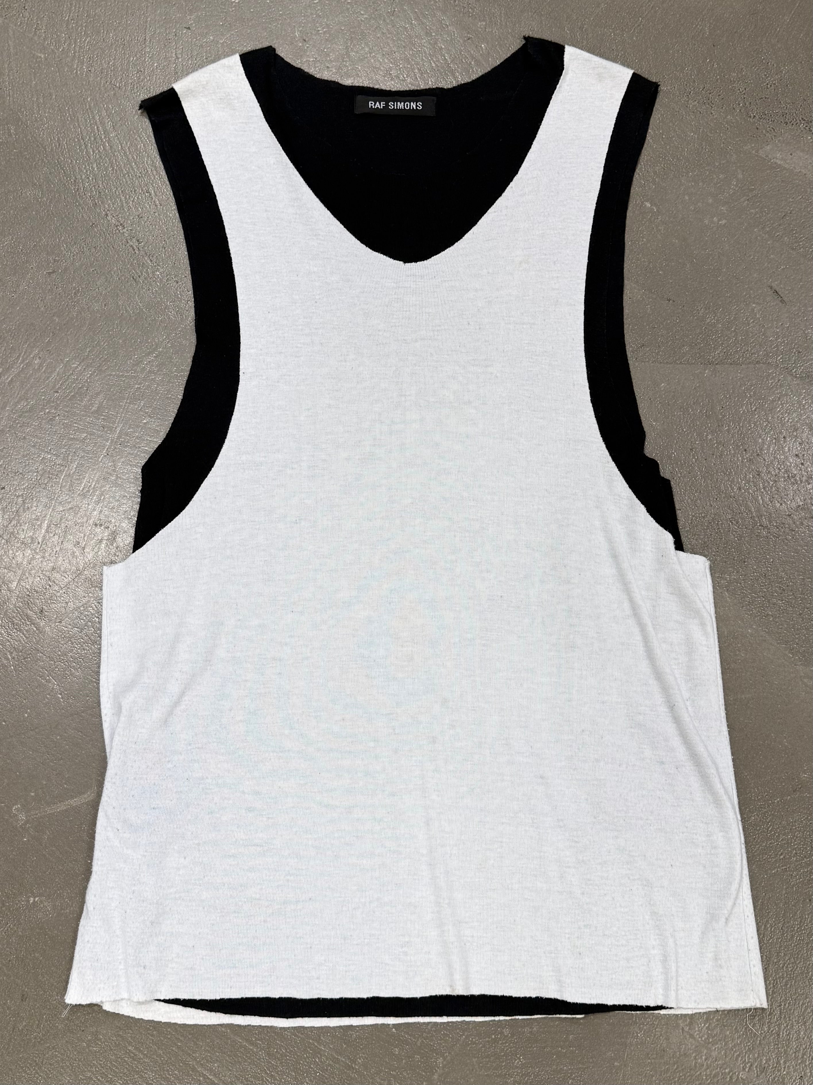 Rare 1990s double-layer tank top by Raf Simons featuring a minimalist two-tone design in black and white. Crafted in soft cotton jersey with a slightly elongated fit, this early piece reflects the brand’s subversive approach to youth culture and essential tailoring.
