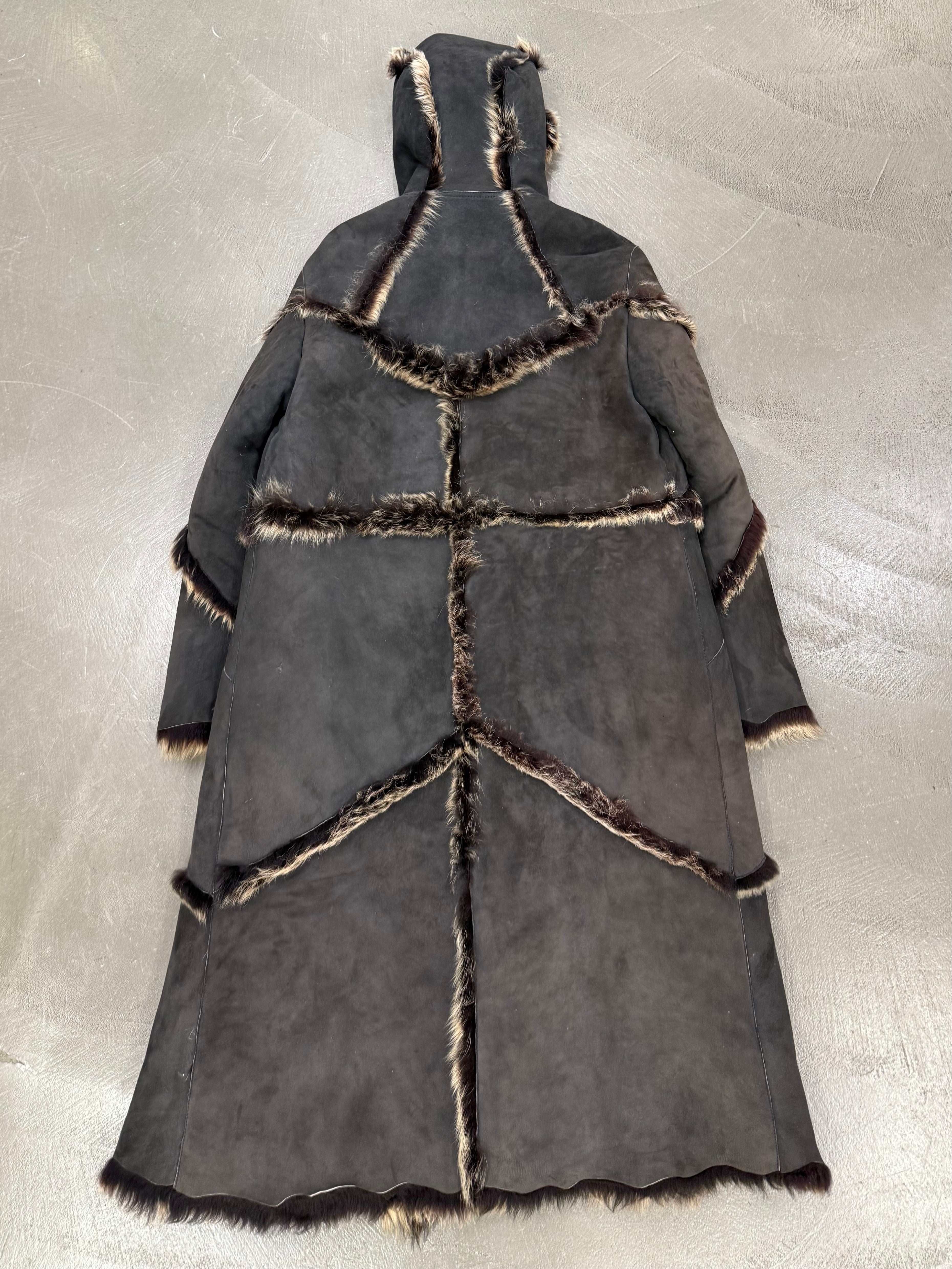 This A/W 1999 Roberto Cavalli shearling coat showcases an oversized silhouette with striking patchwork leather construction and raw-edge finishing. Warm, sculptural, and dramatic, it is one of Cavalli’s most iconic shearling designs of the late 1990s.