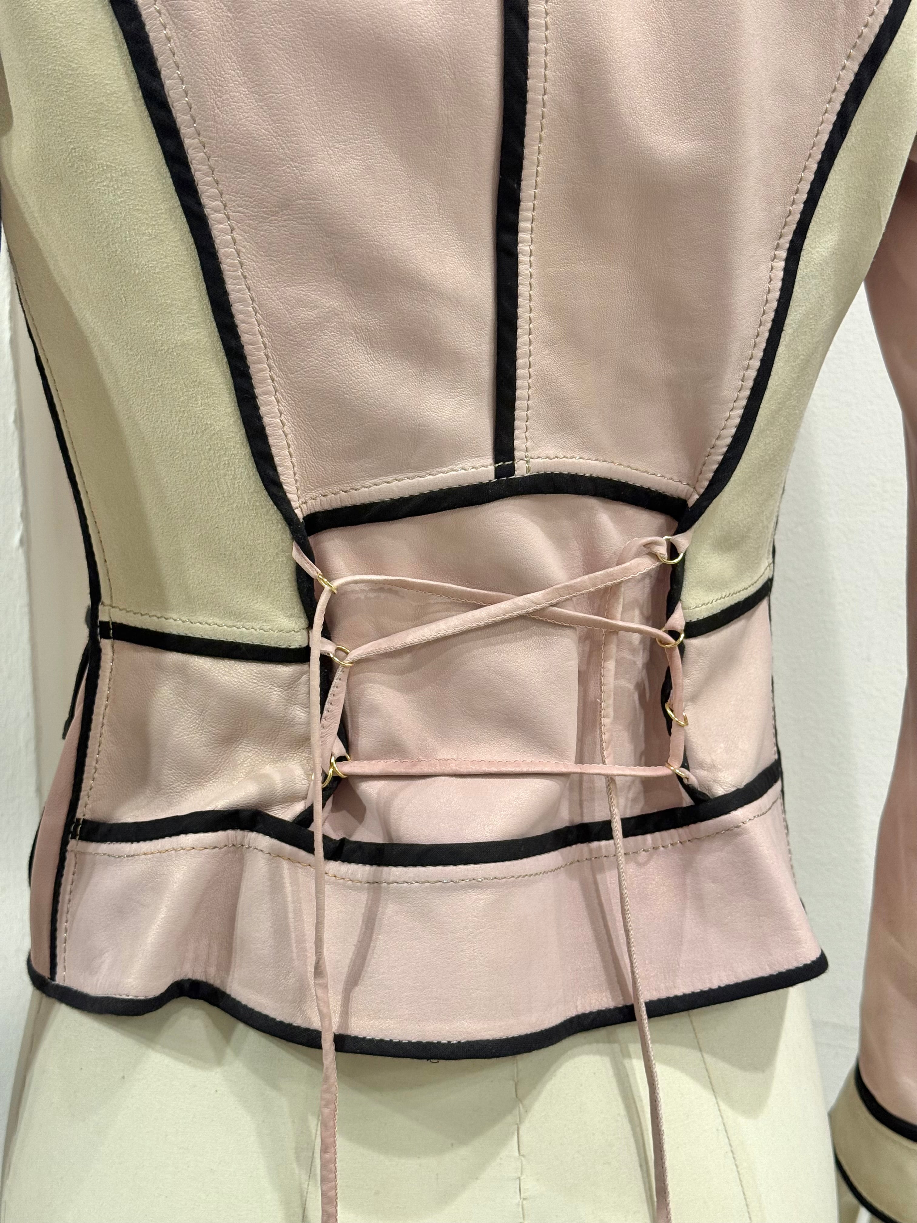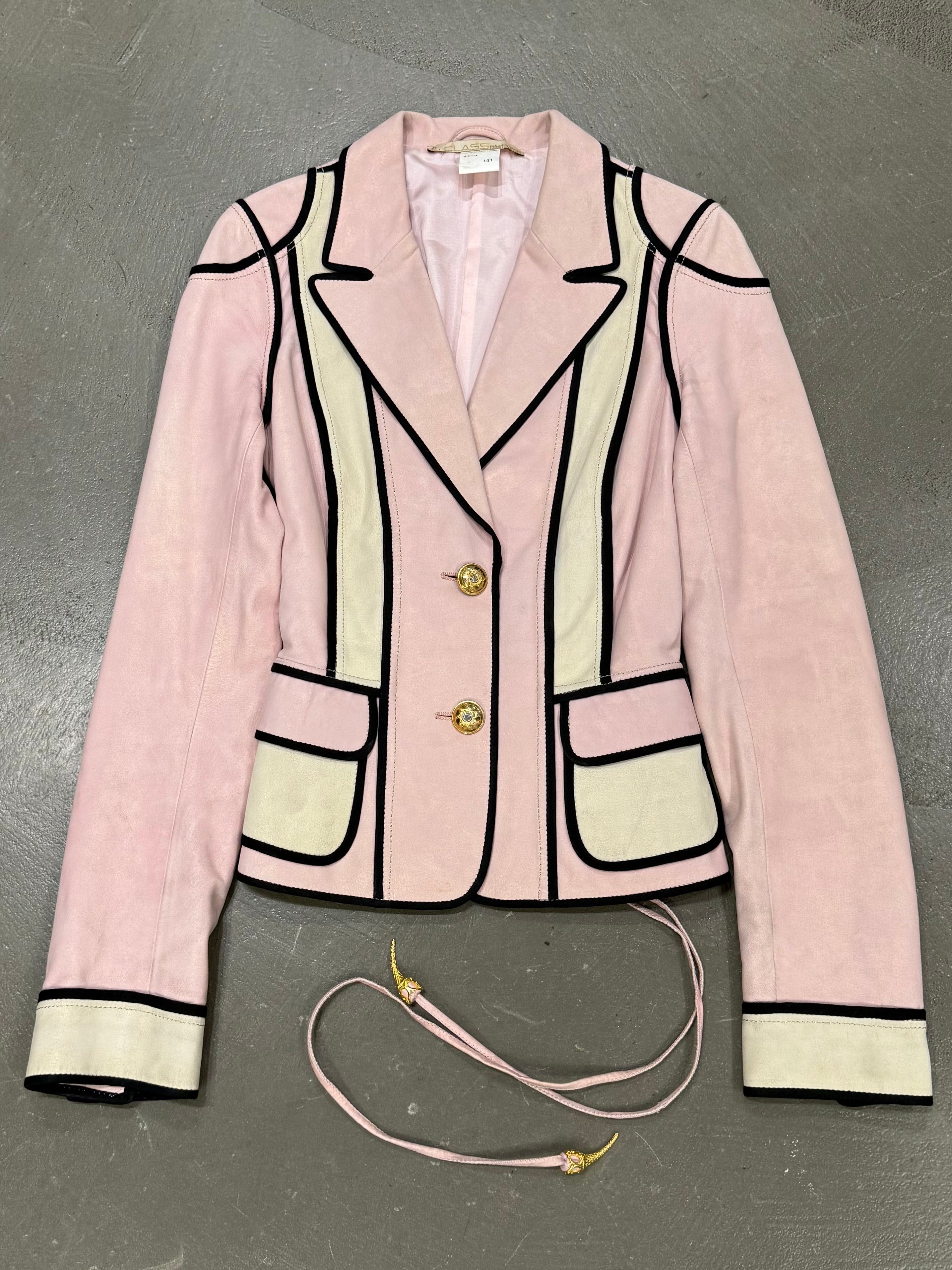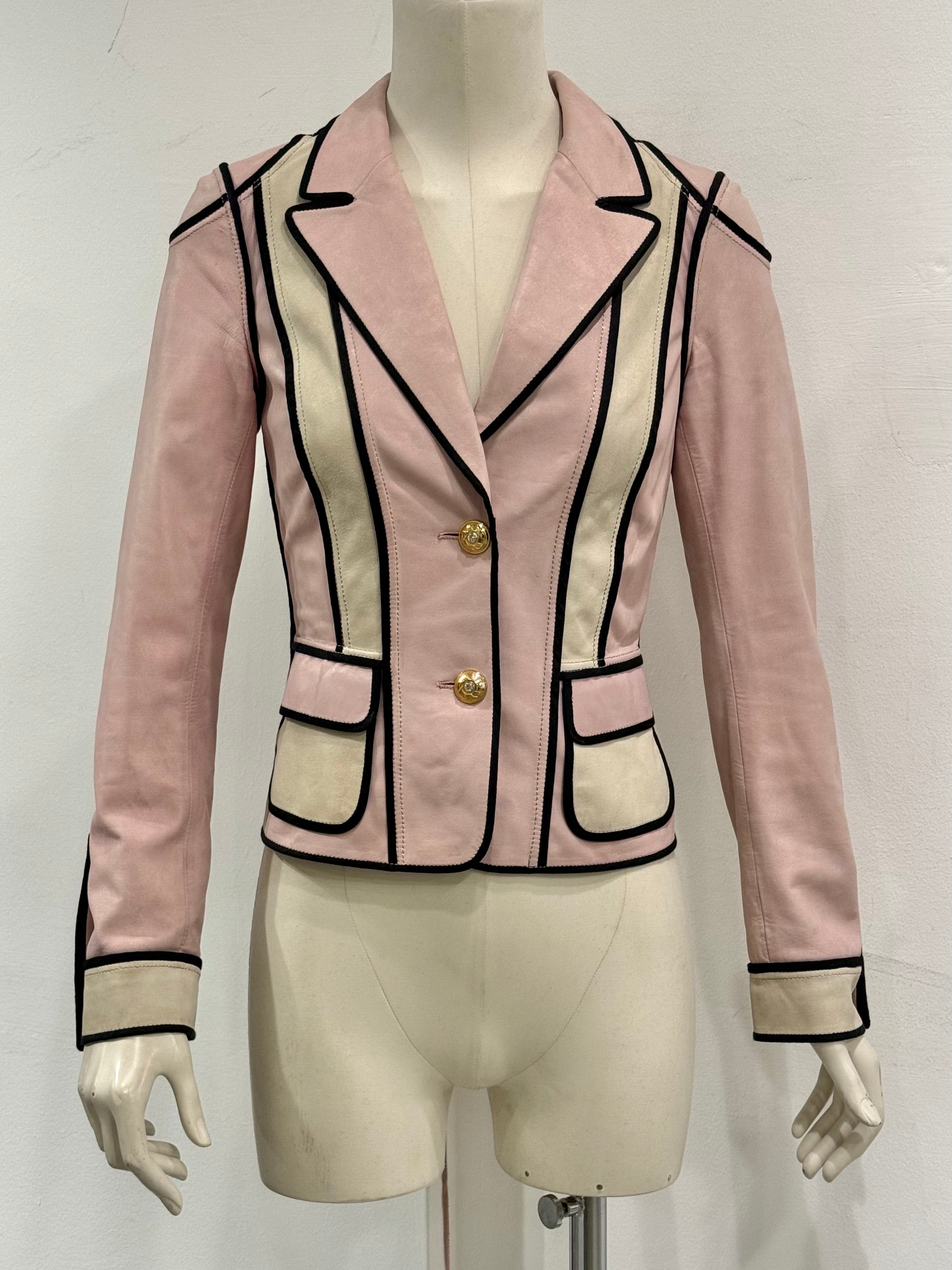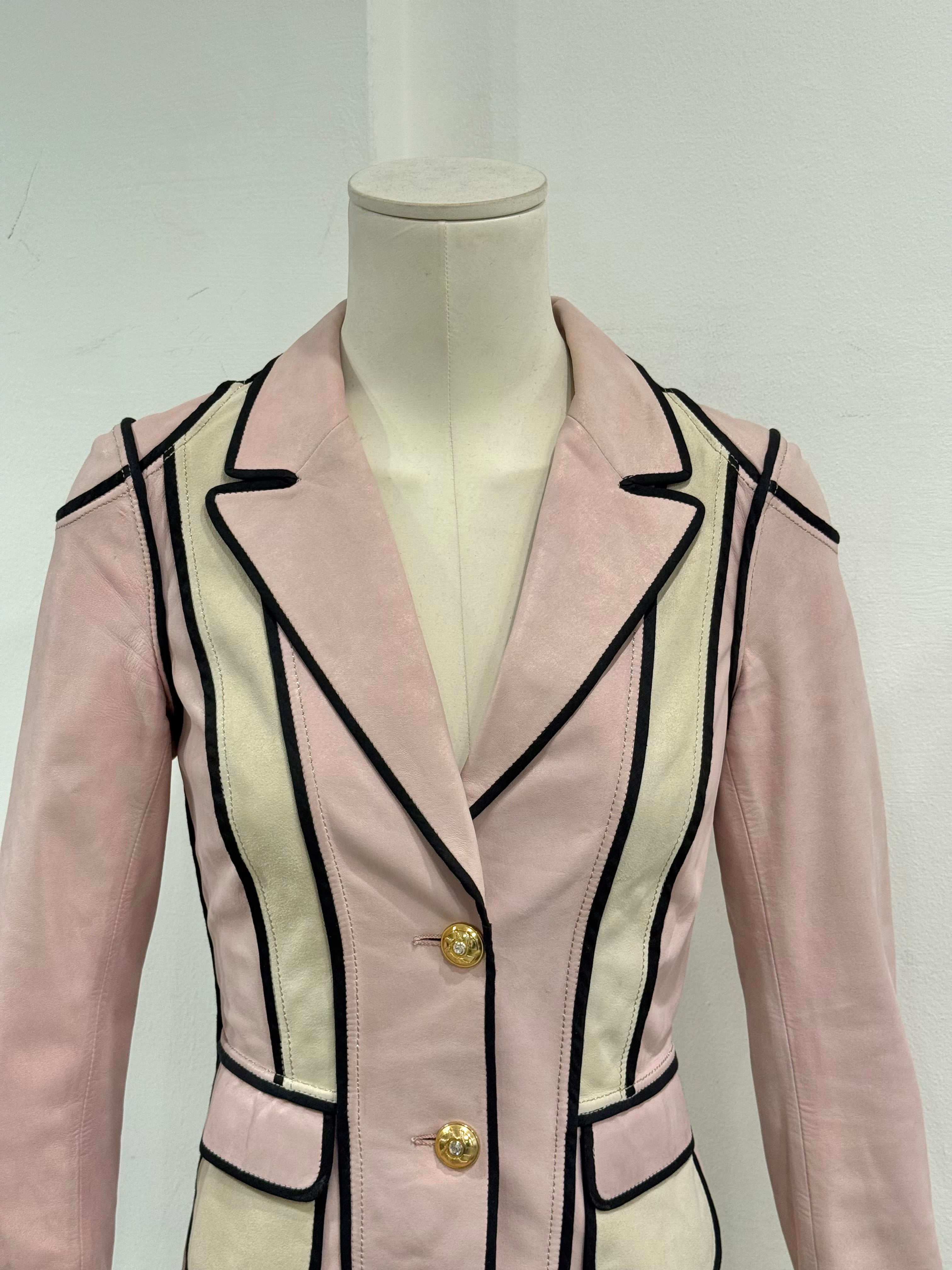 This early 2000s Roberto Cavalli jacket showcases a feminine silhouette in soft pink leather, accented by black contrast piping and gold-tone hardware. The tailored fit, wide lapels, and waist belt detail embody Cavalli’s glamorous yet structured approach to design during the era. A statement piece with refined vintage appeal.