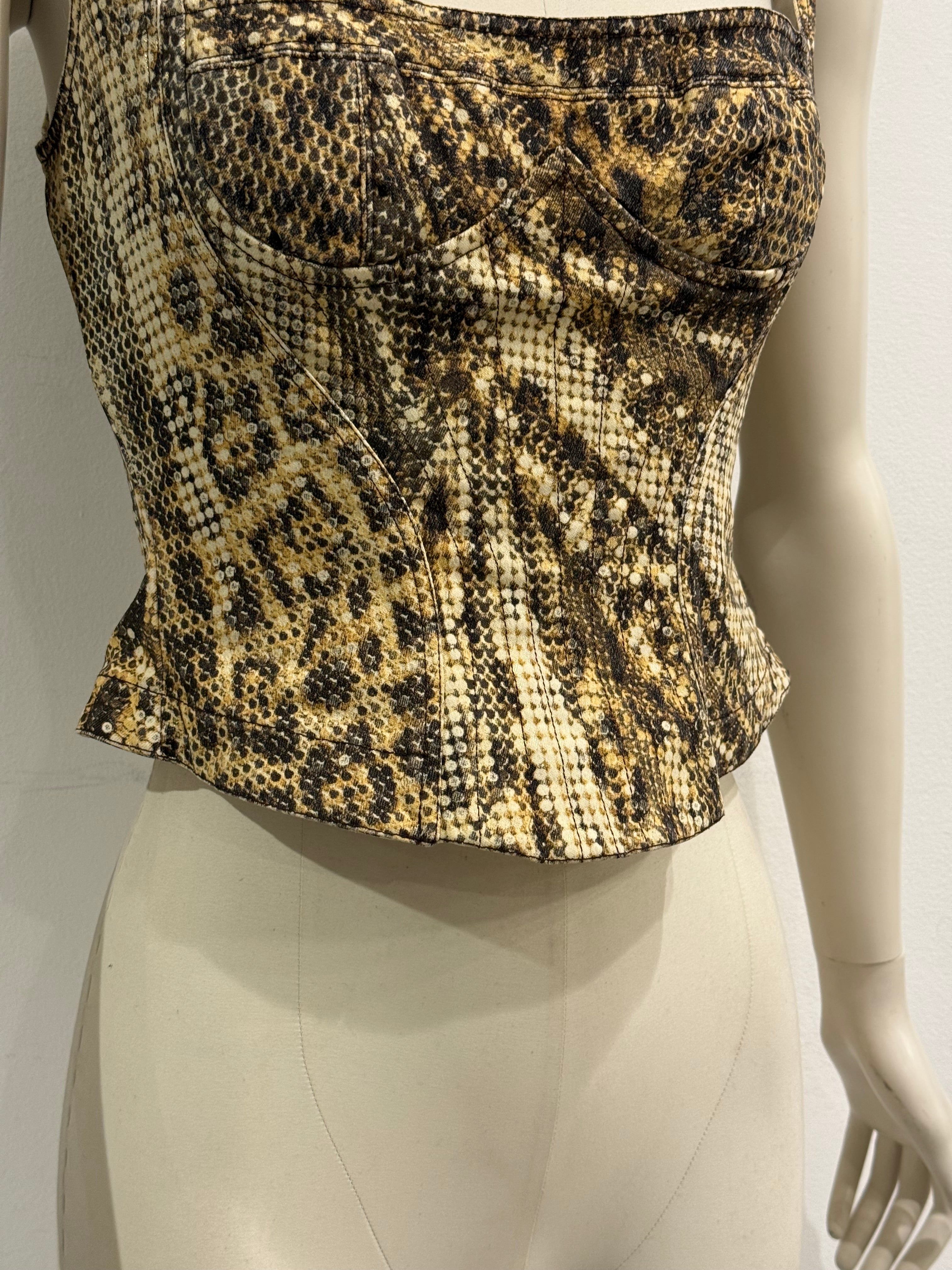 Rare 2003 Roberto Cavalli corset featuring the signature pixelated leopard print. Crafted in structured cotton with internal boning, square neckline, and zip back closure. A standout piece blending digital experimentation with Cavalli’s iconic animalier aesthetic.
