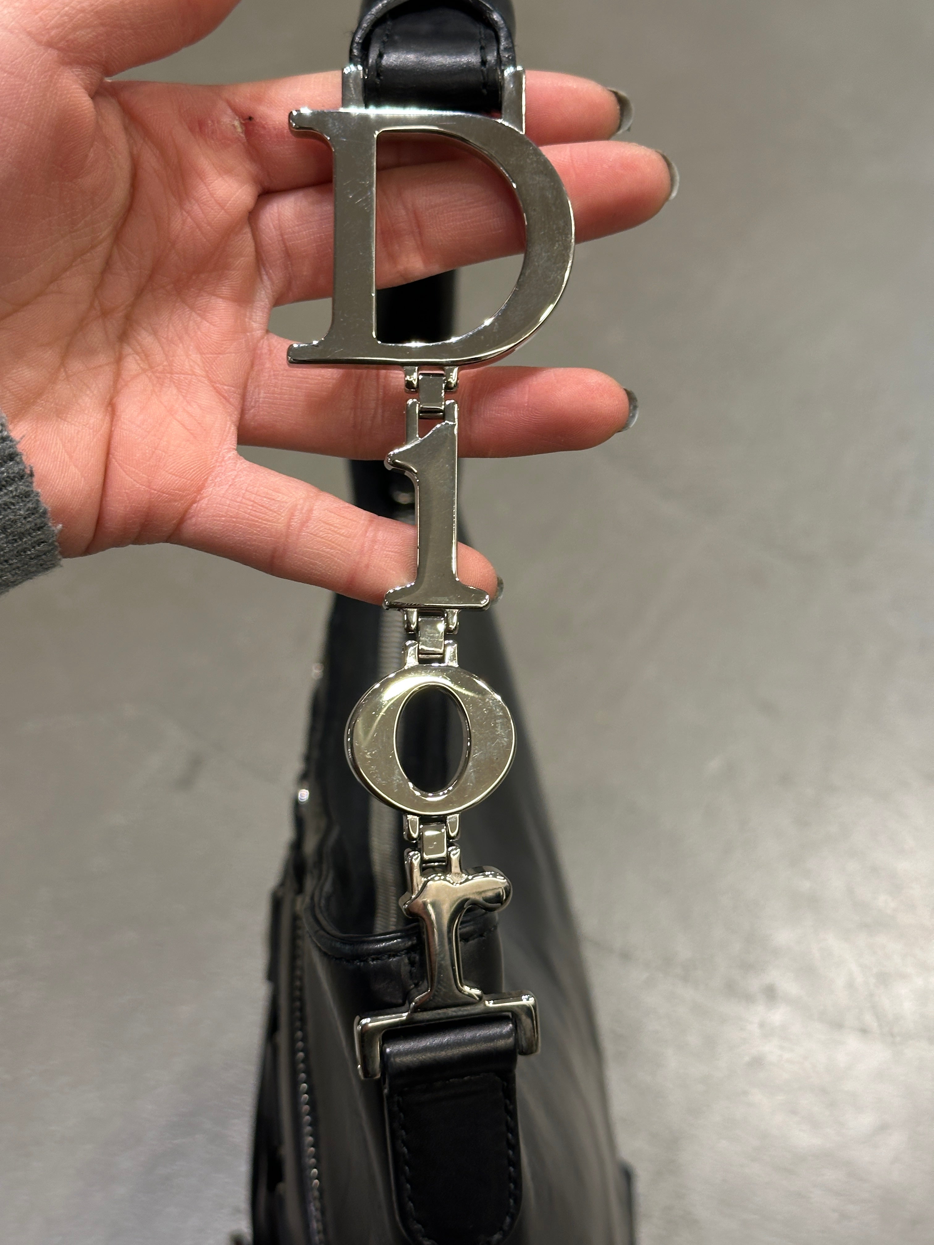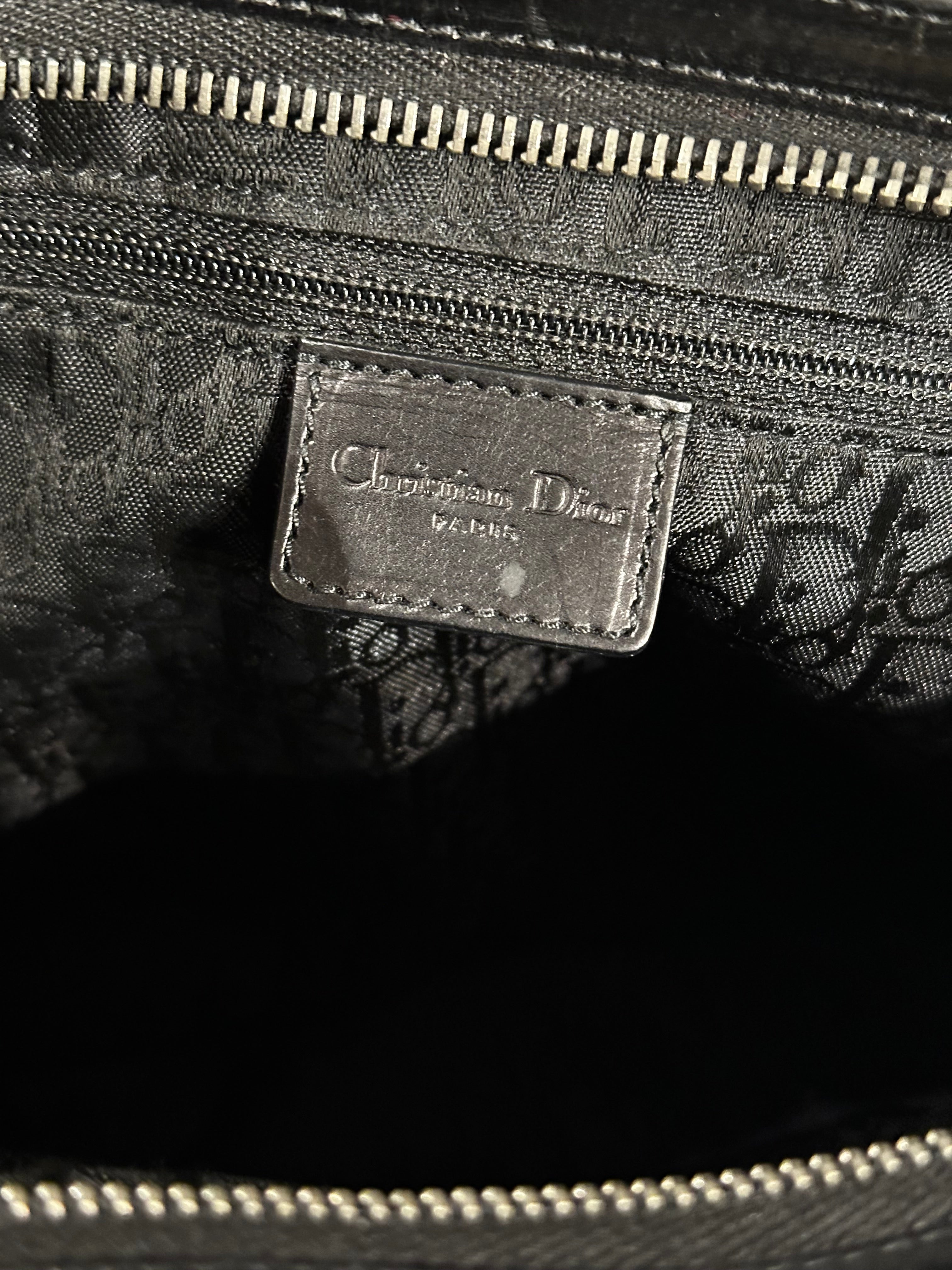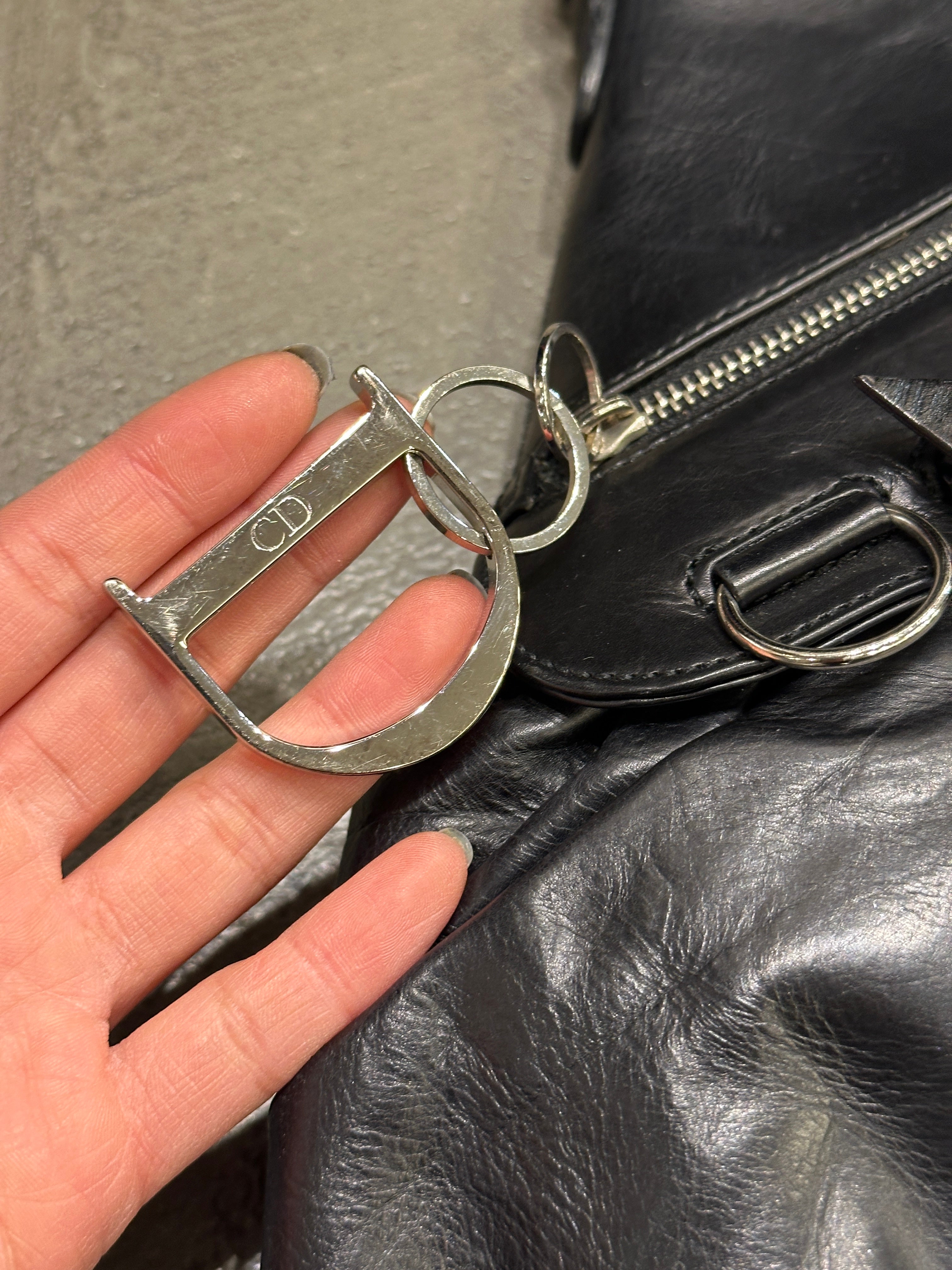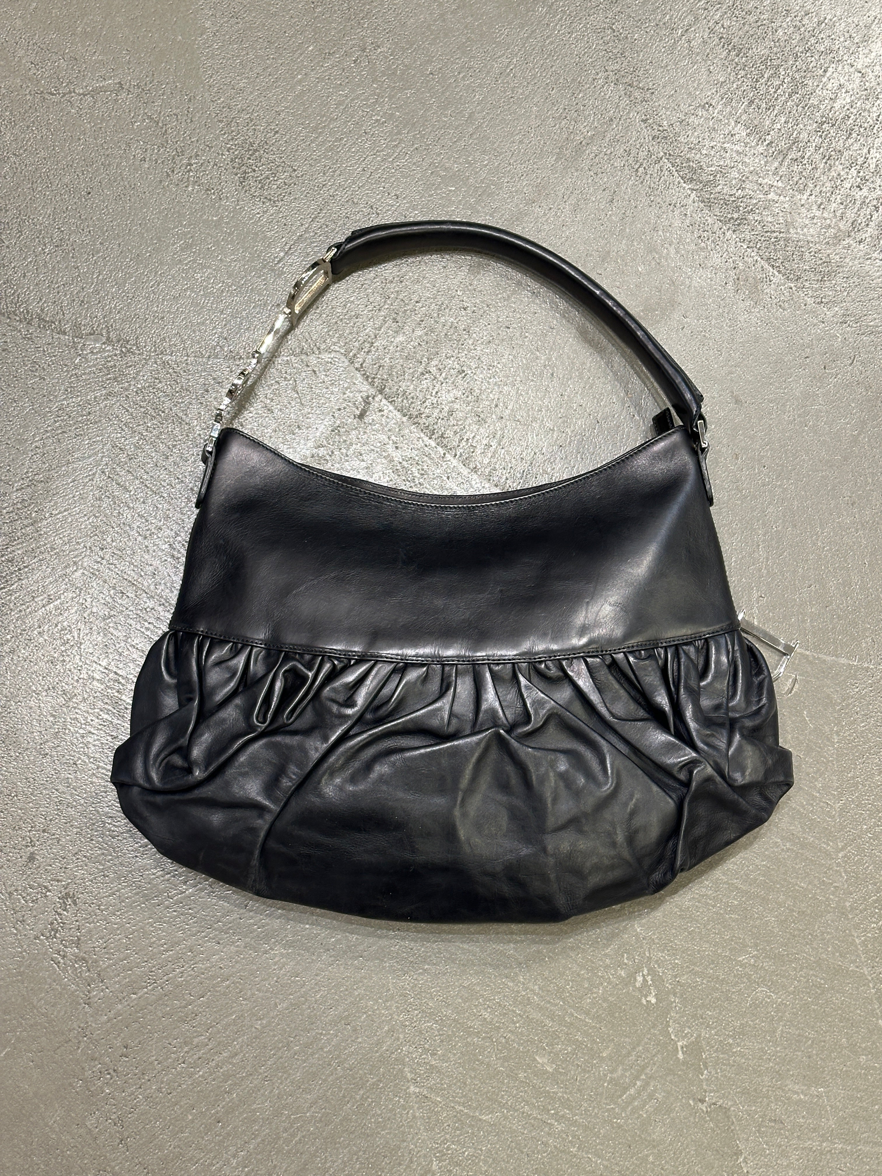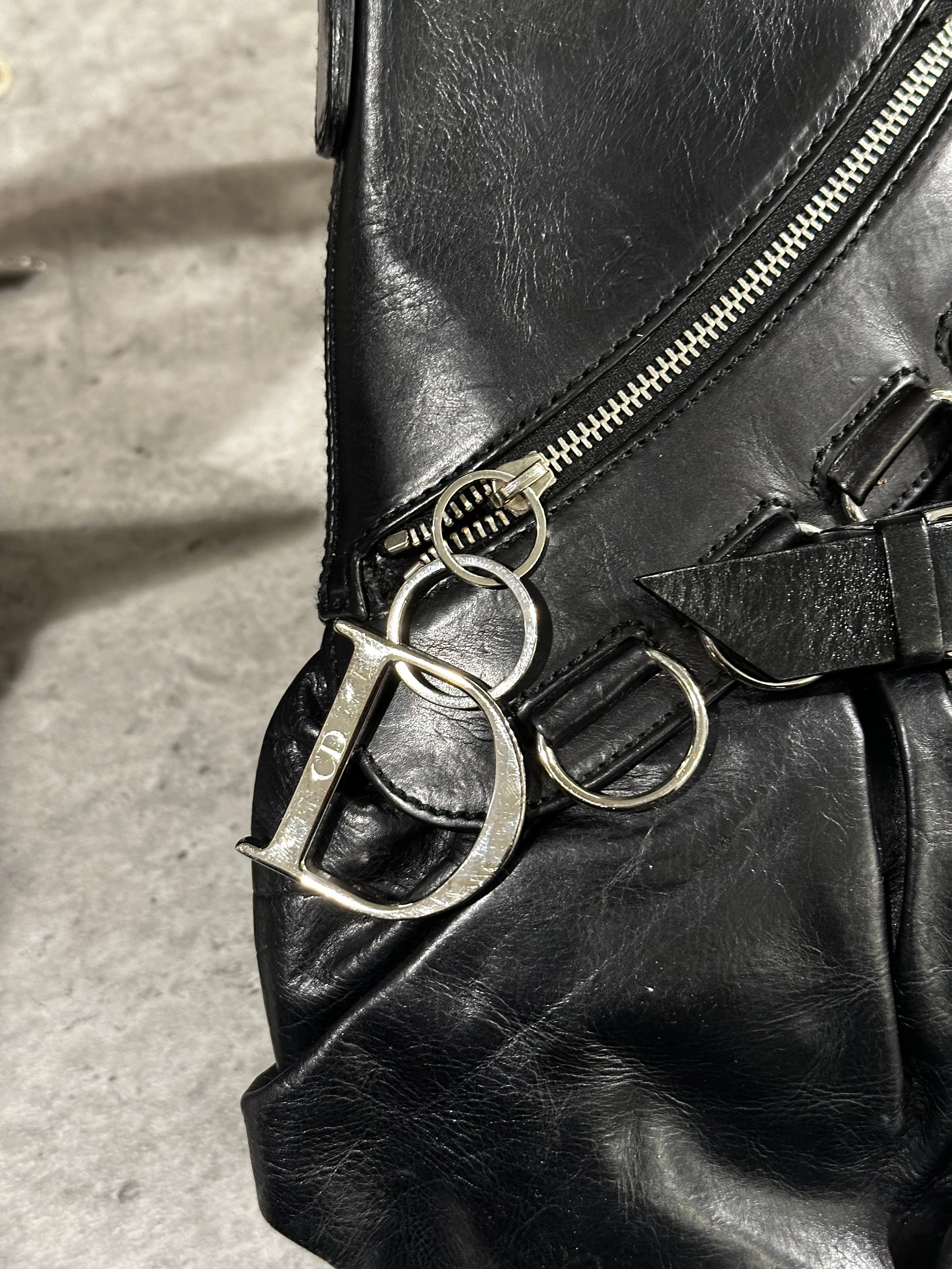 This 2005 Dior Ballet Corset bag, designed under John Galliano, draws inspiration from corsetry and dancewear, two recurring themes in his most theatrical era at the maison. Crafted in soft black leather, it features pleated construction, curved lines, and functional corset-like strap details that wrap across the body of the bag. The large silver-tone hardware and elongated zip accents add a striking contrast, giving the piece a bold, sculptural attitude typical of Galliano’s mid-2000s creations. A rare and expressive archival Dior accessory.