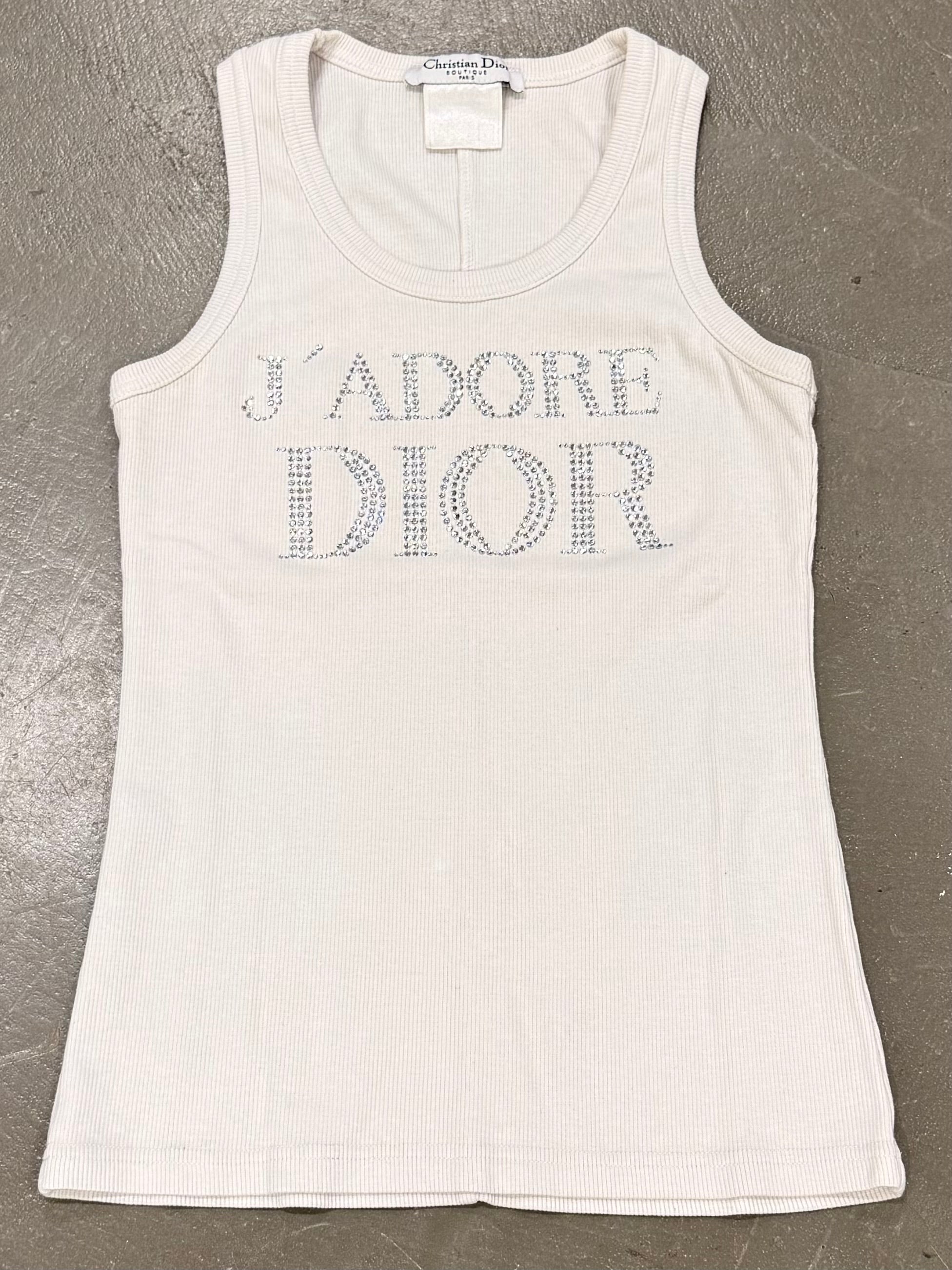 Iconic early-2000s Dior tank top designed by John Galliano, featuring the famous “J’Adore Dior” rhinestone logo across the chest. Crafted in soft white cotton with a fitted silhouette that epitomizes the Y2K era of the house under Galliano’s creative direction. A rare collector’s piece representing the height of 2000s pop culture and fashion.