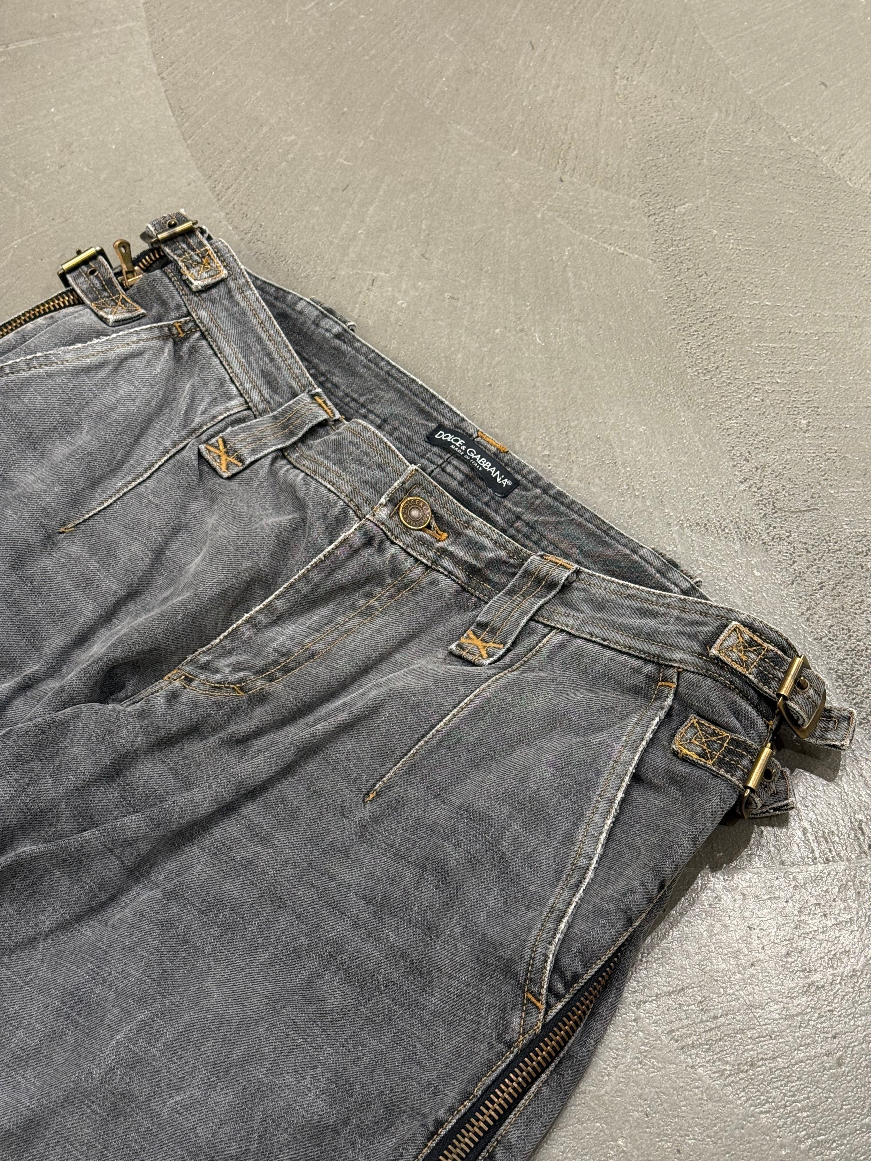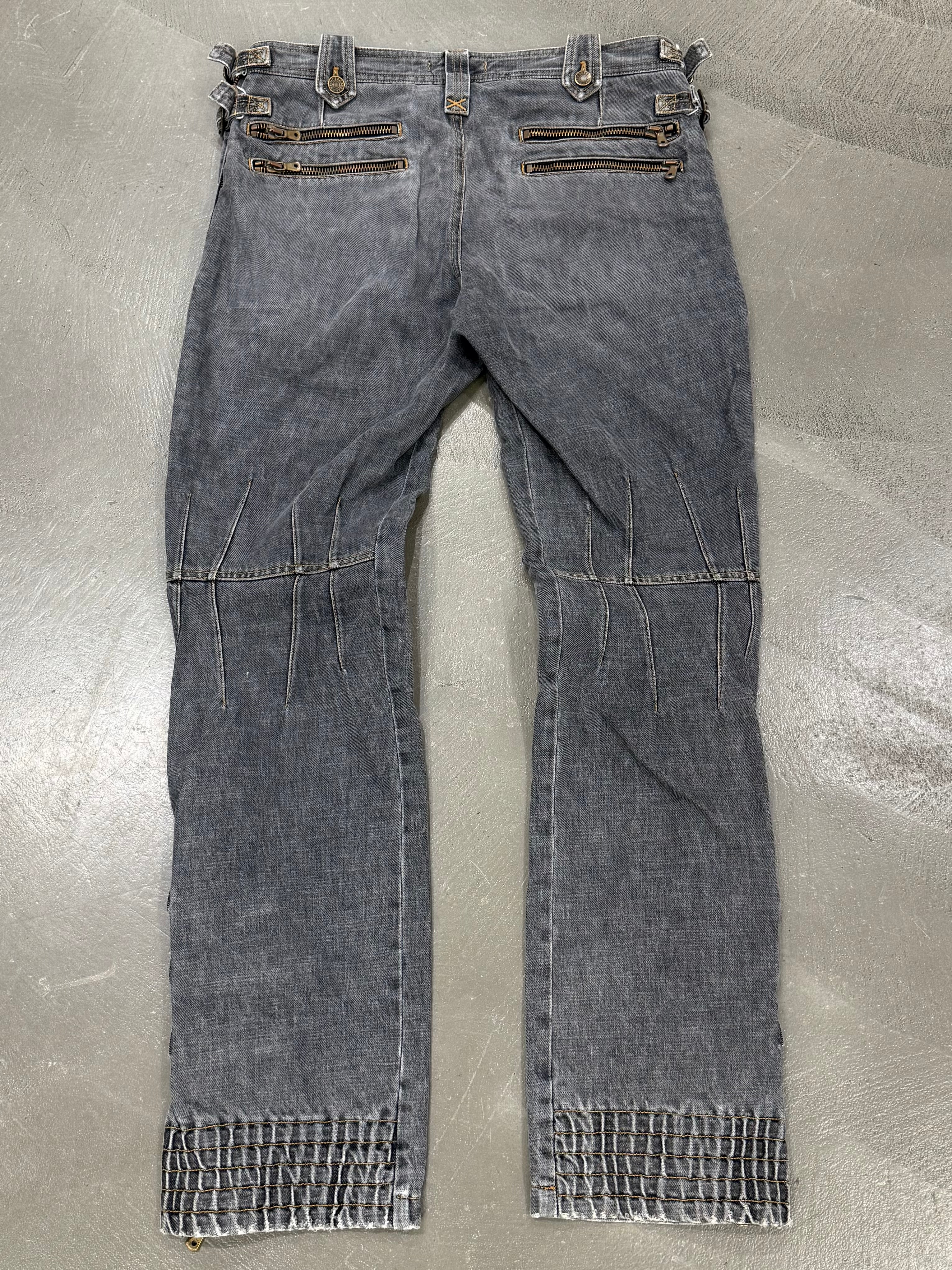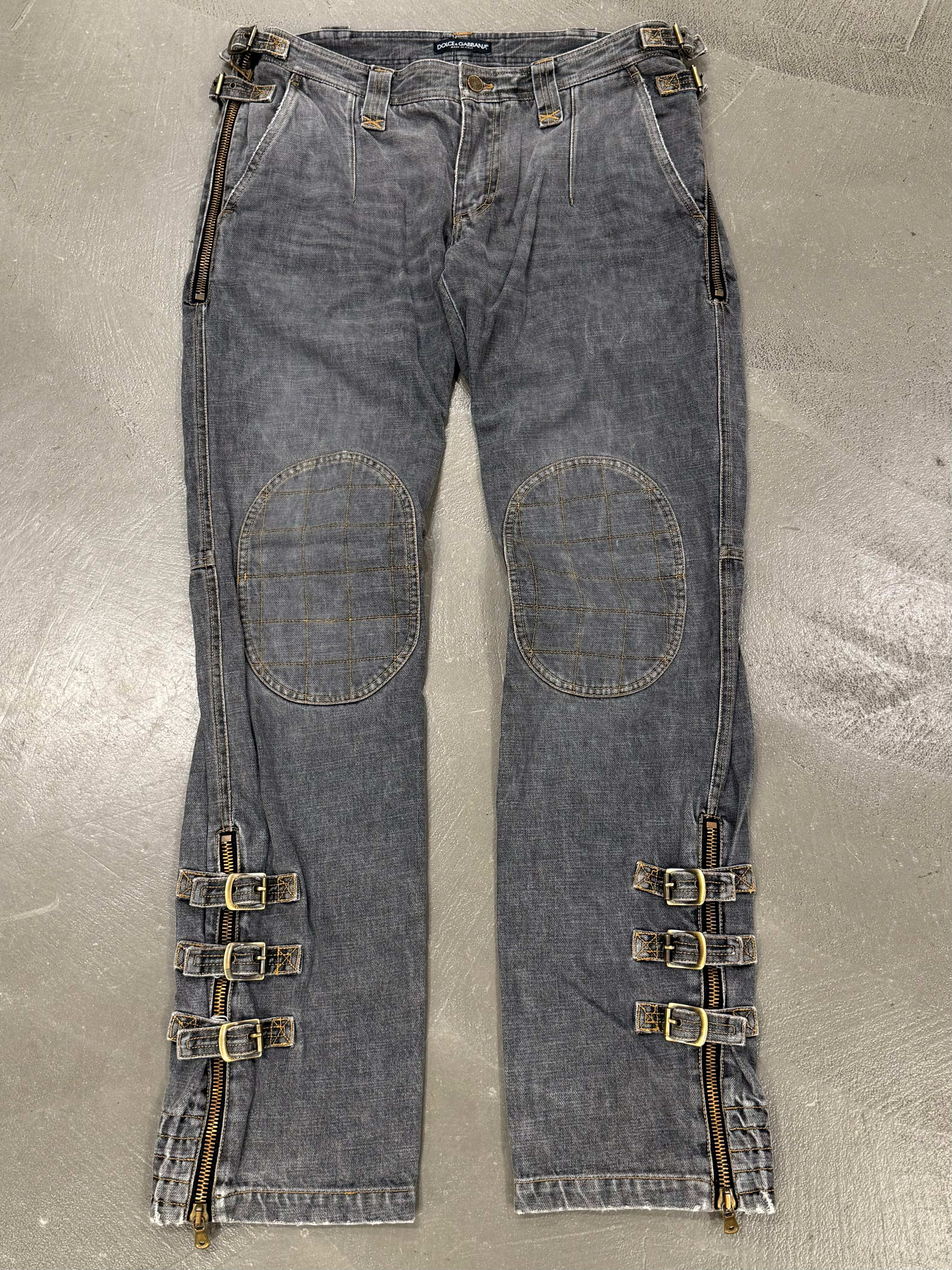 These Dolce & Gabbana pants from the Autumn/Winter 2003 runway collection embody the house’s daring early 2000s aesthetic. Crafted in grey washed denim, they feature reinforced stitched knee panels and multiple leather strap and buckle details running along the sides. The fusion of biker and bondage elements makes this an iconic archival piece from the brand’s boldest era.