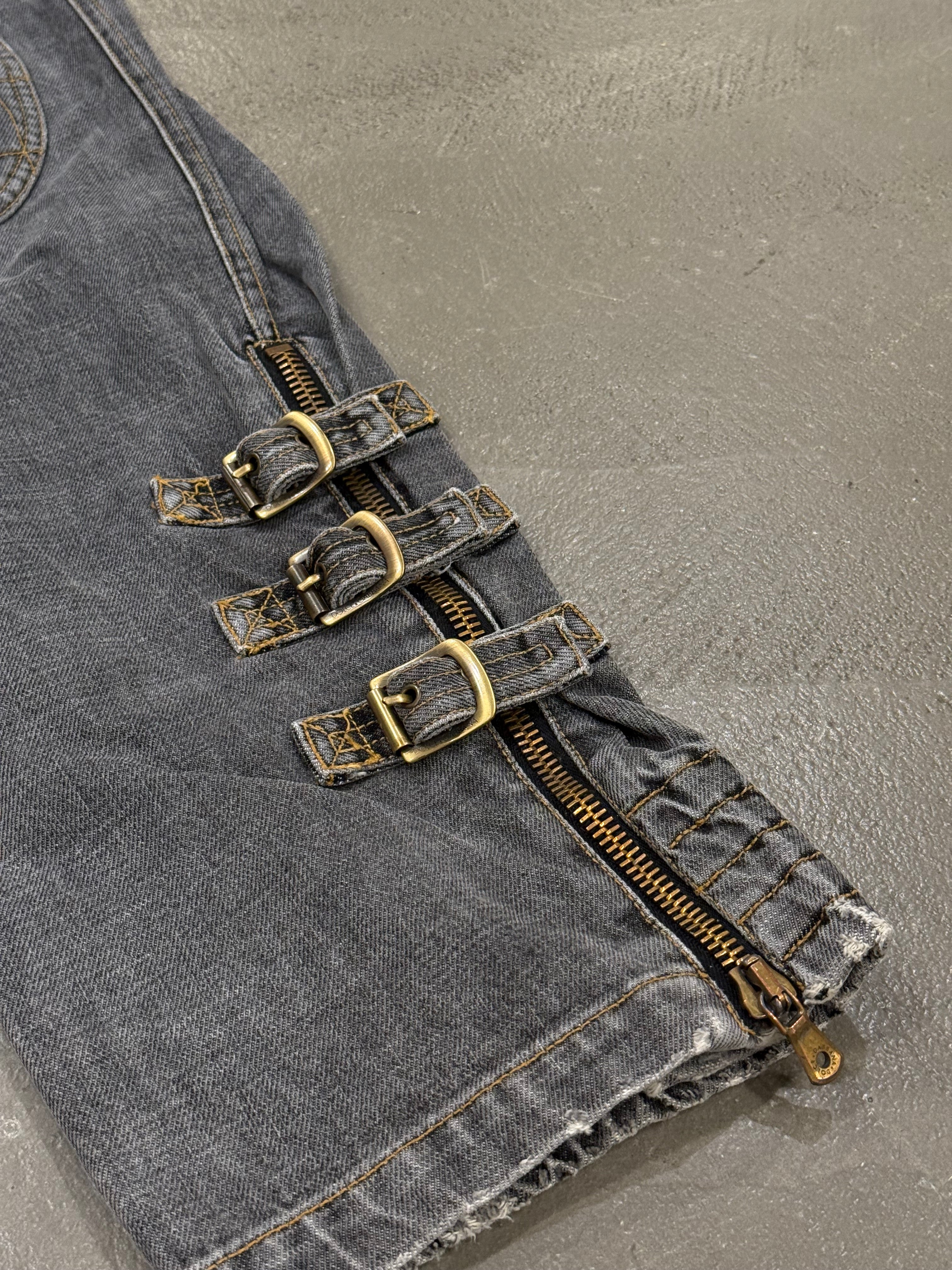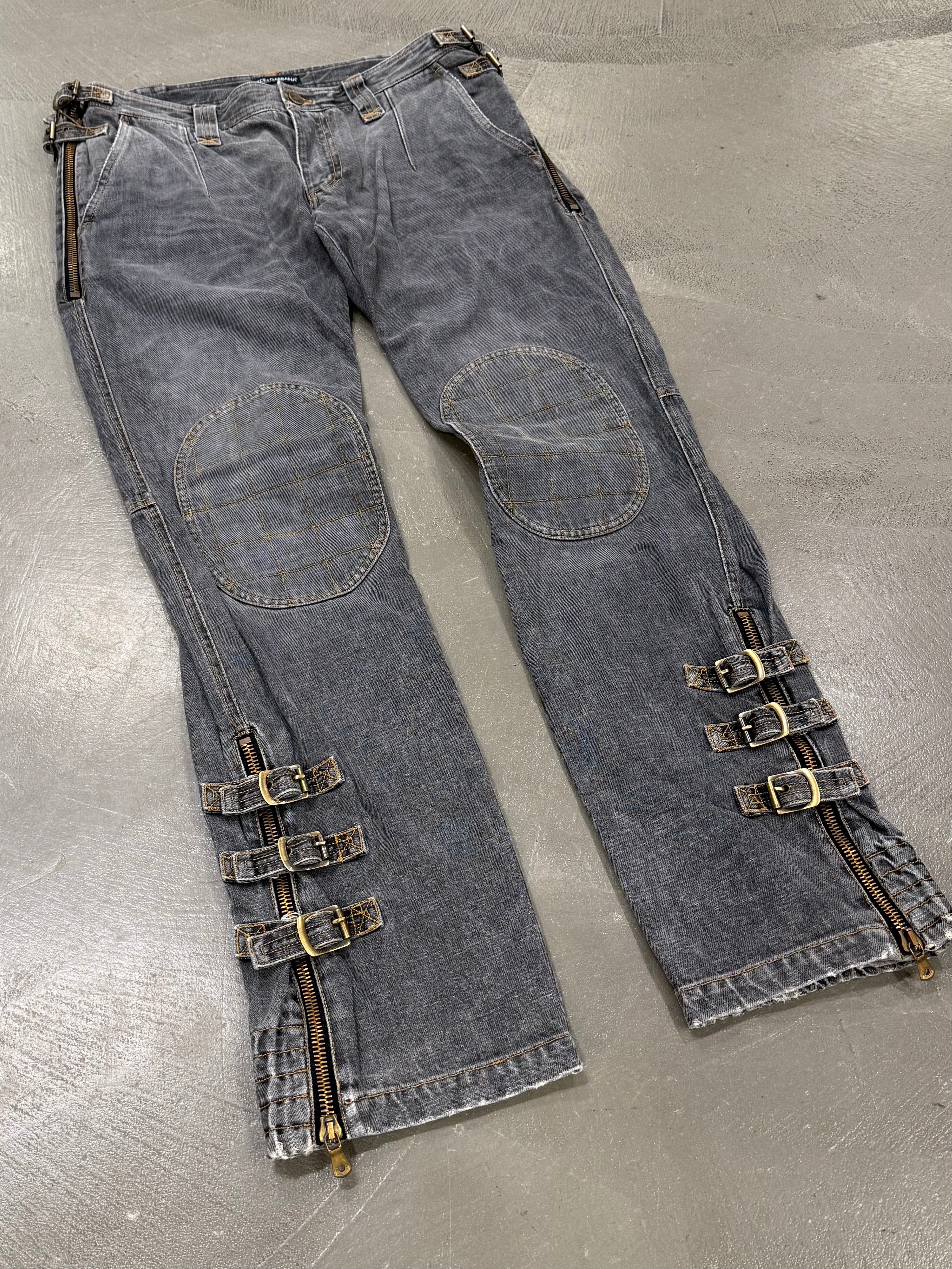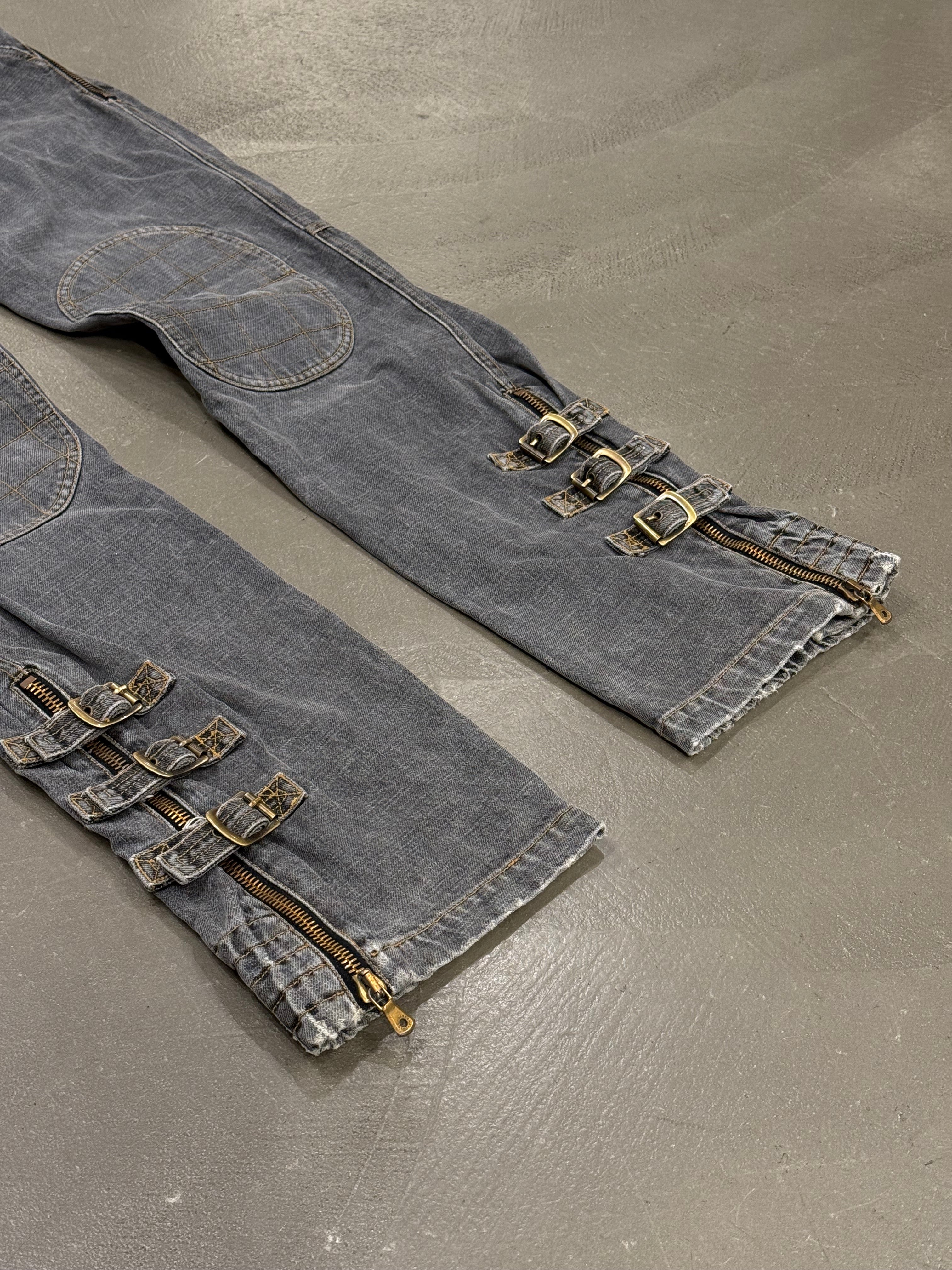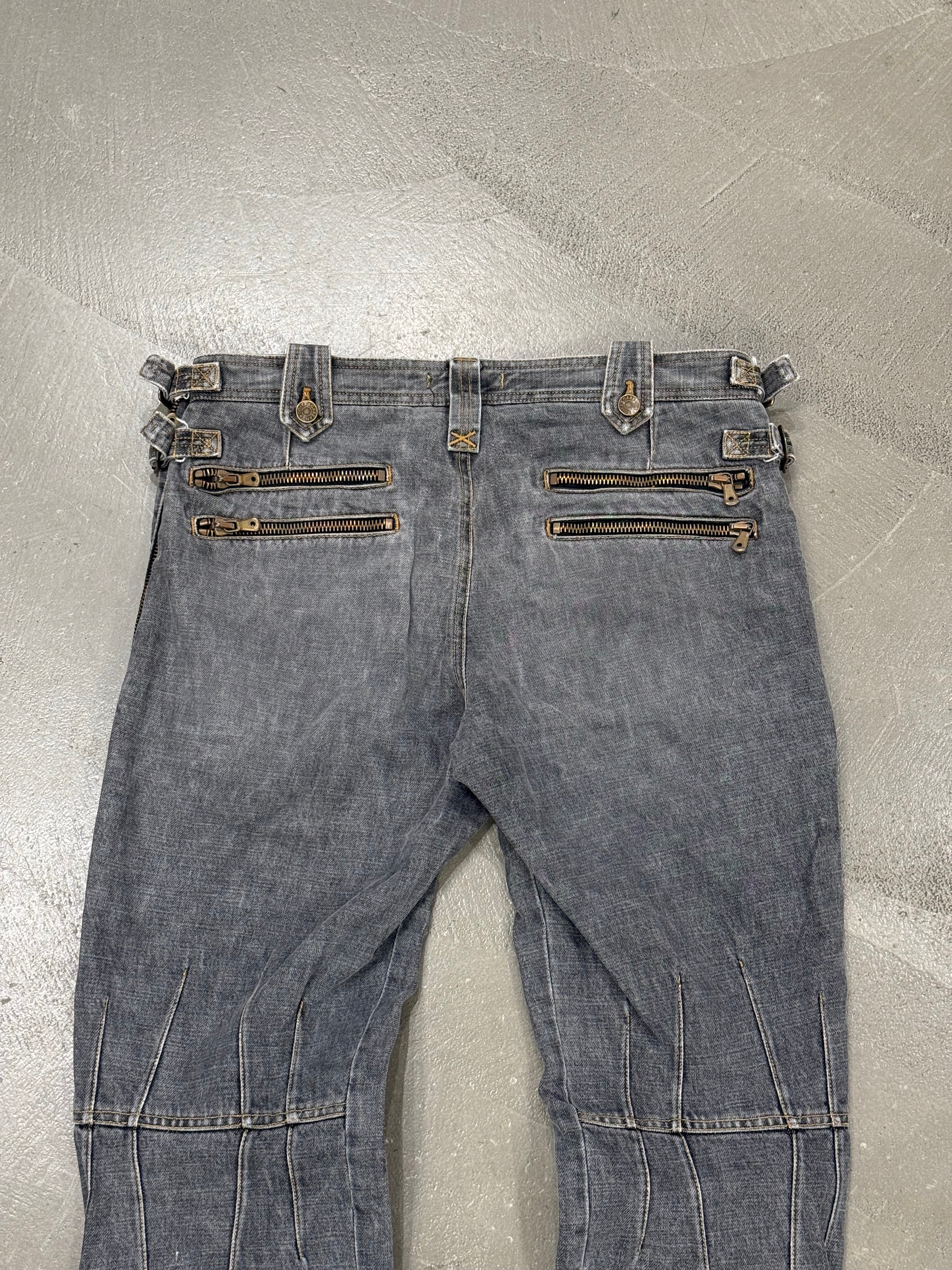 These Dolce & Gabbana pants from the Autumn/Winter 2003 runway collection embody the house’s daring early 2000s aesthetic. Crafted in grey washed denim, they feature reinforced stitched knee panels and multiple leather strap and buckle details running along the sides. The fusion of biker and bondage elements makes this an iconic archival piece from the brand’s boldest era.