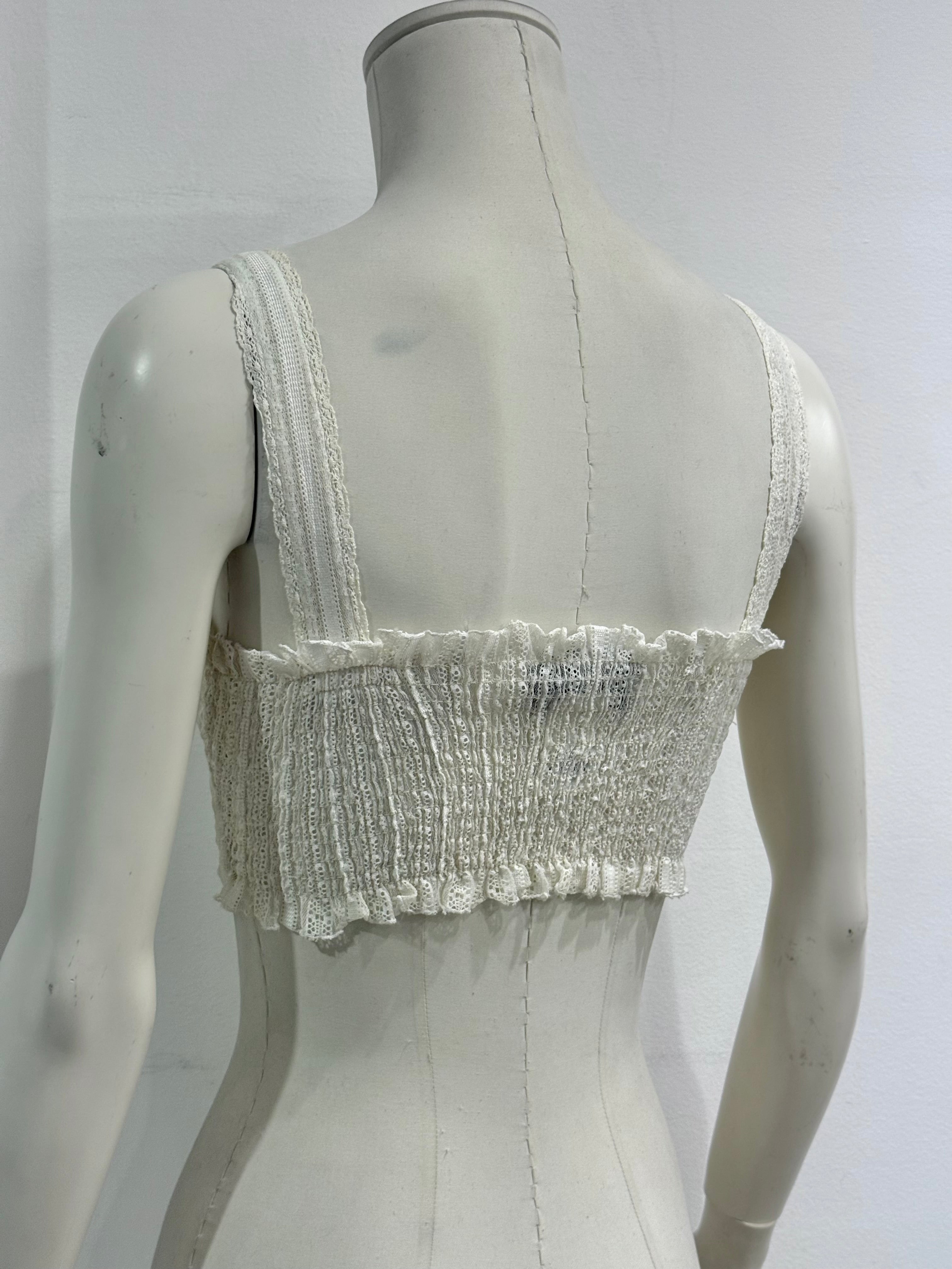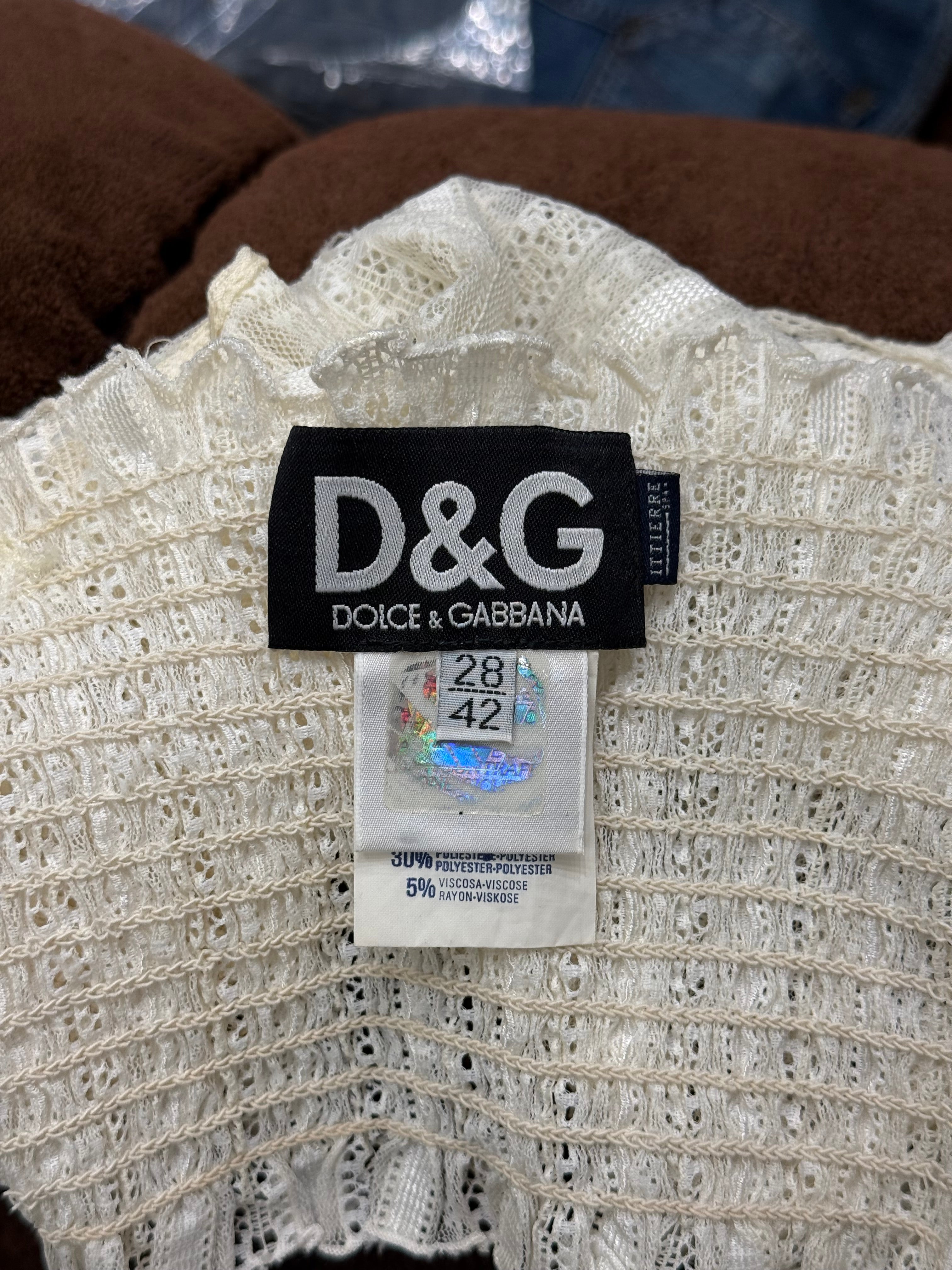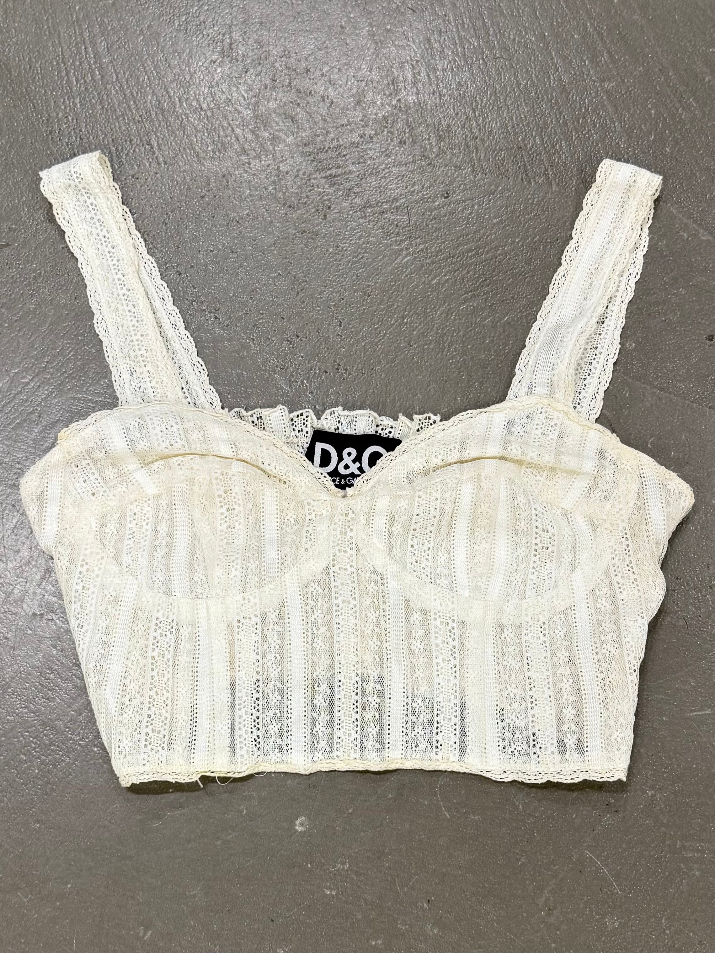Delicate sheer lace corset top from the 1990s Dolce & Gabbana collections. Features underwired cups, adjustable straps, and boning for a structured silhouette. Crafted in soft polyamide lace for a feminine, sensual look typical of the era.