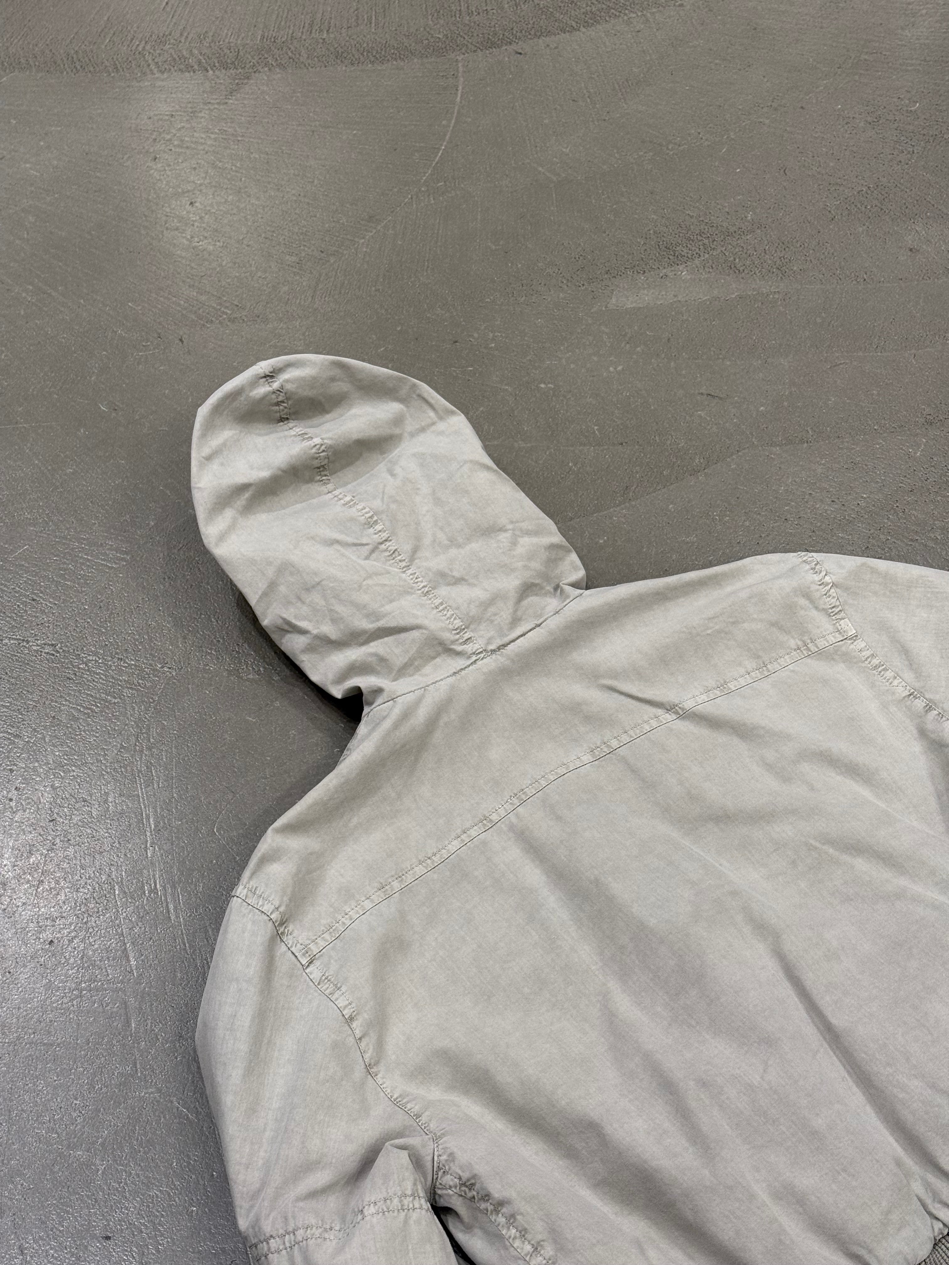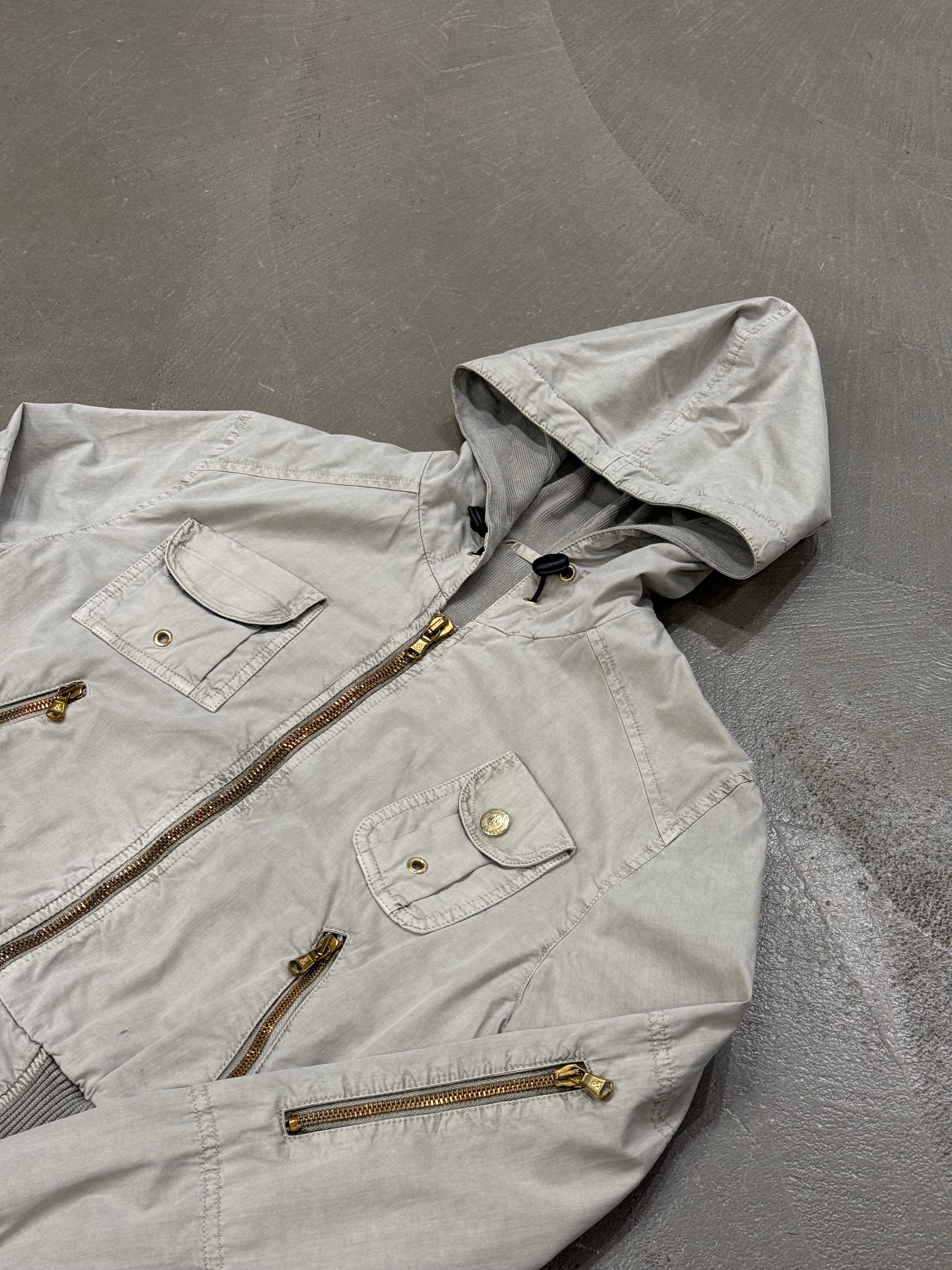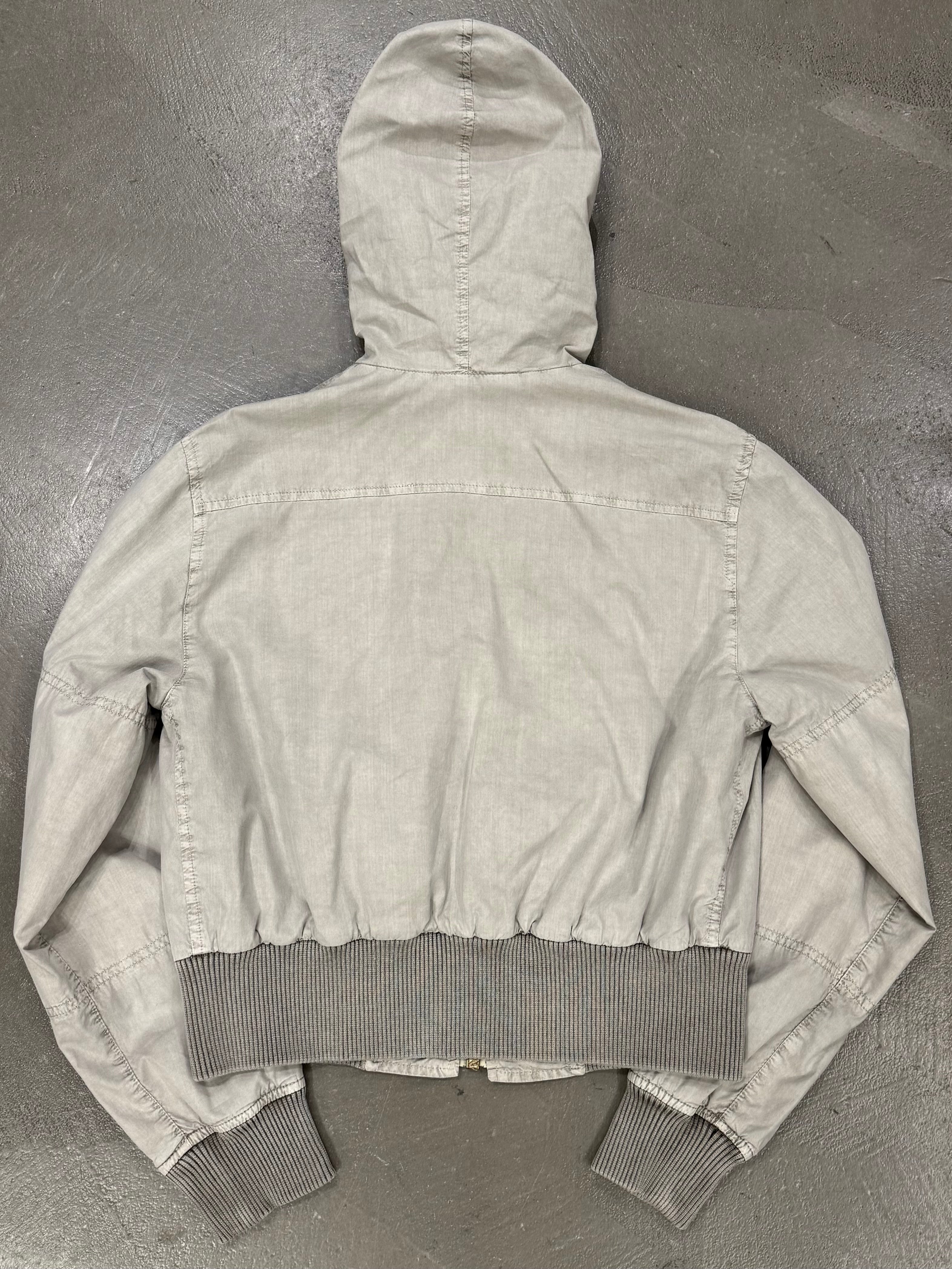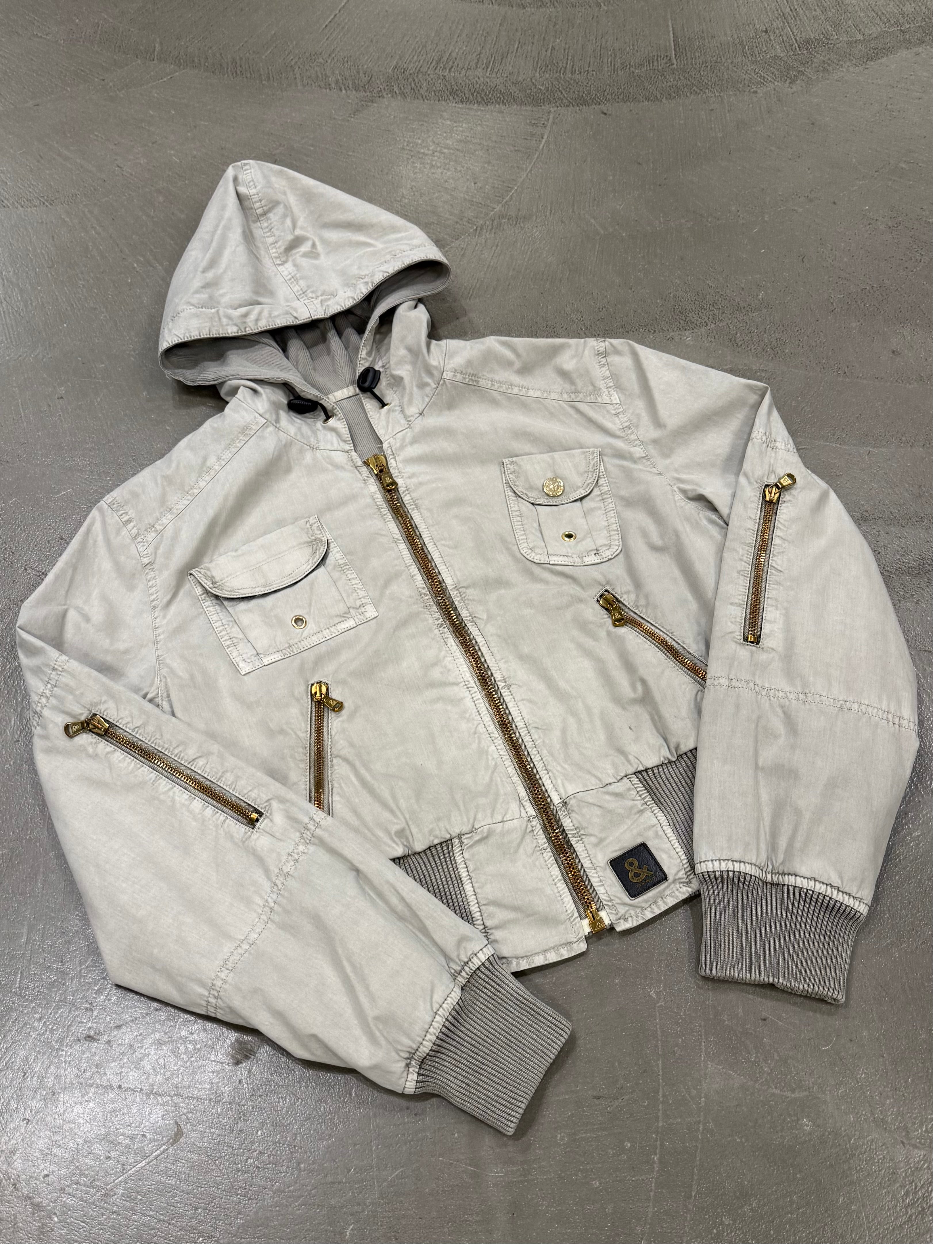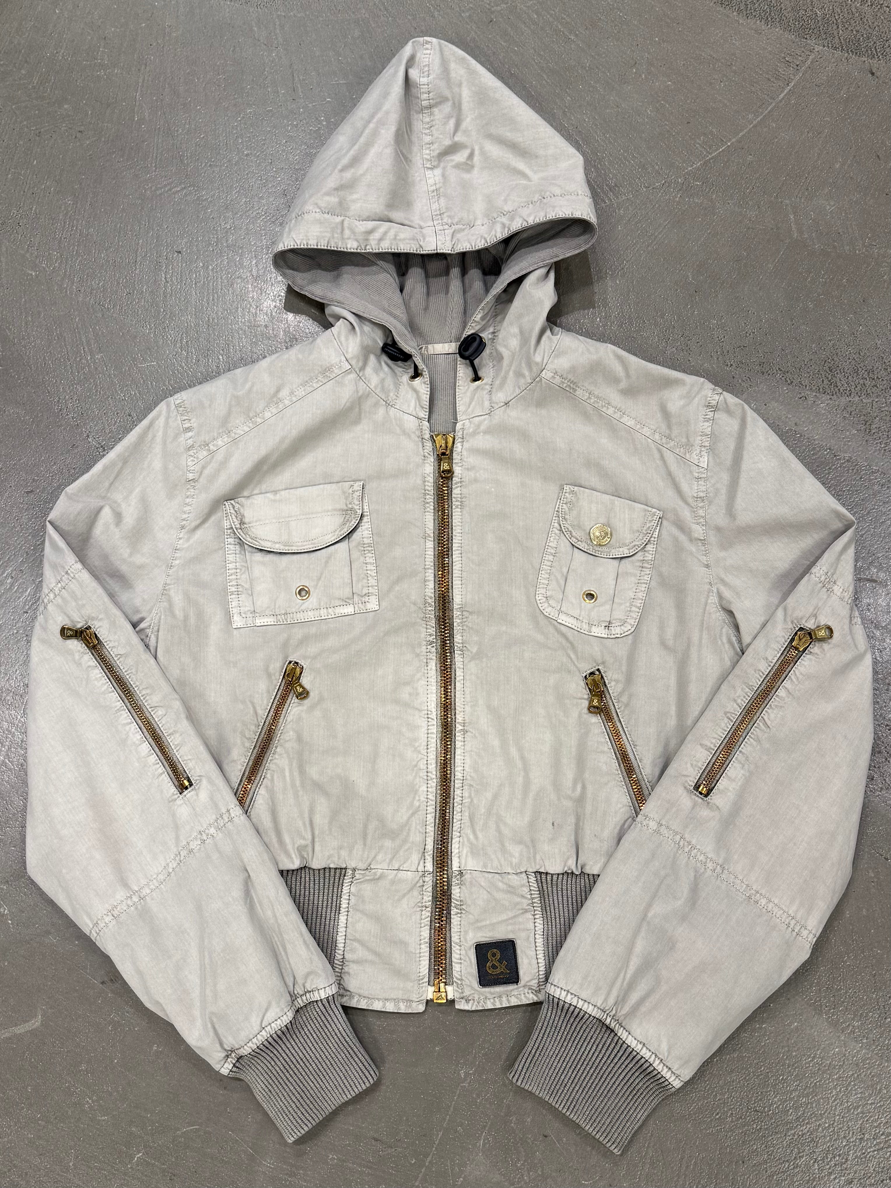 This early-2000s Dolce & Gabbana military-inspired jacket features a sharp cropped cut and a structured silhouette. Crafted in crisp cotton with multiple zipped pockets and a hooded design, it blends utility references with the sleek, fitted proportions typical of the era. A versatile archival piece with strong character.