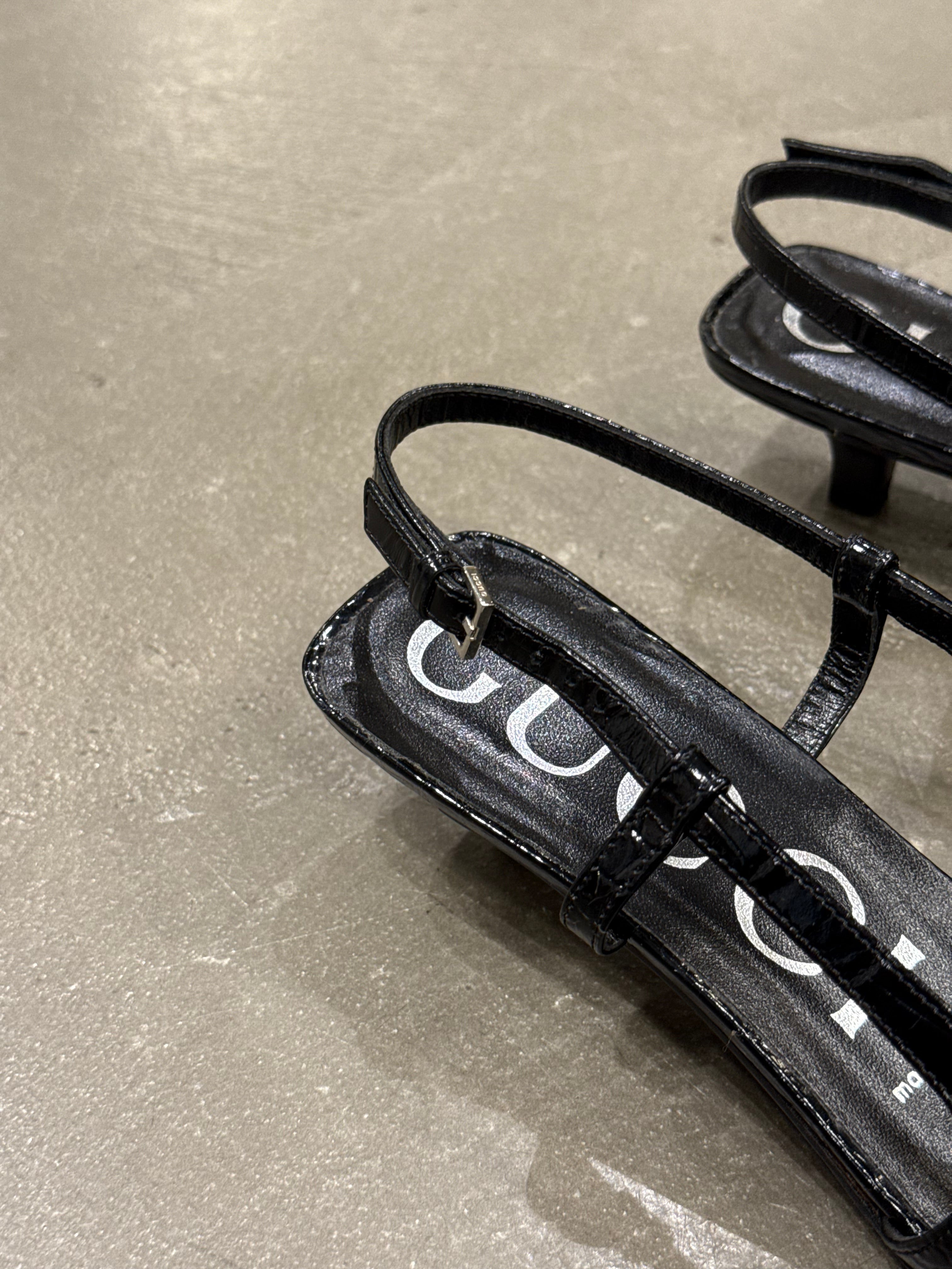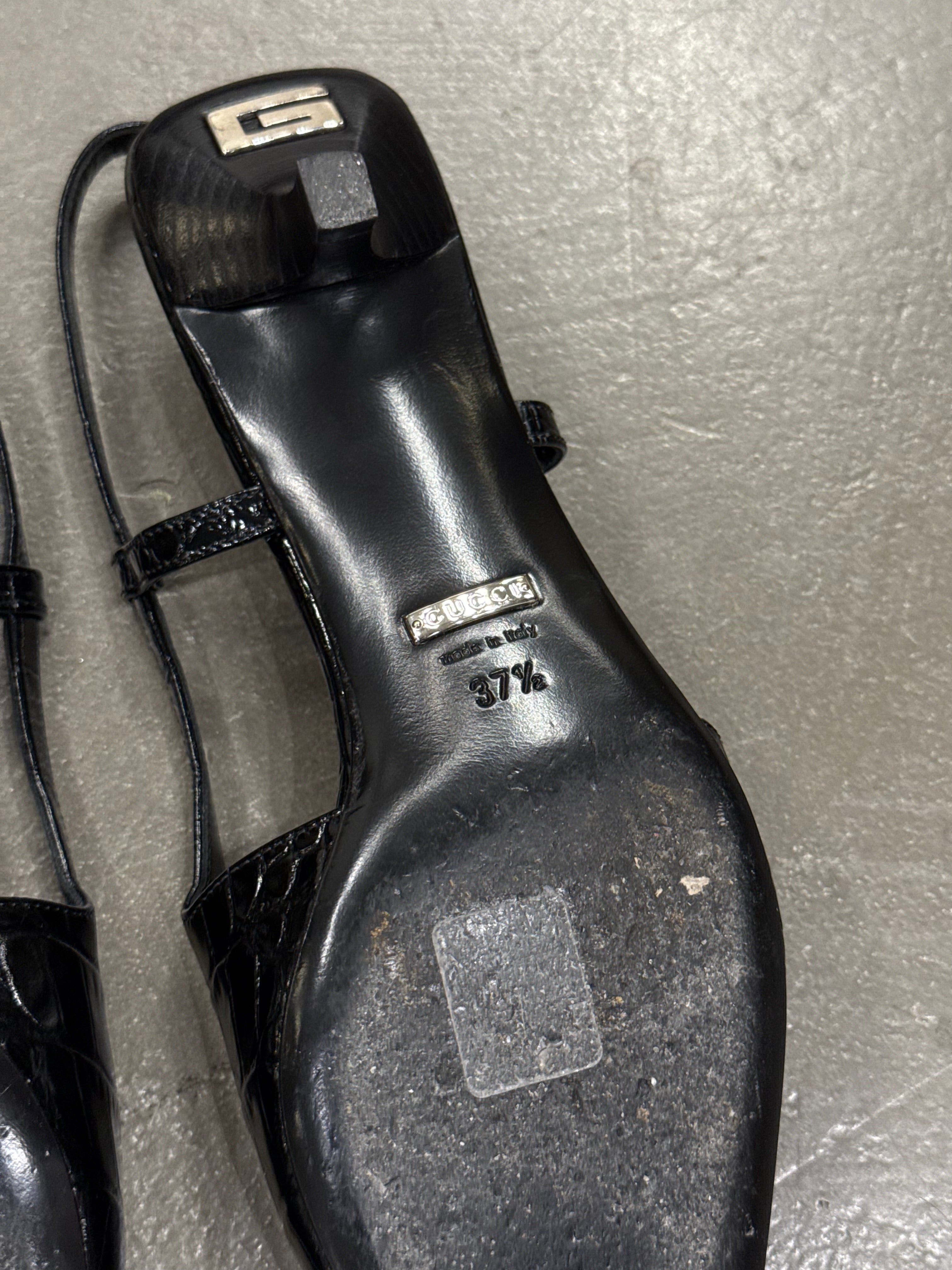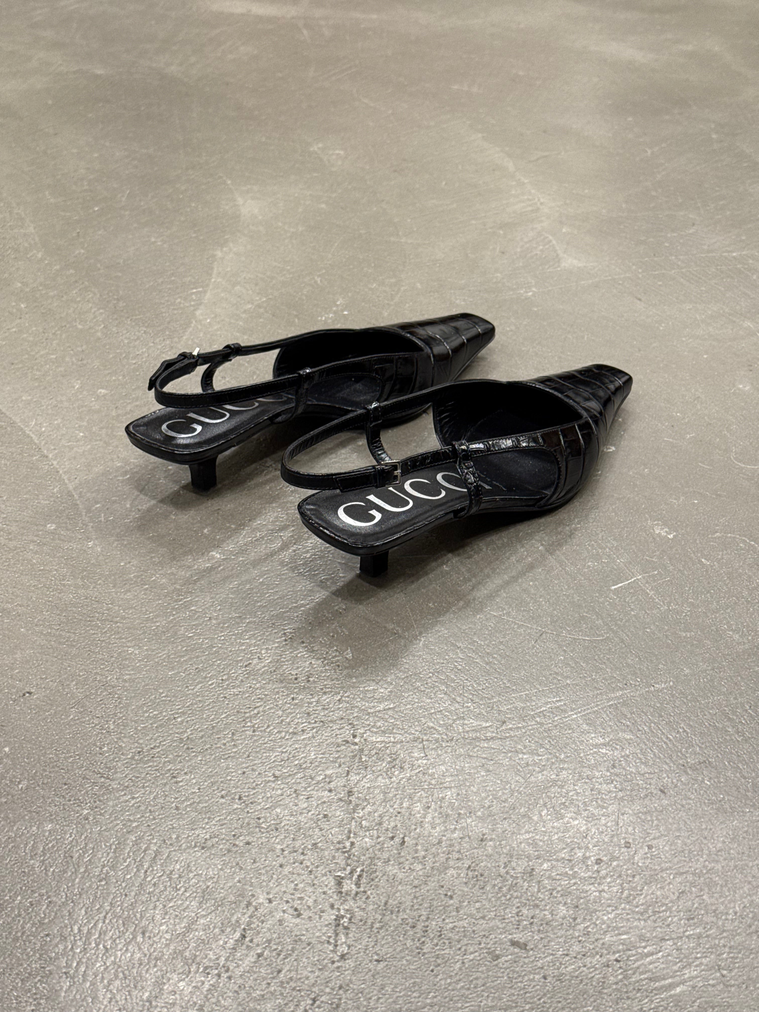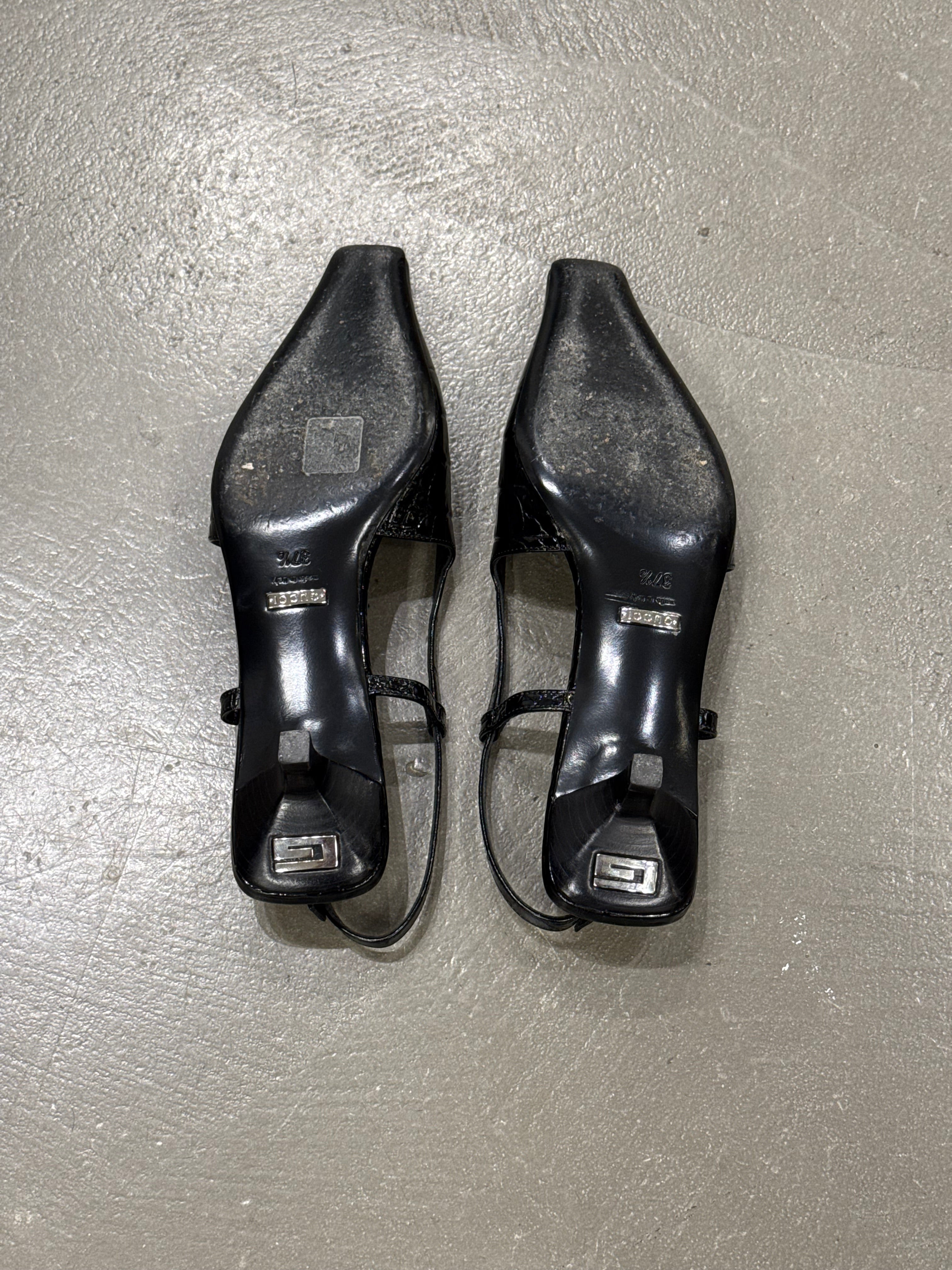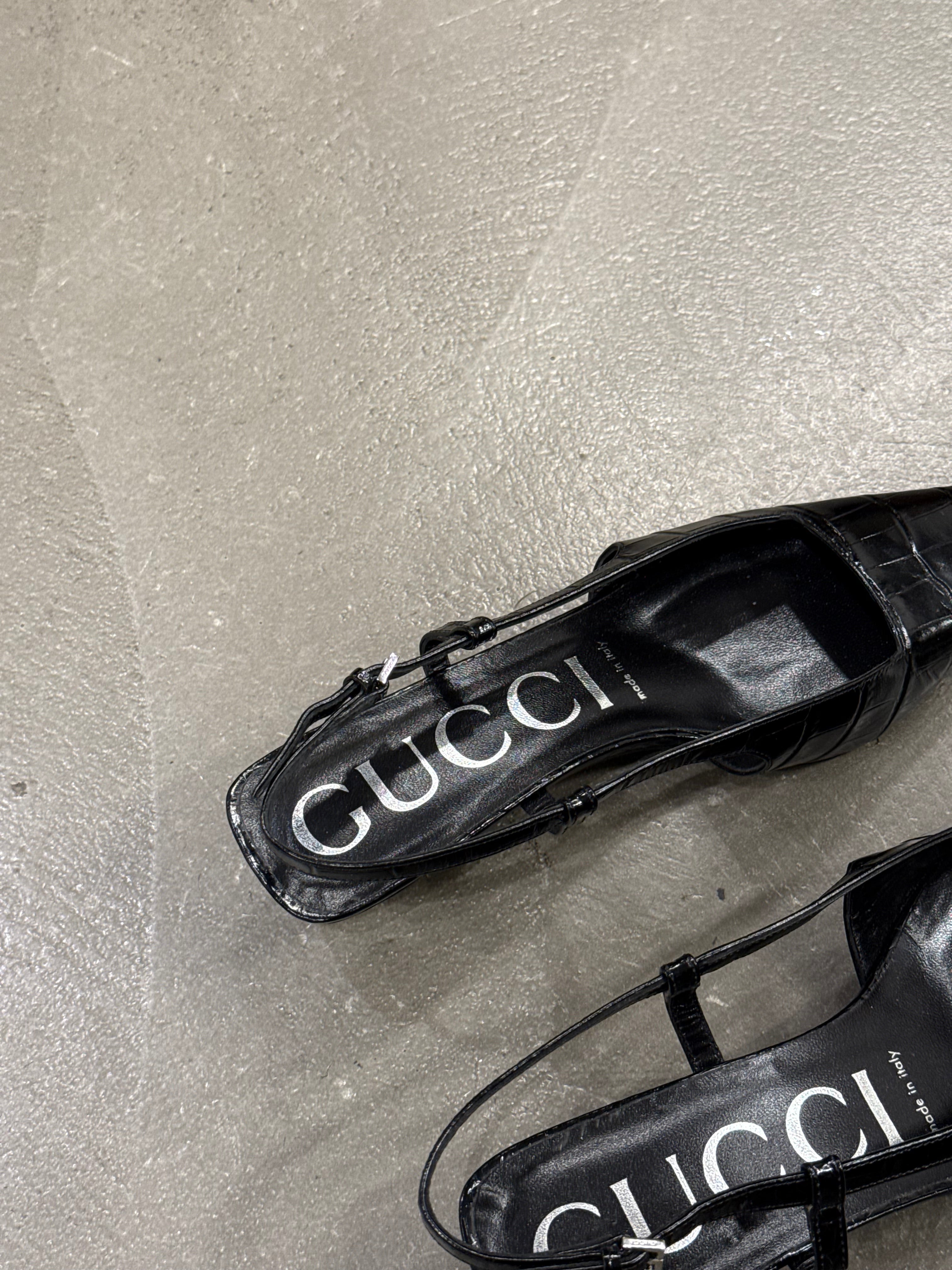 These early-2000s Gucci slingback heels feature an embossed crocodile texture with a sleek, pointed silhouette. Understated yet luxurious, they reflect Gucci’s refined craftsmanship during the Tom Ford transition era.