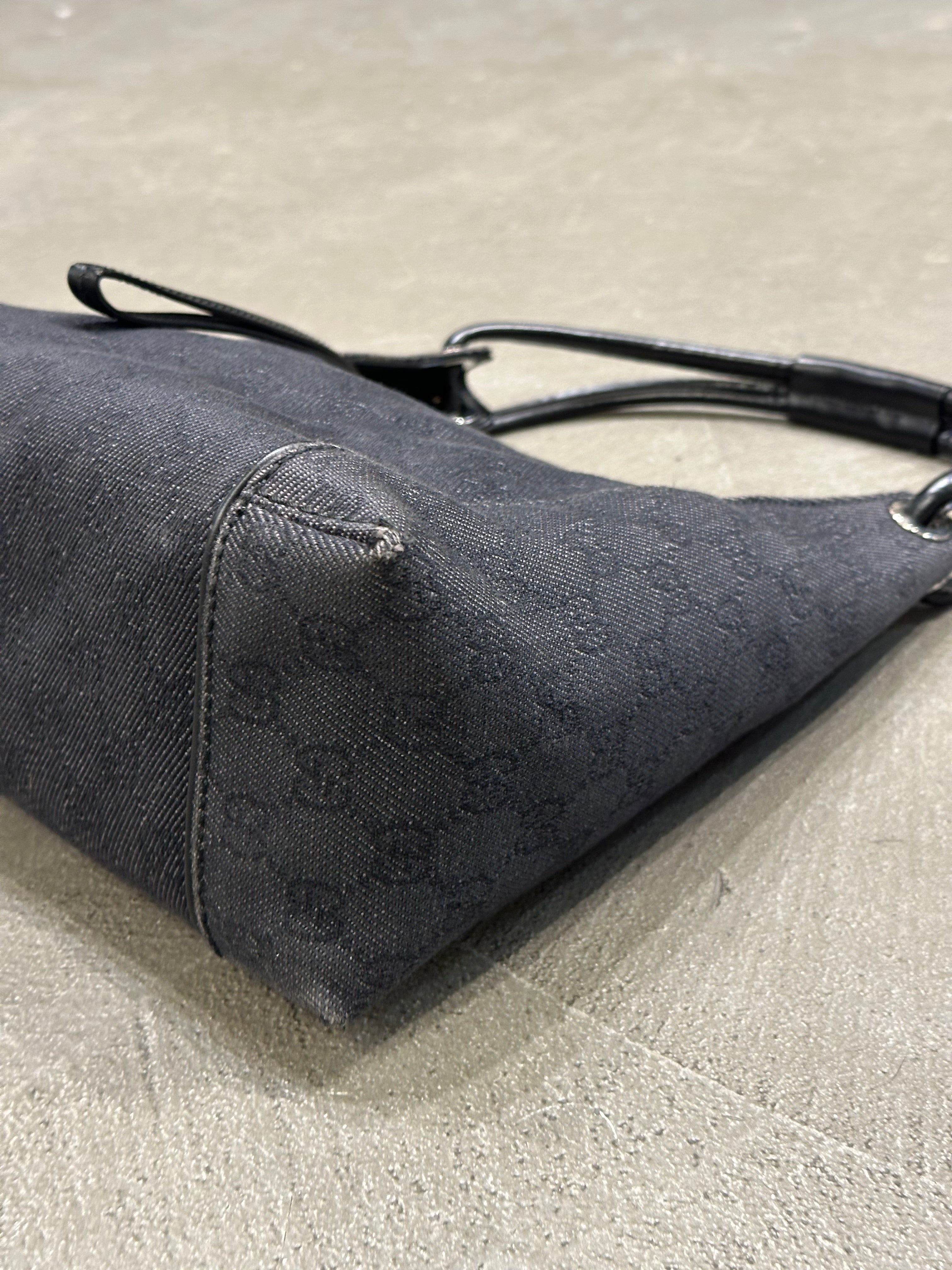 This Gucci shoulder bag from the 2000s is crafted in the house’s iconic GG monogram canvas, featuring a compact yet functional silhouette emblematic of the era. Designed with a softly structured body, it is finished with a curved leather shoulder strap and subtle leather trim that adds depth and contrast to the all-black canvas. The minimalist shape and understated branding make it a versatile archive piece, easily wearable both day and evening.