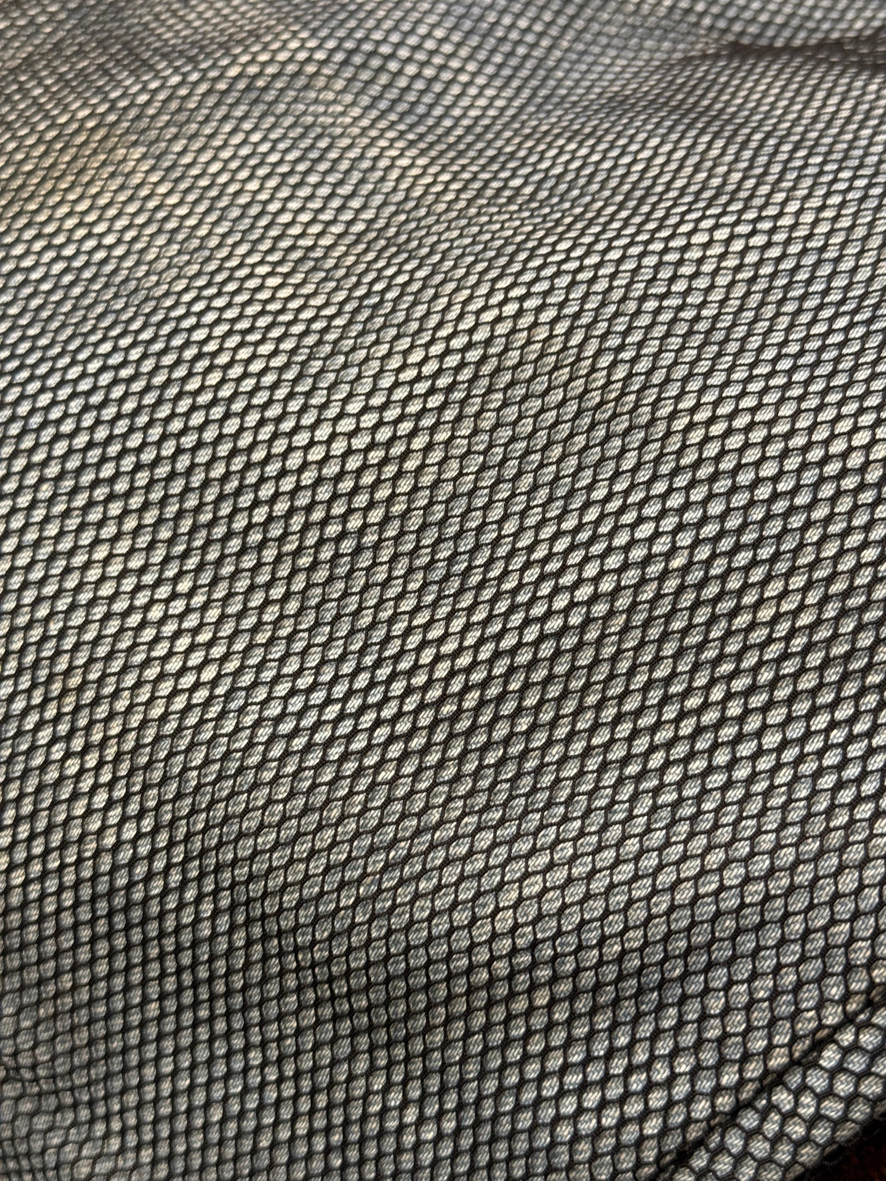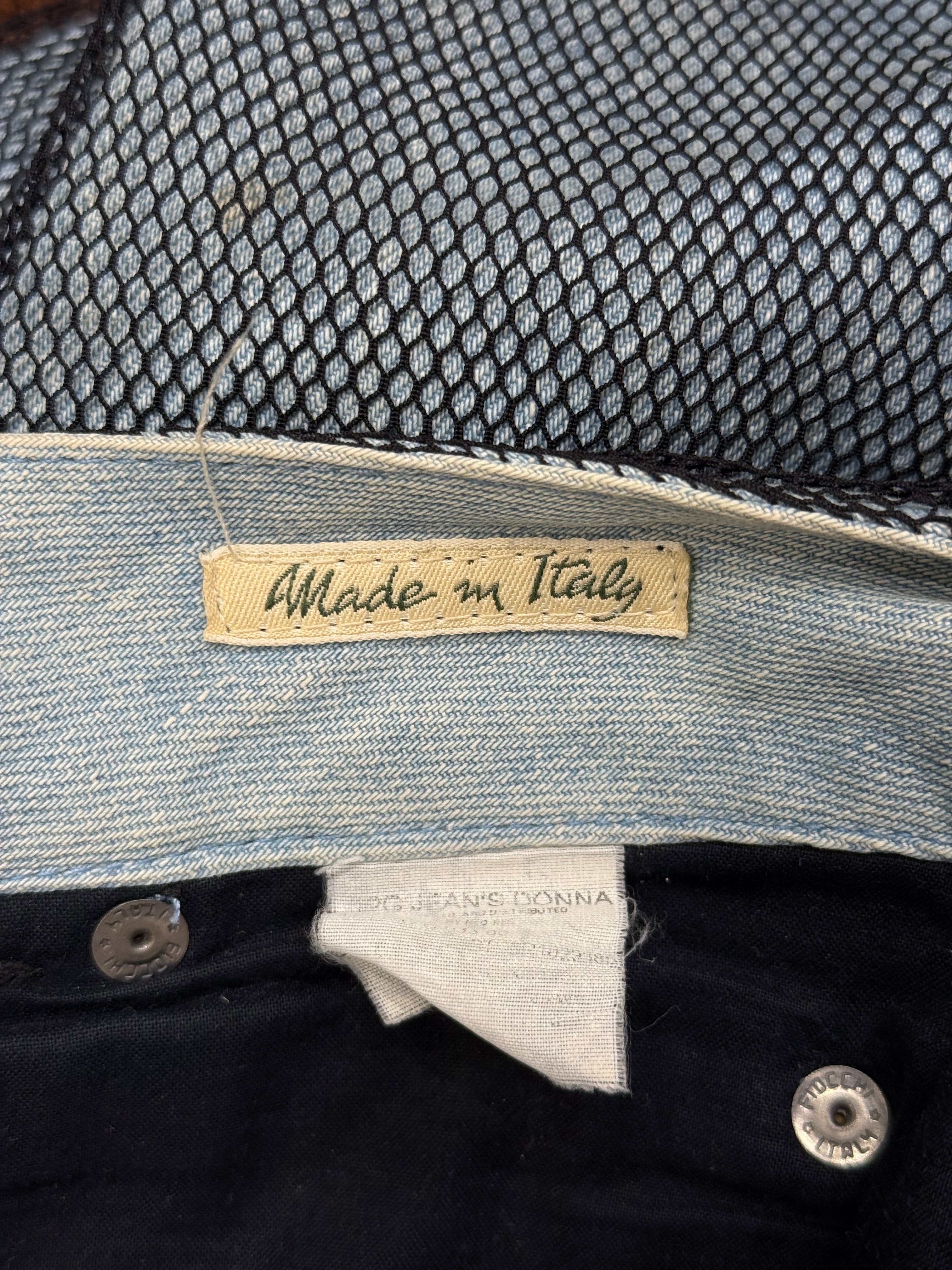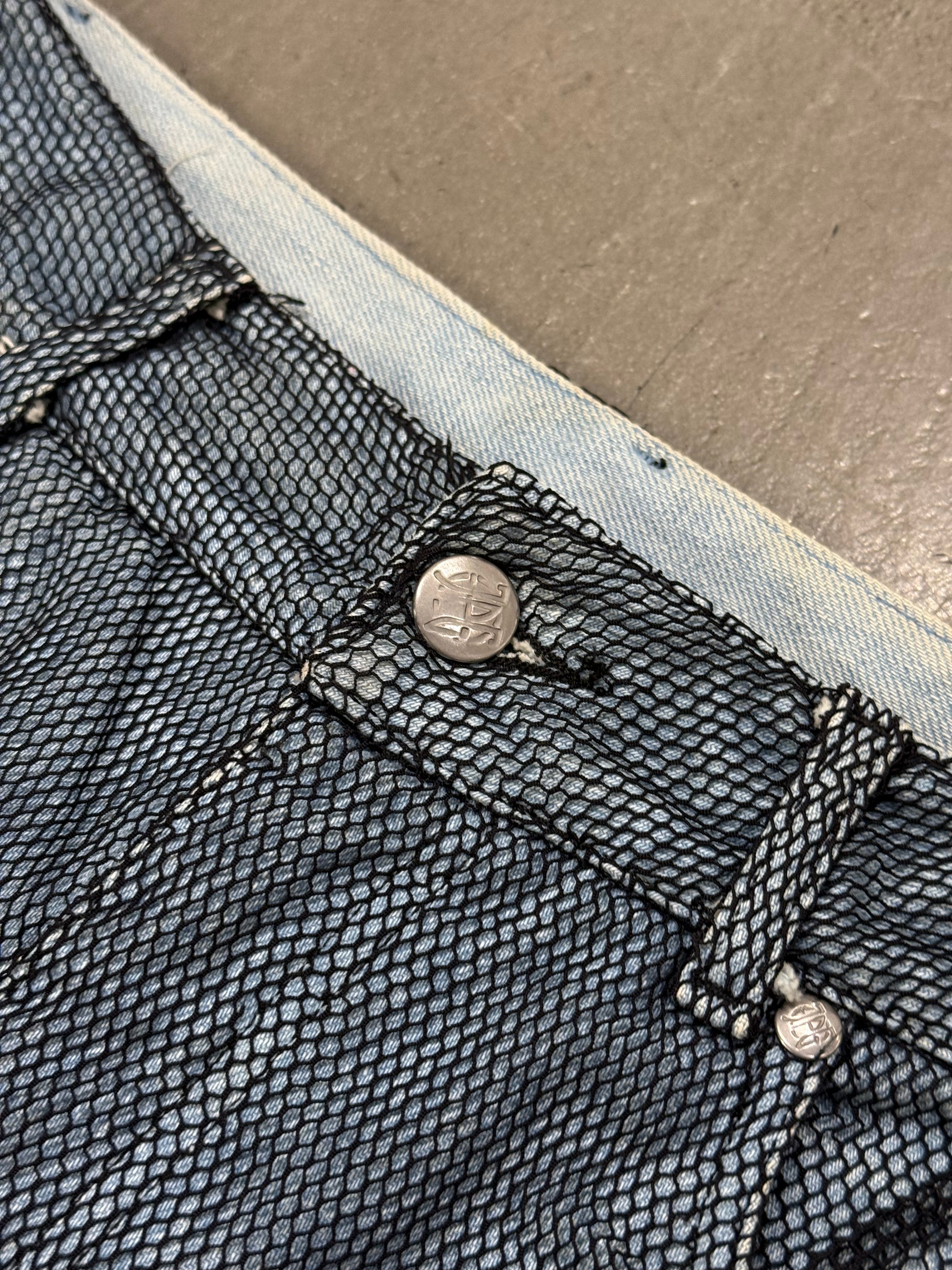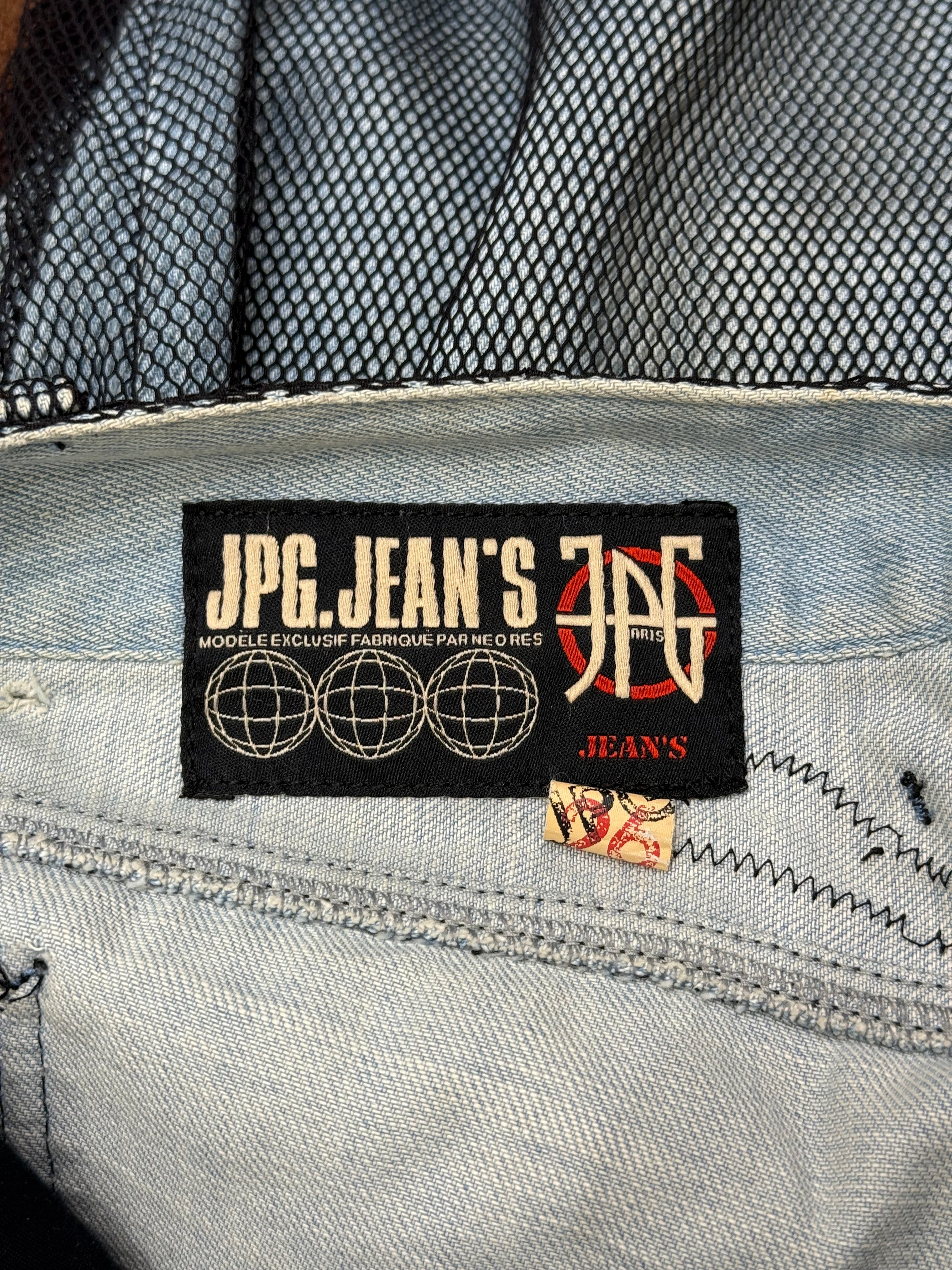 These early-2000s Jean Paul Gaultier pants feature a distinctive double-layer mesh construction over denim, creating a subtle textured effect characteristic of Gaultier’s experimental approach to fabrication. The silhouette is straight with a clean mid-rise cut, offering a balance between structure and fluidity. A rare archival piece that blends casual wear with avant-garde detailing.