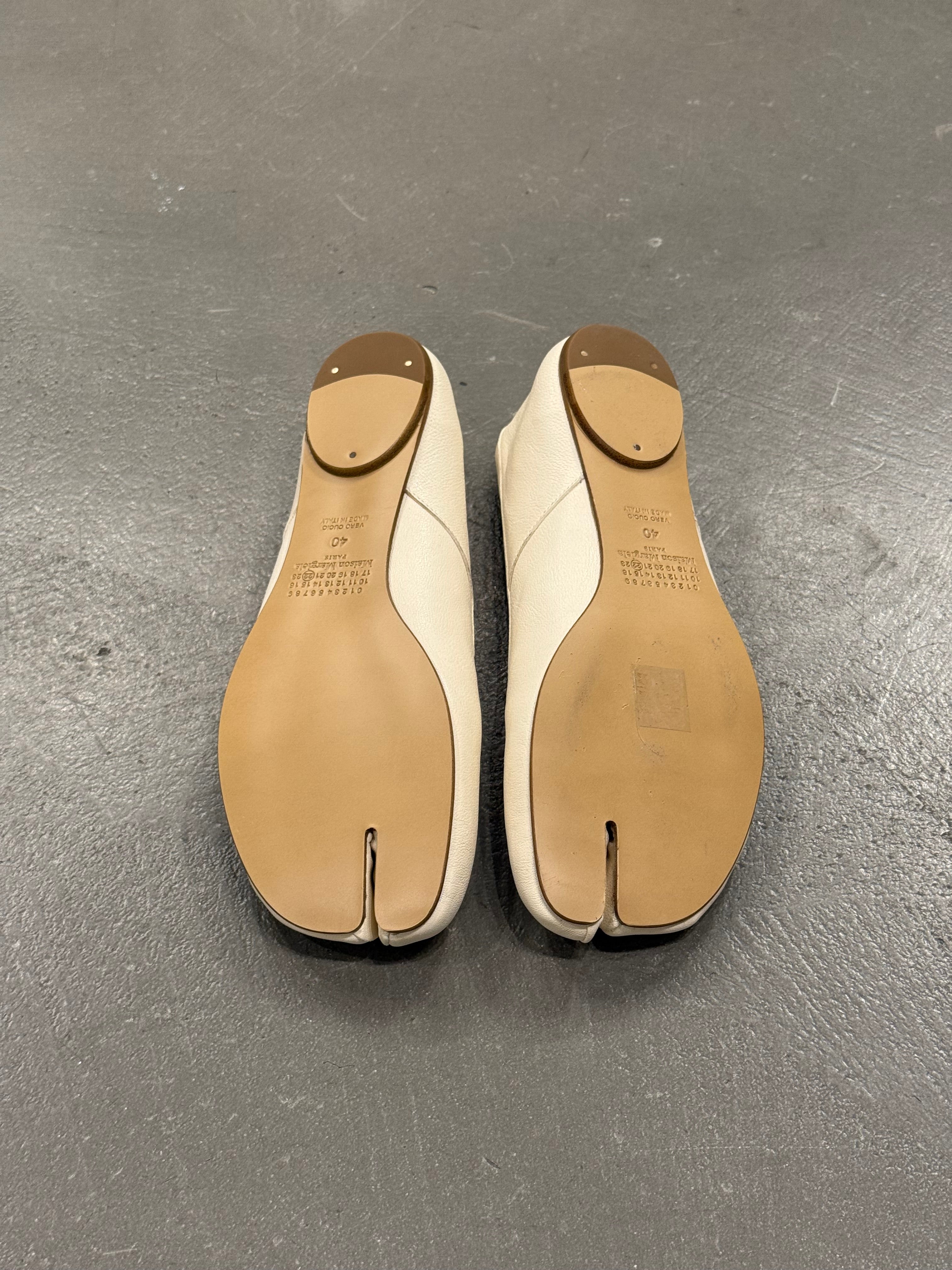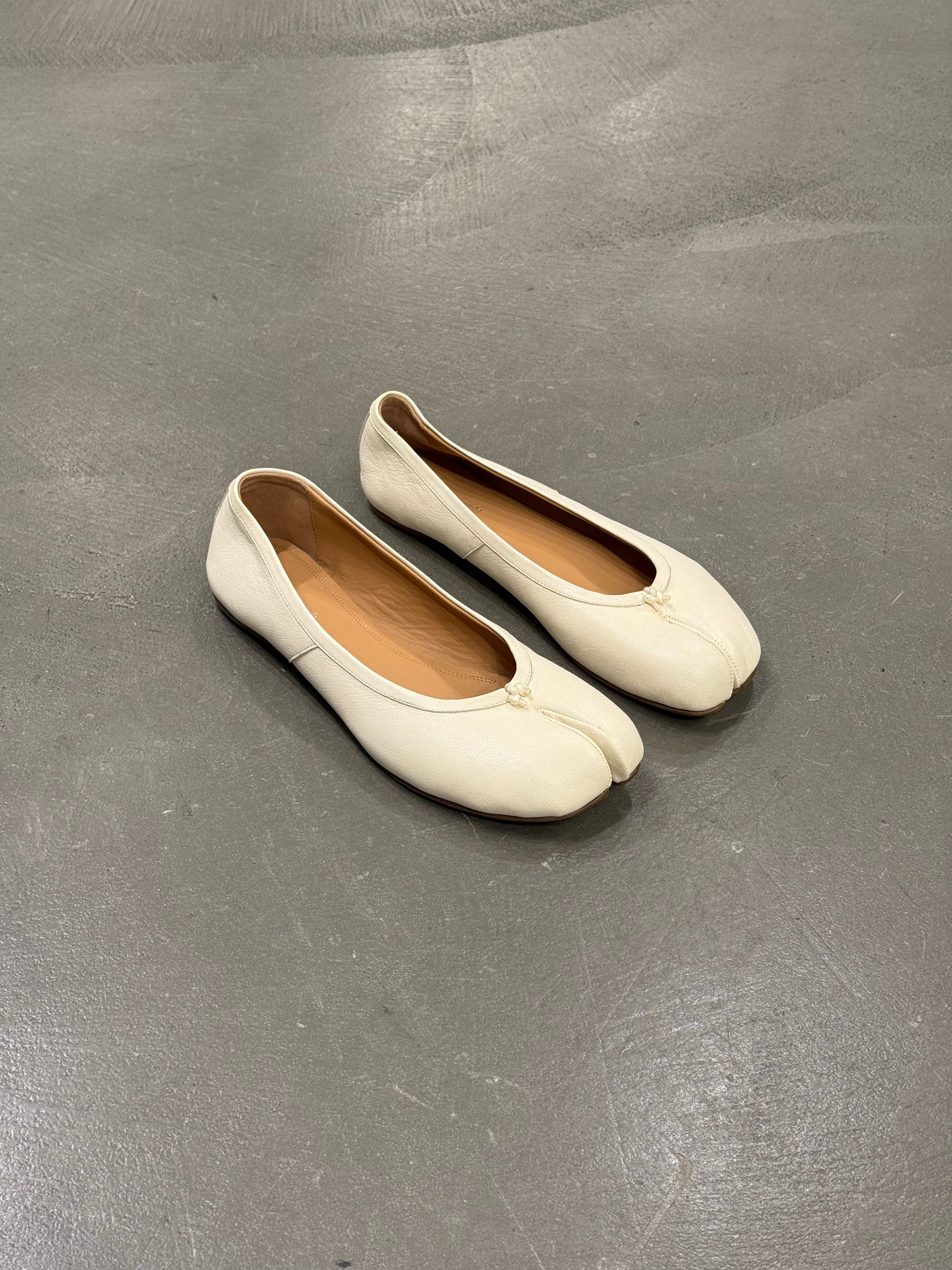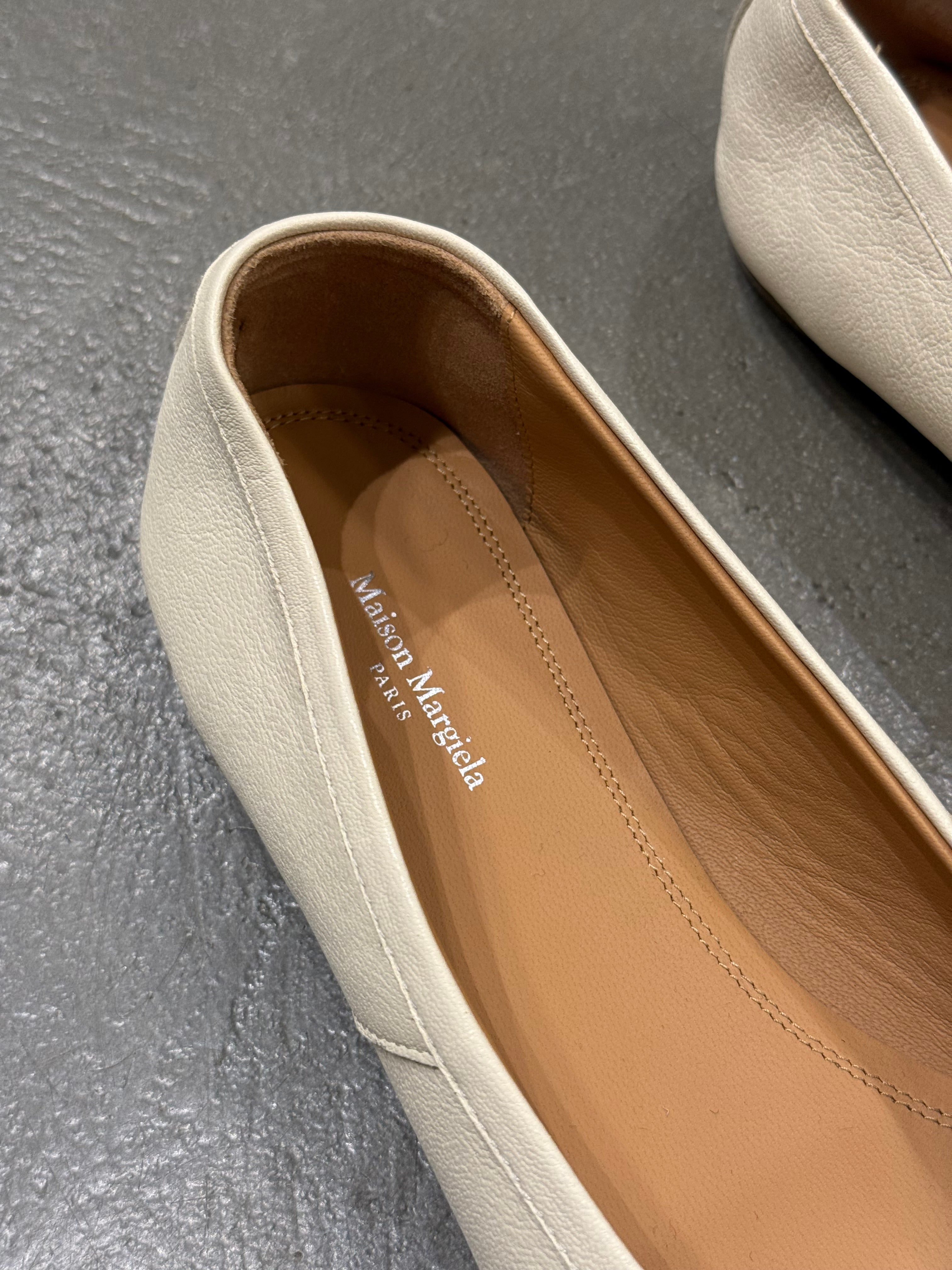 These Maison Margiela ballerina flats embody the label’s avant-garde approach with the signature tabi split-toe silhouette. Crafted in supple cream-white leather, they feature a minimal rounded shape with a subtle bow detail, combining comfort with conceptual design. A refined and versatile staple that can seamlessly elevate both casual and sophisticated looks.
