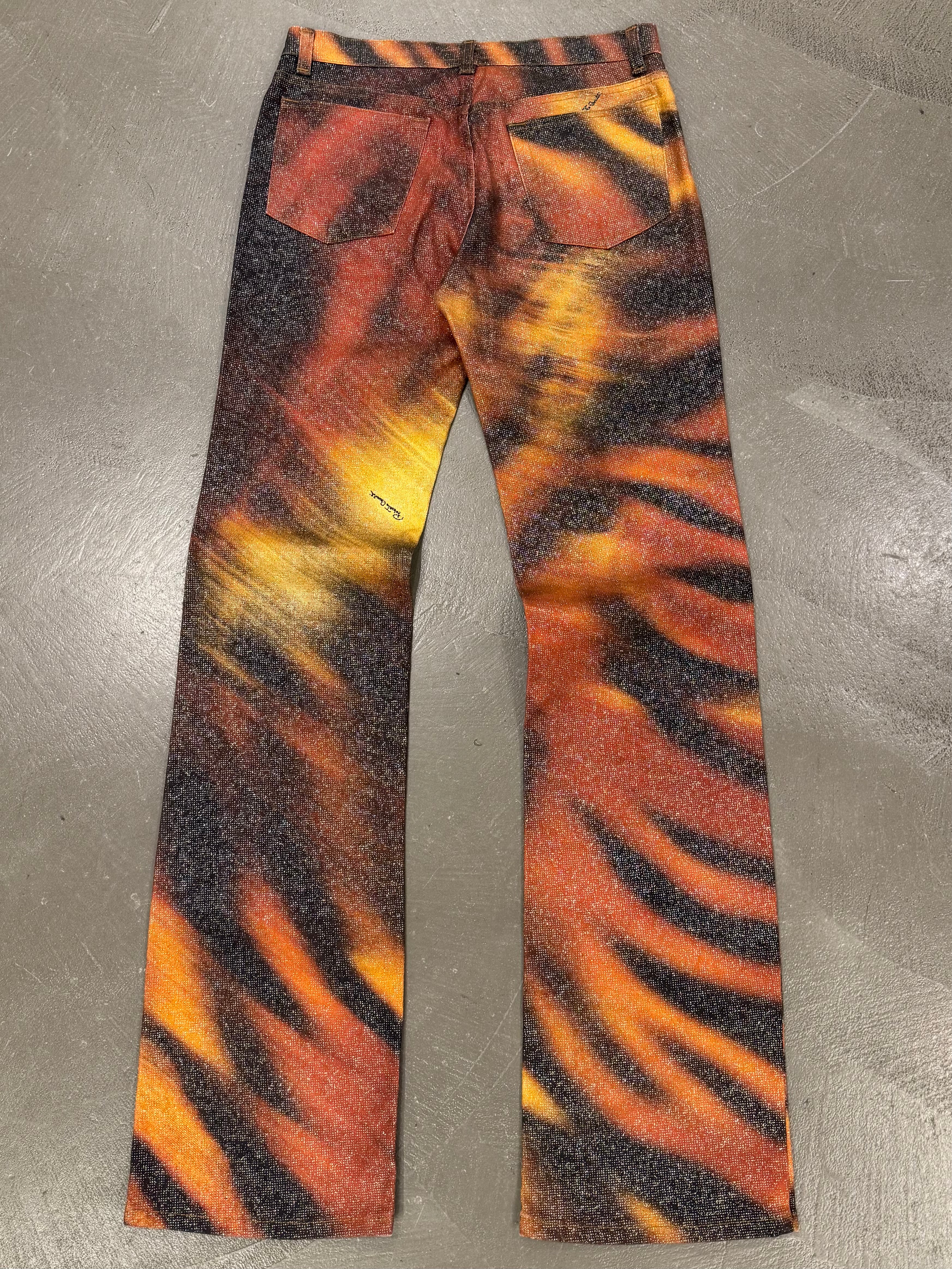 These Roberto Cavalli pants from 2000 feature a bold tiger print that captures the brand’s signature fascination with animal motifs. Designed with a straight yet elongated silhouette, they are a statement piece from Cavalli’s early-2000s era.