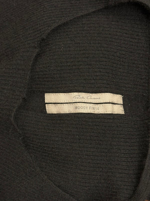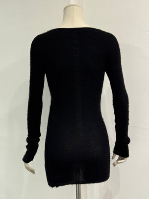 This Rick Owens knit from the Autumn/Winter 2014 collection embodies the designer’s dark, grunge-inspired aesthetic. Crafted in soft black wool, it features a slim elongated fit with raw distressed hems and cuffs, adding to its deconstructed look. With its minimalist yet subversive design, this piece perfectly reflects Rick Owens’ moody vision of luxury basics.