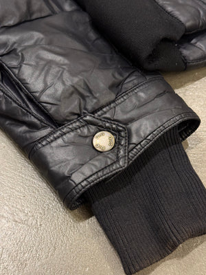 This Dolce & Gabbana jacket from the 2000s fuses moto-inspired detailing with utilitarian outerwear design. Crafted from durable black nylon with a padded structure, it features ribbed panels on the shoulders and front, zippered side pockets, and a high snap-button collar. The jacket also includes a sleeve pocket and ribbed cuffs, emphasizing its functional yet stylish construction. A bold archival piece reflecting the brand’s early 2000s experimentation with futuristic aesthetics.