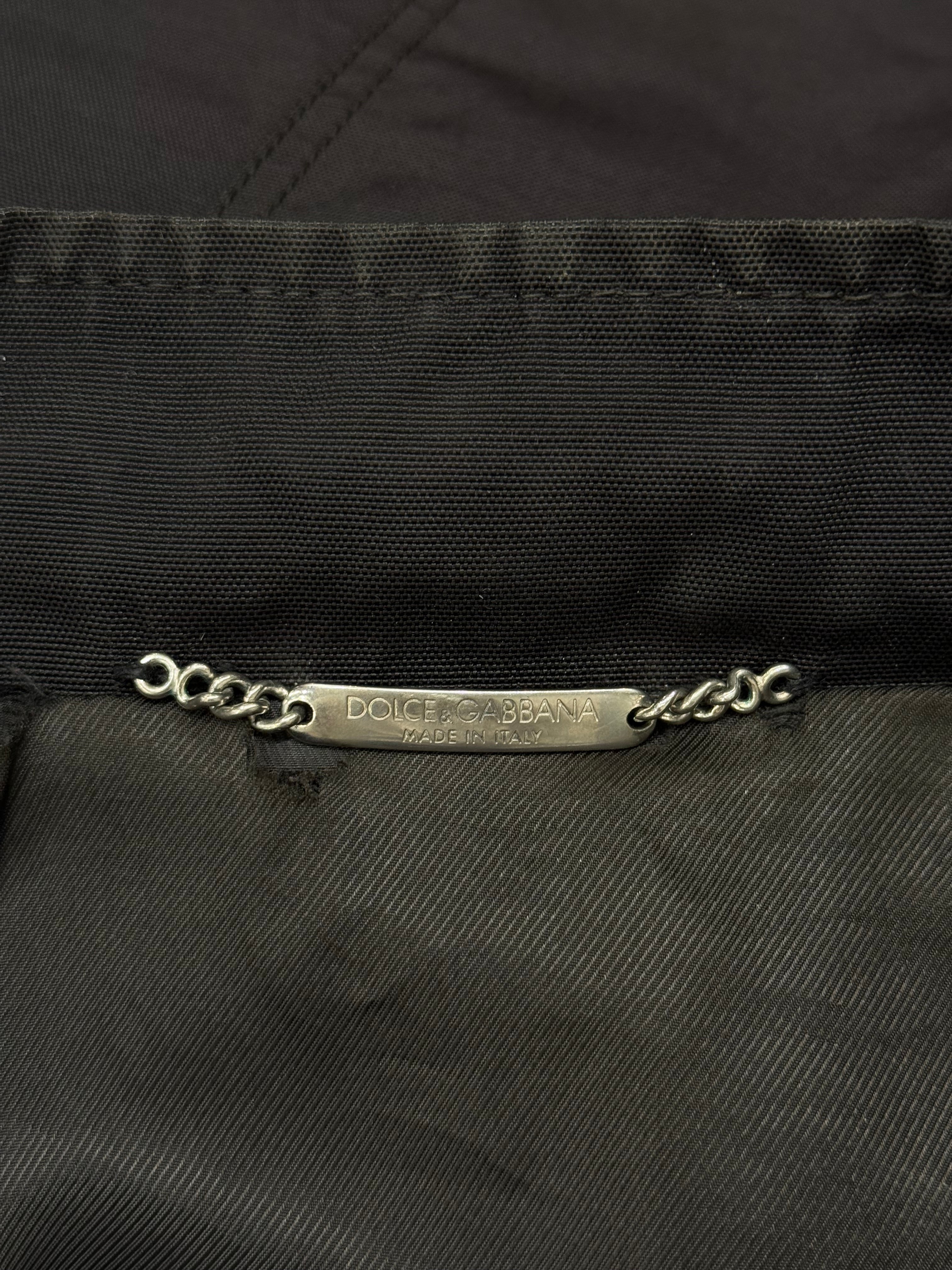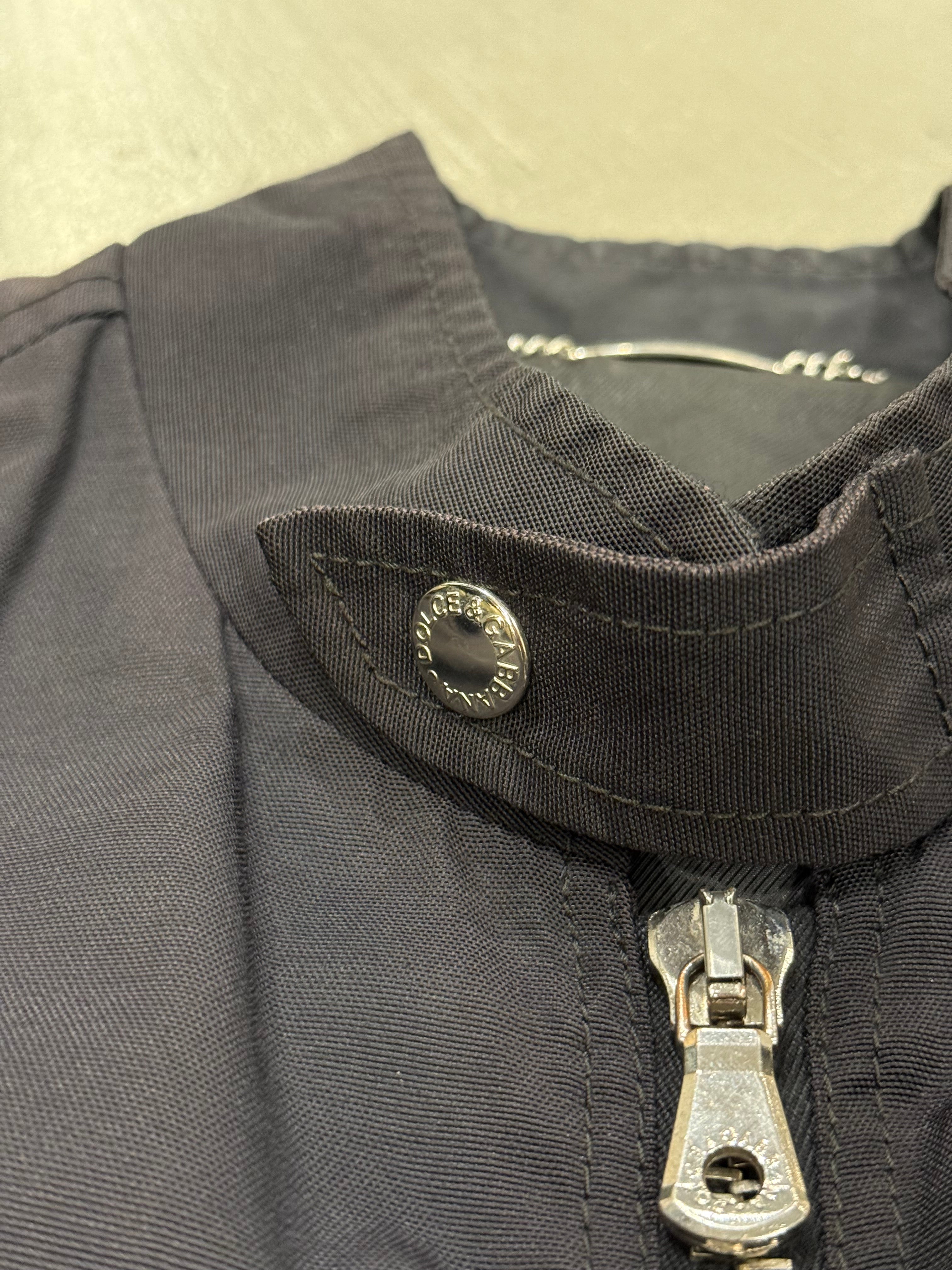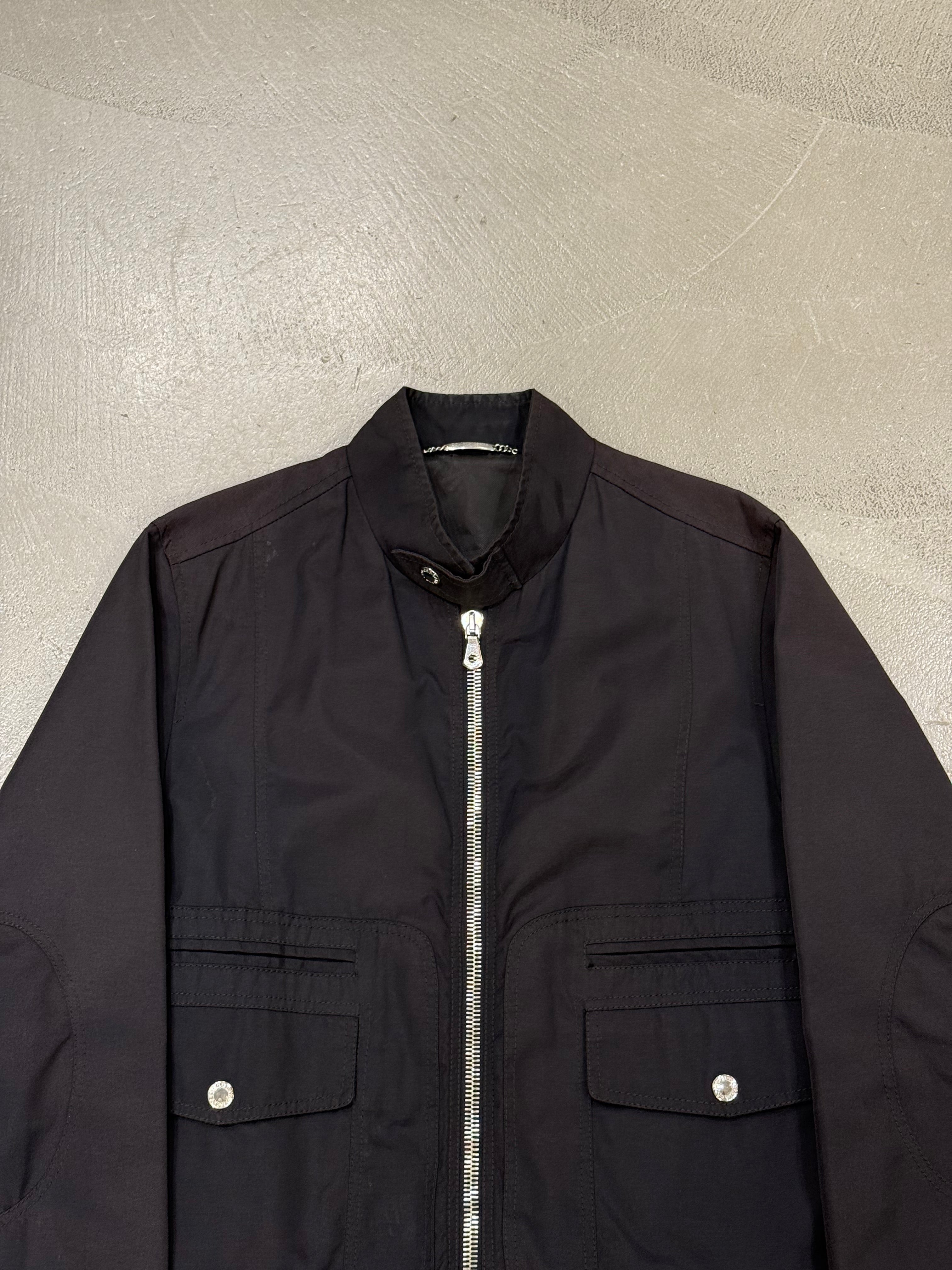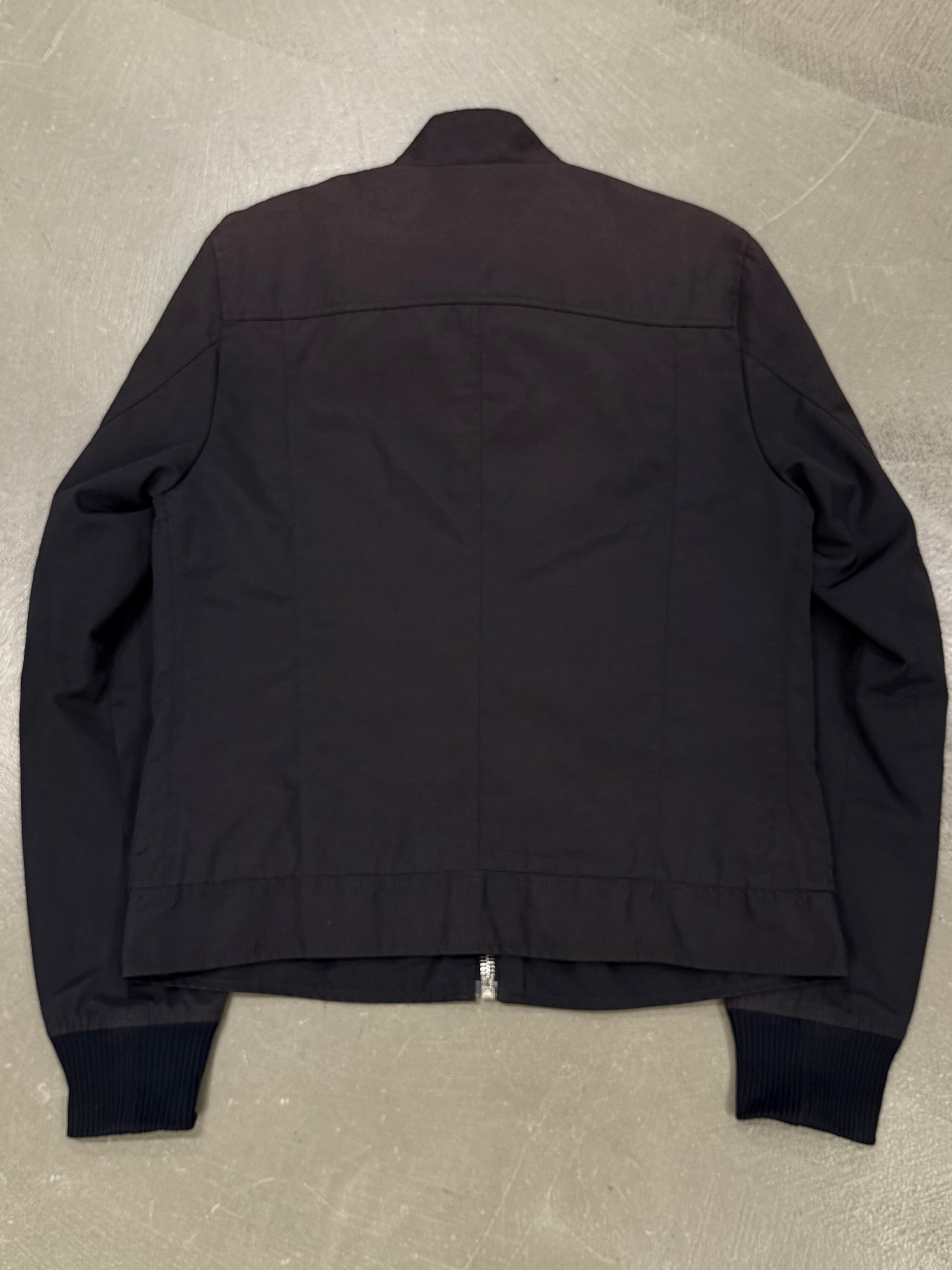 Technical bomber jacket from the early 2000s with utilitarian front pockets and a cropped silhouette. Features ribbed cuffs and hem, zip closure, and a sleek nylon shell for a structured yet lightweight feel.