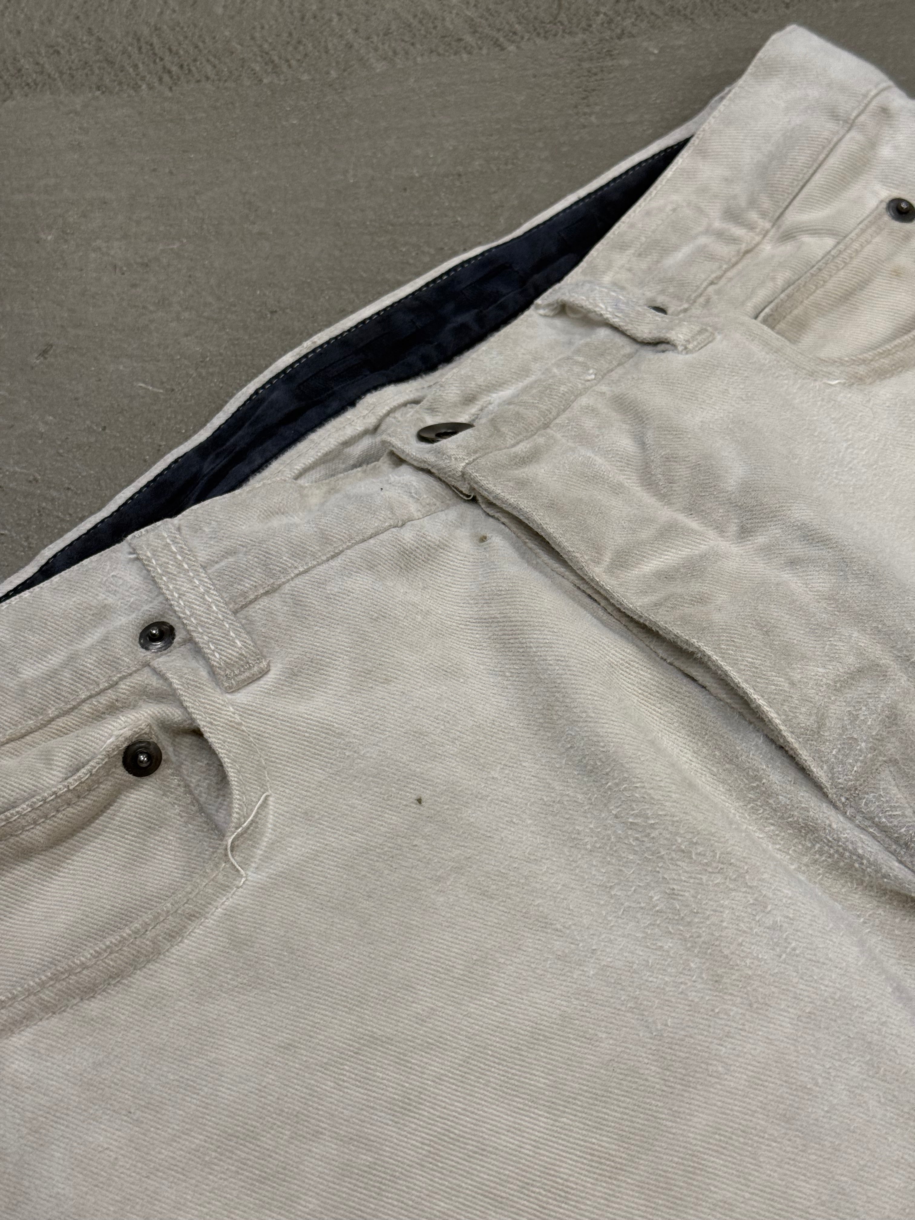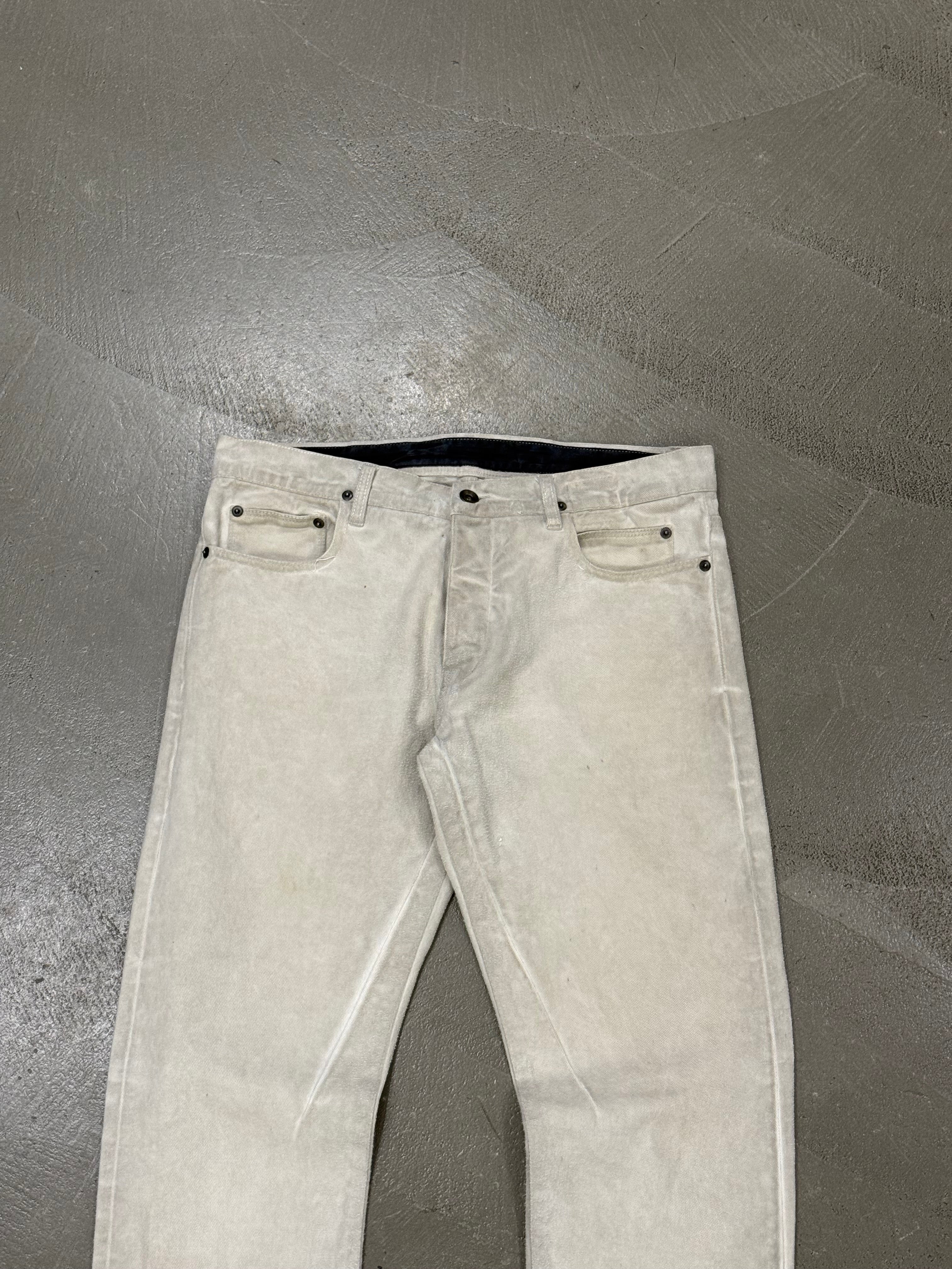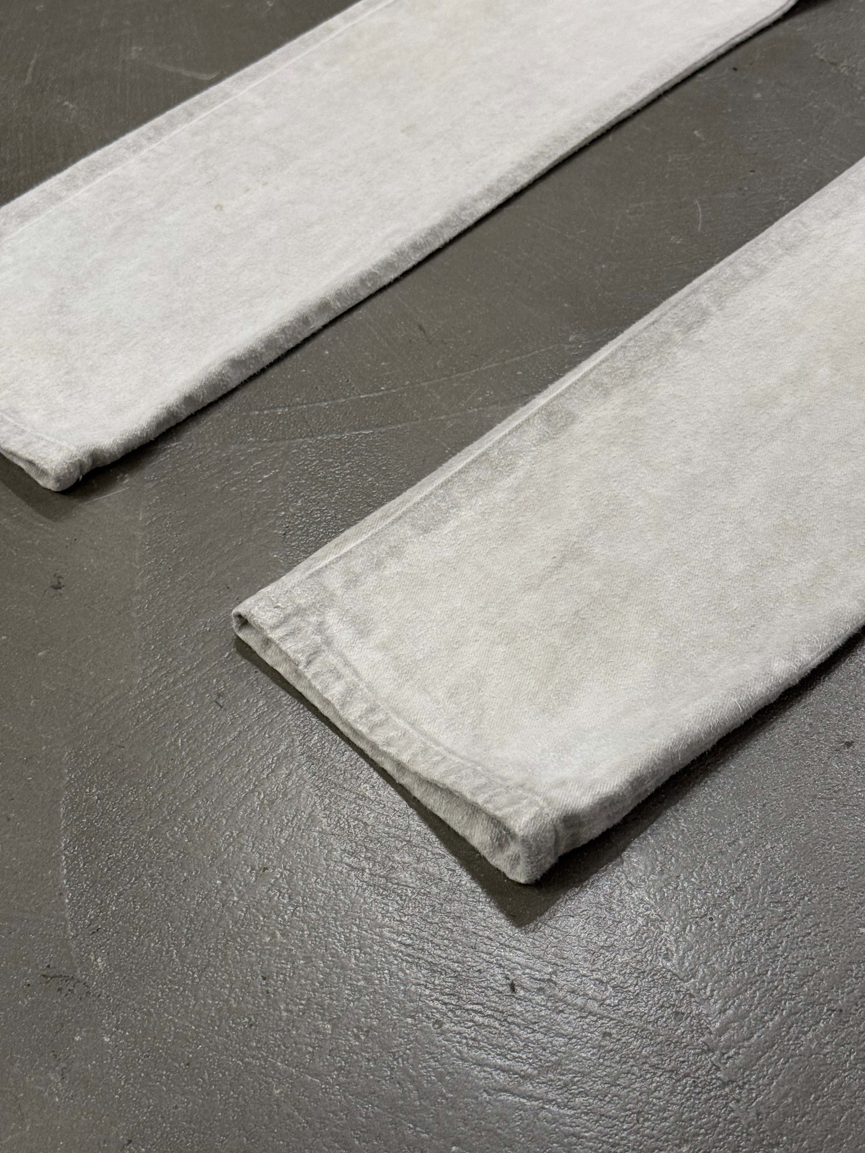 Iconic early-2000s Rick Owens jeans crafted from thick moleskin cotton fabric. Feature a straight cut with low rise, tonal stitching, and subtle panel construction. A rare example of Owens’ early exploration of structure and material depth.