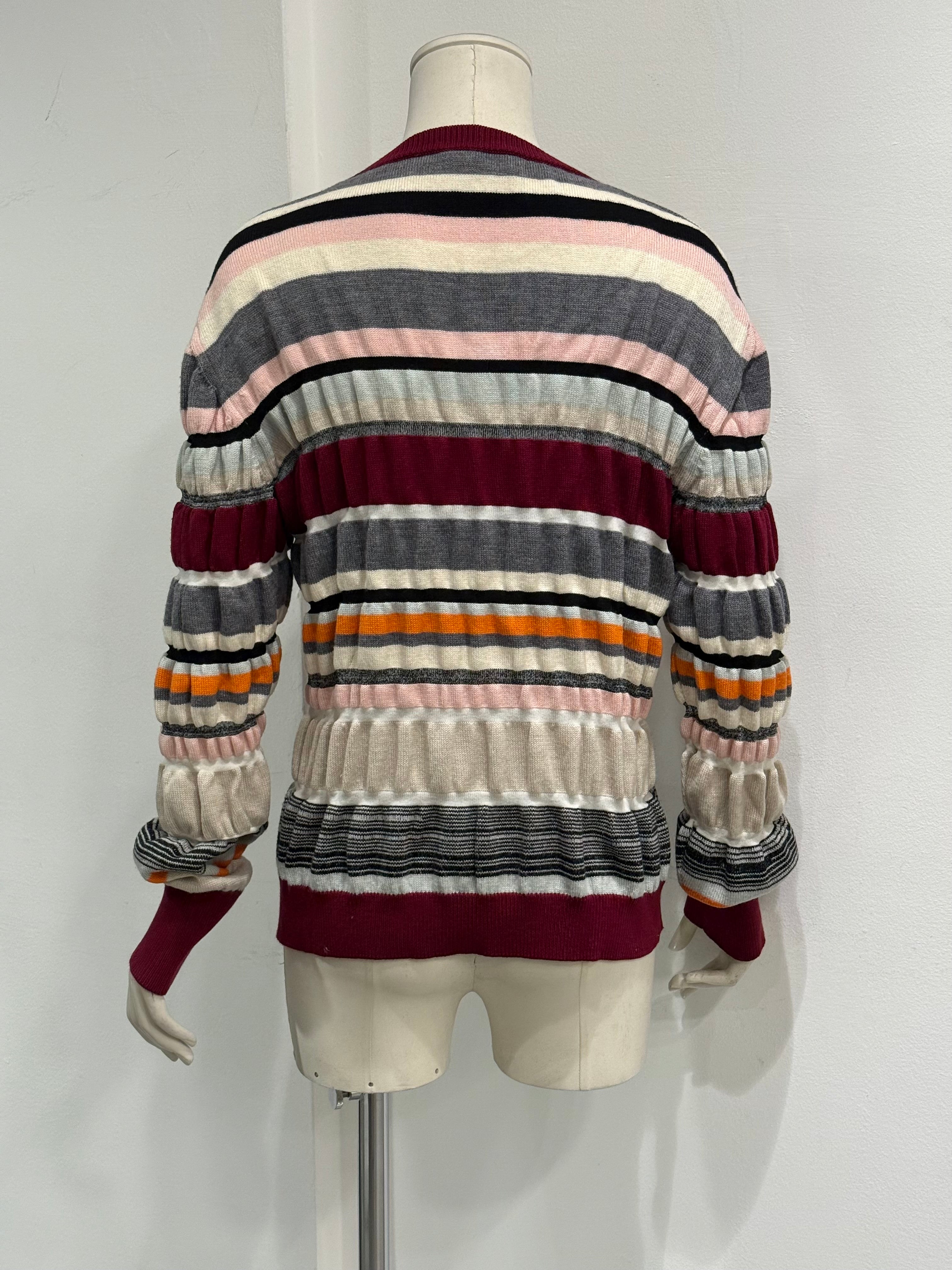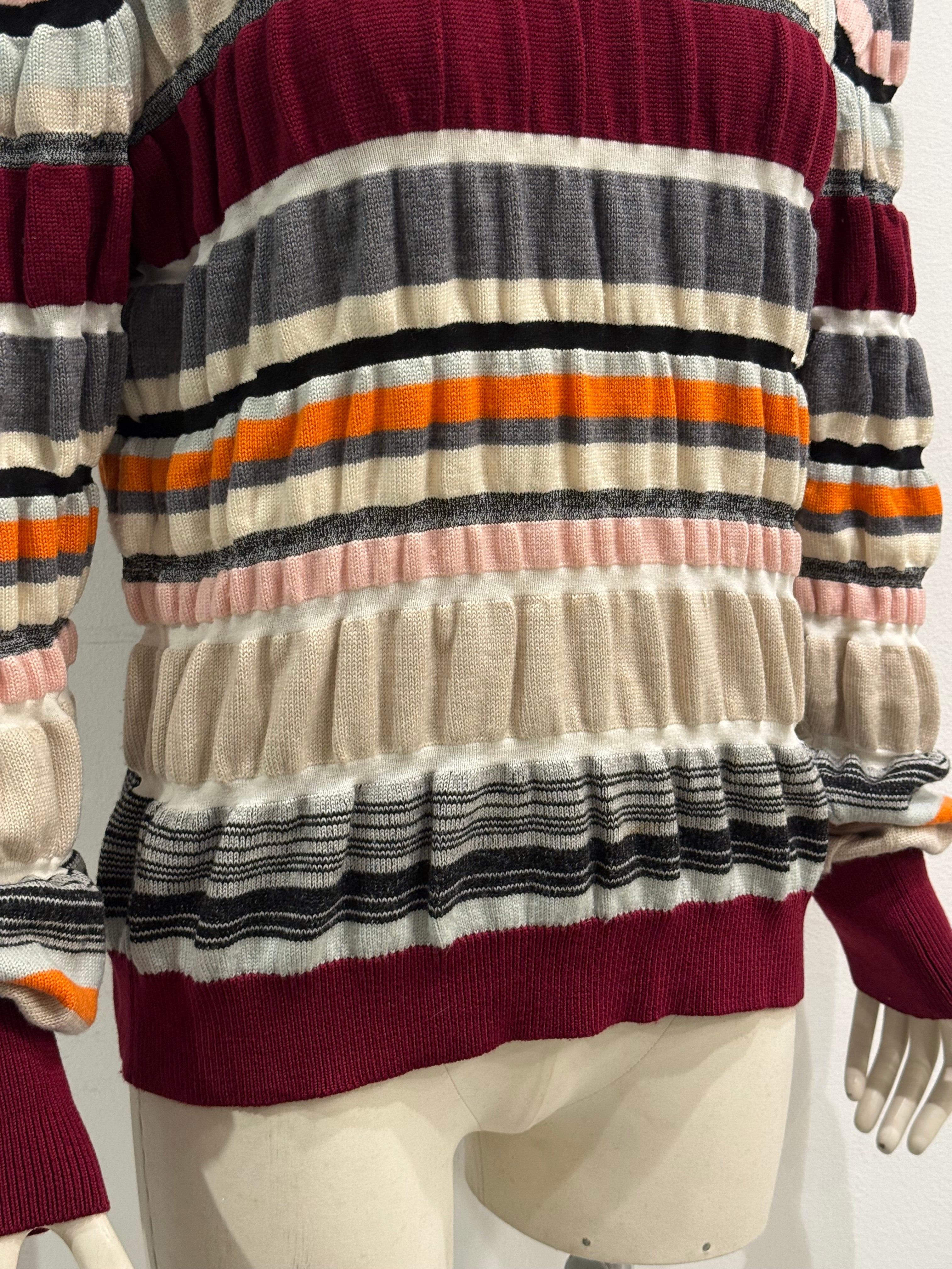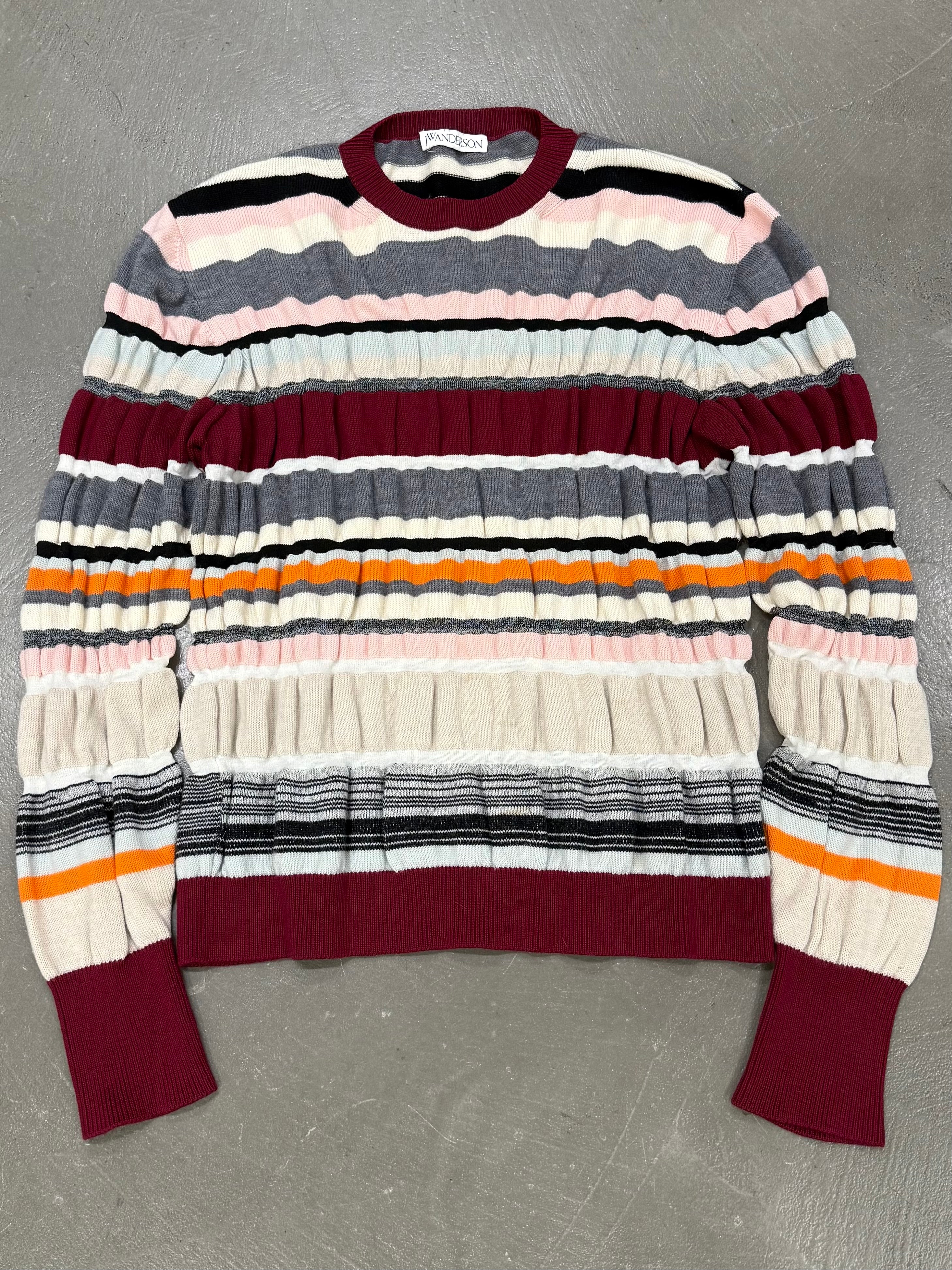 Colorful striped wool sweater by JW Anderson, showcasing the brand’s playful approach to texture and proportion. Features elongated sleeves, ribbed cuffs, and a relaxed silhouette in soft wool knit.