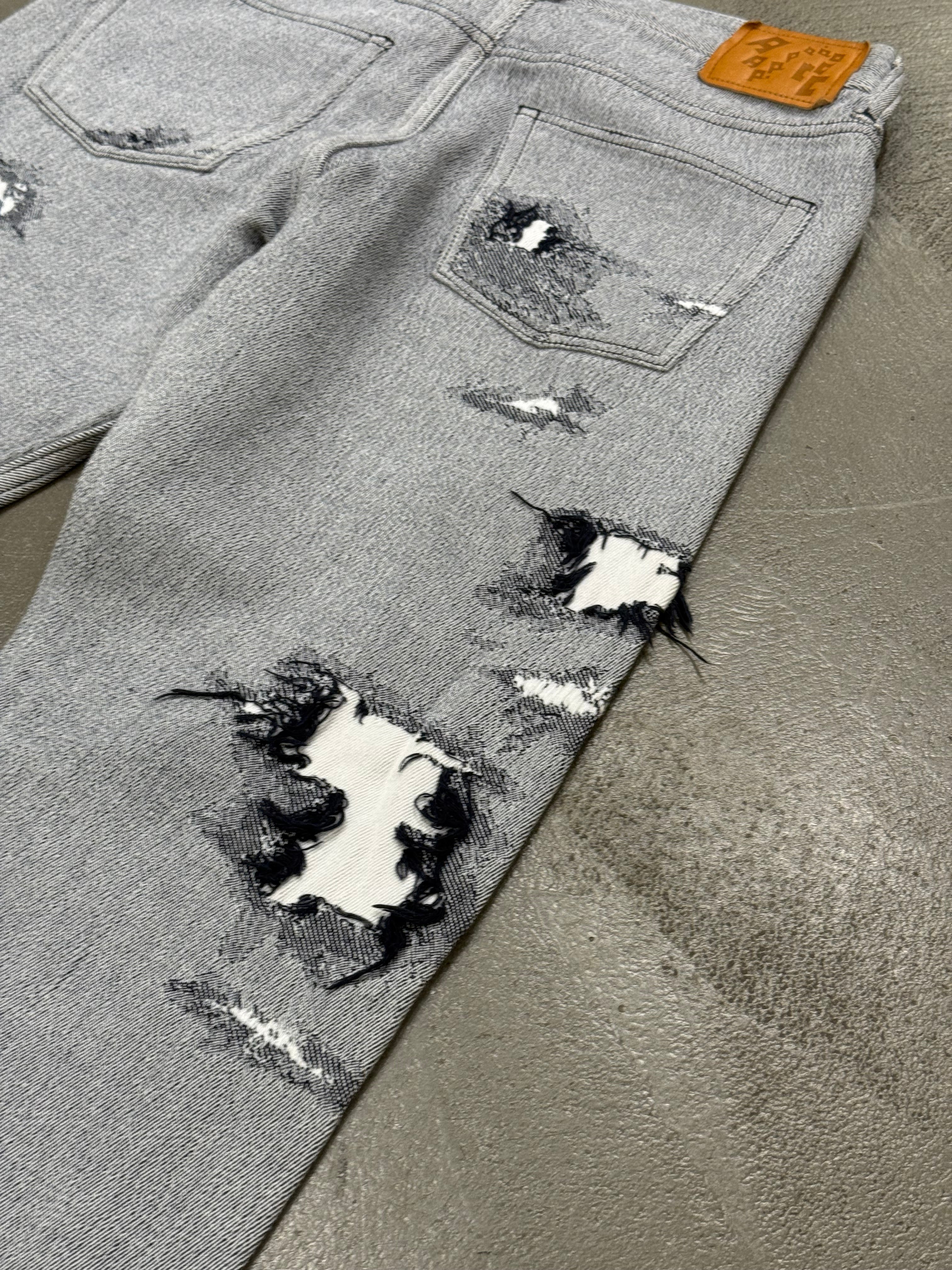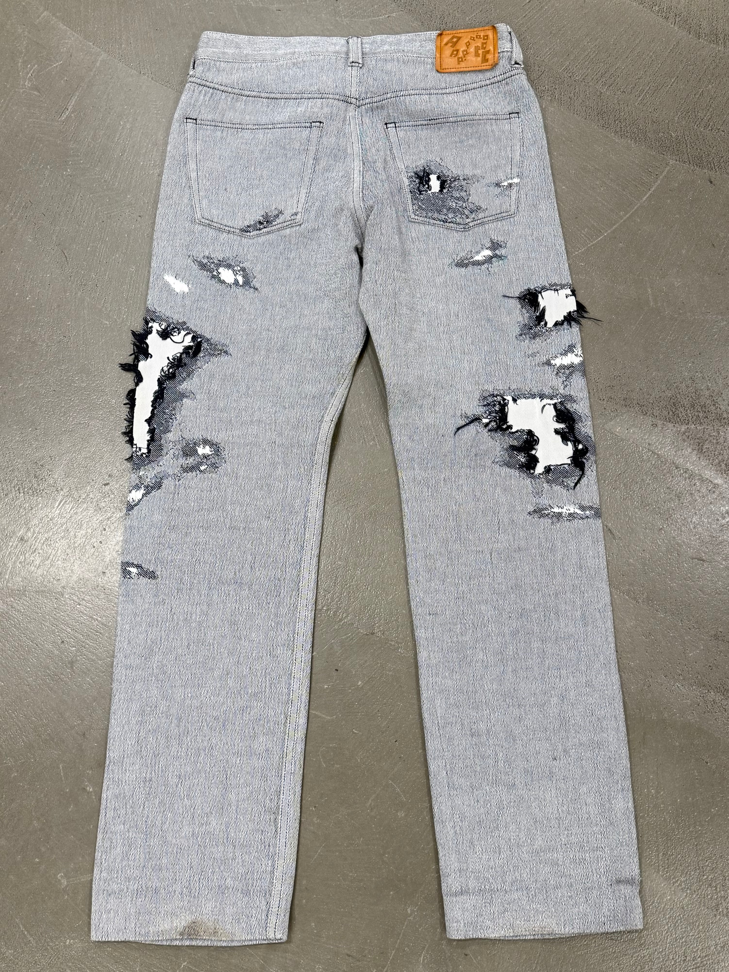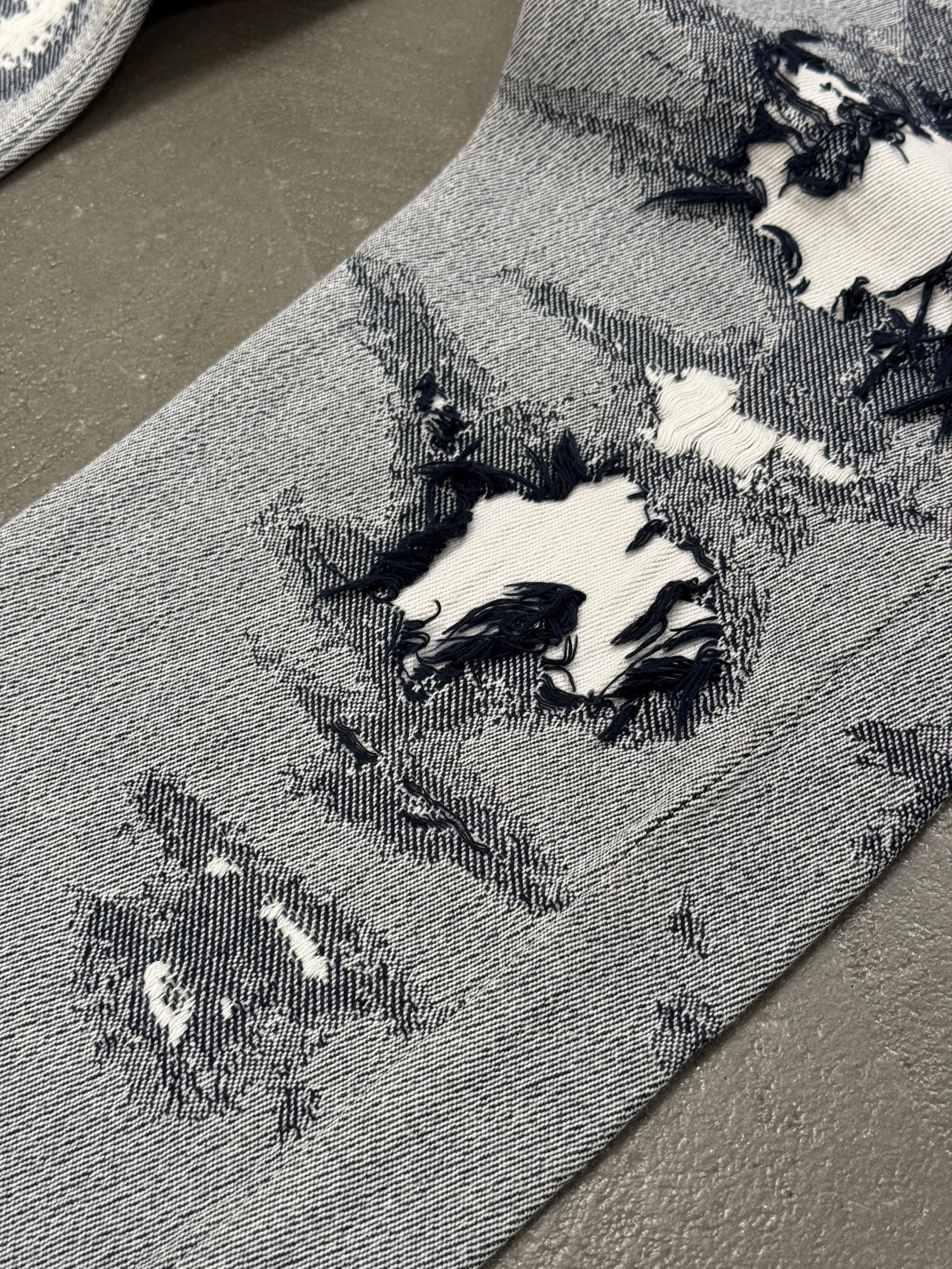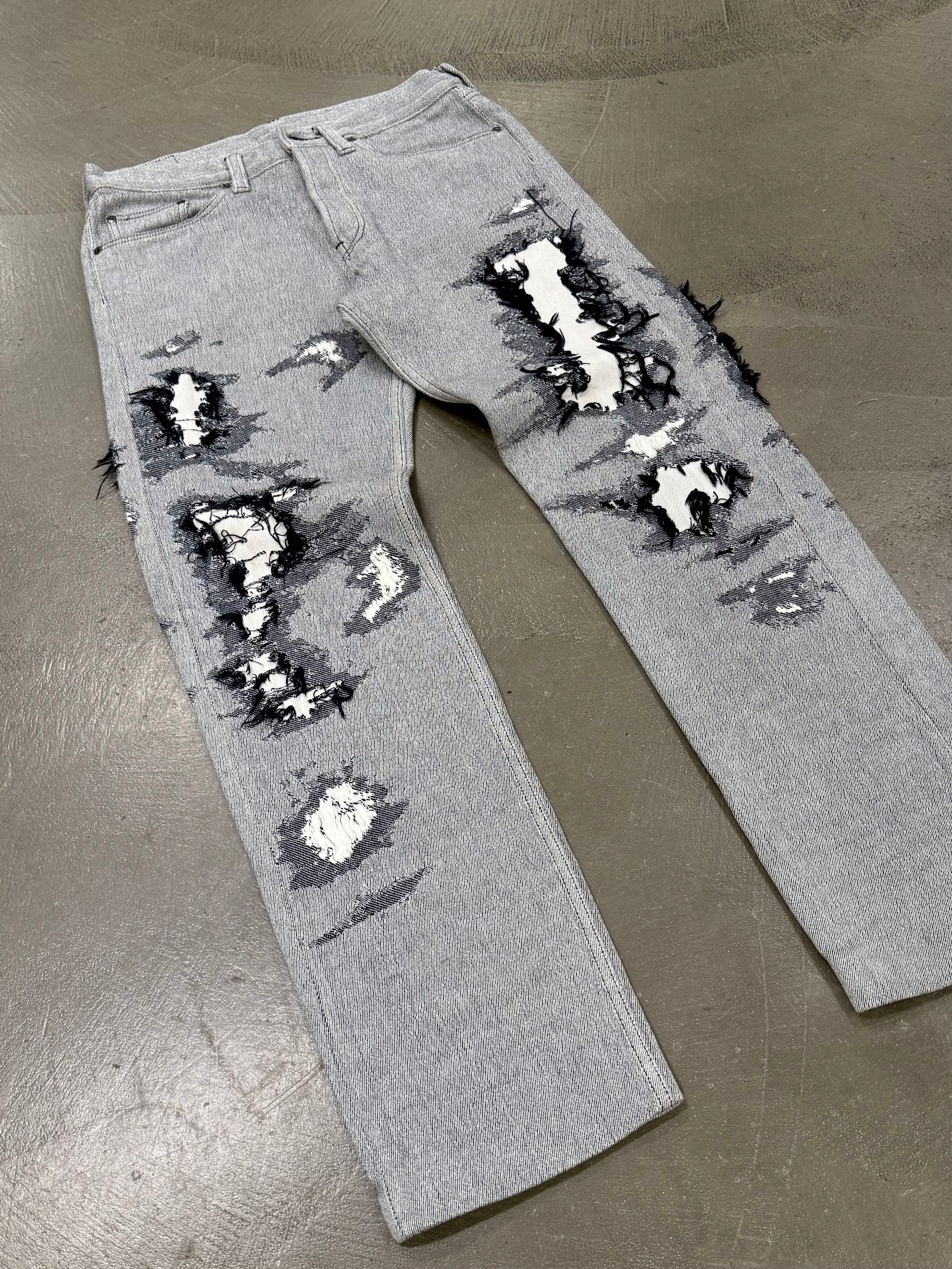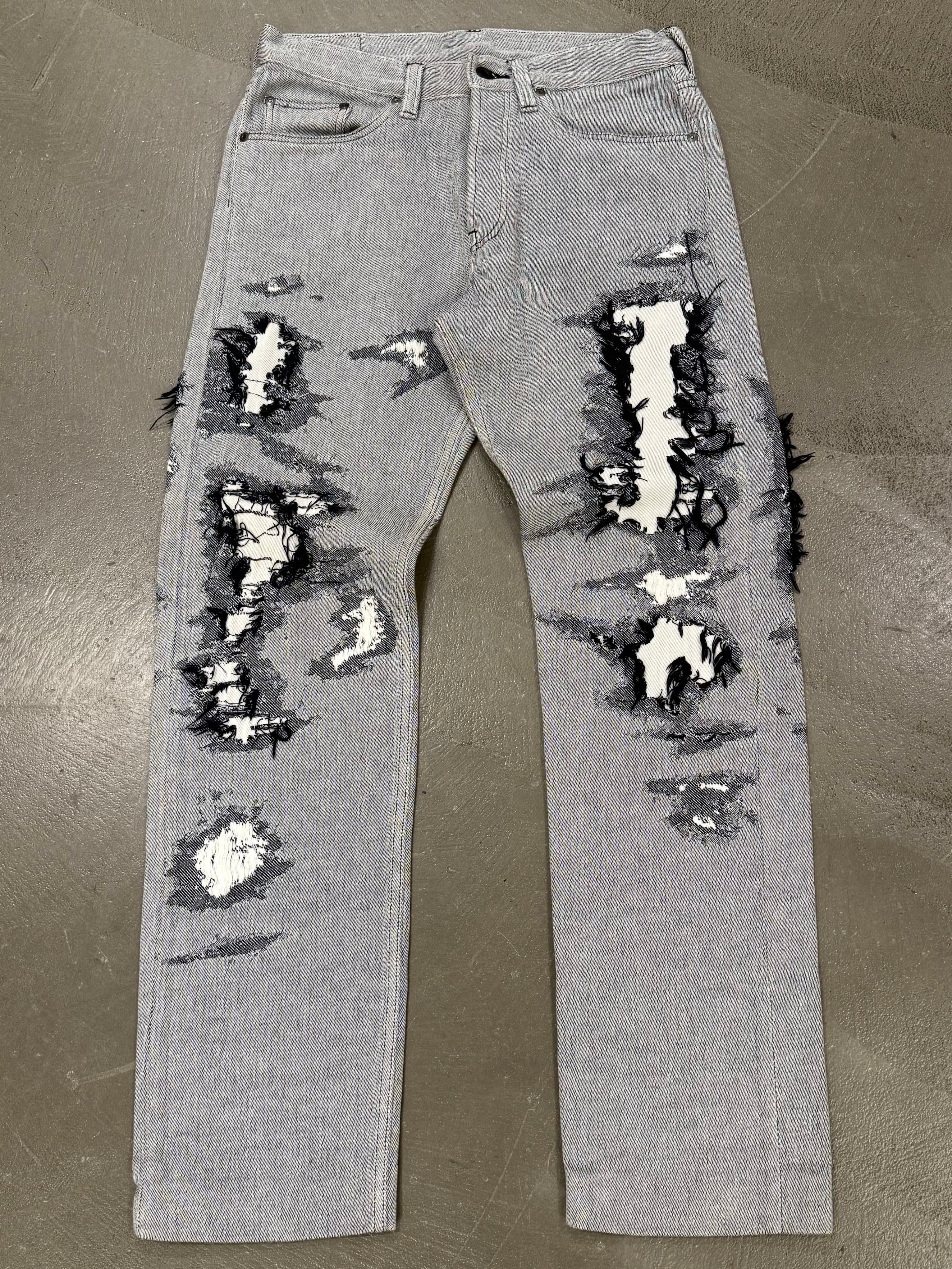 These 2000s Issey Miyake A-POC pants feature sculptural distressed openings and signature textile experimentation. Built from innovative cotton jersey, they demonstrate Miyake’s approach to form, texture, and modular clothing construction.