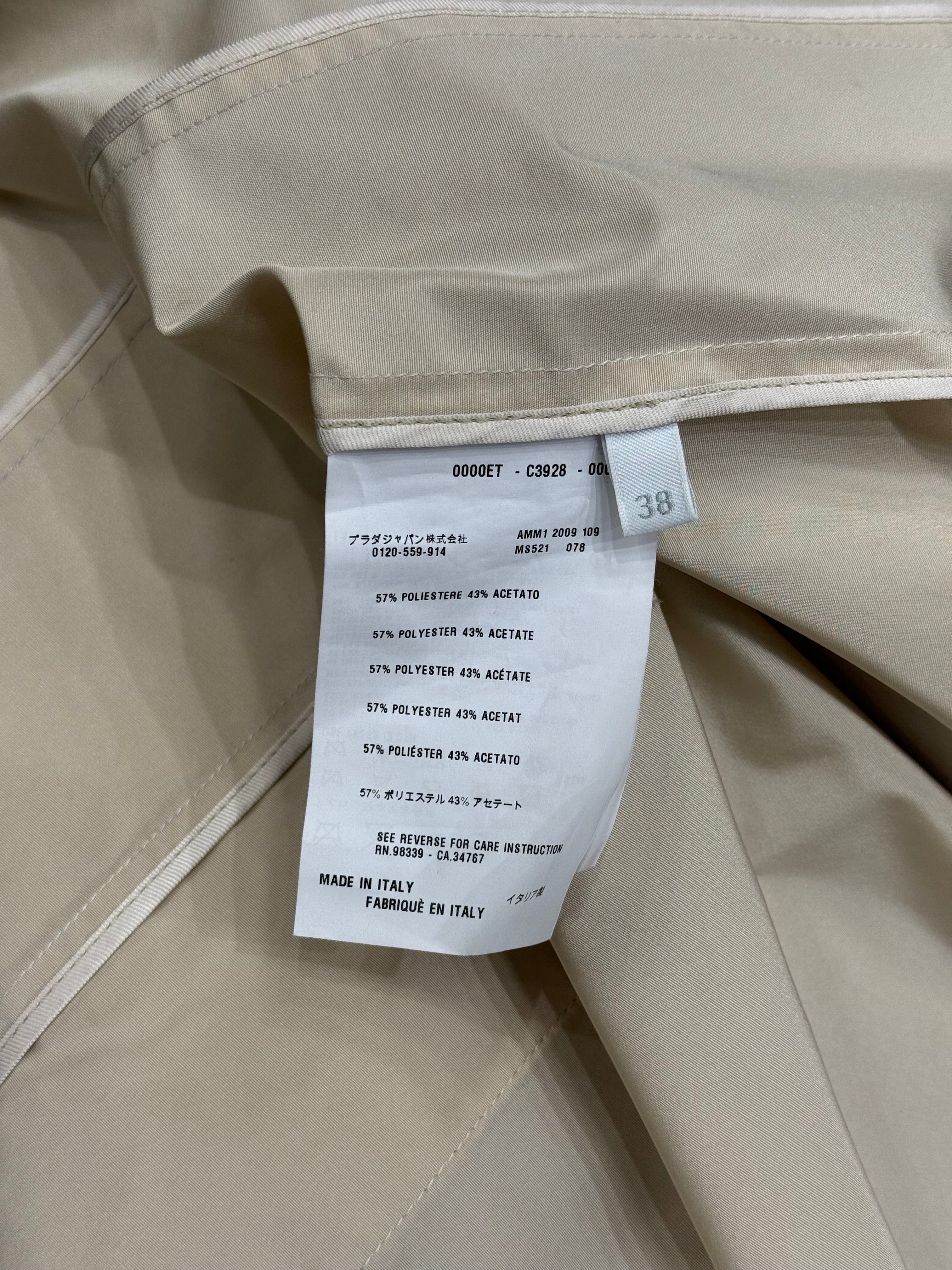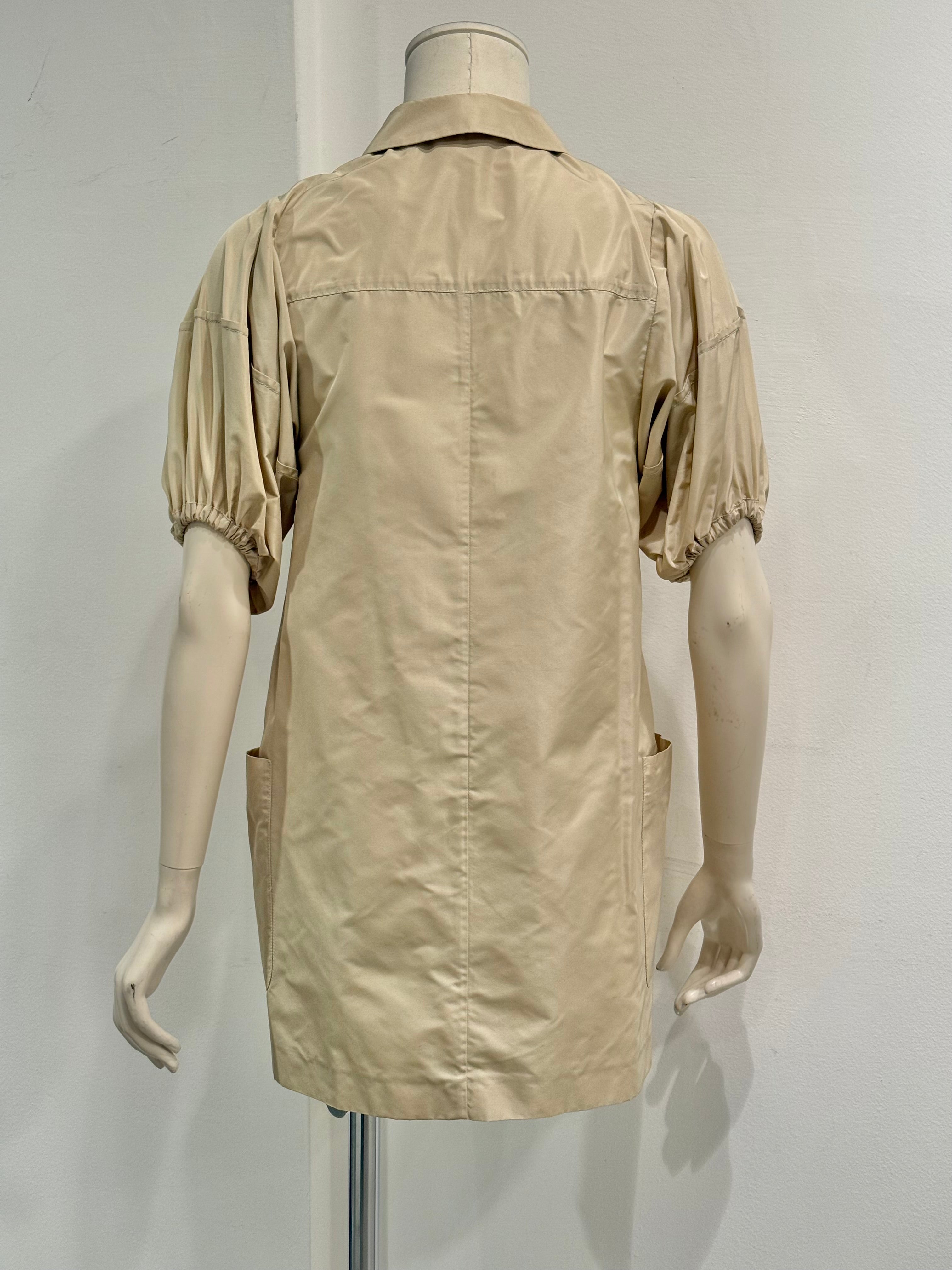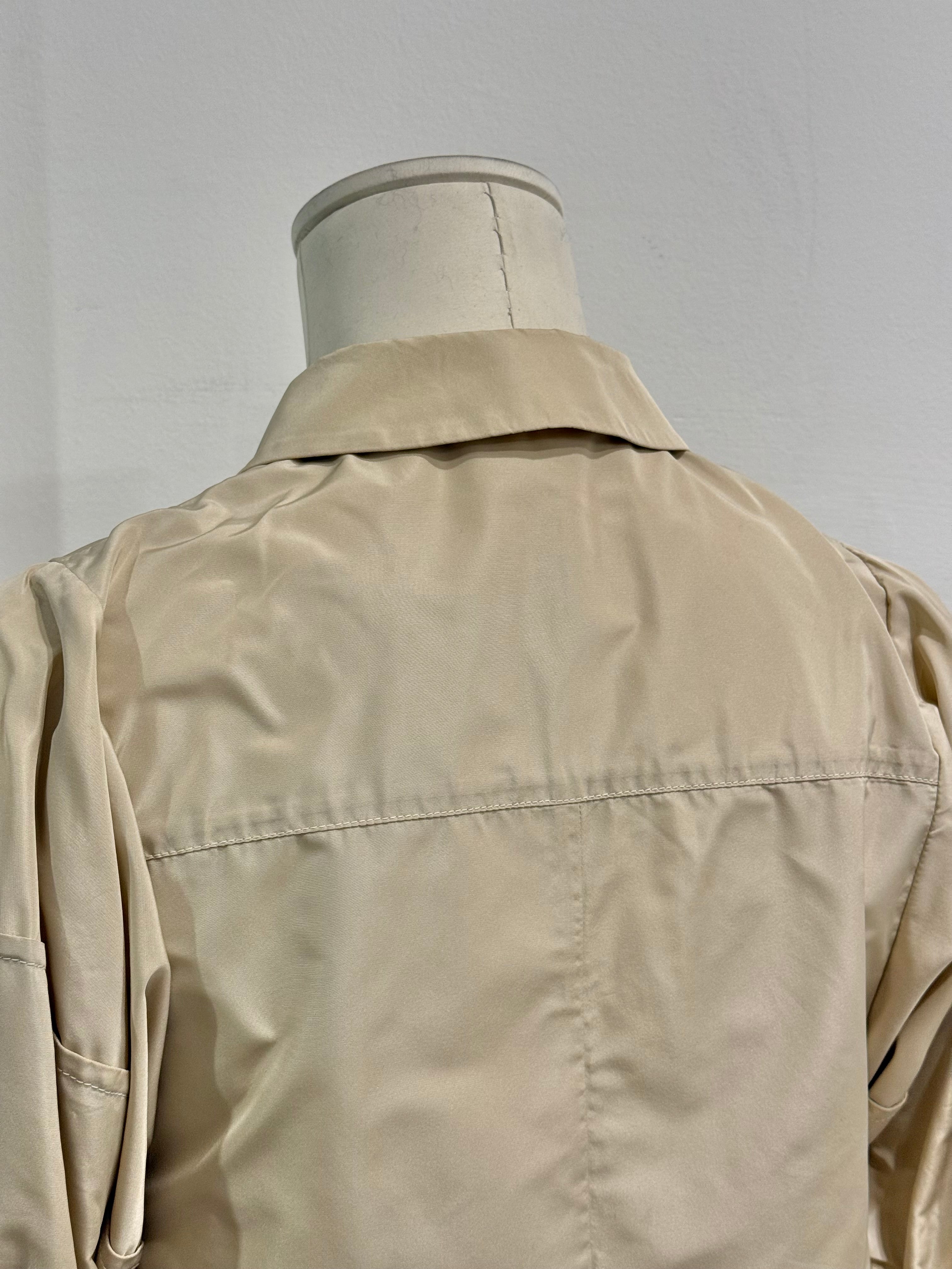 Playful Spring/Summer 2009 Miu Miu jacket crafted from light beige nylon. Features exaggerated balloon sleeves, a structured short silhouette, and front button closure. A striking example of Miuccia Prada’s experimental approach to proportion and feminine utility.