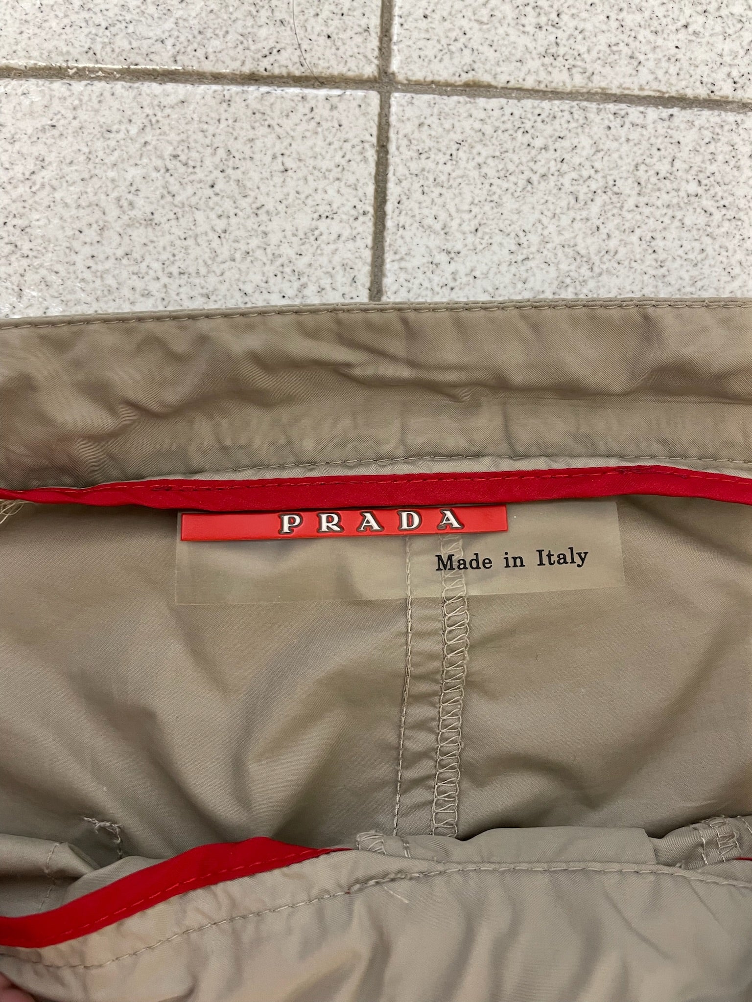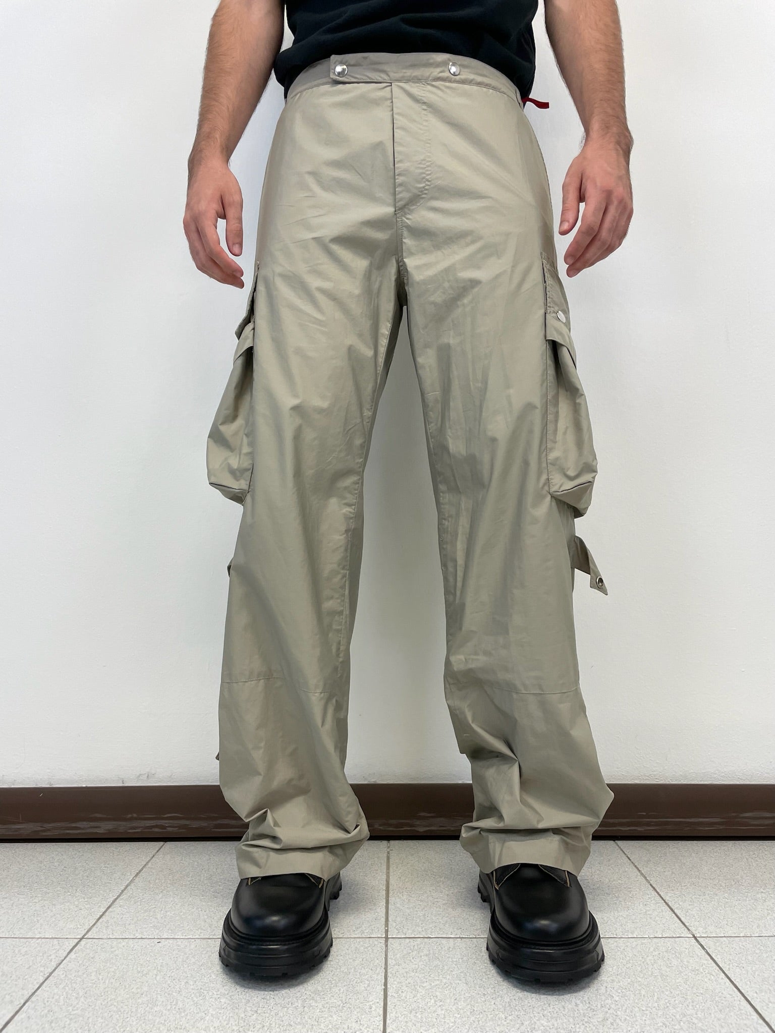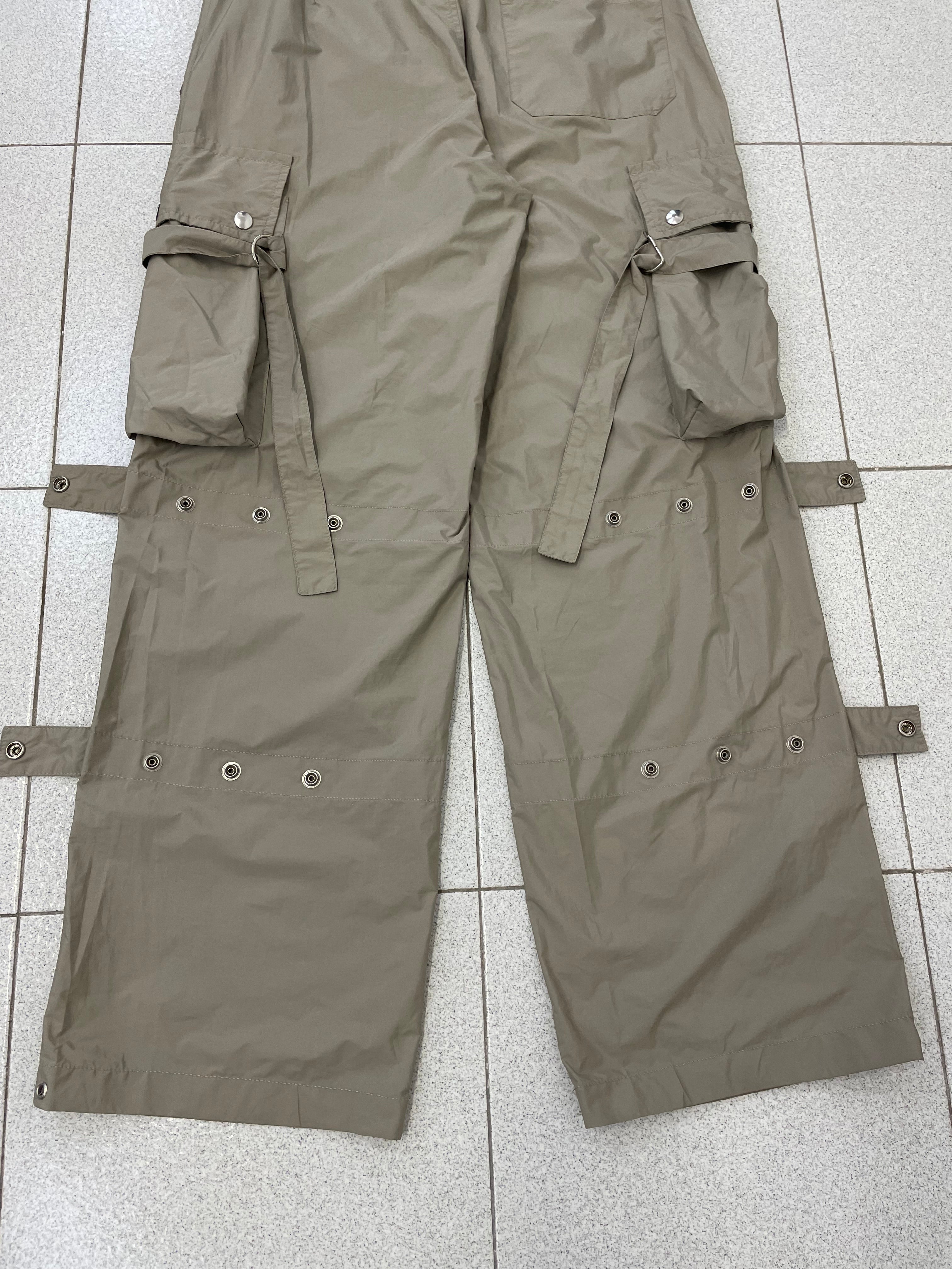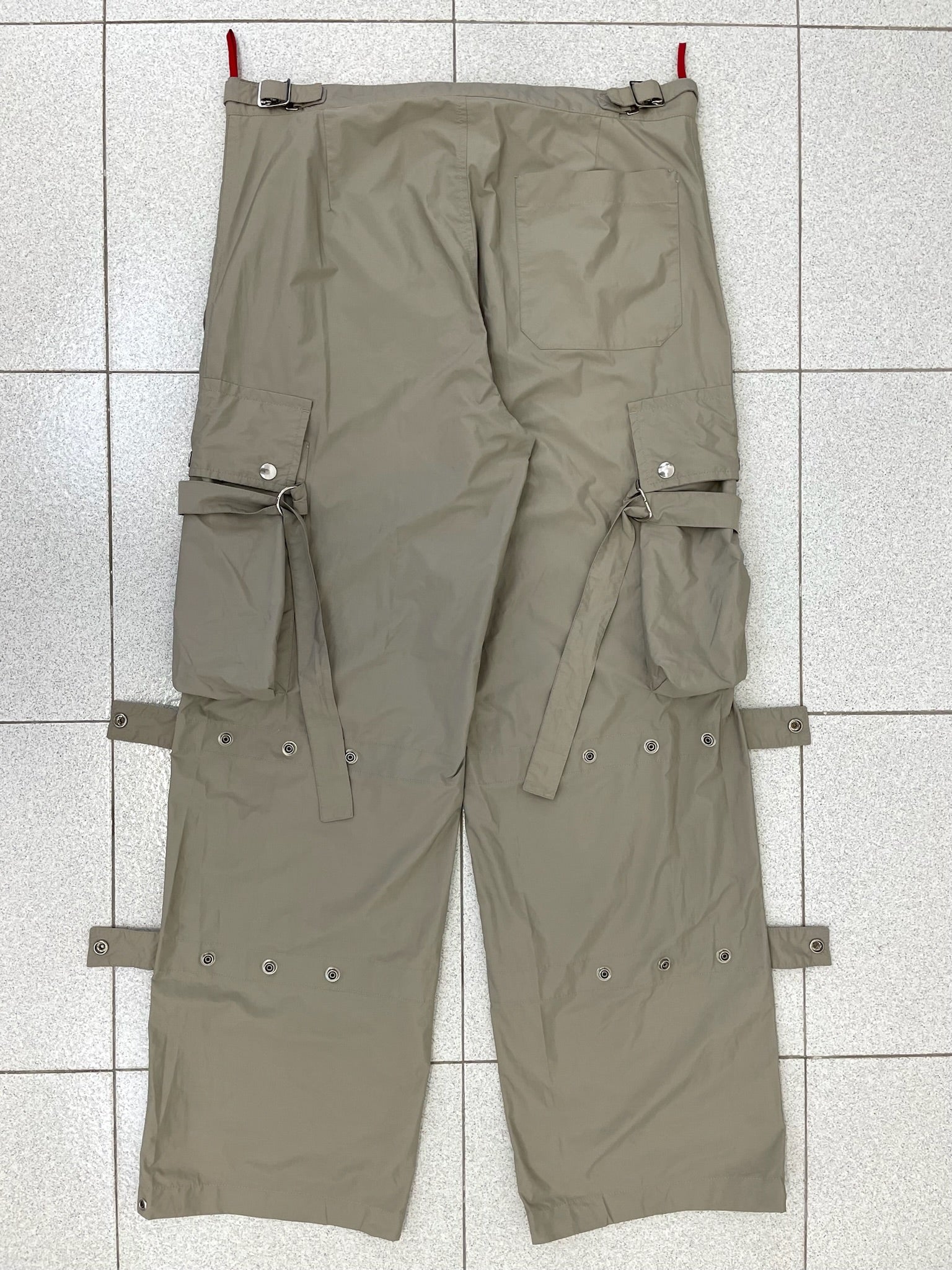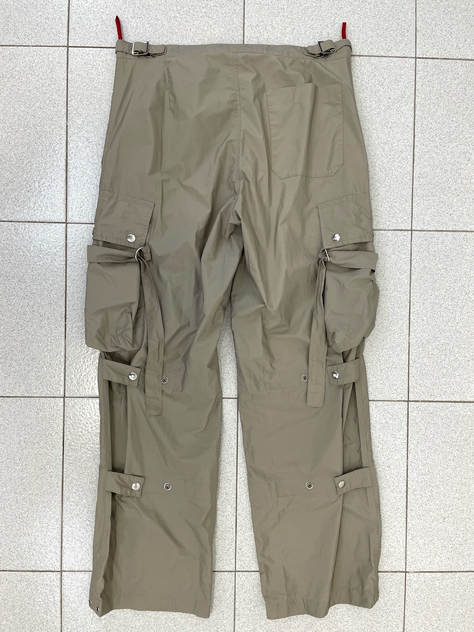 One of the rarest and most sought after Prada pants, and one of the most copied design ever. Realized the same year of the Helmut lang version, a true masterpiece years ahead of his time. insanely beautiful bondage straps on the pockets with adjustable metallic hook. Additional straps on the leg that you can use to adjust the dimension of the leg. Oversized baggy fit but you can adjust it to a straight fit, very easy to style.
