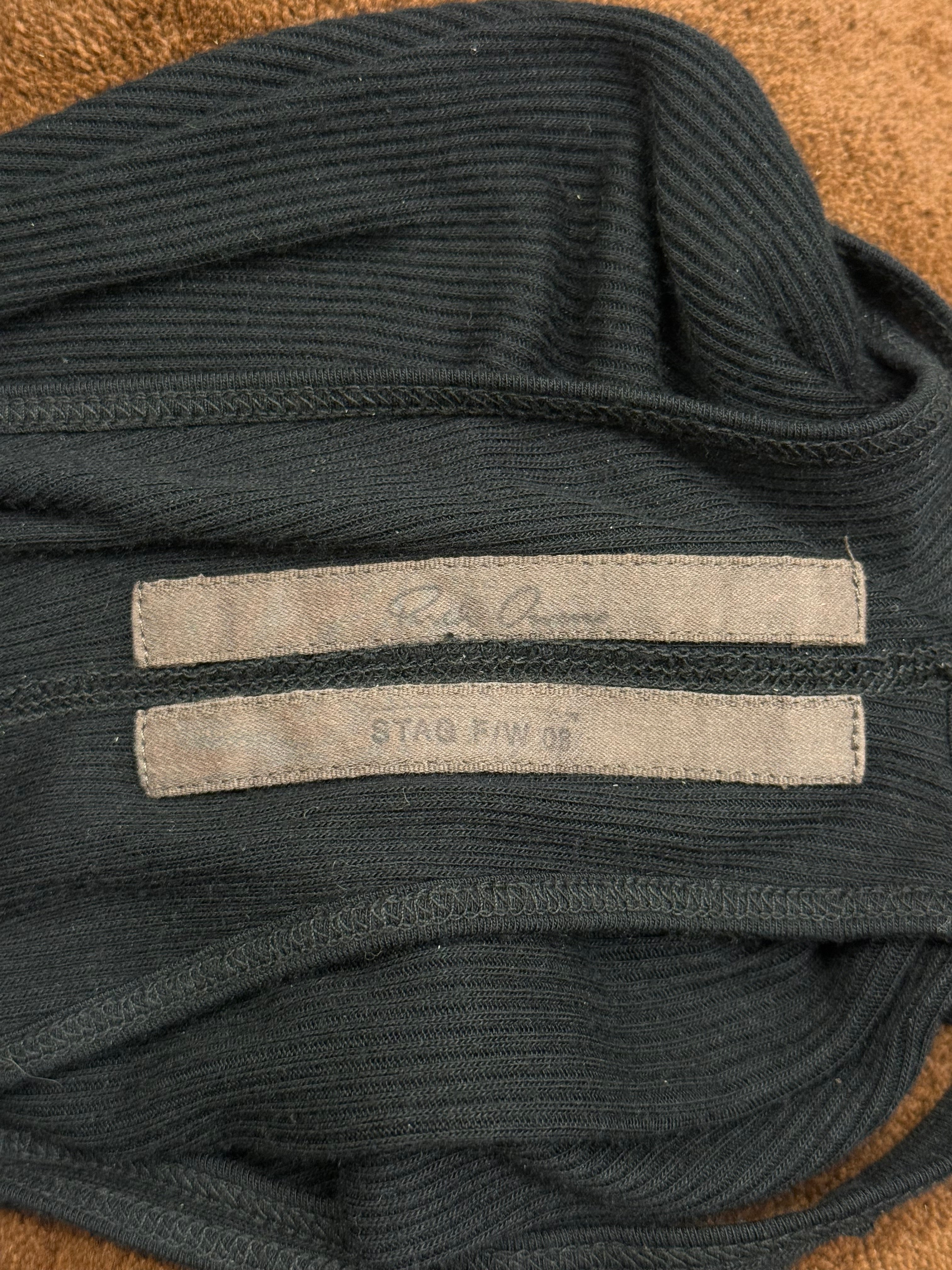 This Rick Owens dress from the Autumn/Winter 2008 "Stag" collection embodies the designer's signature sculptural minimalism. Crafted from ribbed knit, it features a racerback design, elongated silhouette, and a dramatic asymmetrical hem. The dress hugs the body with a fluid yet structured fit, offering both elegance and an edge of raw sensuality—an iconic example of Owens' archive.