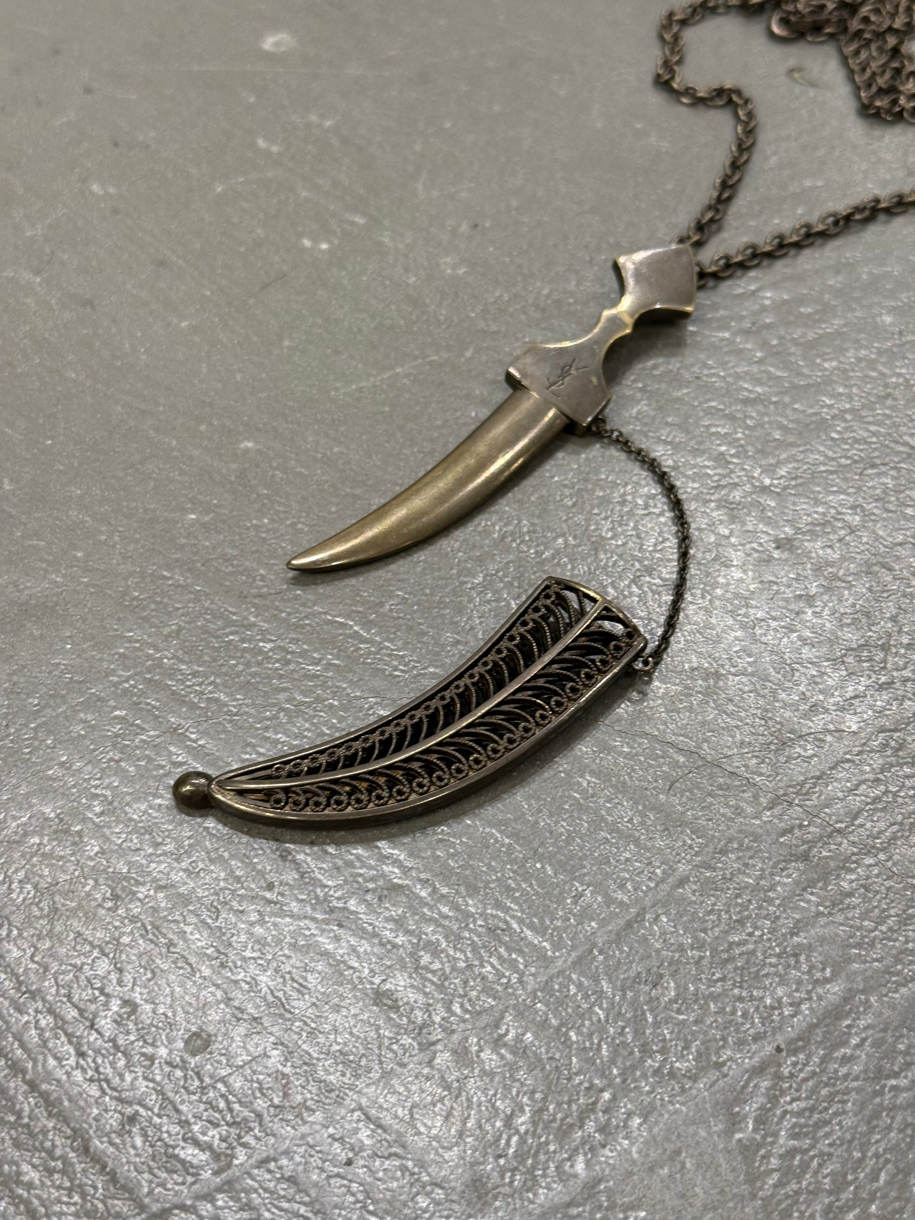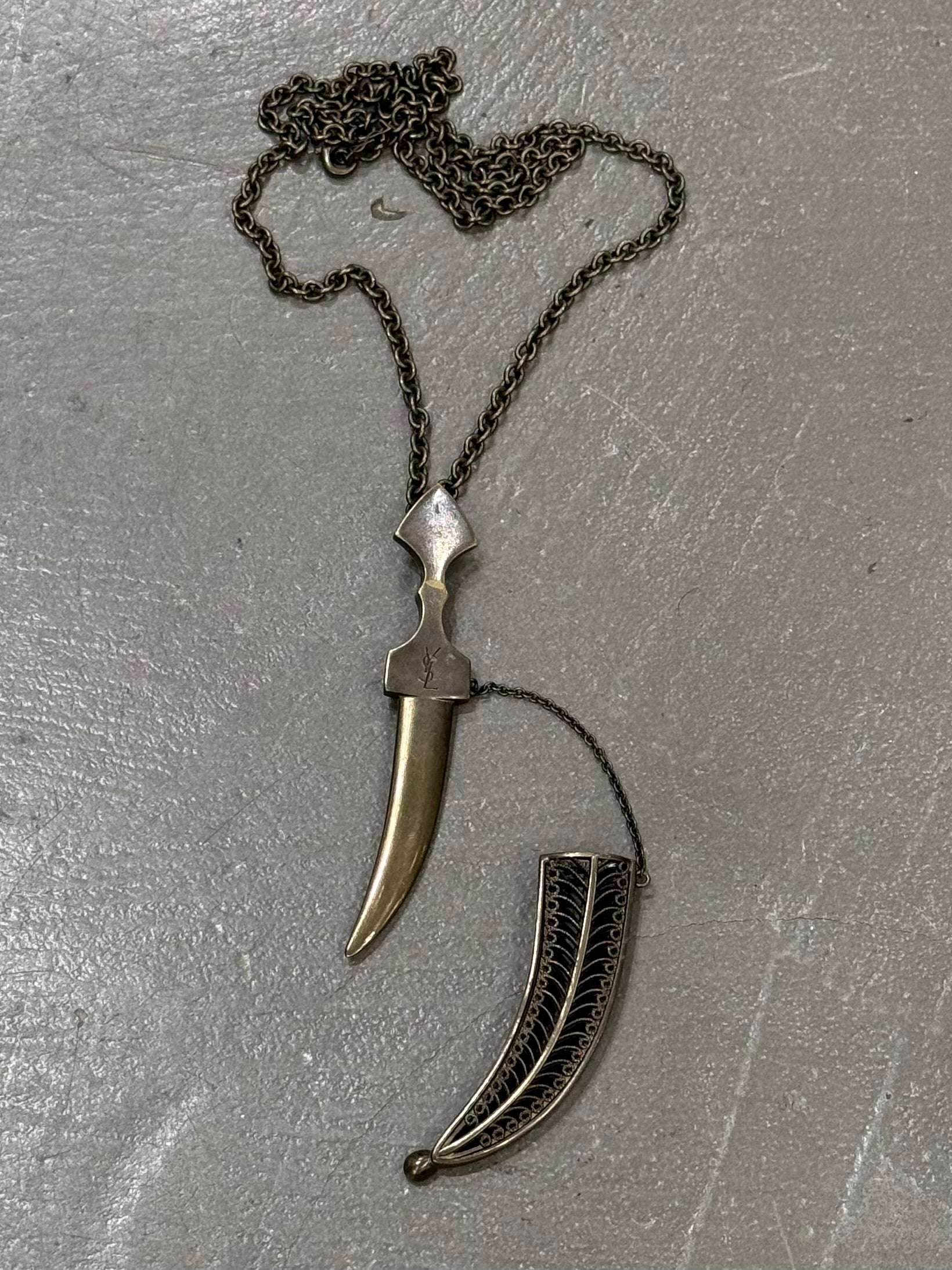 This Yves Saint Laurent necklace features a striking double dagger pendant suspended from a darkened metal chain, balancing sharp lines with a subtle antique finish. A distinctive accessory that brings a gothic, rock-inflected edge to both casual and tailored looks.
