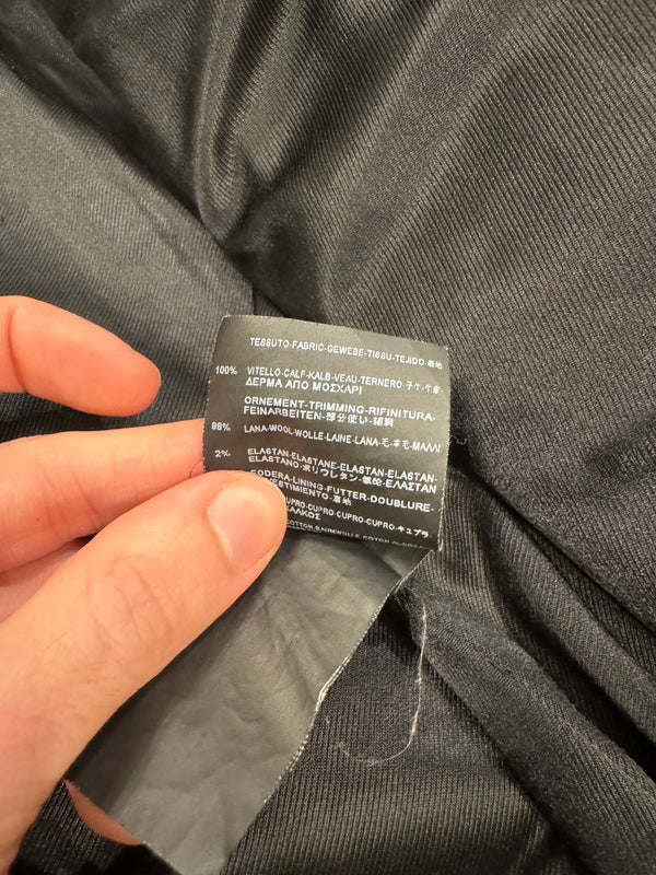 This Saint Laurent aviator bomber jacket from the Autumn/Winter 2013 collection, designed by Hedi Slimane, epitomizes rugged luxury. Crafted from high-quality black leather, it features a plush shearling collar for warmth and sophistication. The structured silhouette is complemented by ribbed cuffs and hem, dual front flap pockets, and a sturdy zip closure. A timeless and collectible piece that merges vintage military aesthetics with Slimane’s signature rock-inspired edge.