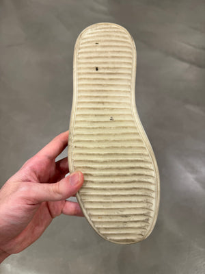These avant-garde knee-high sneakers by Rick Owens embody the designer's signature fusion of streetwear and high fashion. Crafted from supple suede, they feature a stretch fit that hugs the leg like a sock, creating a striking elongated silhouette. The signature chunky rubber sole and rounded toe cap add a bold contrast, making them a statement piece for any contemporary wardrobe.
