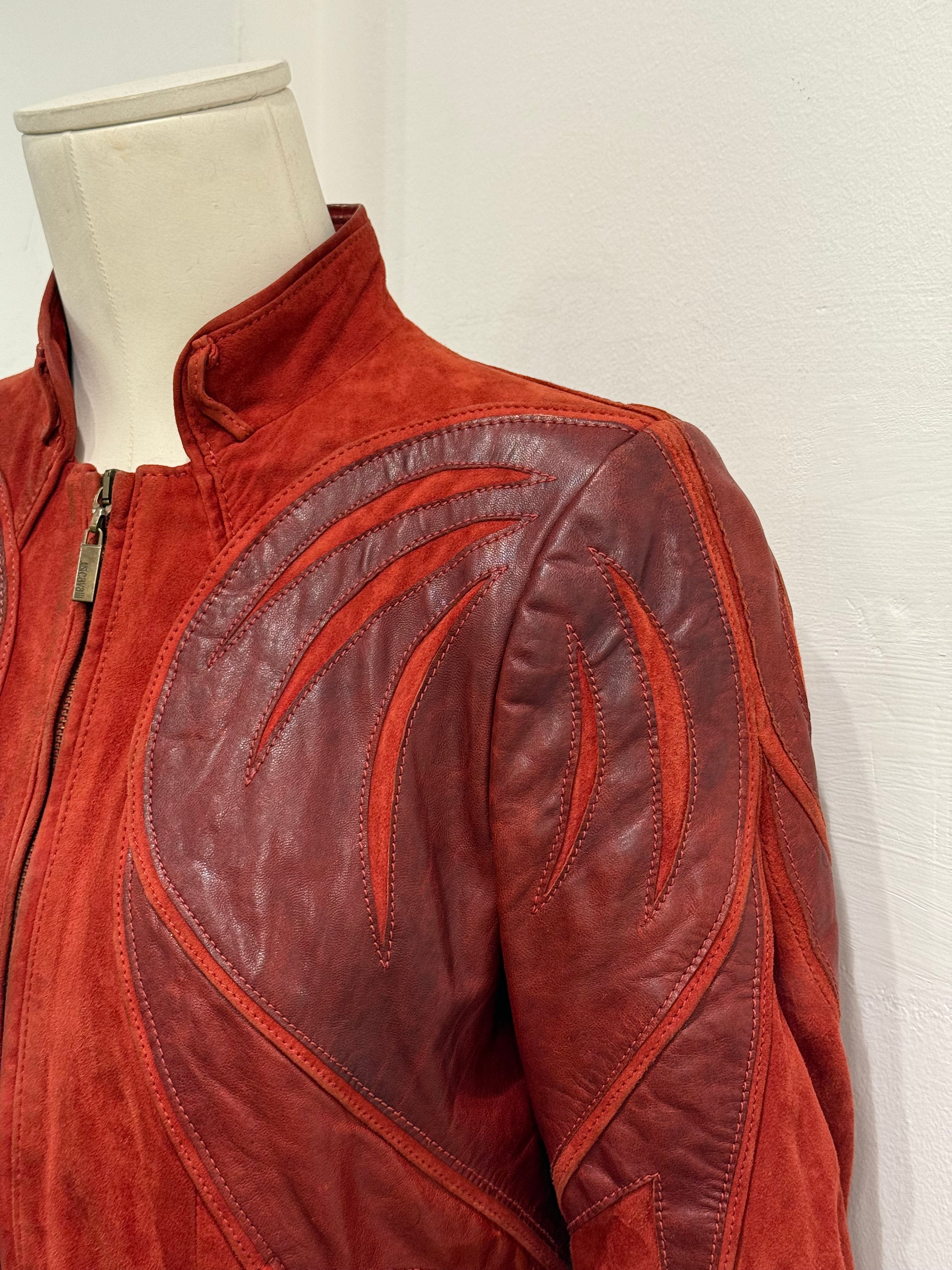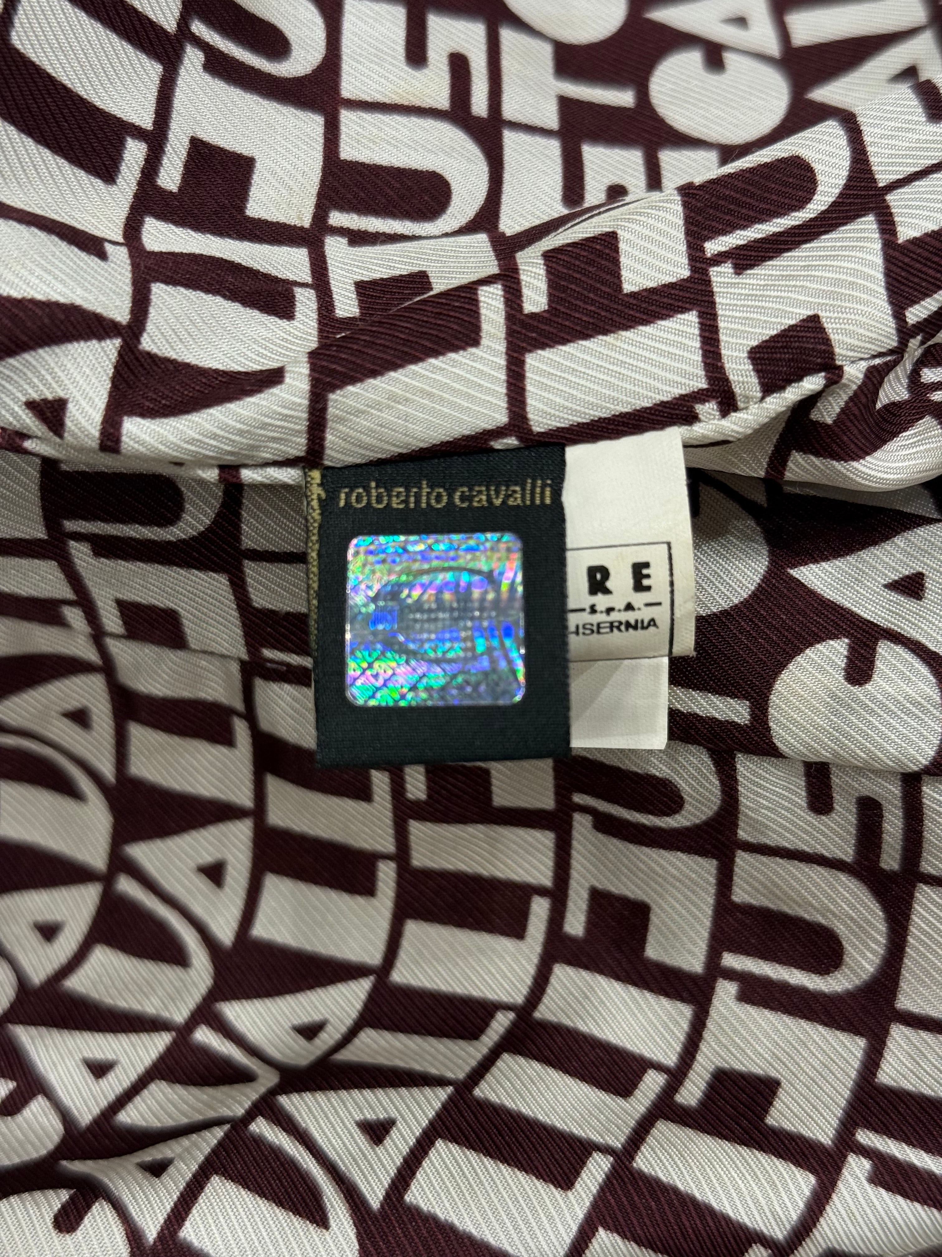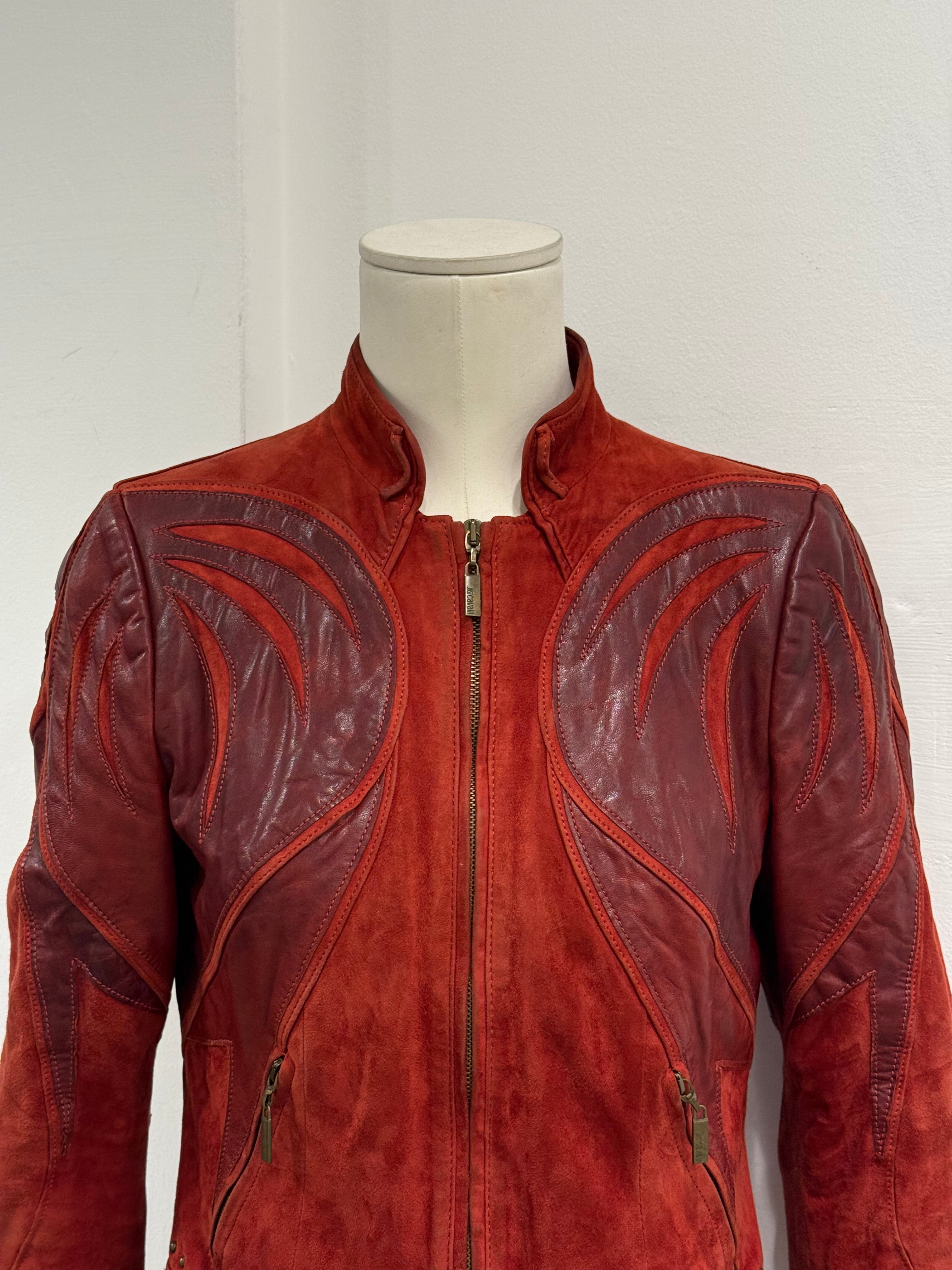 Western-inspired Roberto Cavalli leather jacket featuring embossed detailing, rich coloration, and a fitted silhouette. A bold early-2000s piece blending cowboy references with Cavalli’s unmistakable flair.